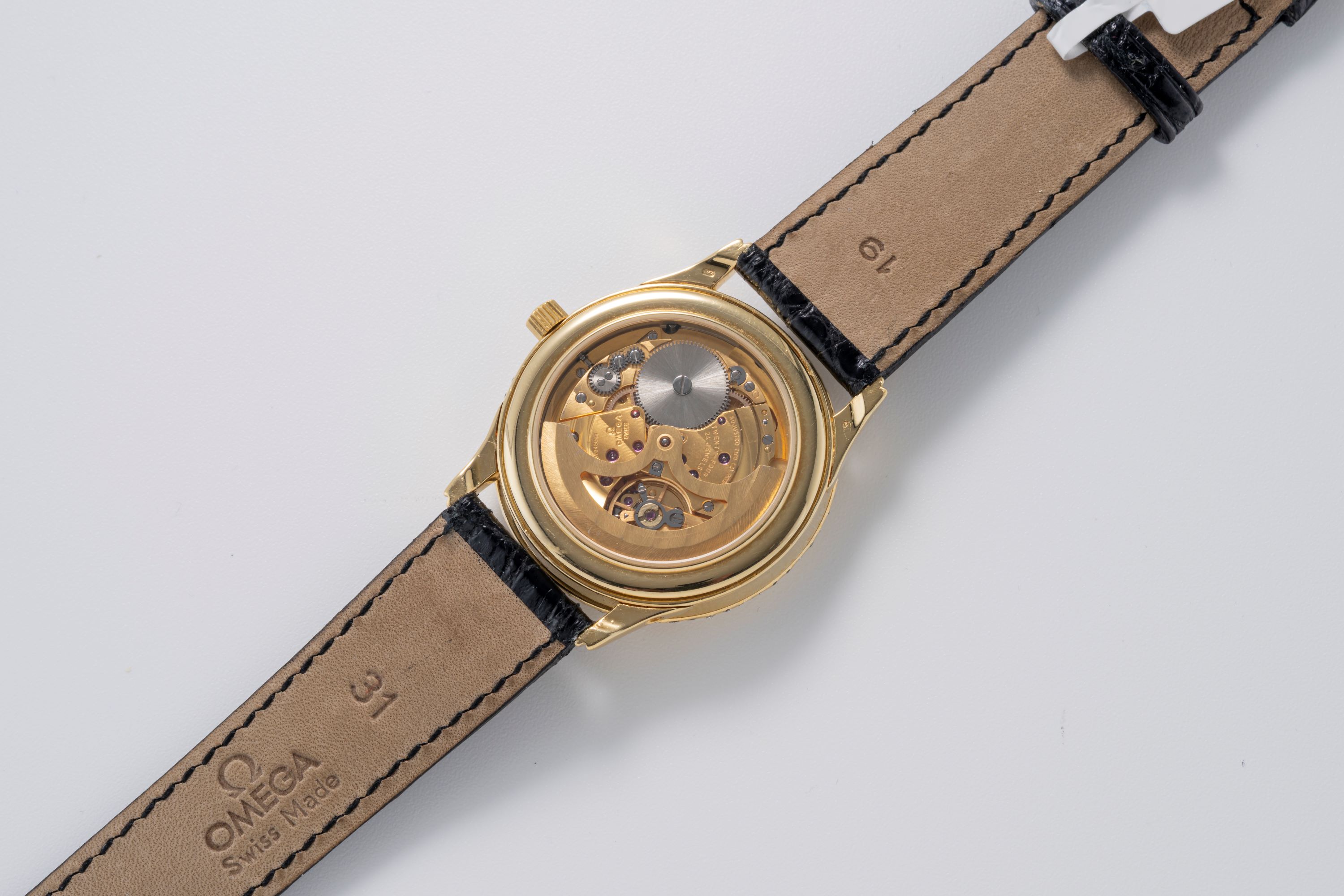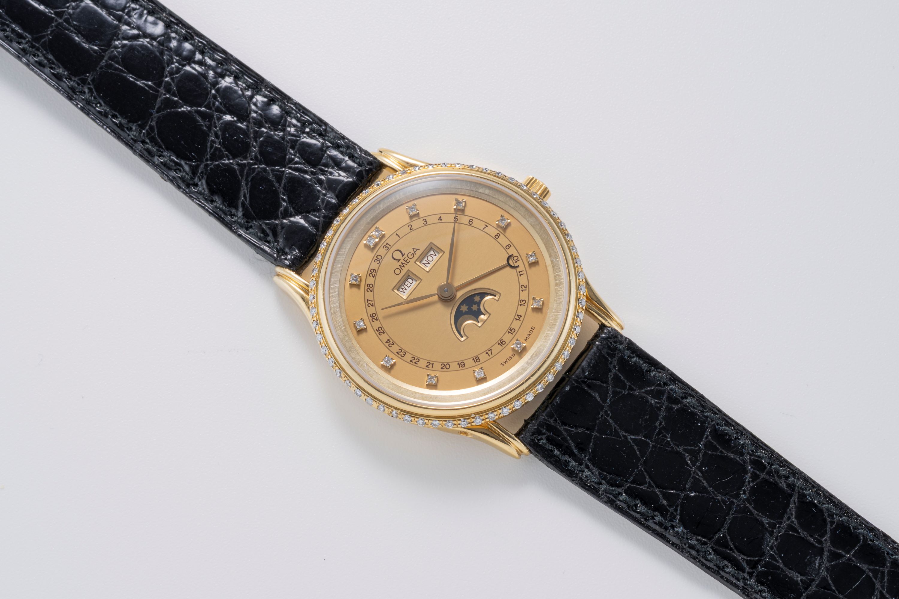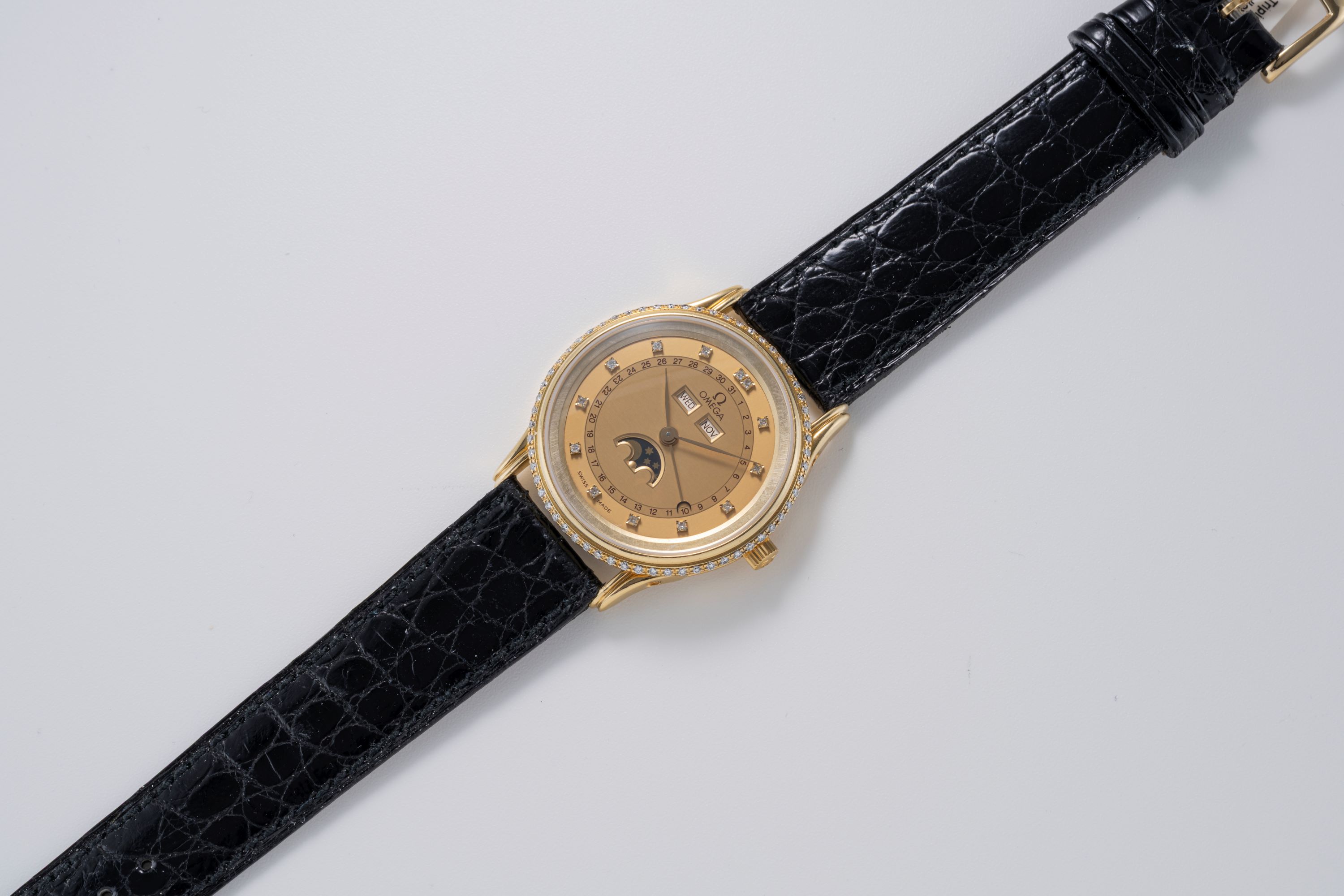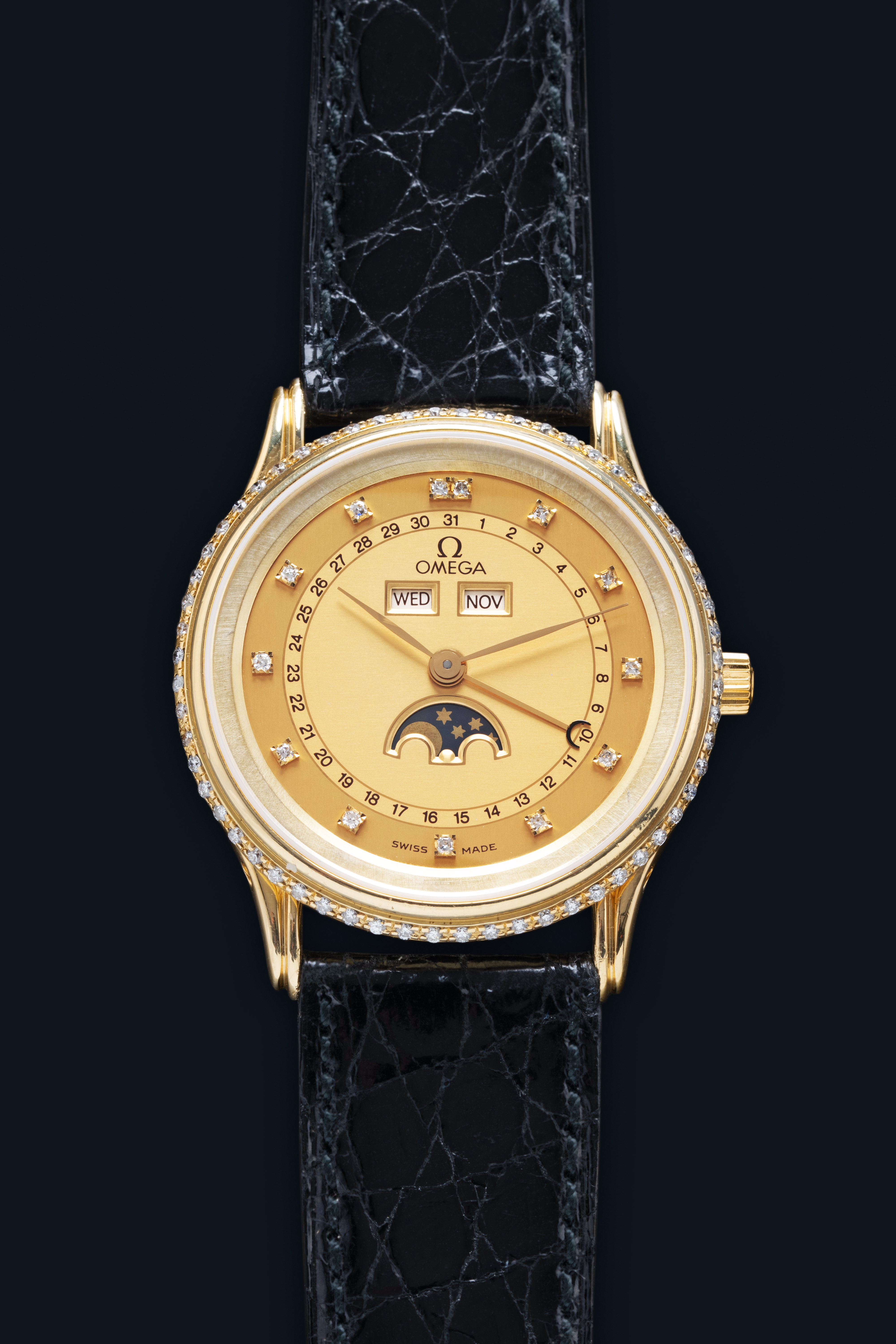 DialGold dial with diamond indices, pointer date, day and month at 12 o'clock, moonphase at 6 o'clock, signed 'Omega' at 12 o'clock