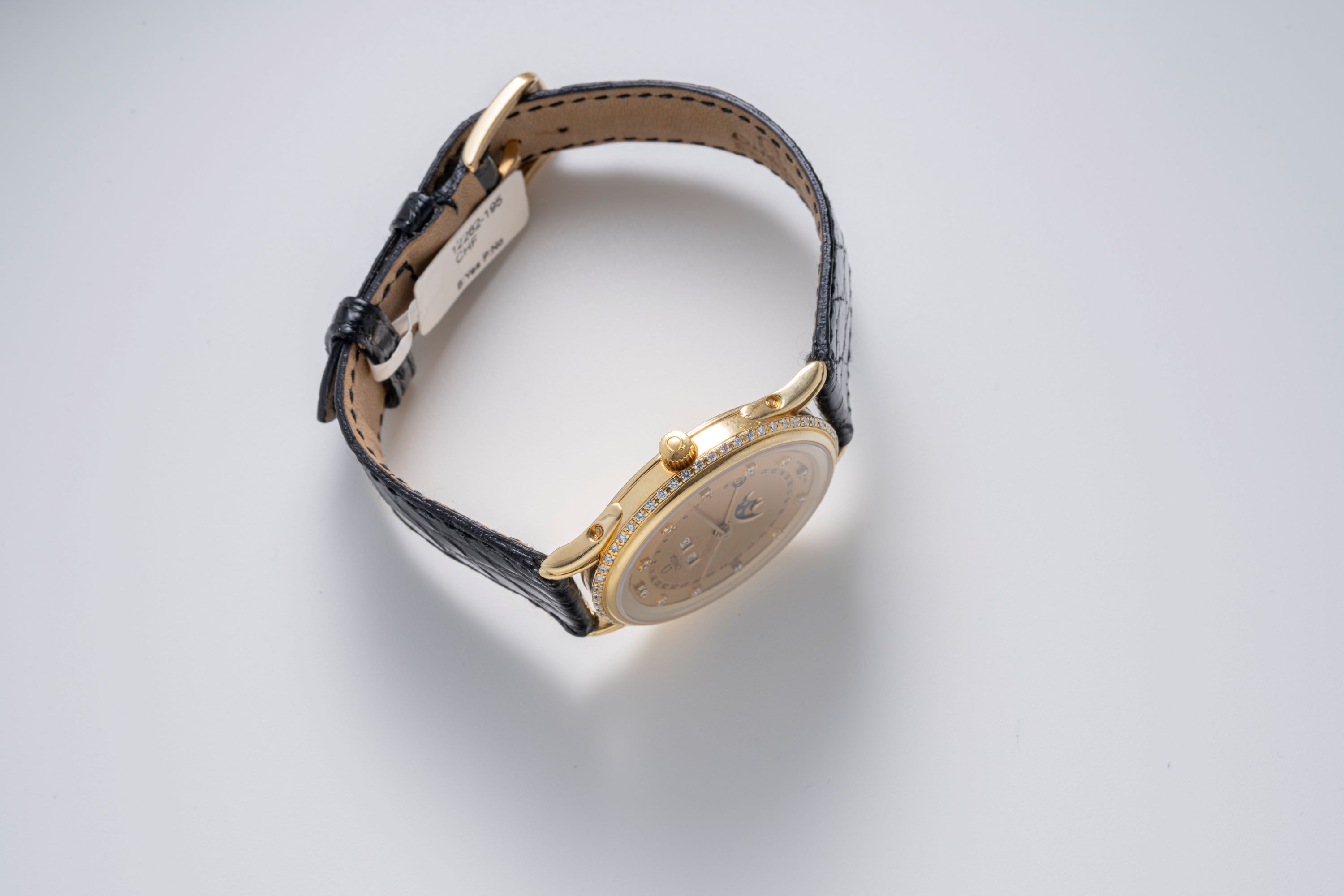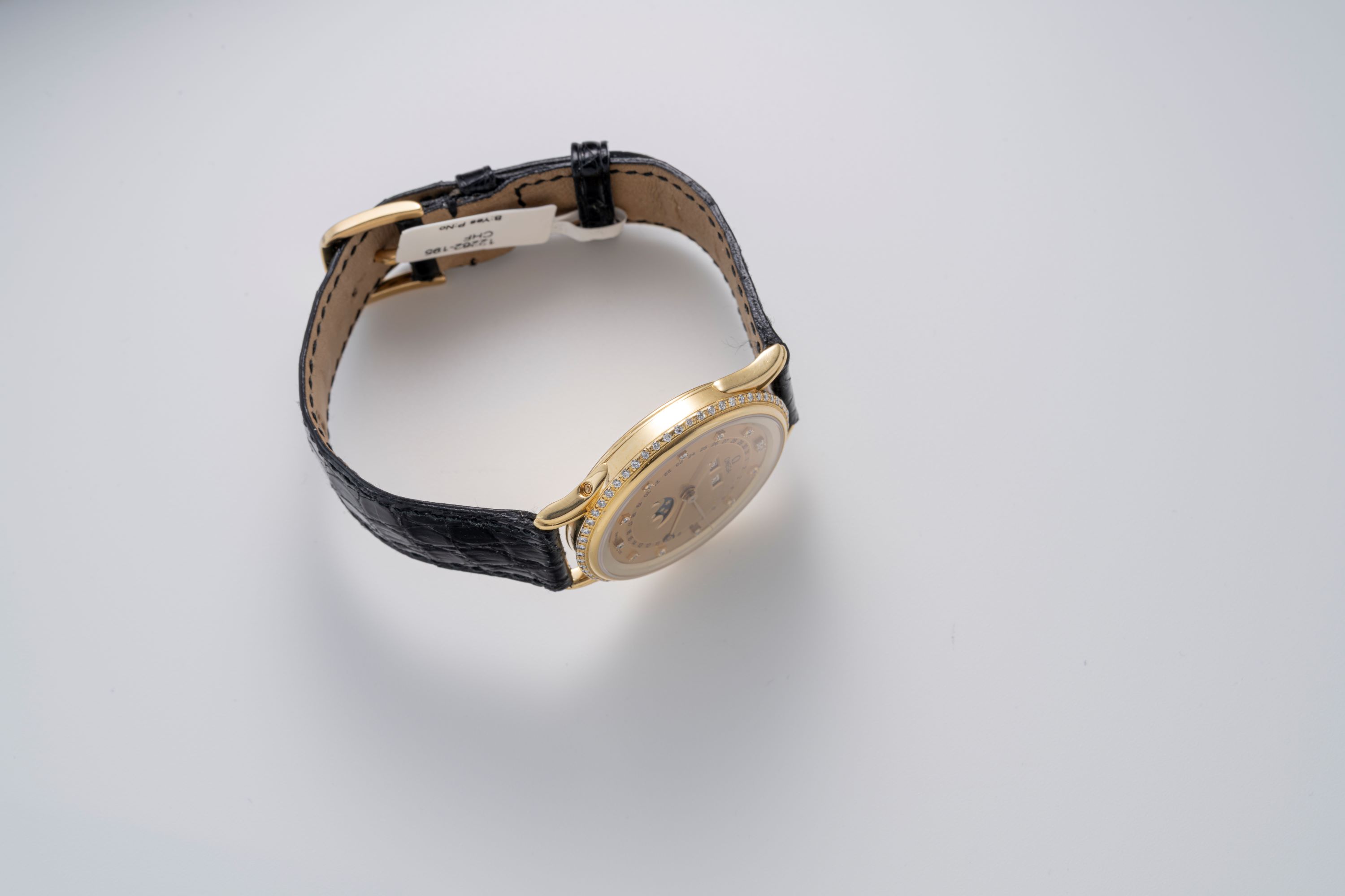 CaseRound case in 18k yellow gold with diamond-set bezel, calendar pushers on the case flanks, display caseback