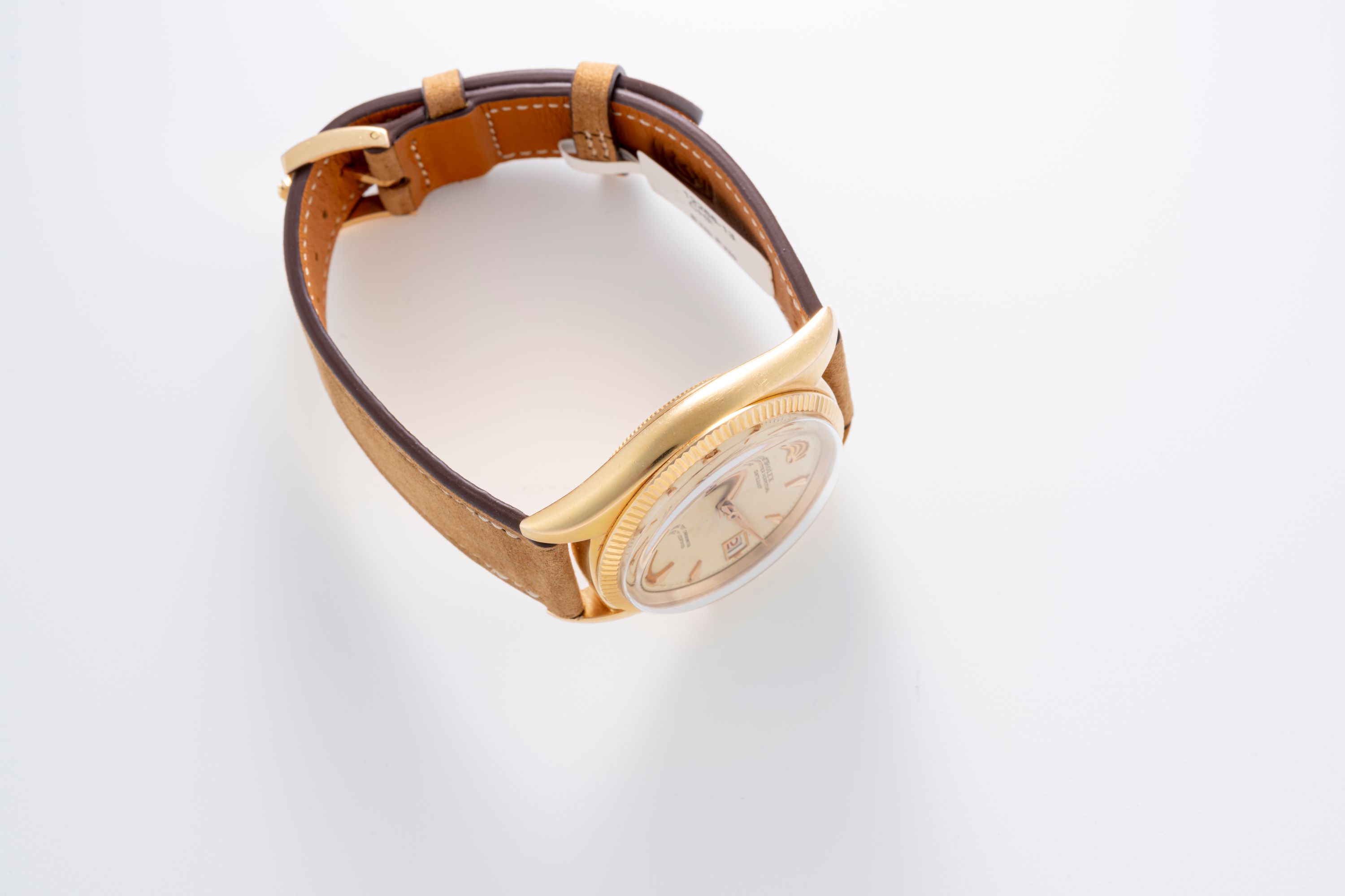 CaseRound case in 18k rose gold with fluted bezel, crown at 3 o'clock, solid caseback