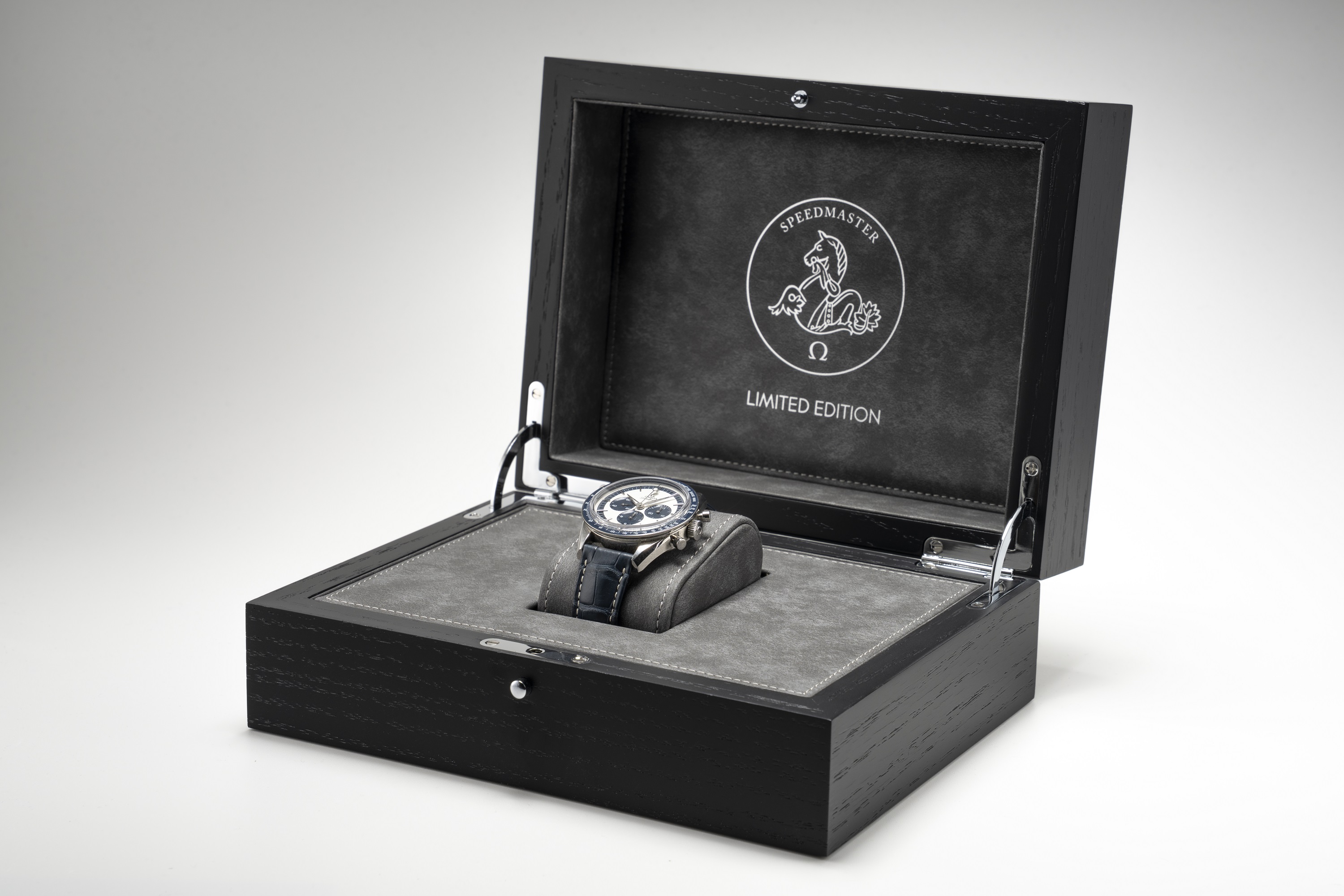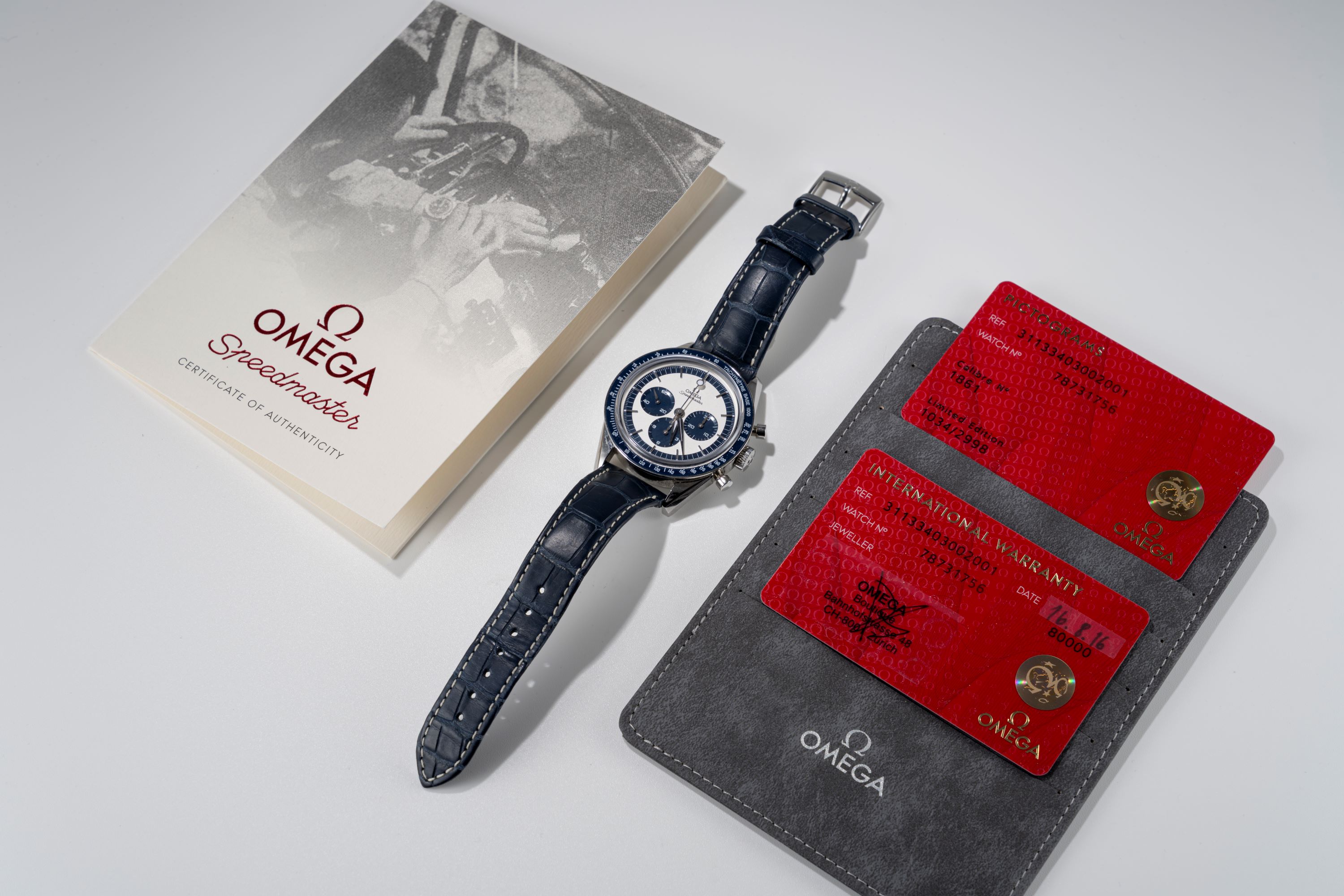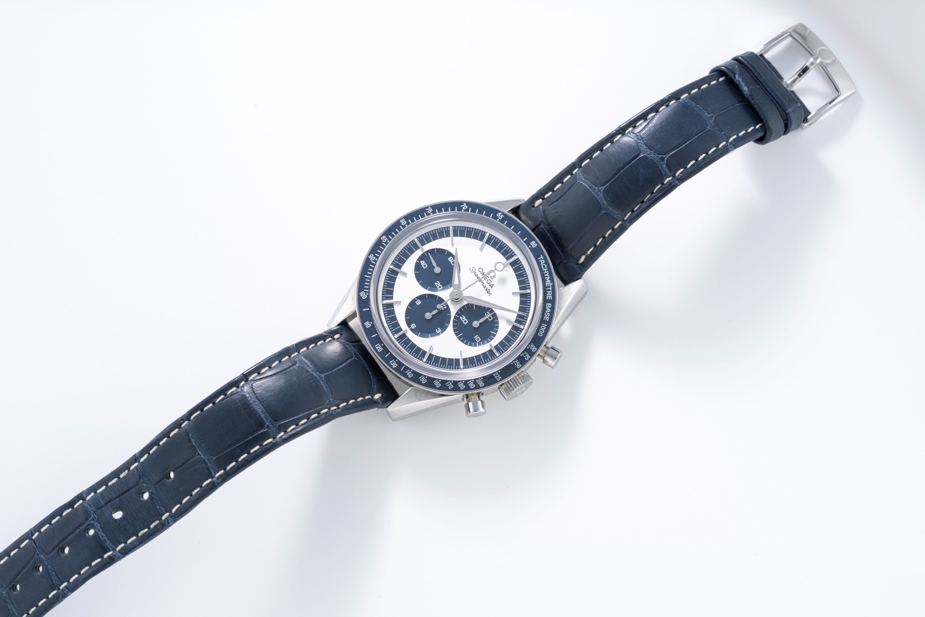 DialSilver dial with blue accents, luminous hands and applied indices, blue subdials for seconds at 9 o'clock, 12 hour chronograph counter at 6 o'clock, 30 minute chronograph counter at 3 o'clock, signed 'Omega' at 12 o'clock