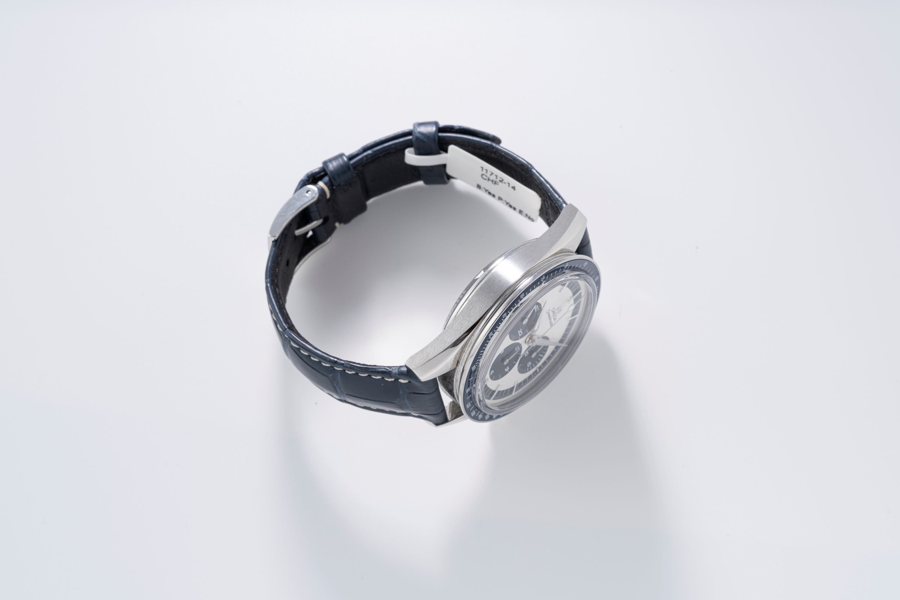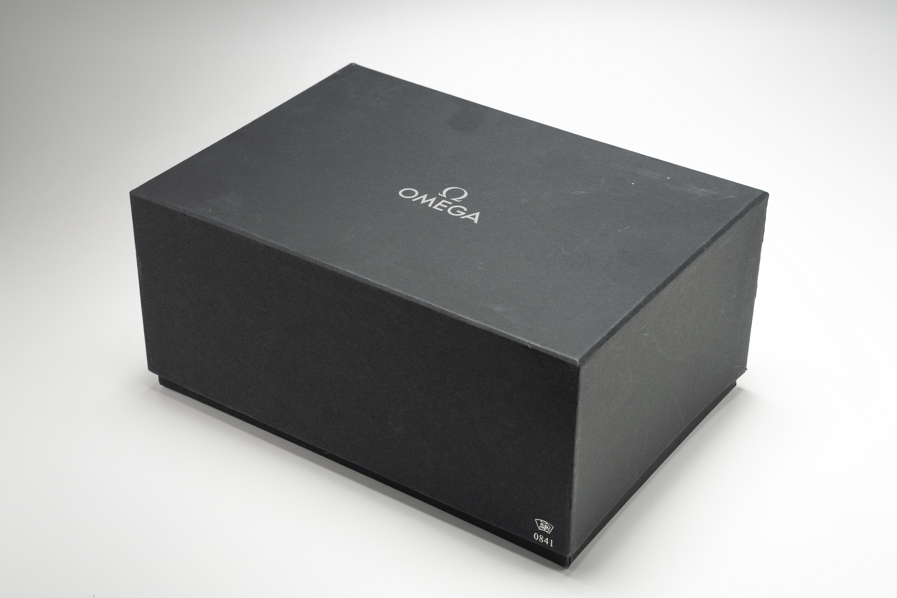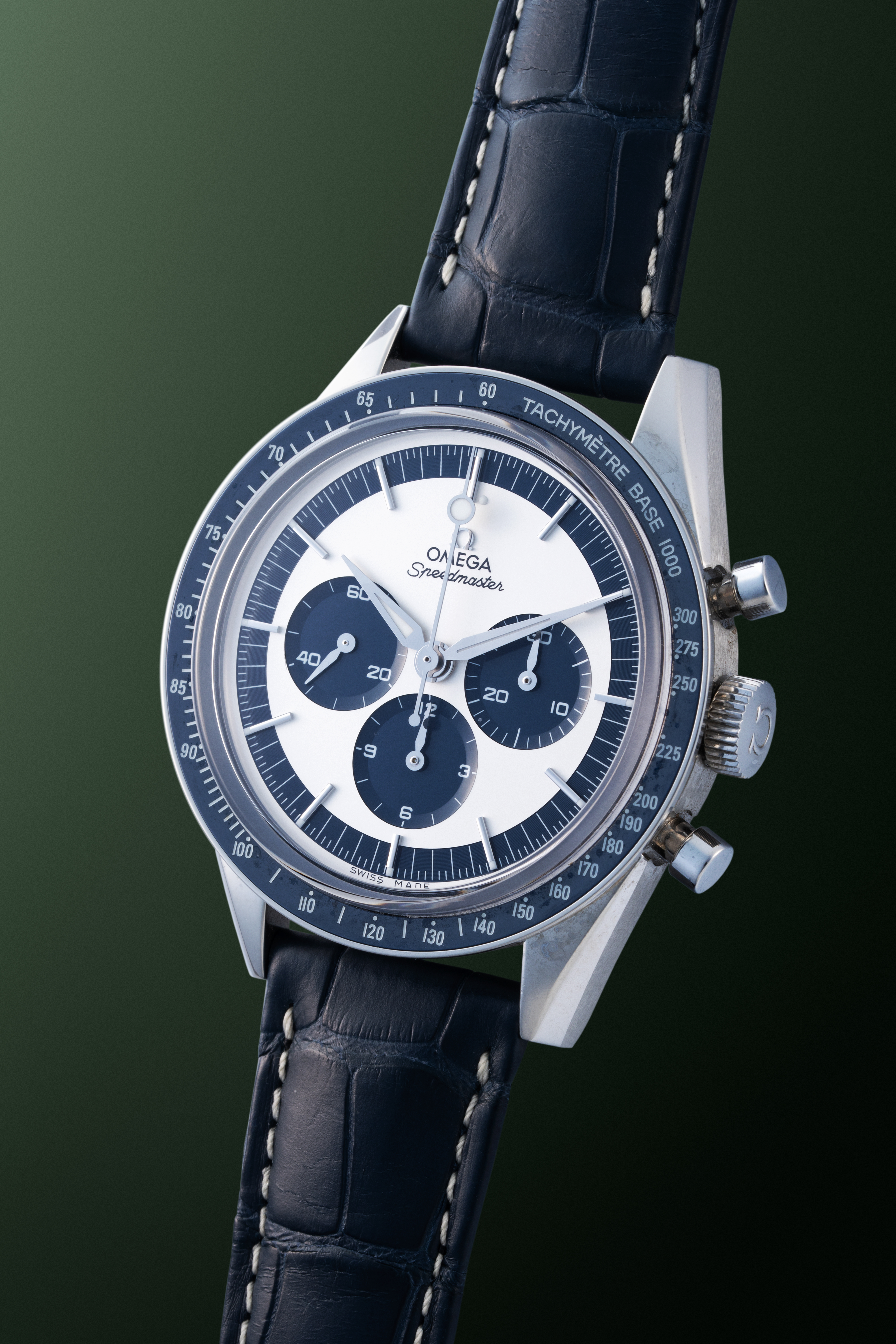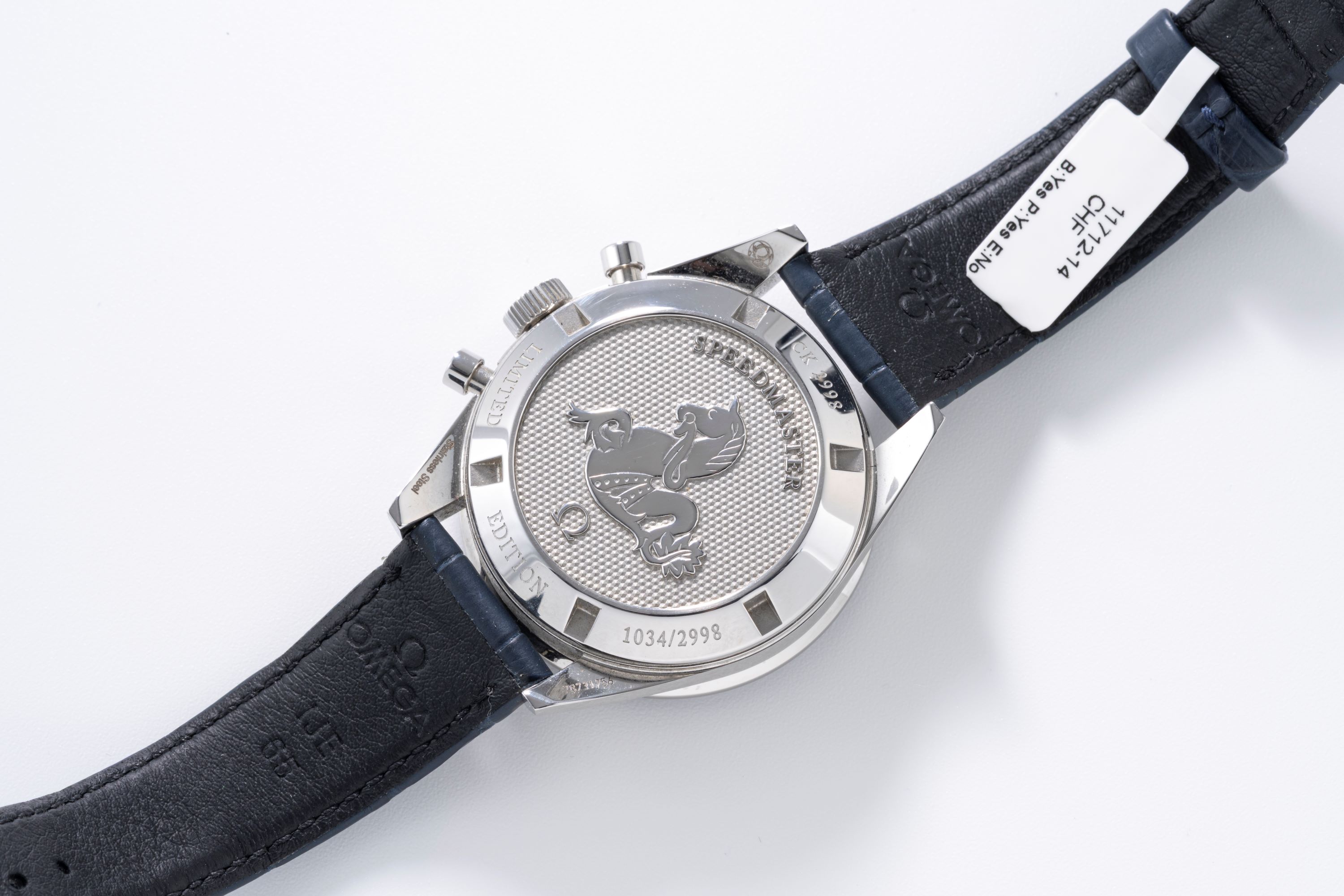 DialSilver dial with blue accents, luminous hands and applied indices, blue subdials for seconds at 9 o'clock, 12 hour chronograph counter at 6 o'clock, 30 minute chronograph counter at 3 o'clock, signed 'Omega' at 12 o'clock