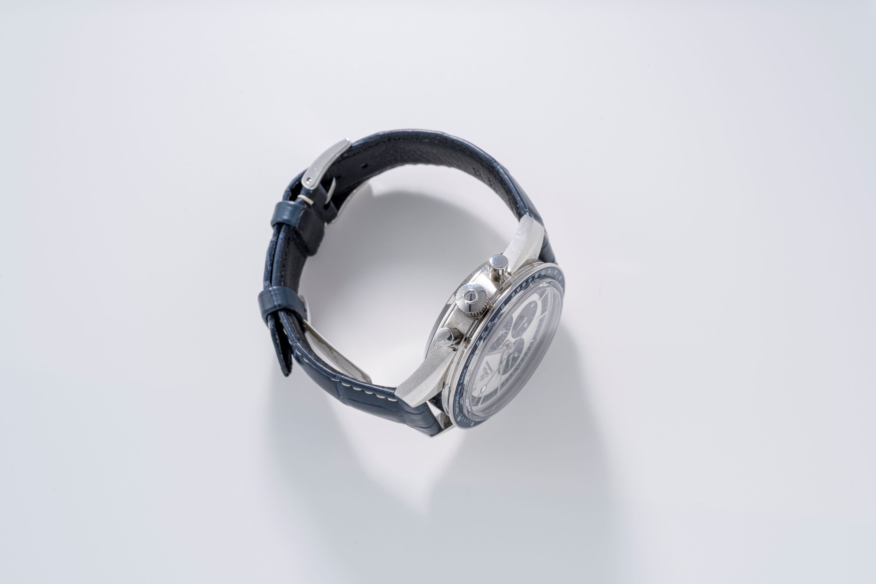 CaseRound case in stainless steel with chronograph pushers at 2 and 4 o'clock, winding crown at 3 o'clock, solid caseback with engraving, fixed tachymeter bezel with blue inlay