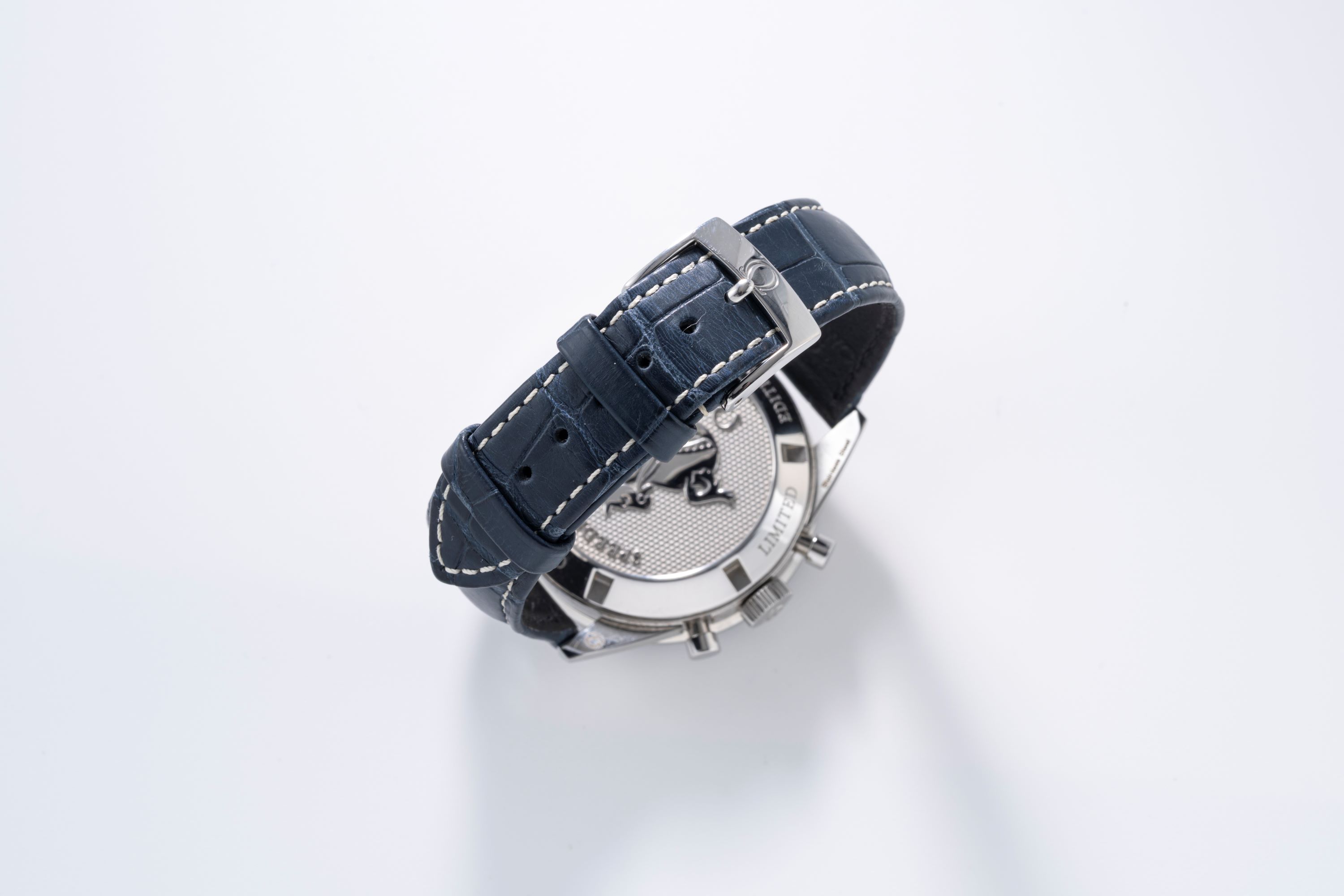 The Omega Speedmaster CK2998 Limited Edition (Ref. 311.33.40.30.02.001) pays tribute to the original CK2998 of 1959, offering vintage-inspired design with modern materials and execution. Released in 2016 as a numbered limited edition of 2998 pieces worldwide, this version retains the compact dimensions and distinctive styling of the early Speedmasters. The watch features a 39.7 mm stainless steel case echoing the size of the original Pre-Moon Speedmaster. The dial is executed in a silver/opaline tone with prominent, blue-accented sub-dials and a blue chapter ring—an aesthetic blend of modern and retro. Alpha-style hands and a lollipop-shaped chronograph seconds hand further evoke the vintage 1959 reference. Under the dial beats the manual-winding Caliber 1861, the longtime workhorse of the Moonwatch line, offering reliable chronograph functionality with a heritage connection to first Omega Speedmaster models.