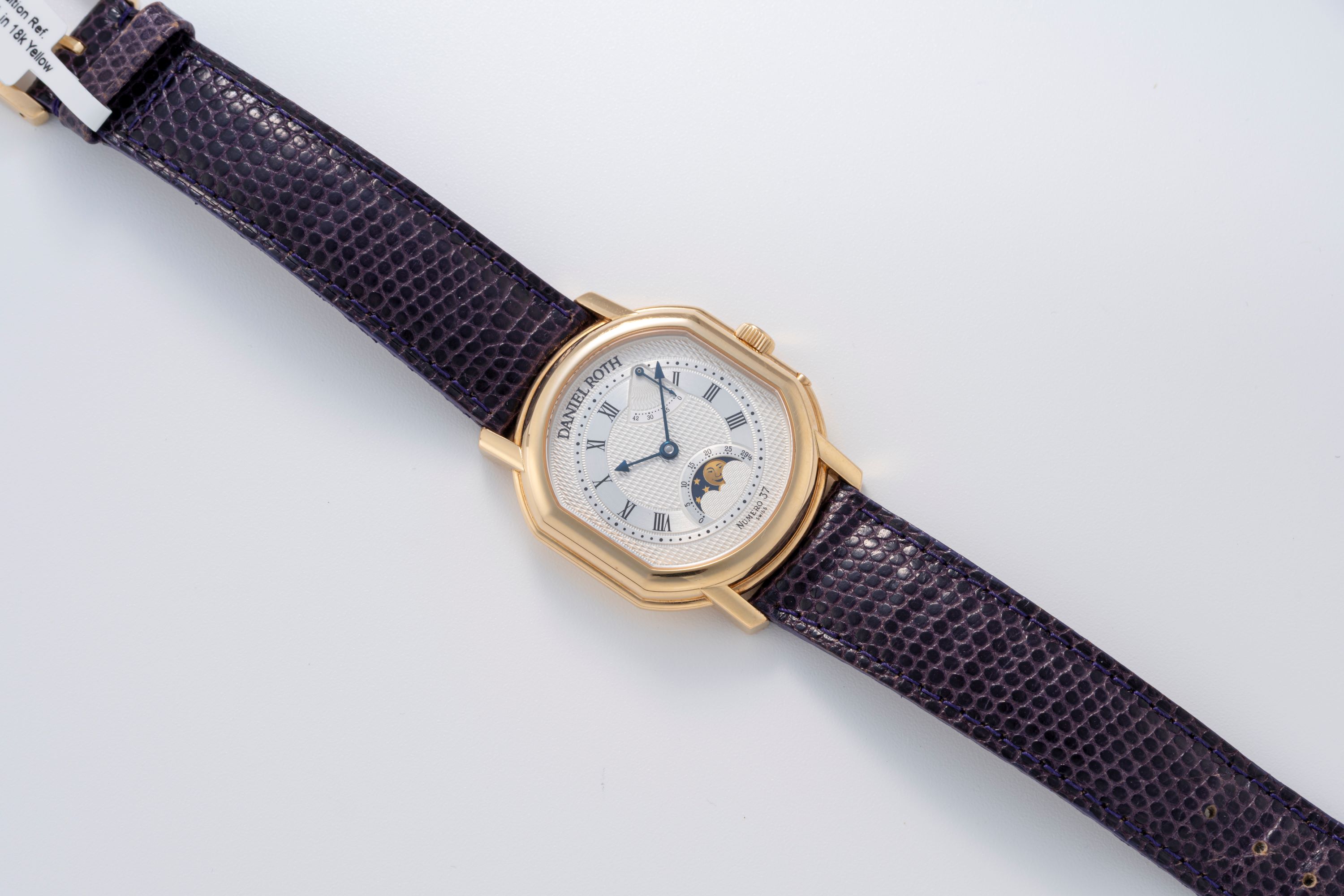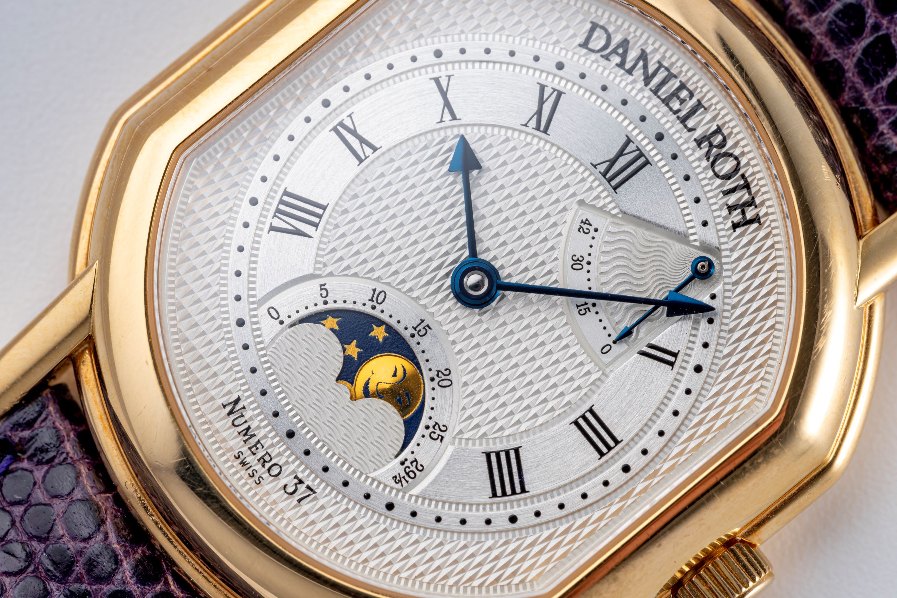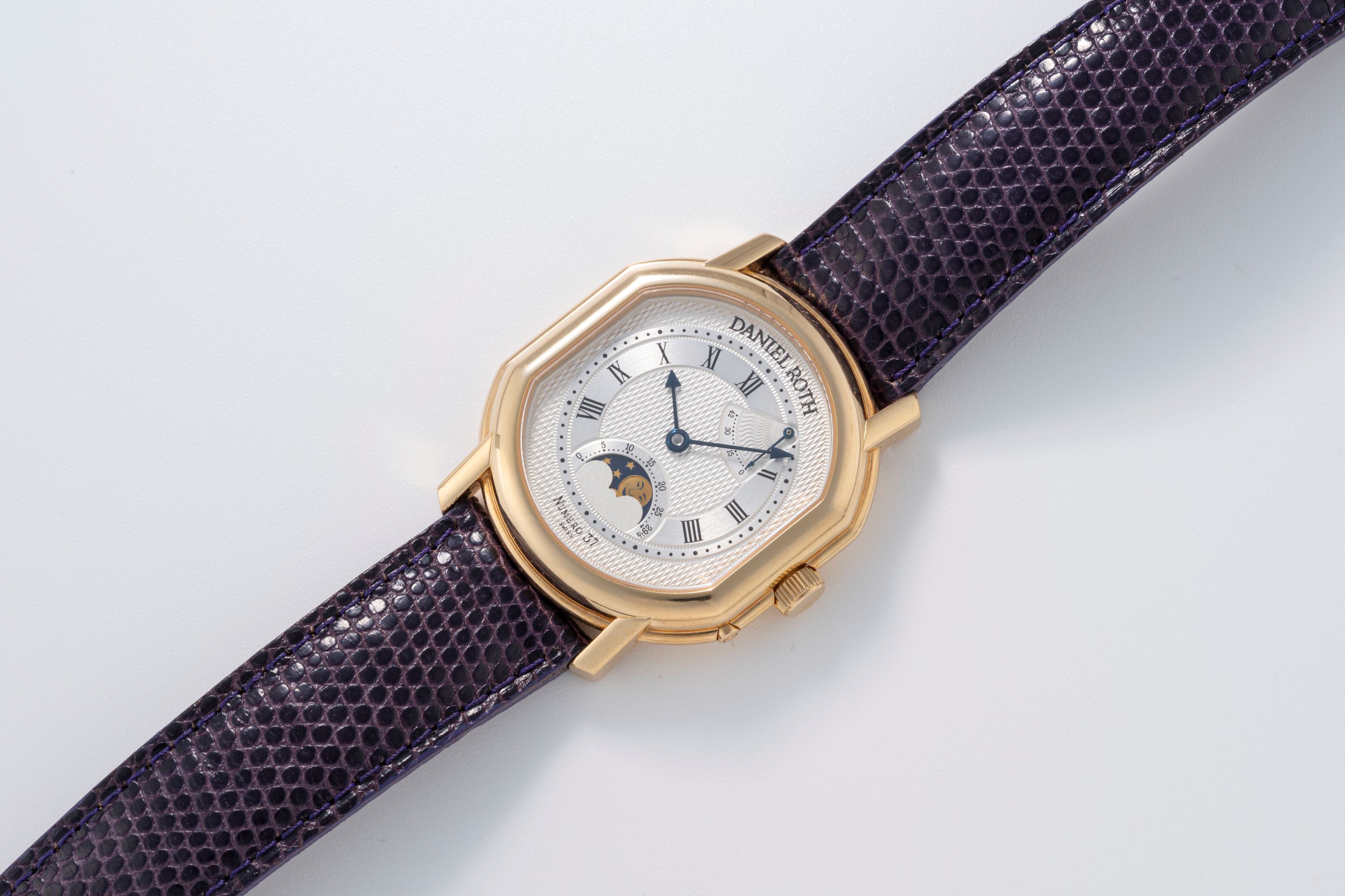 DialSilver guilloche dial with roman numerals, heat-blued arrow hands, power reserve at 1 o'clock, moonphase at 6 o'clock, signed 'Daniel Roth' at 12 o'clock