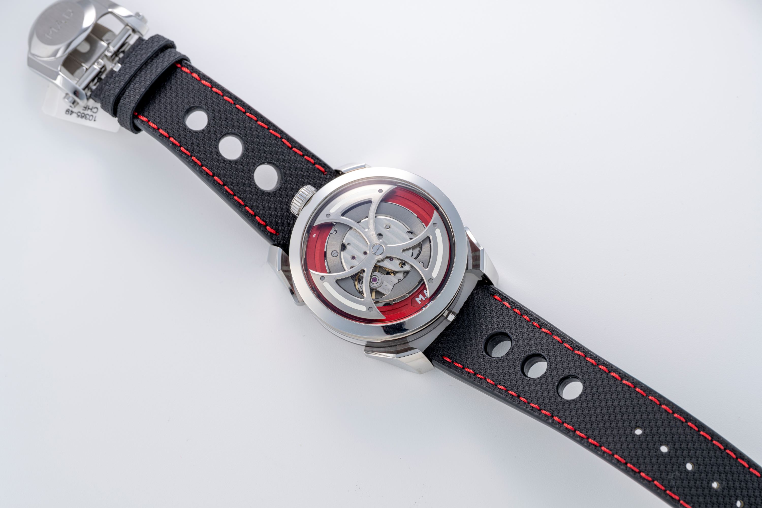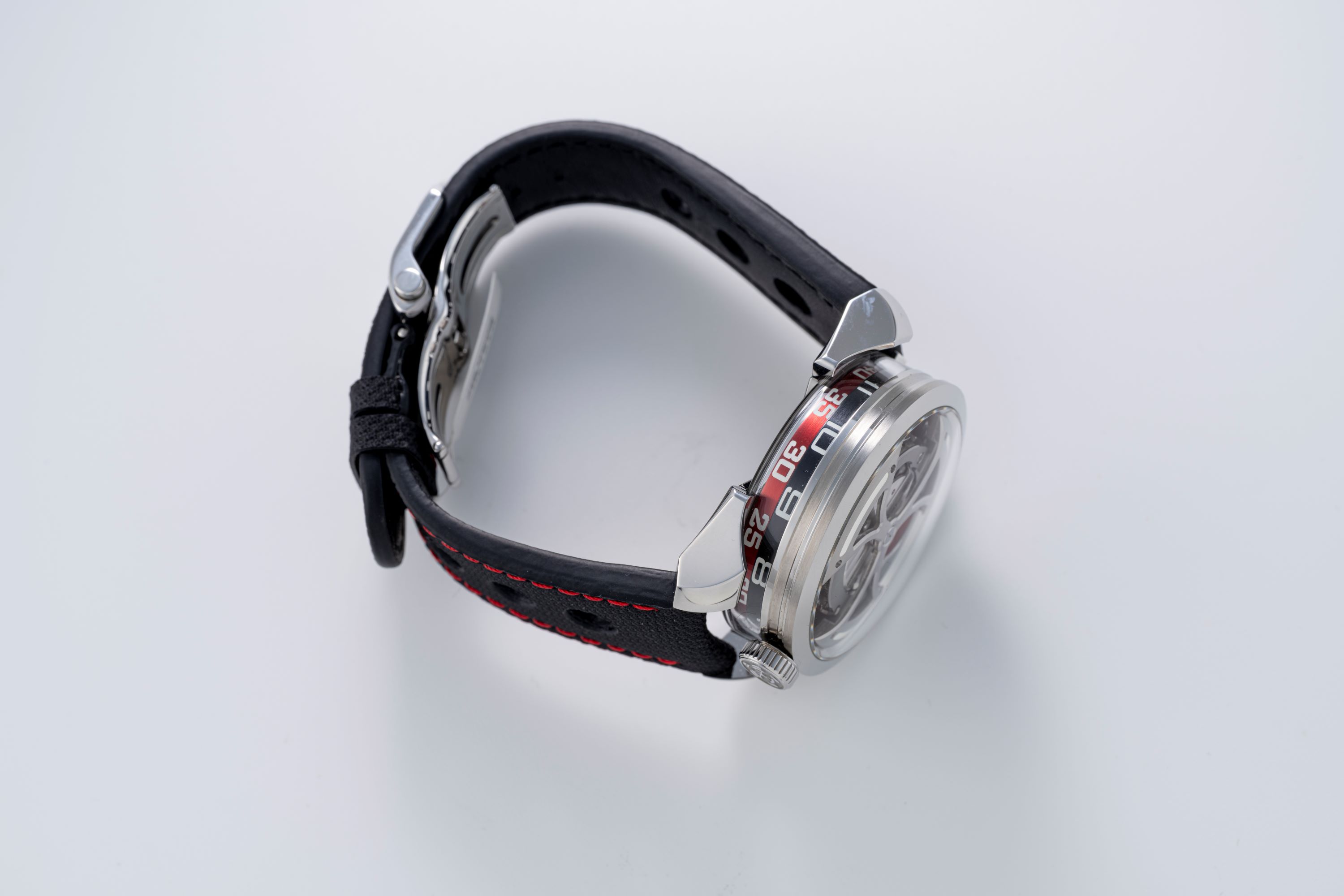StrapBlack canvas/leather strap with red stitching, MB&F butterfly deployant clasp in stainless steel