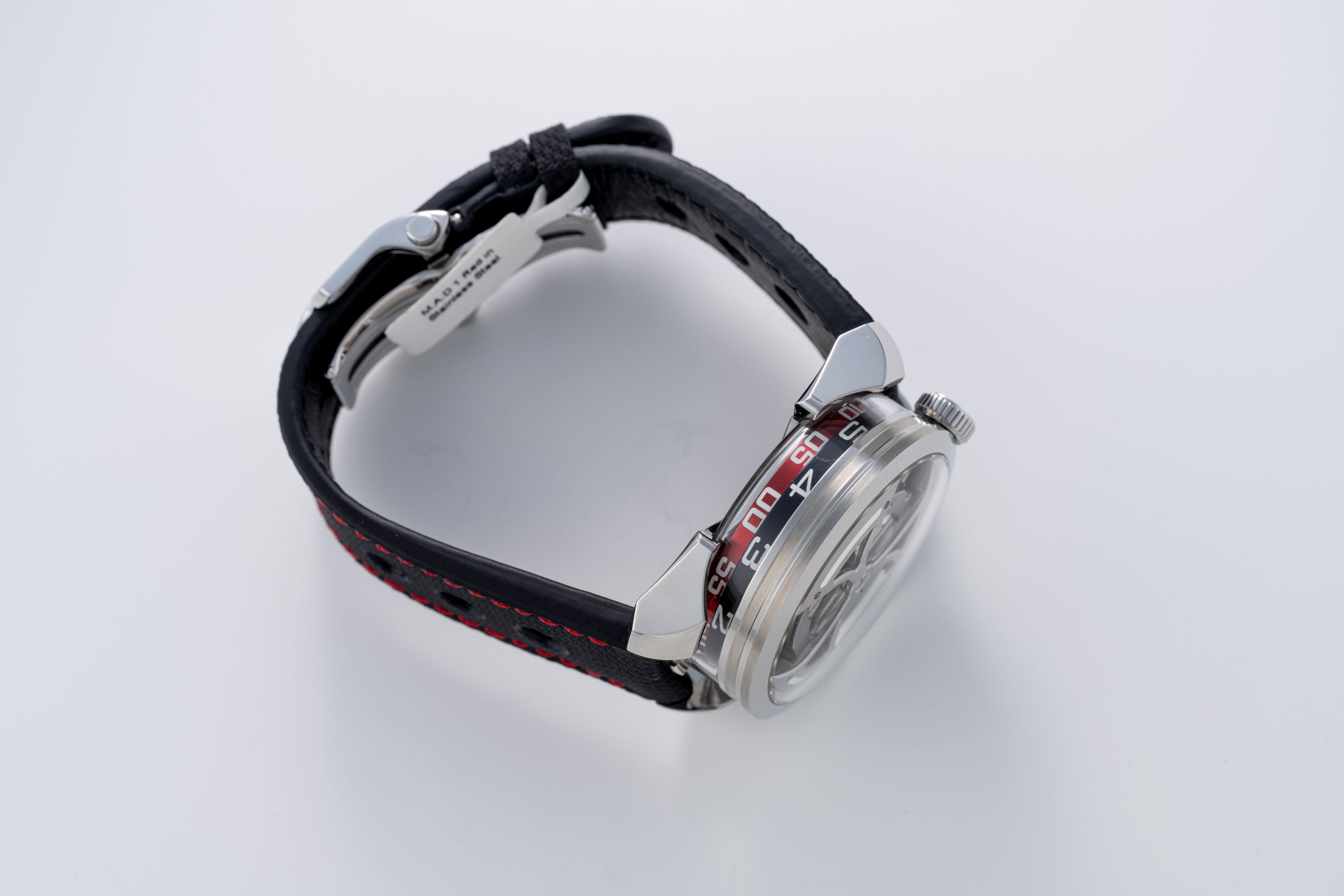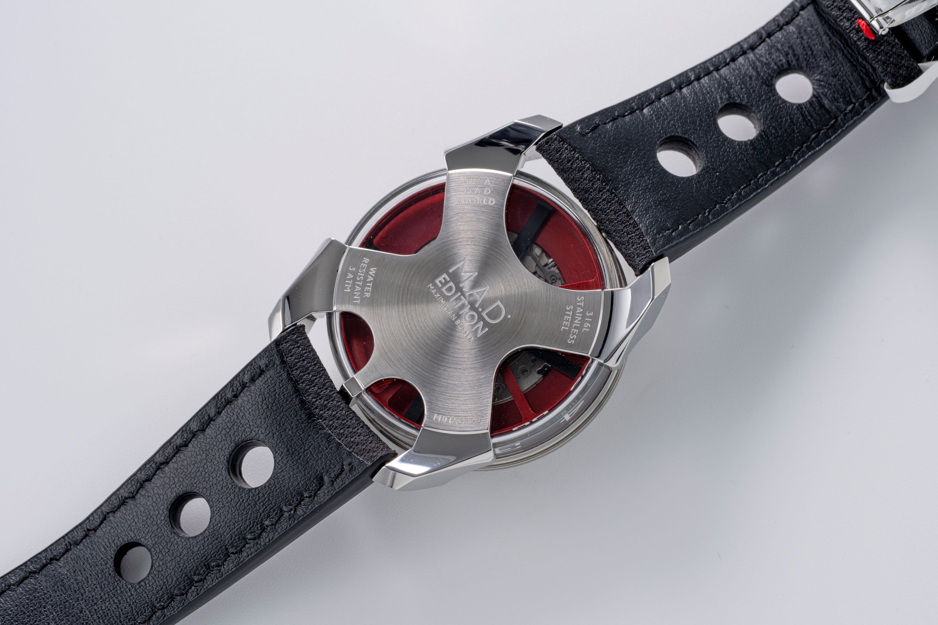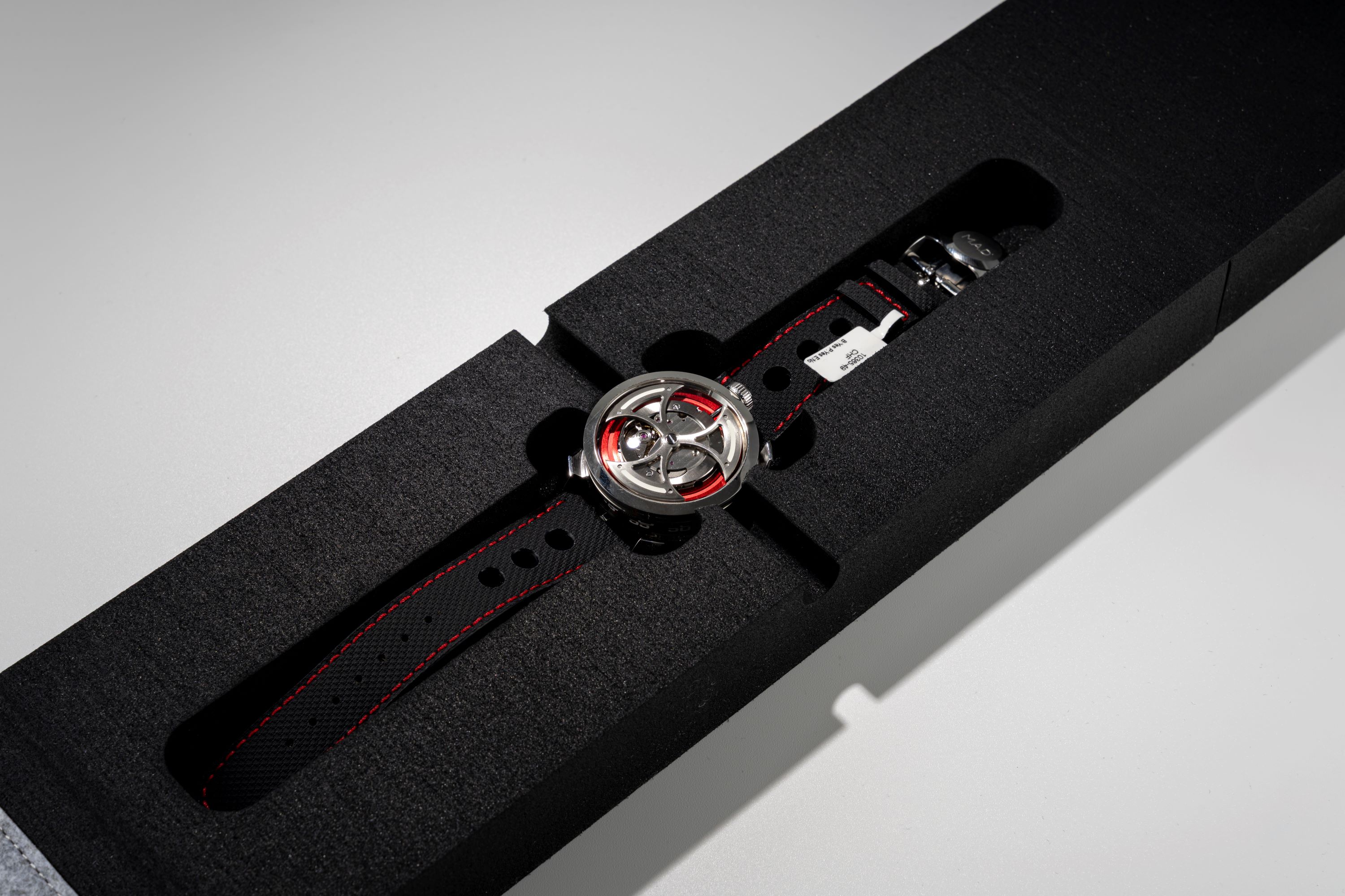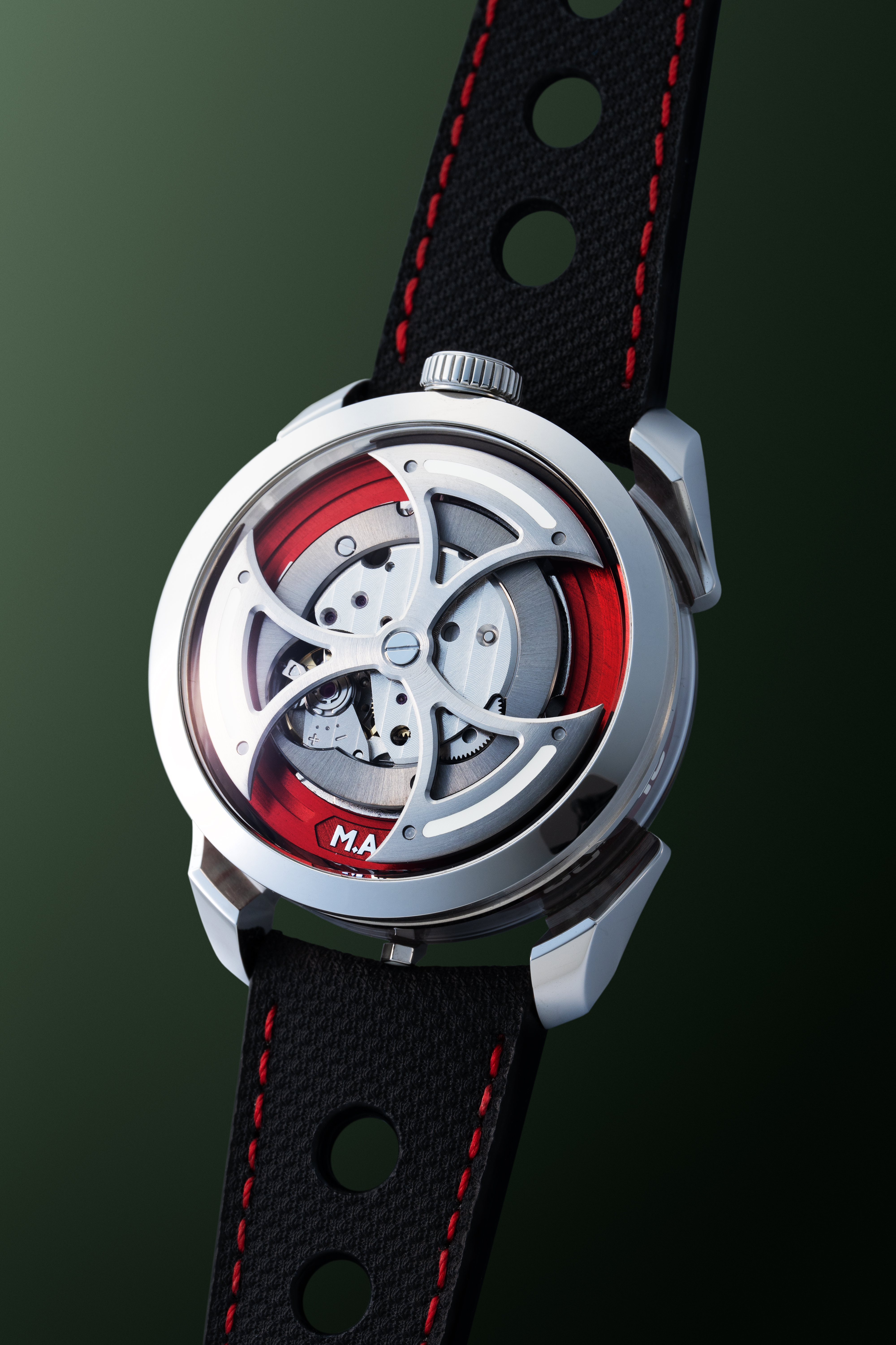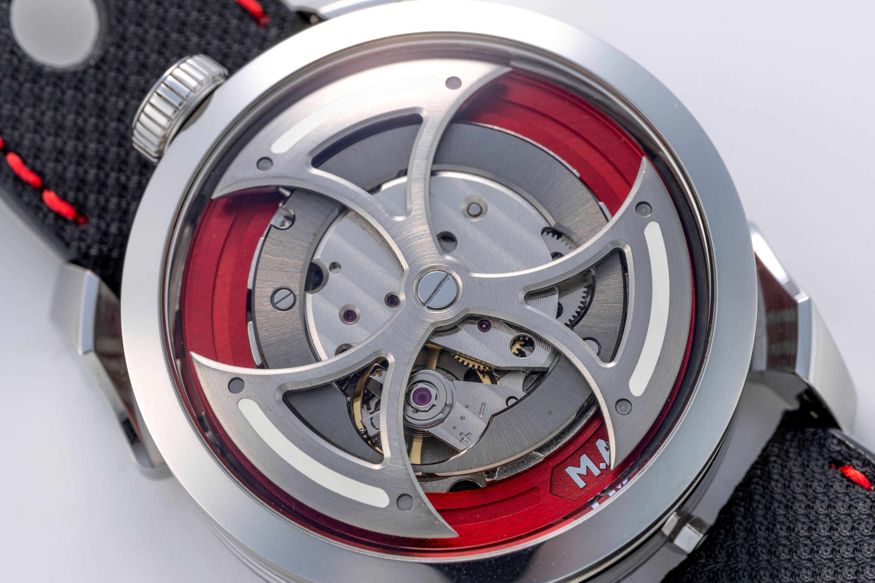 The M.A.D.1 Red by MB&F (under the sub-label M.A.D. Editions) is a striking departure from conventional watchmaking, an accessible yet unmistakably creative timepiece crafted with the signature flair of independent horology guru Maximilian Büsser. Launched in June of 2021, it brings high-concept design to a wider audience while keeping in line with the heritage of MB&F. The watch features a 42 mm stainless steel case and stands out with its vibrant cherry-red accents, replacing the earlier blue colorway. The time is displayed laterally: two rotating cylinders for hours and minutes spin around the case flanks, offering an alternative to traditional hands. The movement is an inverted automatic movement with a triple-blade free-spinning rotor, visible through the dial-side sapphire crystal and enhanced with Super-LumiNova accents. The M.A.D. 1 offers a radical and interesting way of telling time under the brand of legendary Max Busser.