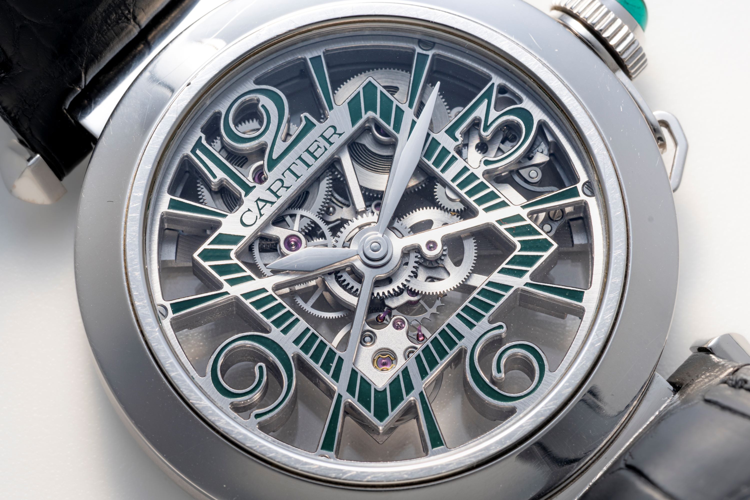 DialSkeletonized dial with green inlays, faceted hands, signed 'Cartier' at 12 o'clock