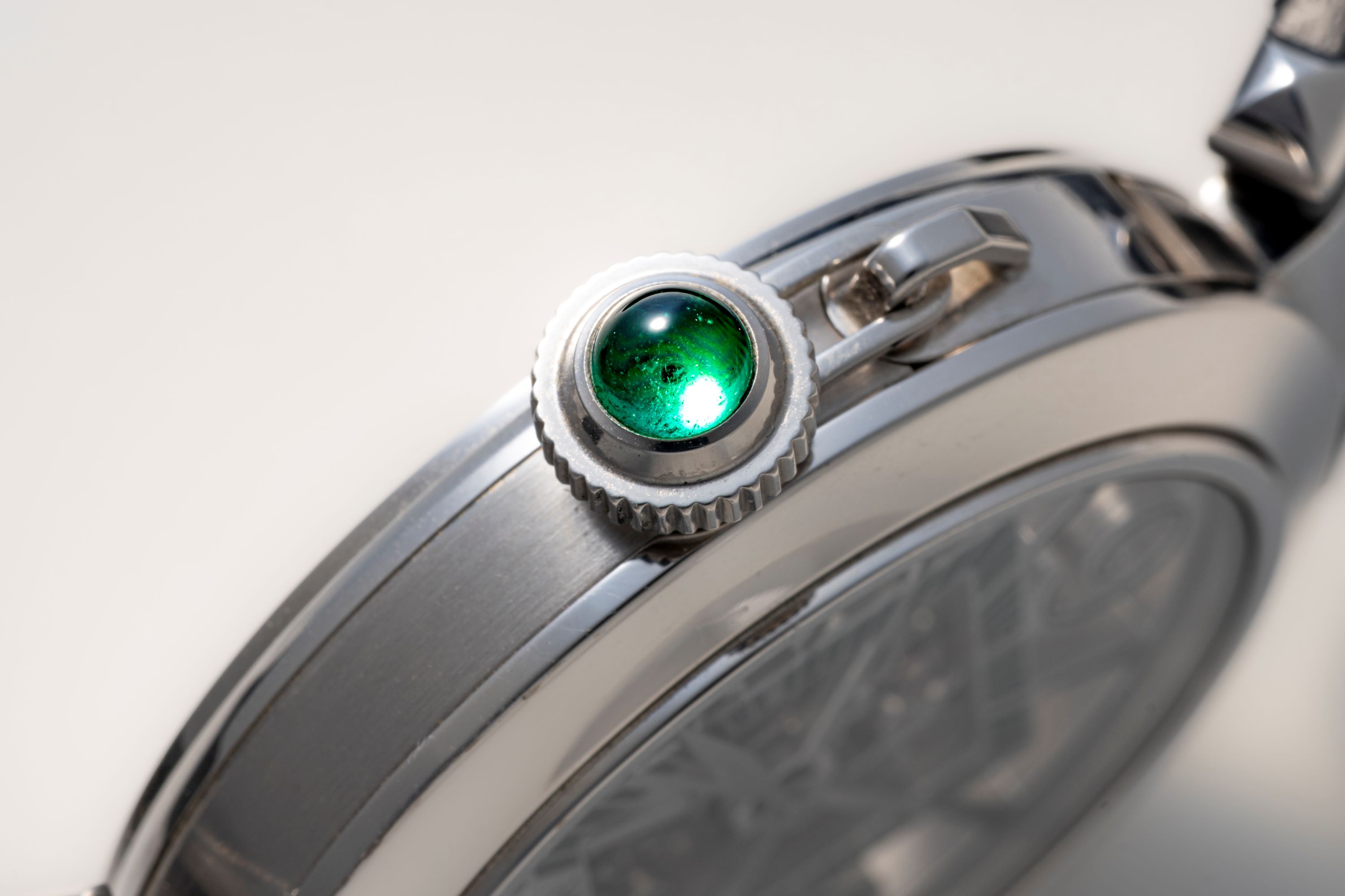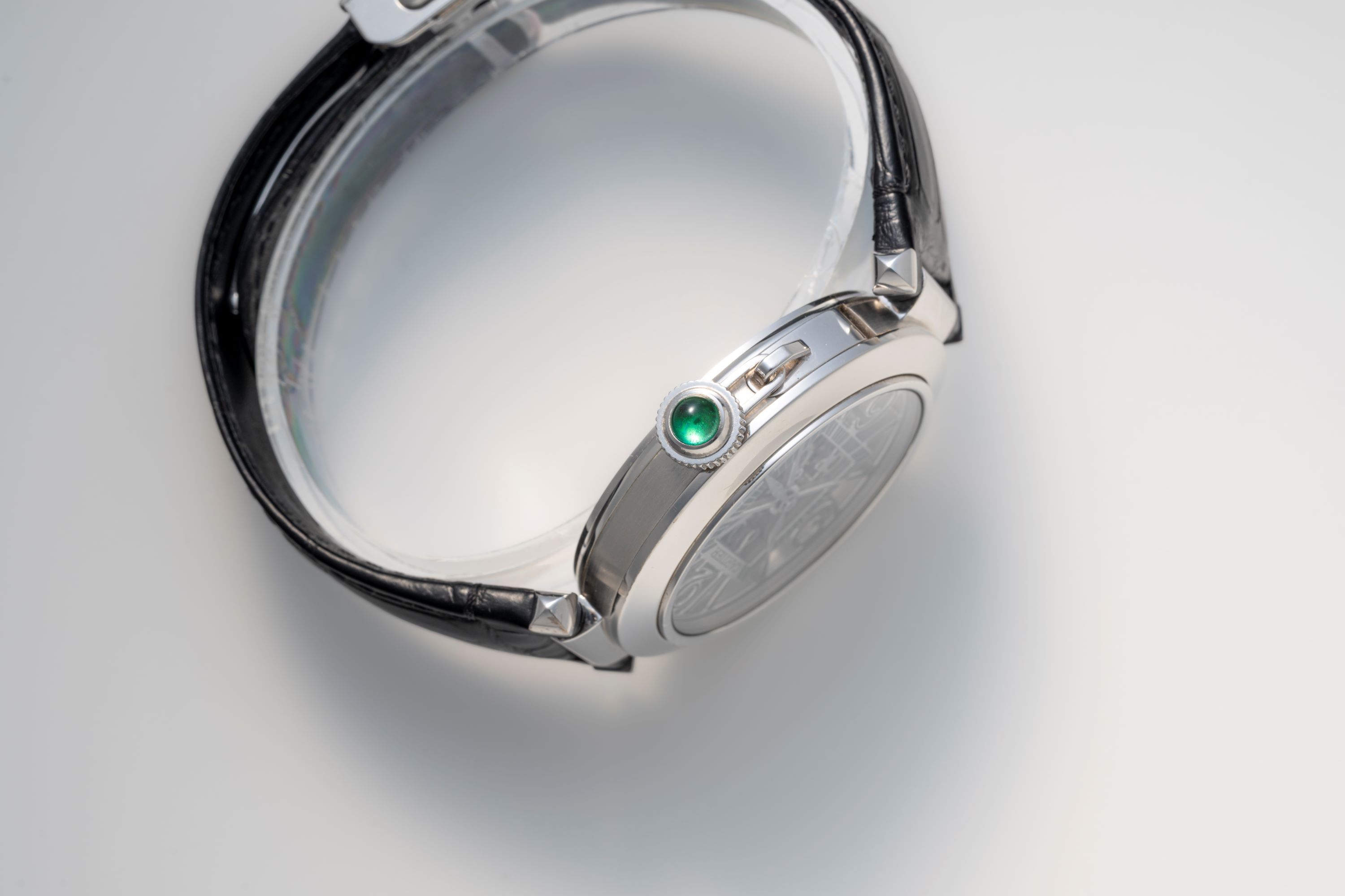 CaseRound case in 18k white gold with emerald cabouchon crown at 3 o'clock, display caseback