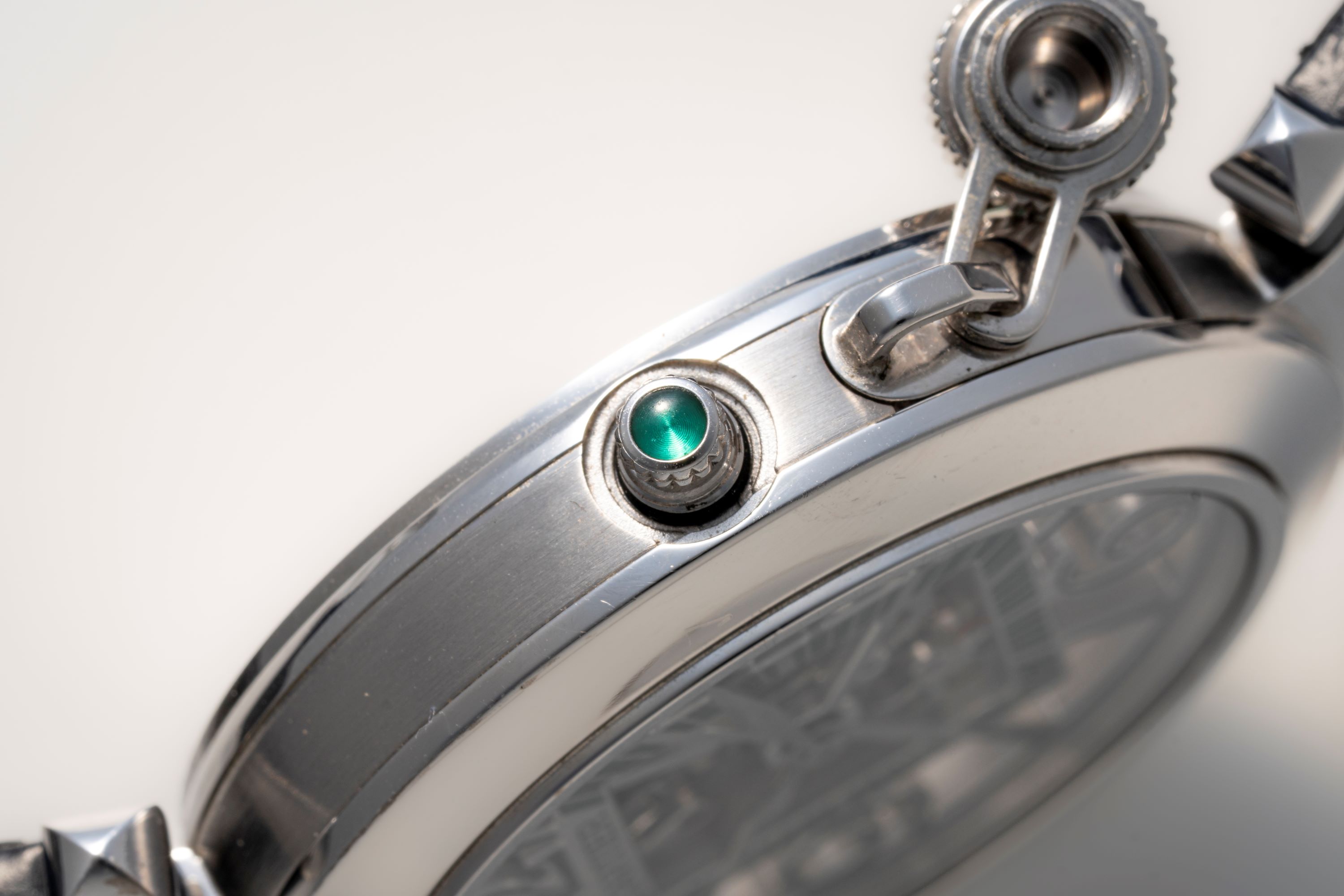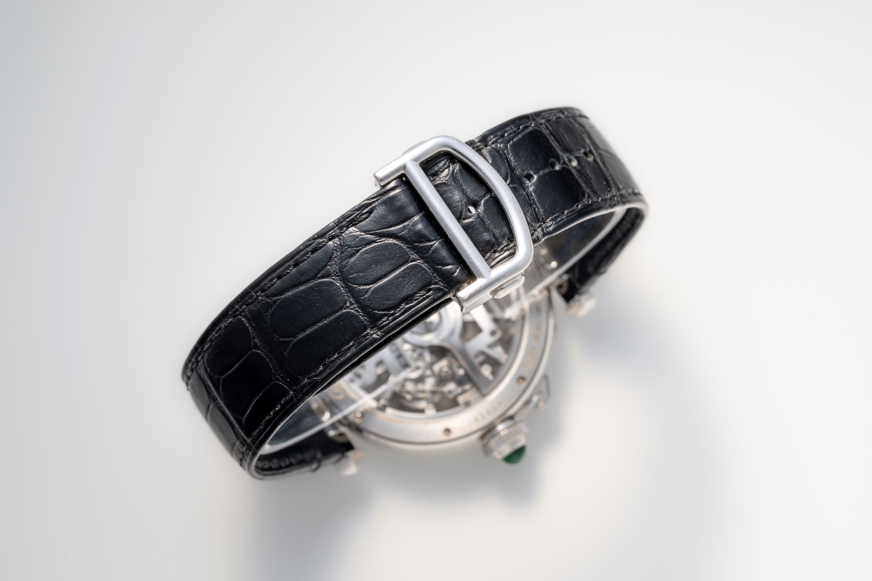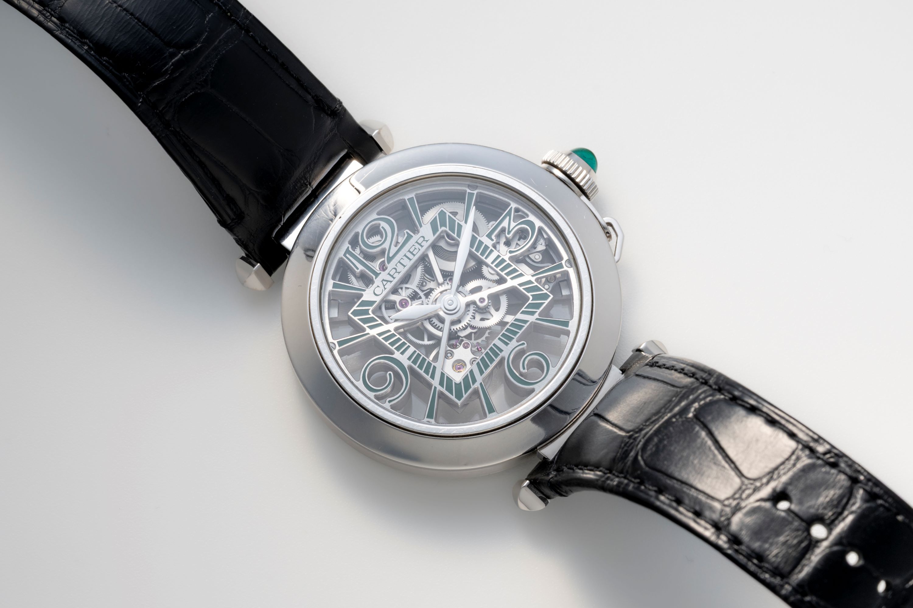 The Cartier Limited Edition Pasha Skeleton Emerald Ref. WHPA0013 offers a compelling opportunity for collectors seeking a rare and design-driven expression of Cartier’s contemporary watchmaking. Produced in a strictly limited run of 15 pieces, the watch combines the signature Pasha case architecture in 18k white gold with a fully open-worked movement, allowing an unobstructed view of its mechanical structure. Its most distinguishing feature is the emerald-green skeleton treatment, which gives the bridges and platework a vivid chromatic presence. This combination of precious-metal construction, modern skeletonization, and bold color makes the reference markedly different from standard Pasha models. Its limited availability further strengthens its appeal, offering bidders the chance to acquire a scarce and visually distinctive creation from one of the most influential maisons in watchmaking history.