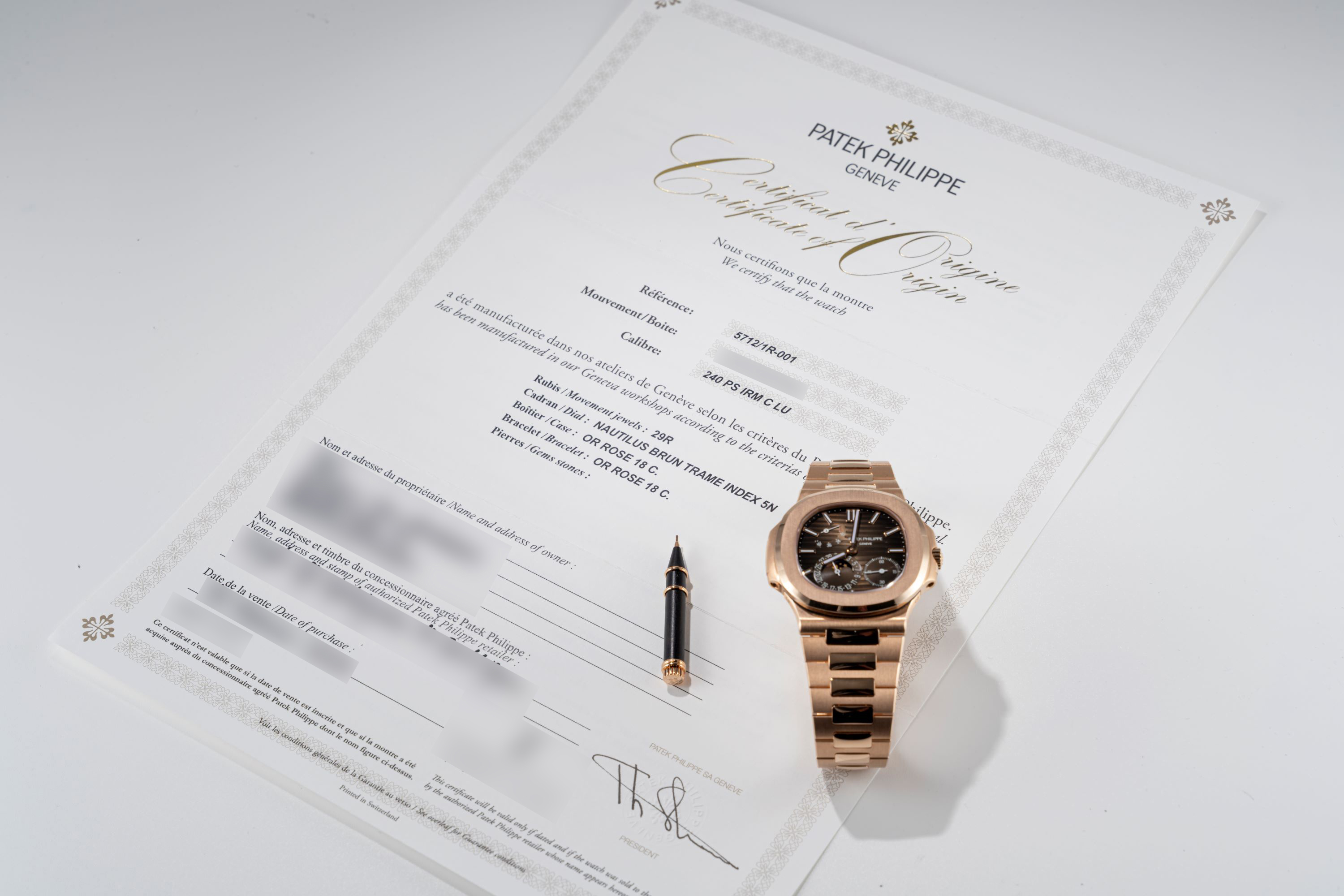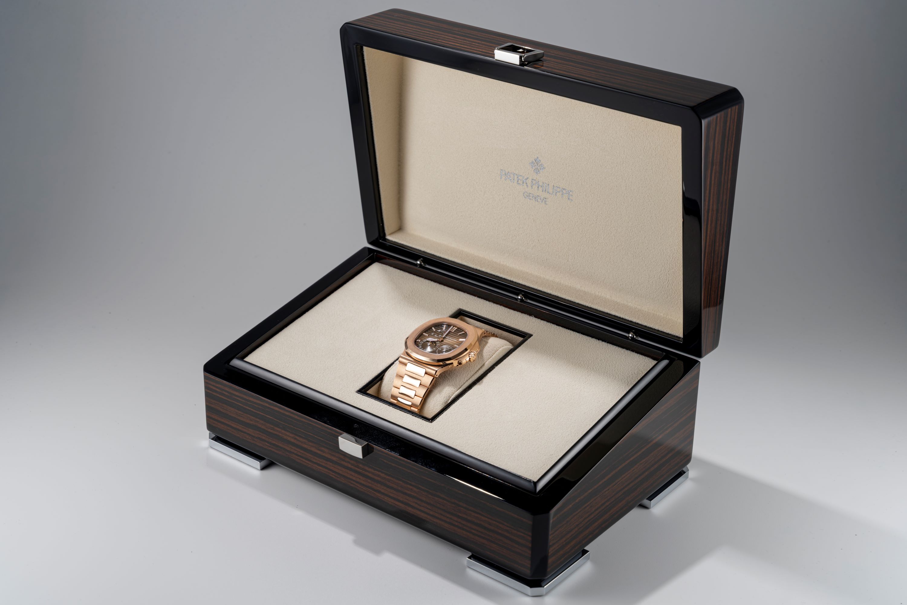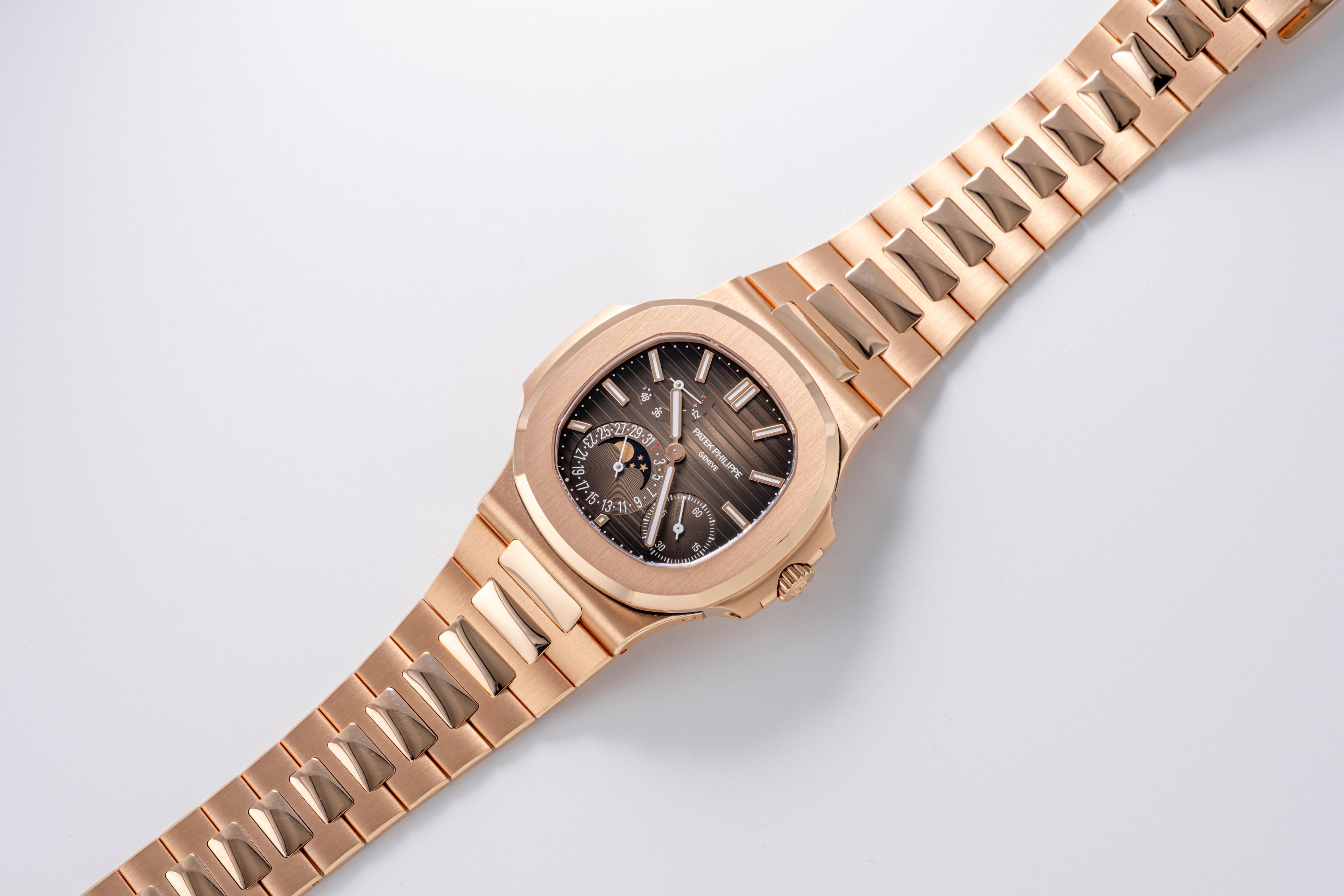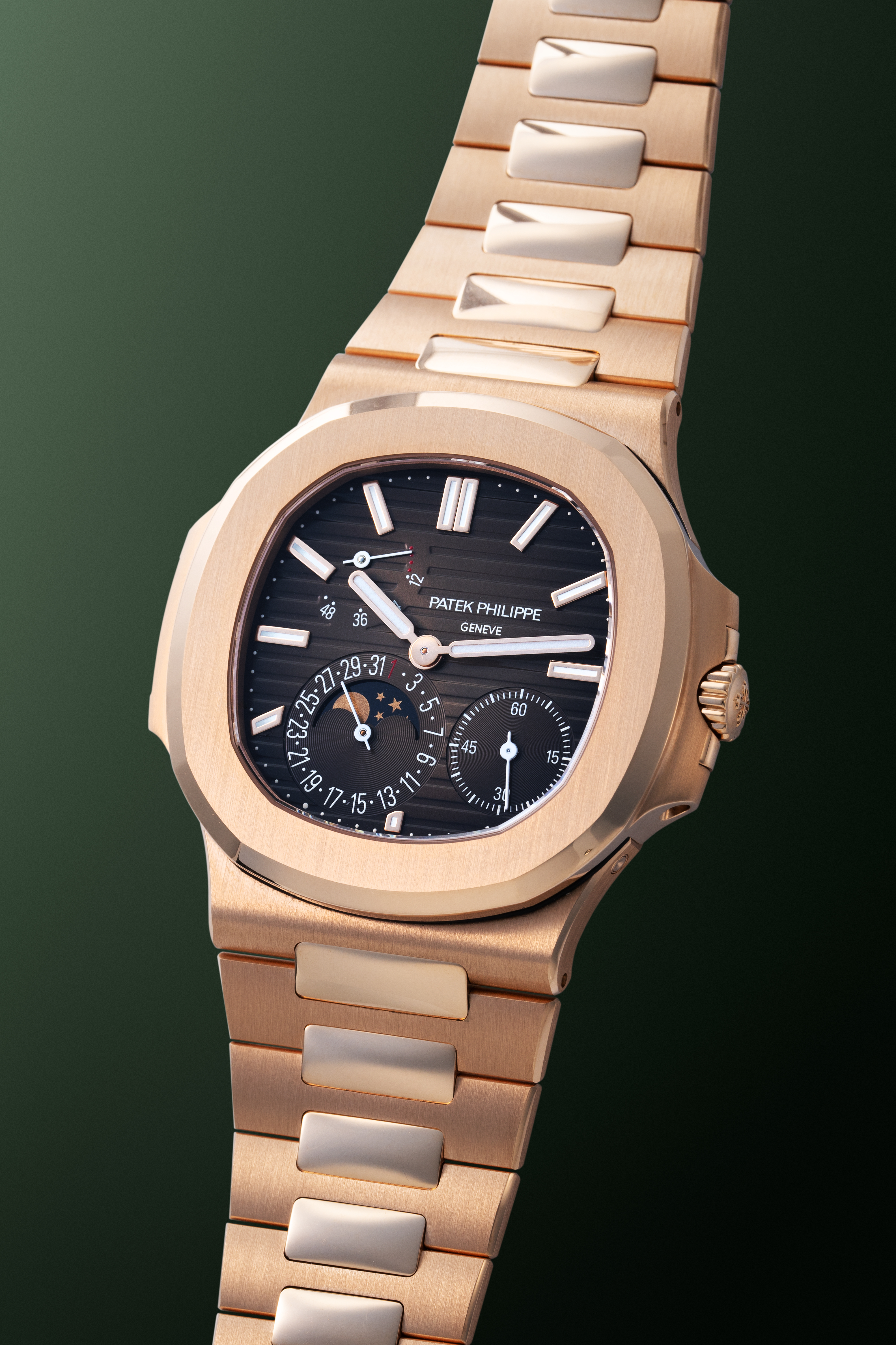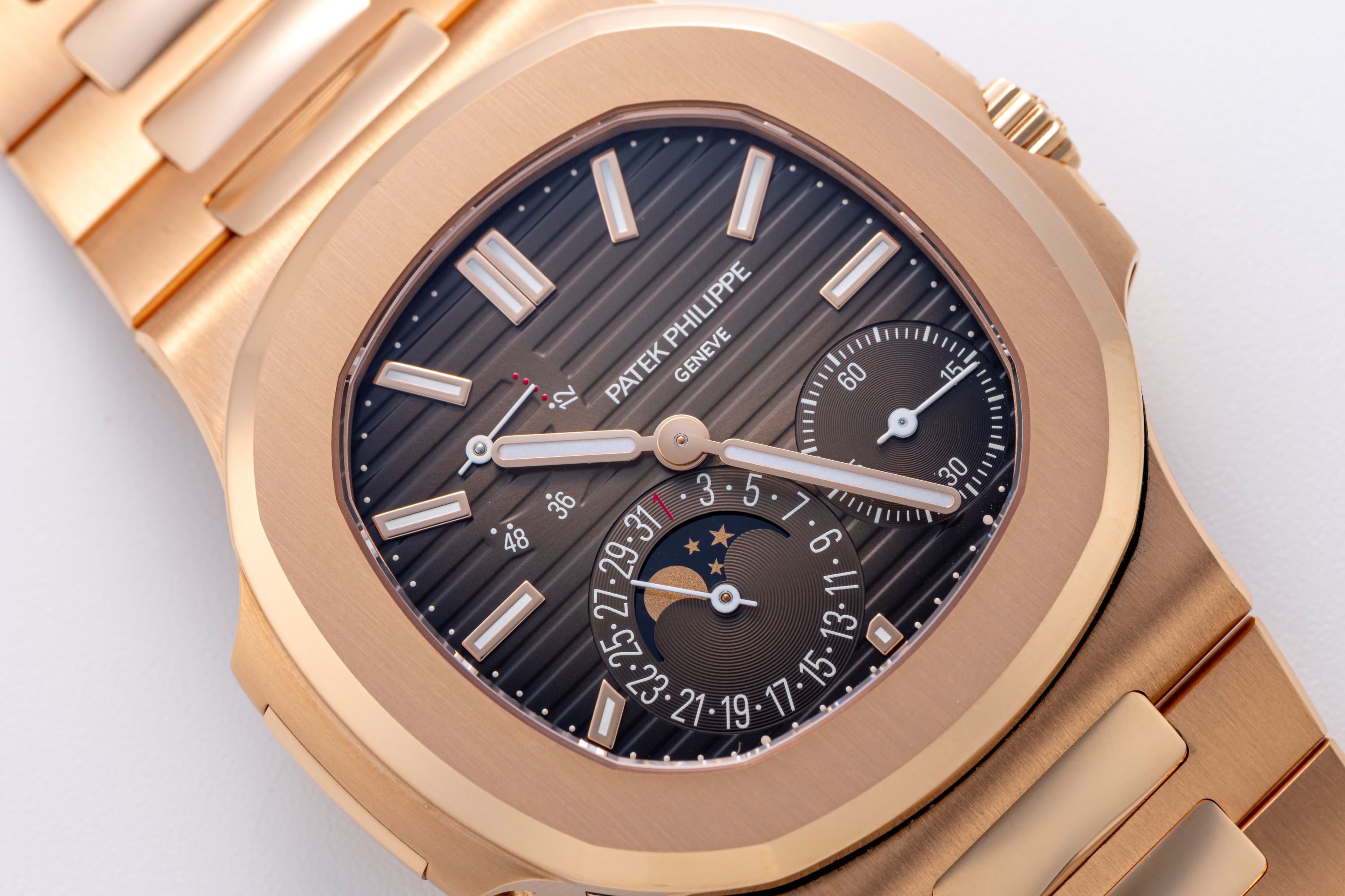 The Patek Philippe Nautilus Ref. 5712/1R-001 elevates the brand’s iconic luxury sports watch into a fully realized expression of haute horlogerie. Introduced in 2023, this rose-gold execution refines the Nautilus’s signature scalloped case while incorporating one of the model line’s most poetic sets of complications. Crafted entirely in 18k rose gold, including the integrated bracelet, this version represents one of the most sought-after configurations, offering both visual warmth and a strong wrist presence. The 40 mm case maintains the classic Nautilus proportions and features a mix of satin-brushed surfaces and polished bevels that highlight Patek Philippe’s high finishing standards. The matching bracelet, fitted with a butterfly folding clasp, ensures seamless integration and comfortable wear. The dial shines in a brown sunburst finish with horizontal embossing, a hallmark of the Nautilus aesthetic. The power-reserve indicator arcs between 10 and 11 o’clock, the moon-phase and date occupy the 7 o’clock sub-dial, and the small seconds are positioned at 5 o’clock. This asymmetrical yet balanced arrangement has become one of the defining traits of the reference. Inside, the watch is powered by the in-house automatic Calibre 240 PS, featuring a 22k gold micro-rotor, moon-phase mechanism, date indication, small seconds and a power-reserve display. Finishing includes Côtes de Genève, hand-polished bevels, and the Patek Philippe Seal. The thin construction of the movement enables the case to hug the wrist at only 8.5mm in thickness, contributing to its excellent wearability. Highly coveted since its debut, the 5712/1R-001 in full rose gold stands as one of the most interesting expressions of the modern Nautilus, uniting complication, precious-metal execution and integrated-bracelet-design in a single, cohesive statement piece.