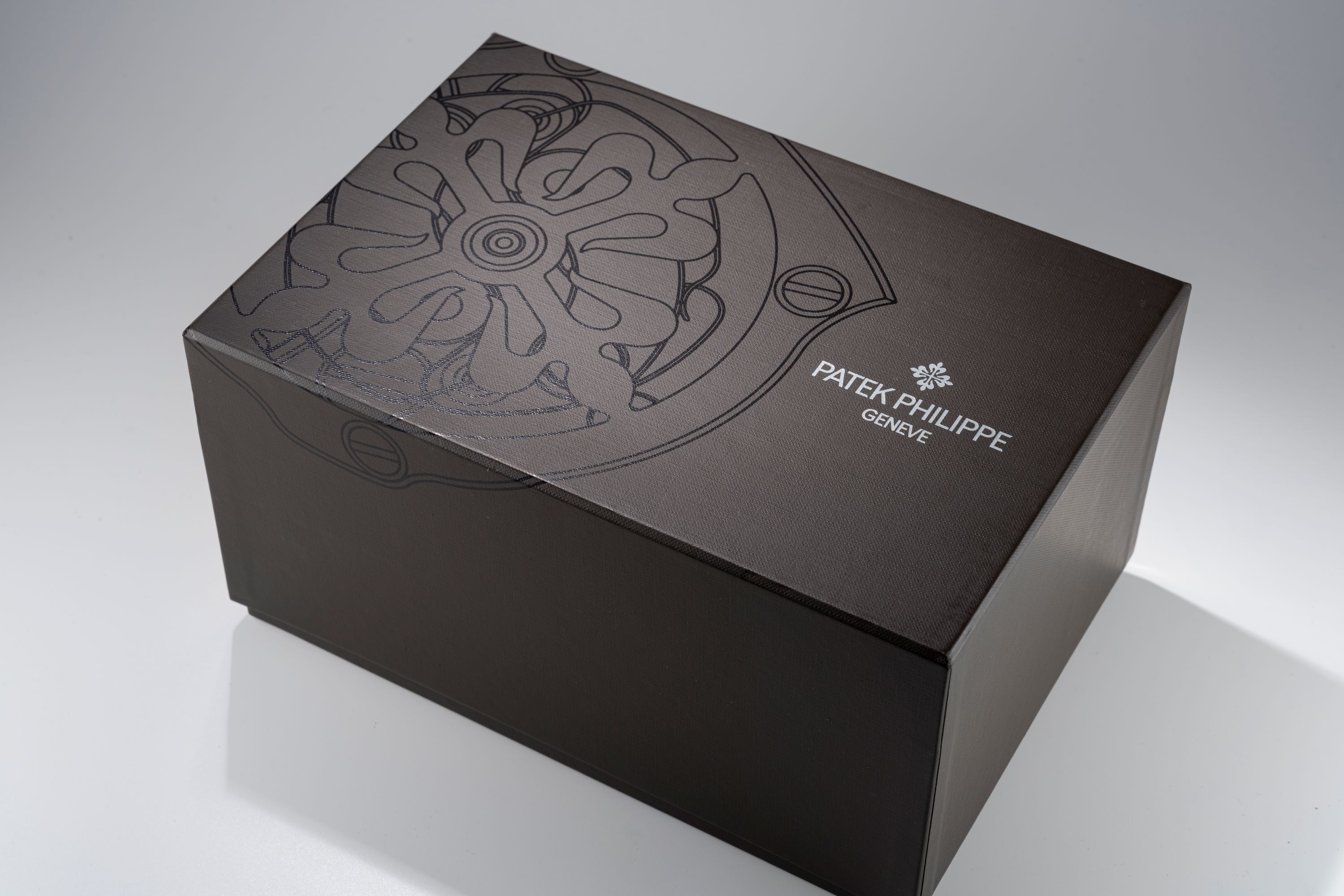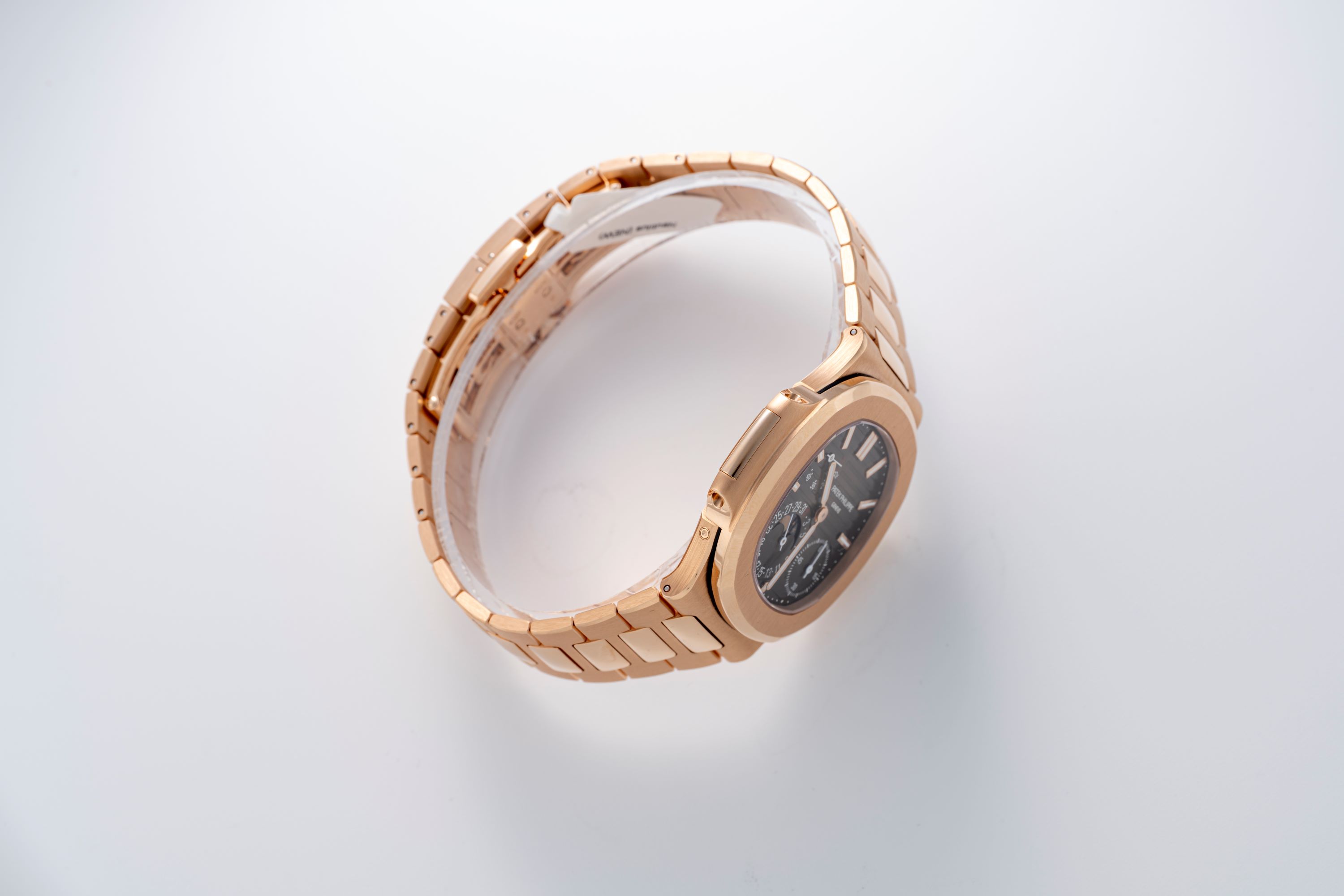 DialBrown fumé sunburst dial with applied rose gold luminous indices, rose gold luminous hands, power reserve at 10:30, moonphase and date at 7 o'clock, small seconds at 4 o'clock, signed 'Patek Philippe' at 2 o'clock