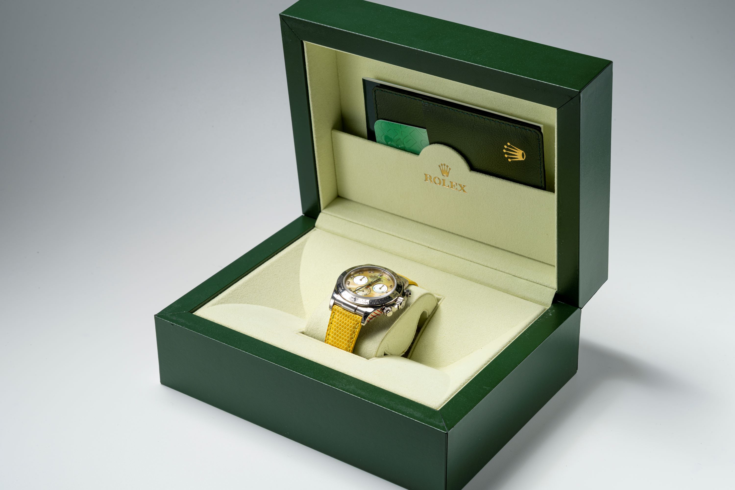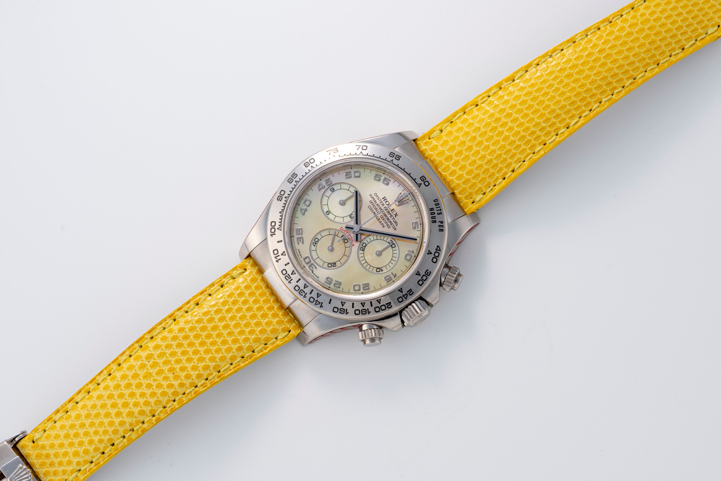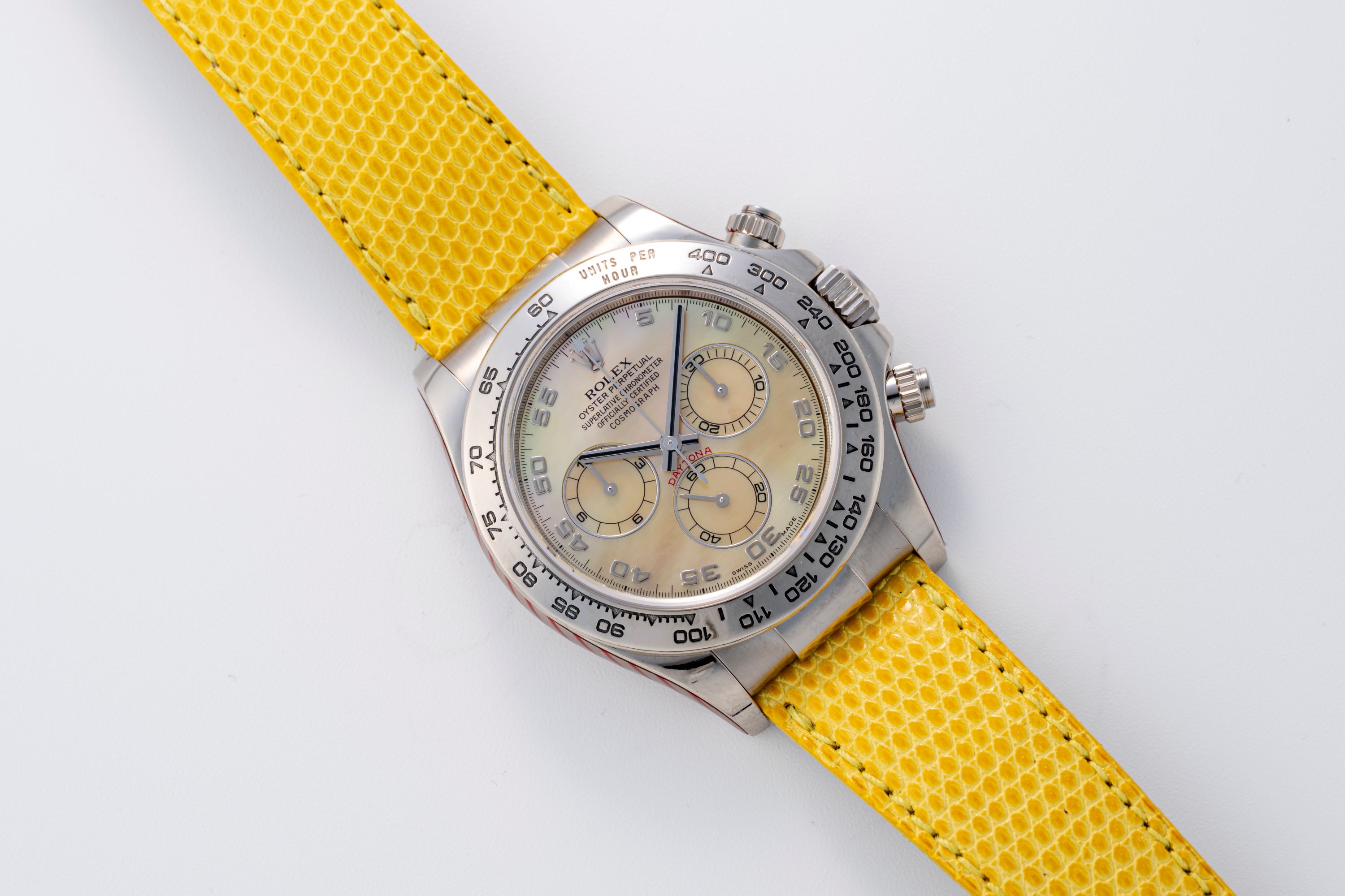 The Ref. 116519 presents a refined interpretation of the Daytona in 18k white gold, distinguished most clearly by its yellow-ish mother-of-pearl dial with Arabic numerals, an uncommon and highly sought-after configuration within the model line. The 40 mm case maintains the familiar proportions of the modern Daytona while elevating the watch through precious-metal construction and meticulous finishing. On the wrist, the piece combines the sporty character of the Daytona with a striking colour palette rarely seen in the collection. It is powered by the in-house Calibre 4130, Rolex’s first fully proprietary automatic chronograph movement following the era of the Zenith-based Daytonas. Paired with the yellow ‘Beach’ Daytona’s lizard strap, the dial and case form a distinctive ensemble that appeals to collectors seeking a more unusual and expressive variation of Rolex’s iconic chronograph.