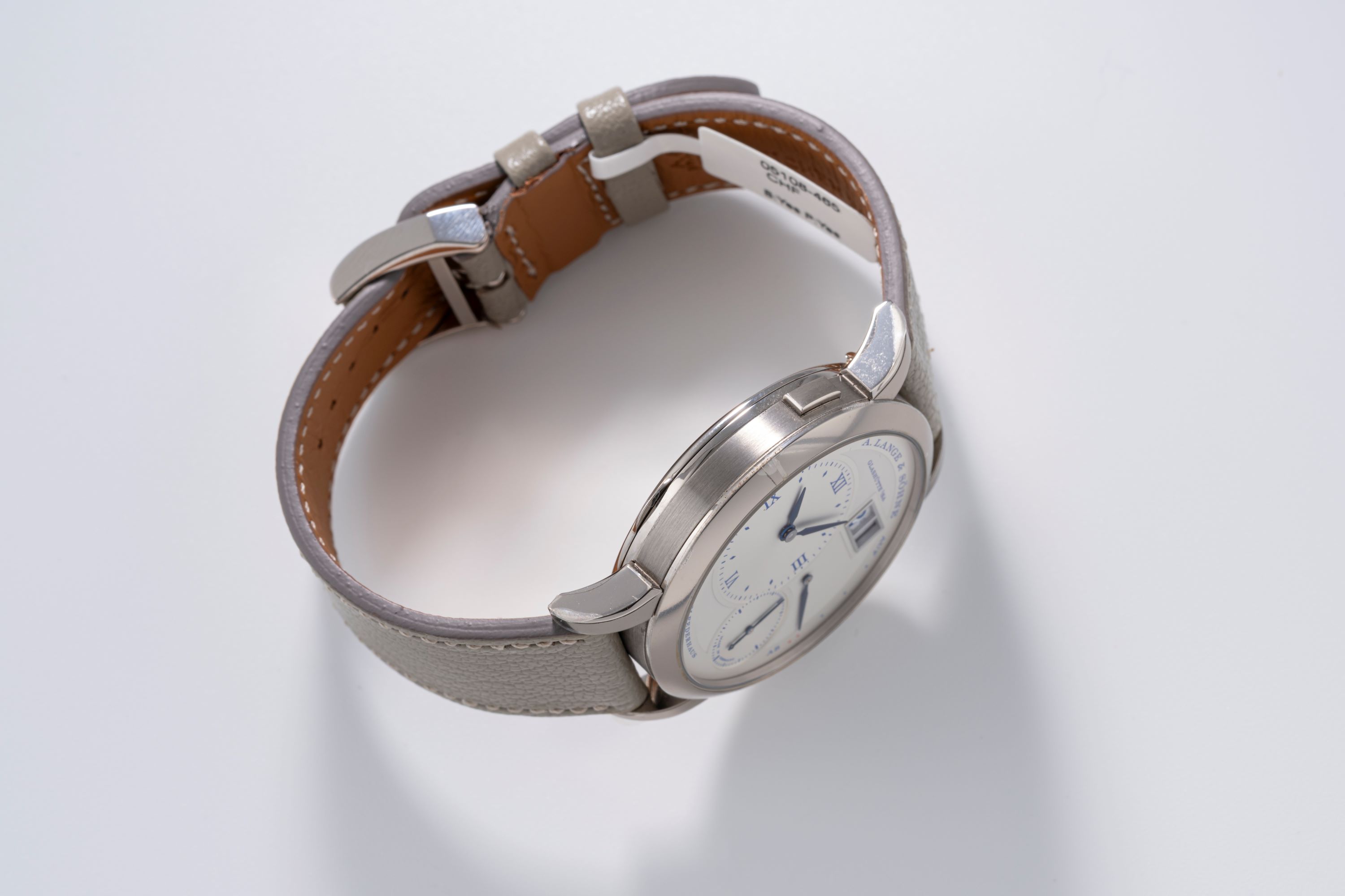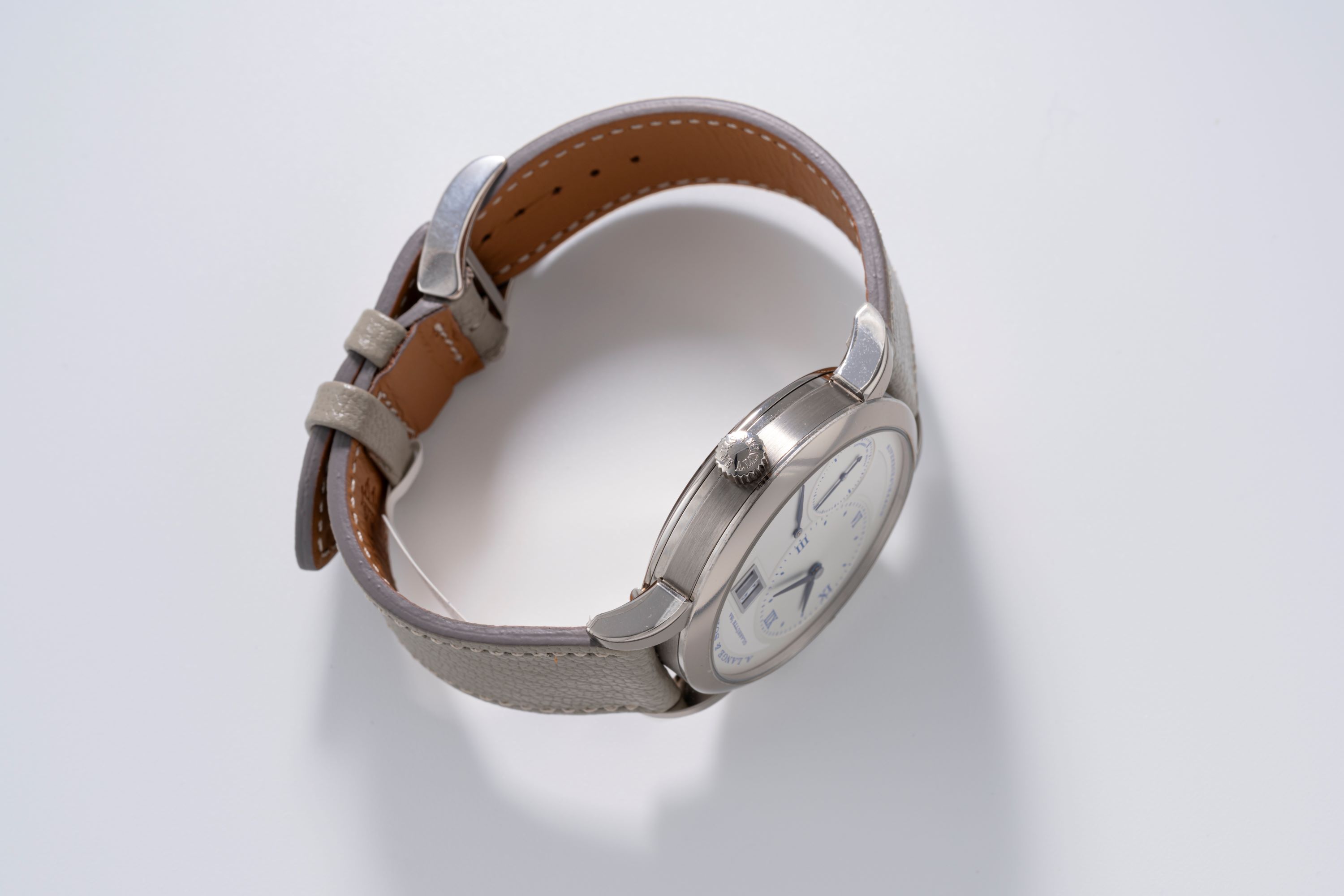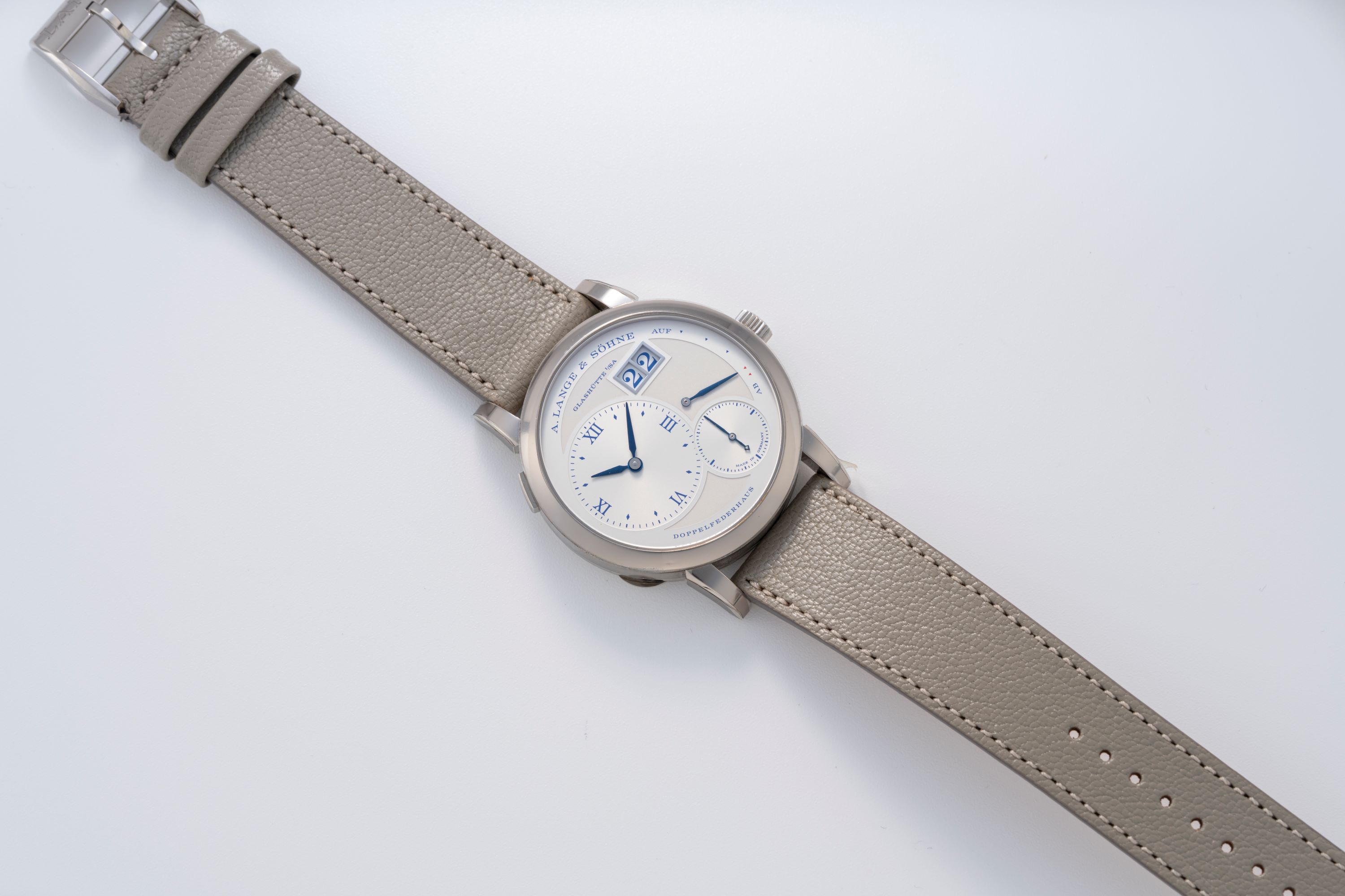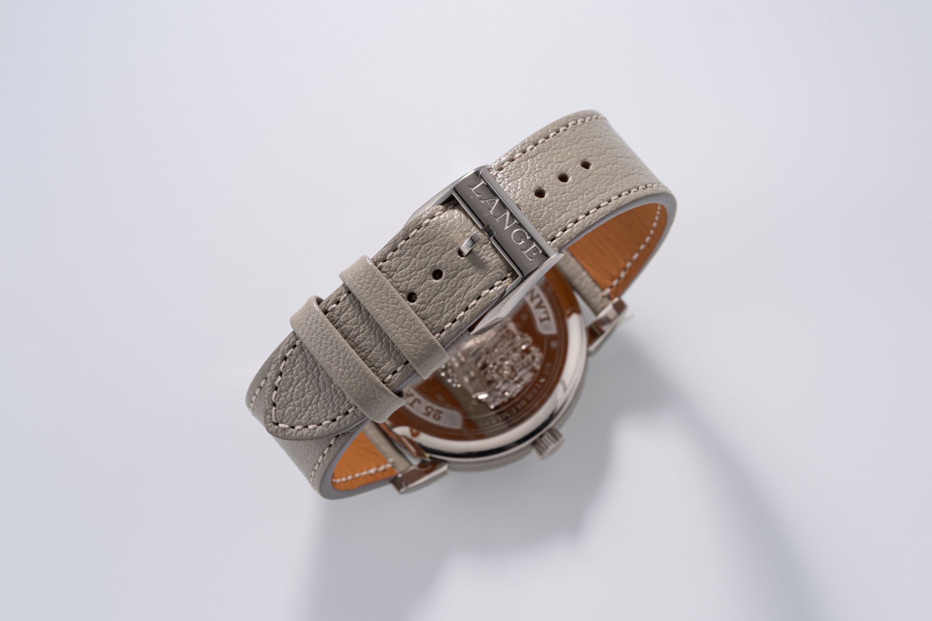 StrapGrey leather strap with original Lange pin buckle in 18k white gold