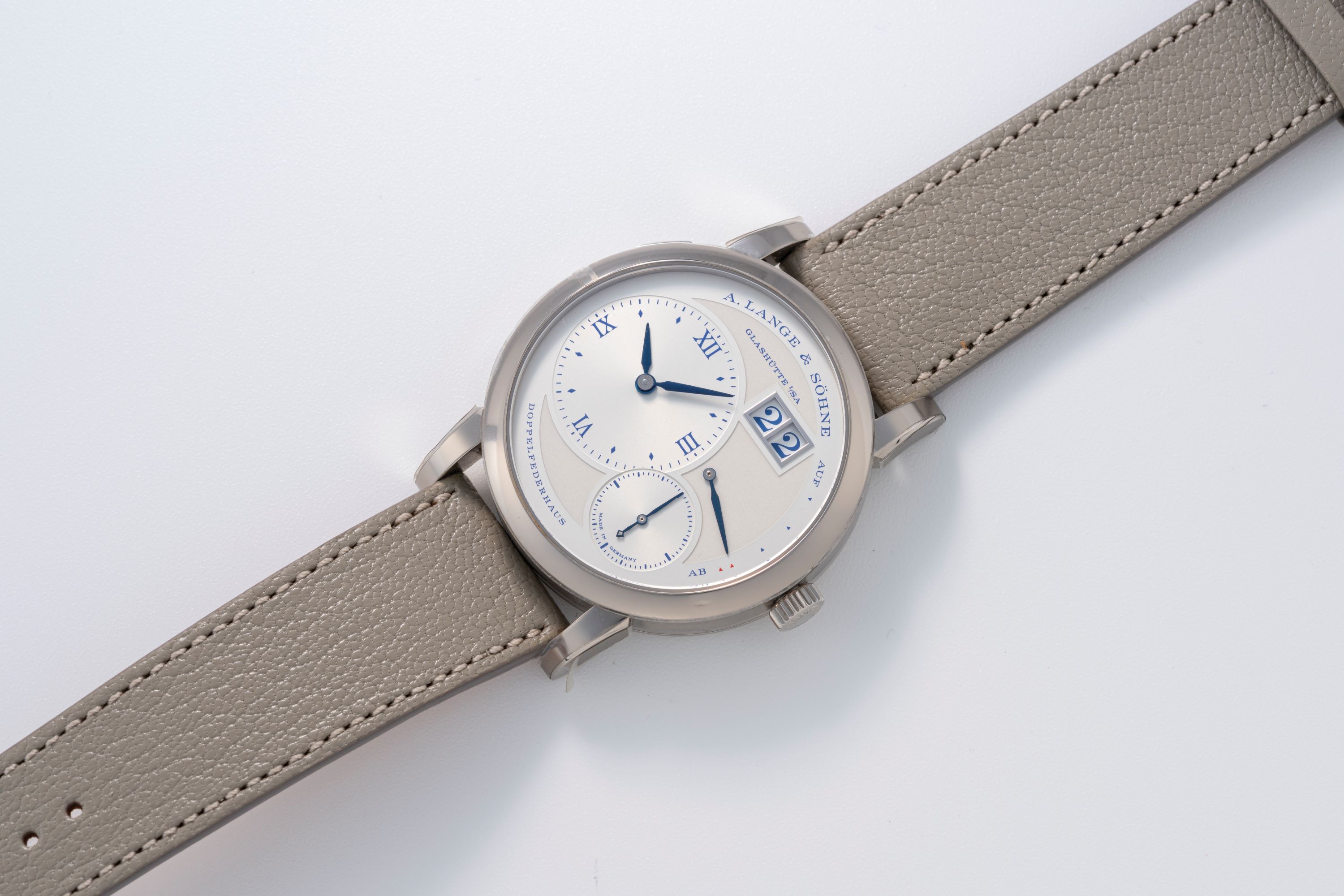 DialTwo-tone silver dial with blue accents, hours and minutes subdial at 9 o'clock, small seconds at 4 o'clock, power reserve at 3 o'clock, and big date at 1 o'clock, signed 'A. Lange & Söhne' at 12 o'clock