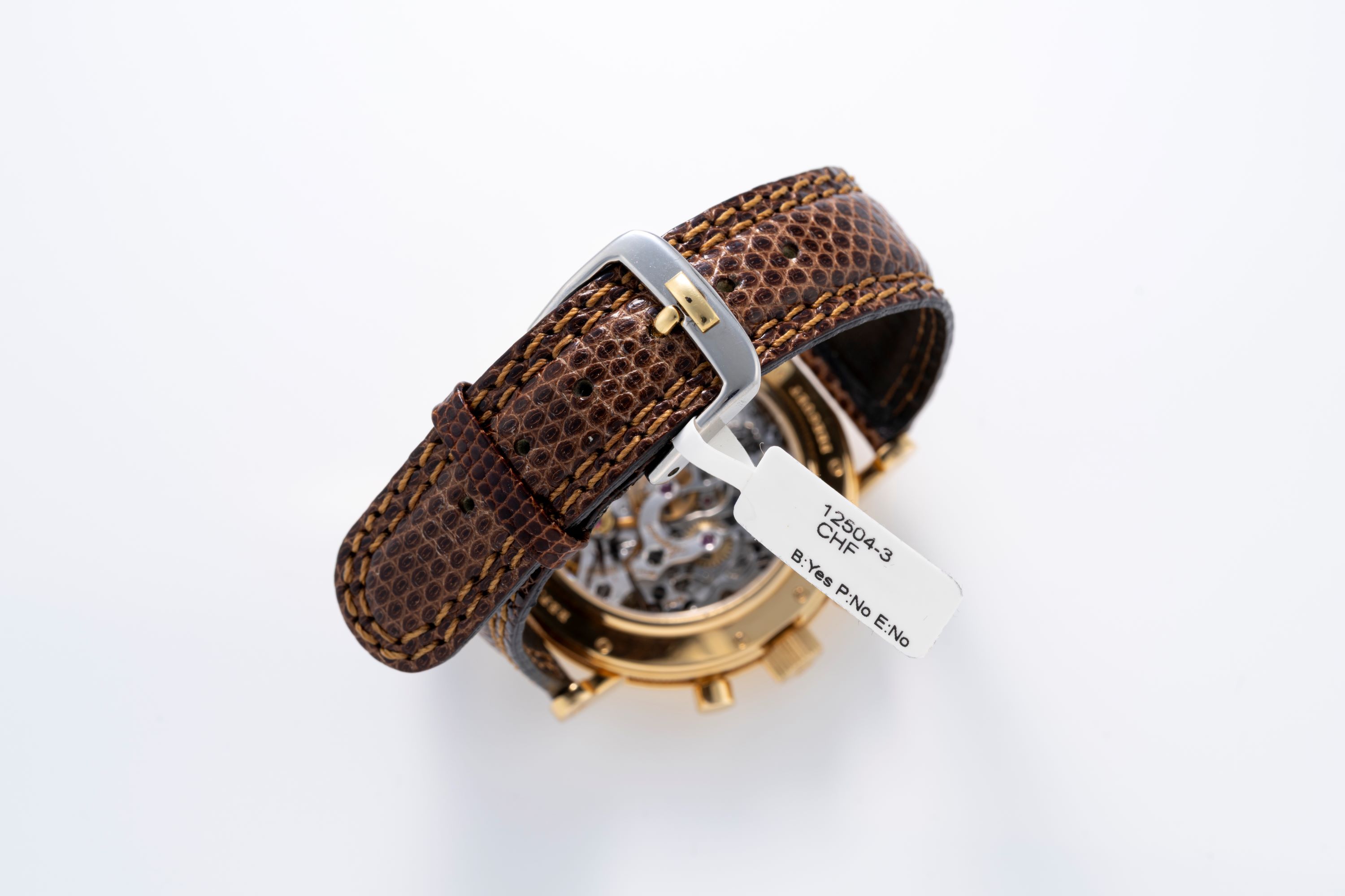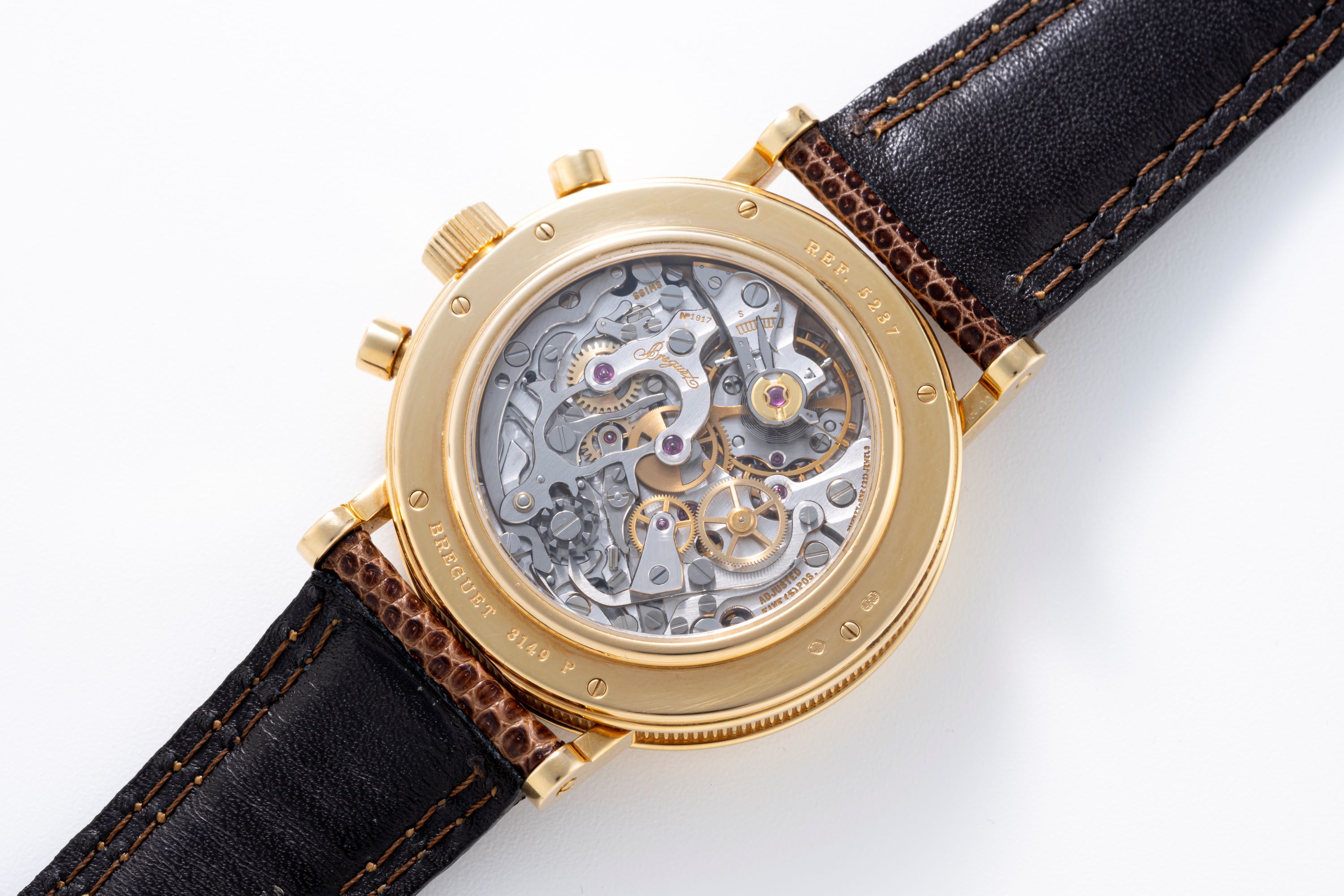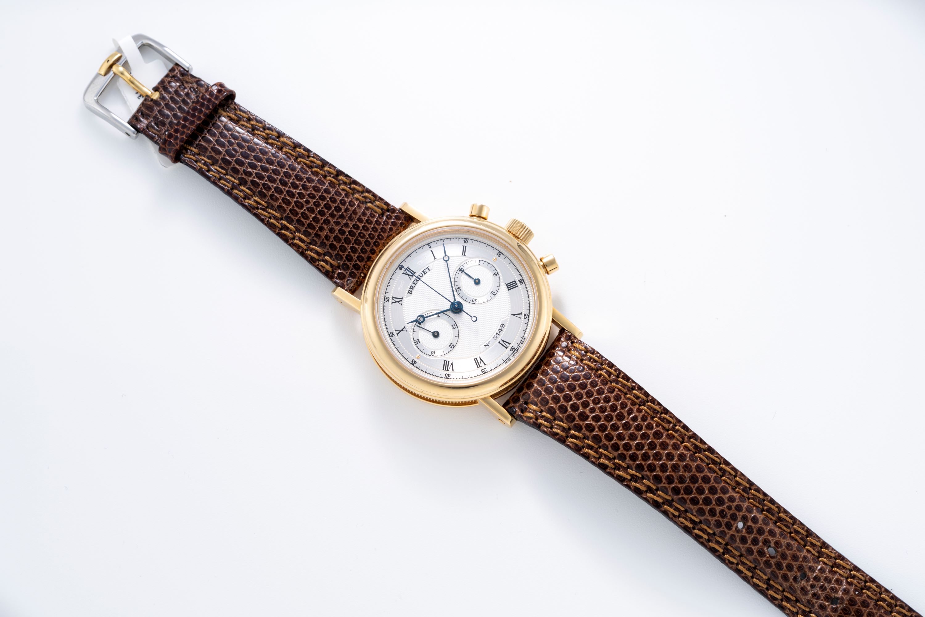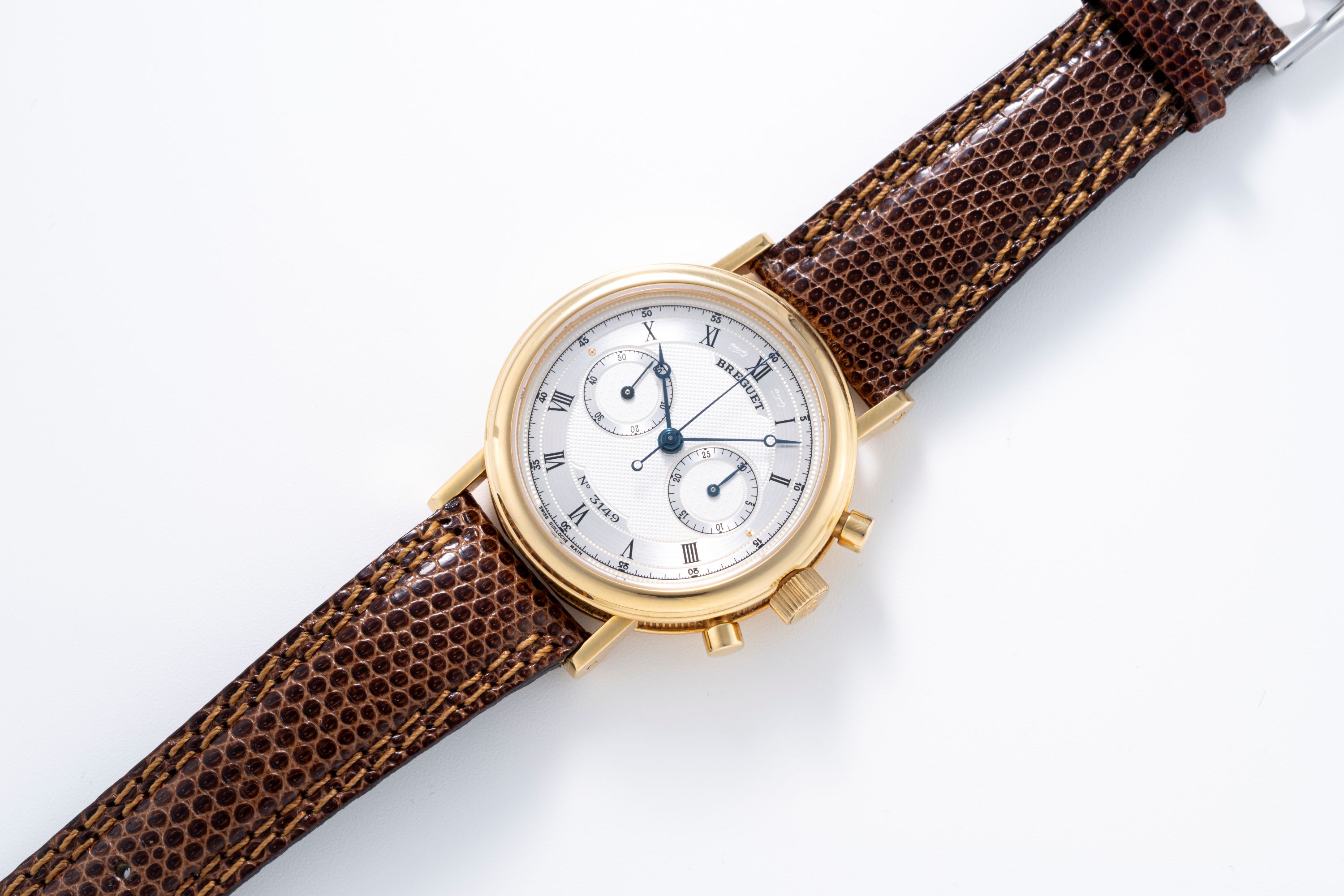 DialSilver guilloche dial with roman numerals, heat-blued hands, small seconds at 9 o'clock, 30 minute chronograph counter at 3 o'clock, signed 'Breguet' at 12 o'clock