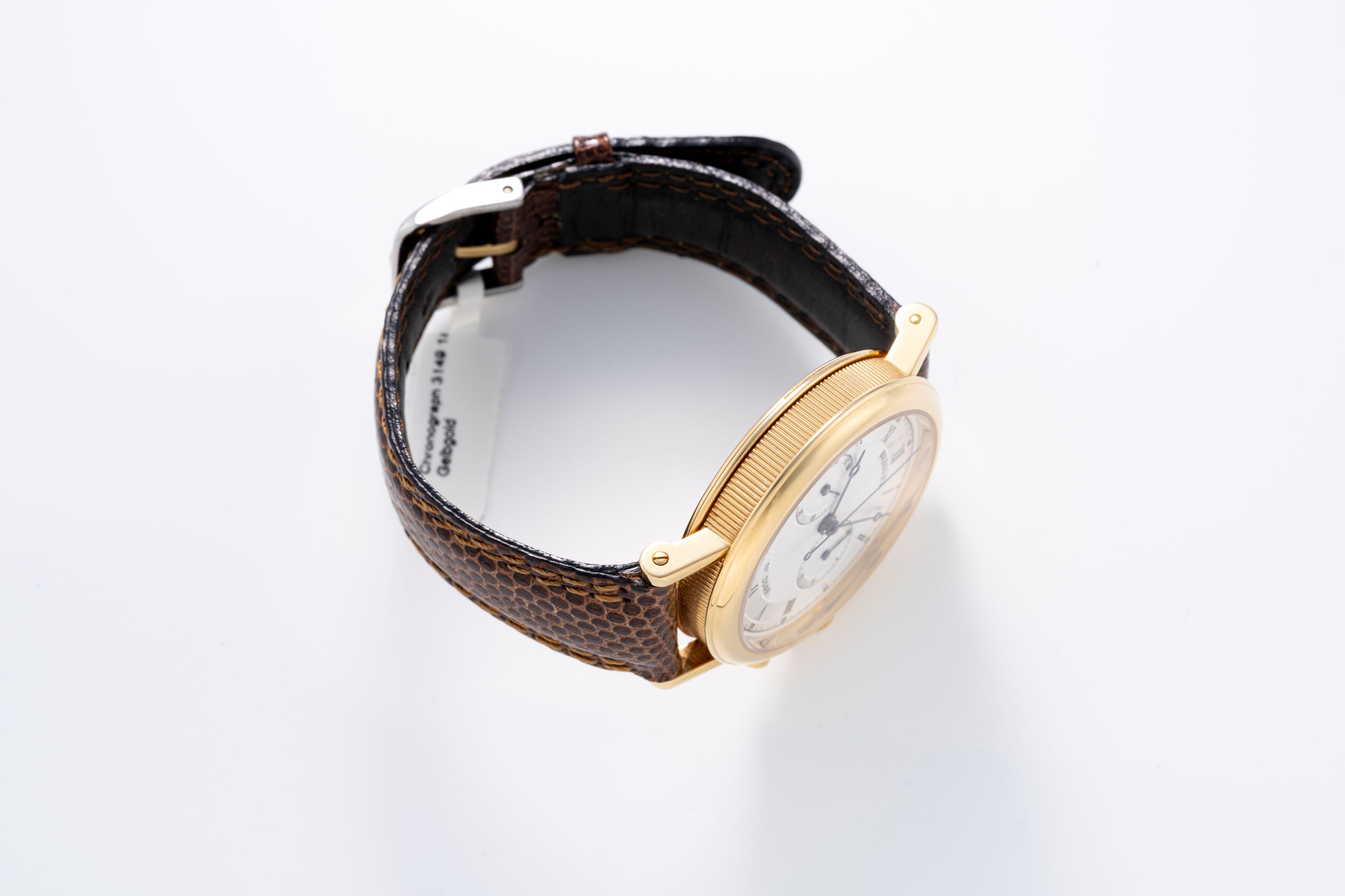 This Breguet Classique Chronograph Ref. 5237 in 18k yellow gold offers the hallmarks of the brand’s traditional design language in a form that appears more contemporary. The guilloché dial, blued Breguet hands, and fluted case flanks reflect long-established craft, while the Lemania-based chronograph movement provides practical functionality supported by thoughtful finishing. The 38mm case gives the watch a balanced presence on the wrist, making it suitable for both daily wear and more formal settings and takes the previous Ref. 3237 into the range of more contemporary watch size preference.