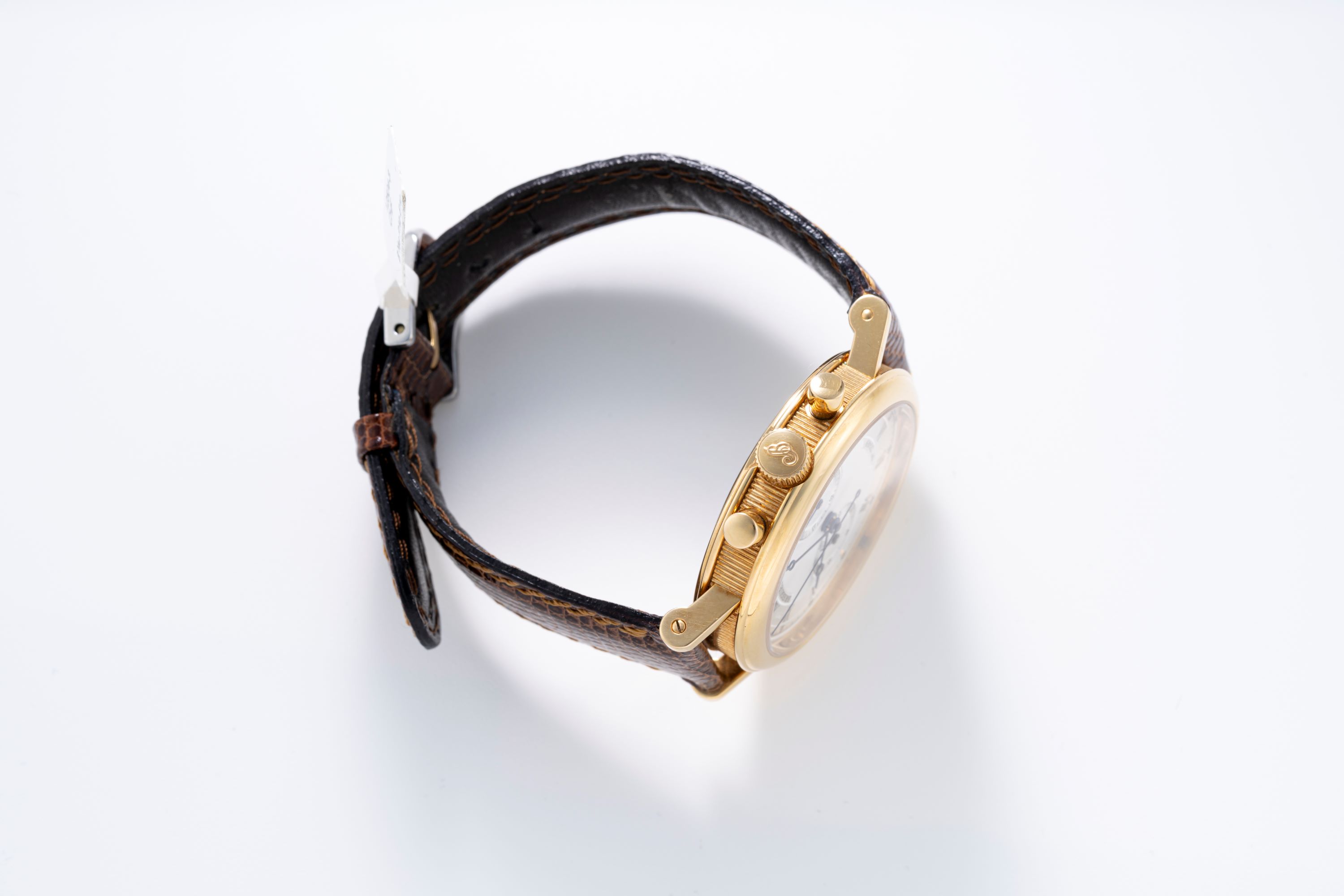 CaseRound case in 18k yellow gold with chronograph pushers at 2 and 4 o'clock, winding crown at 3 o'clock, display caseback