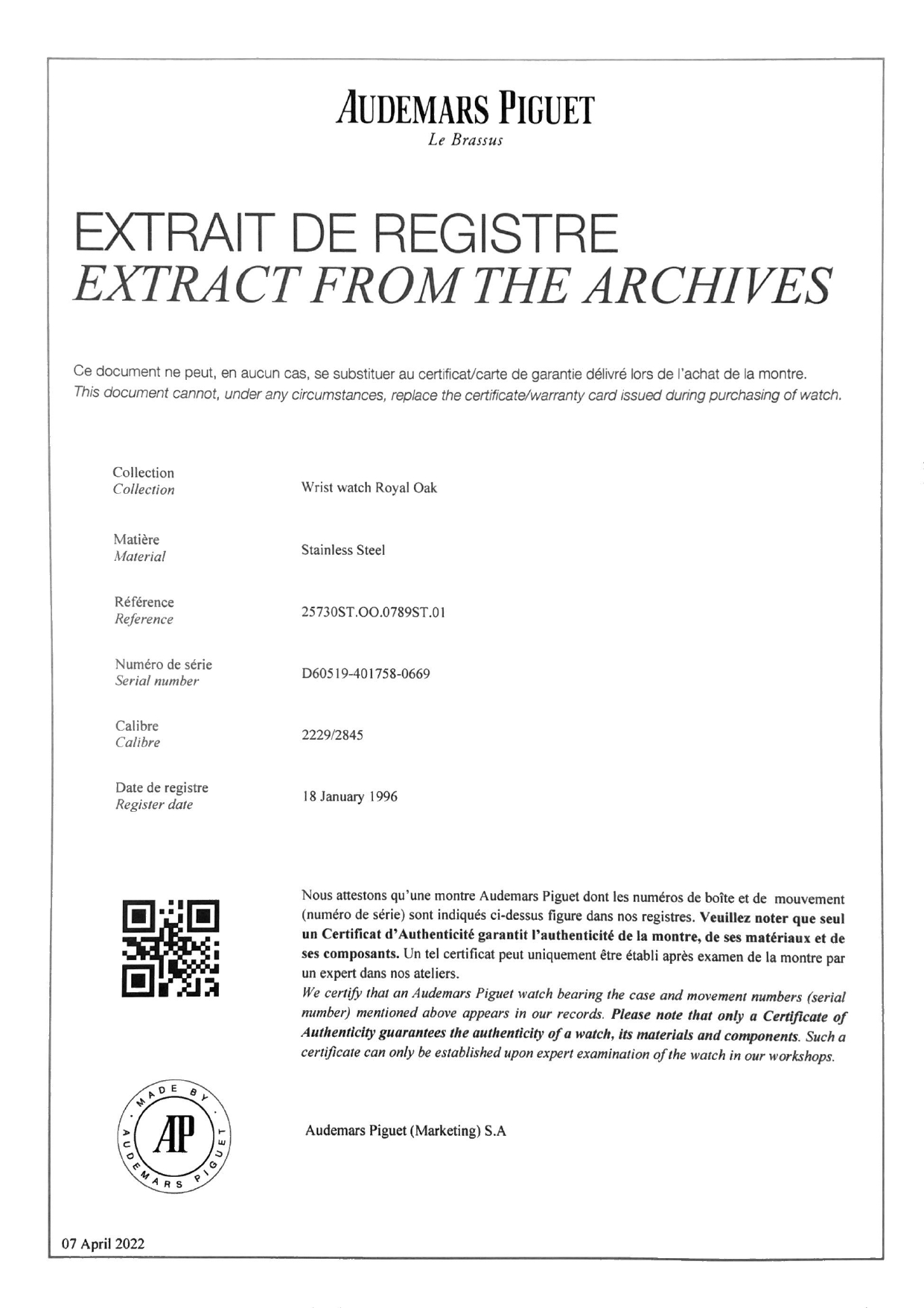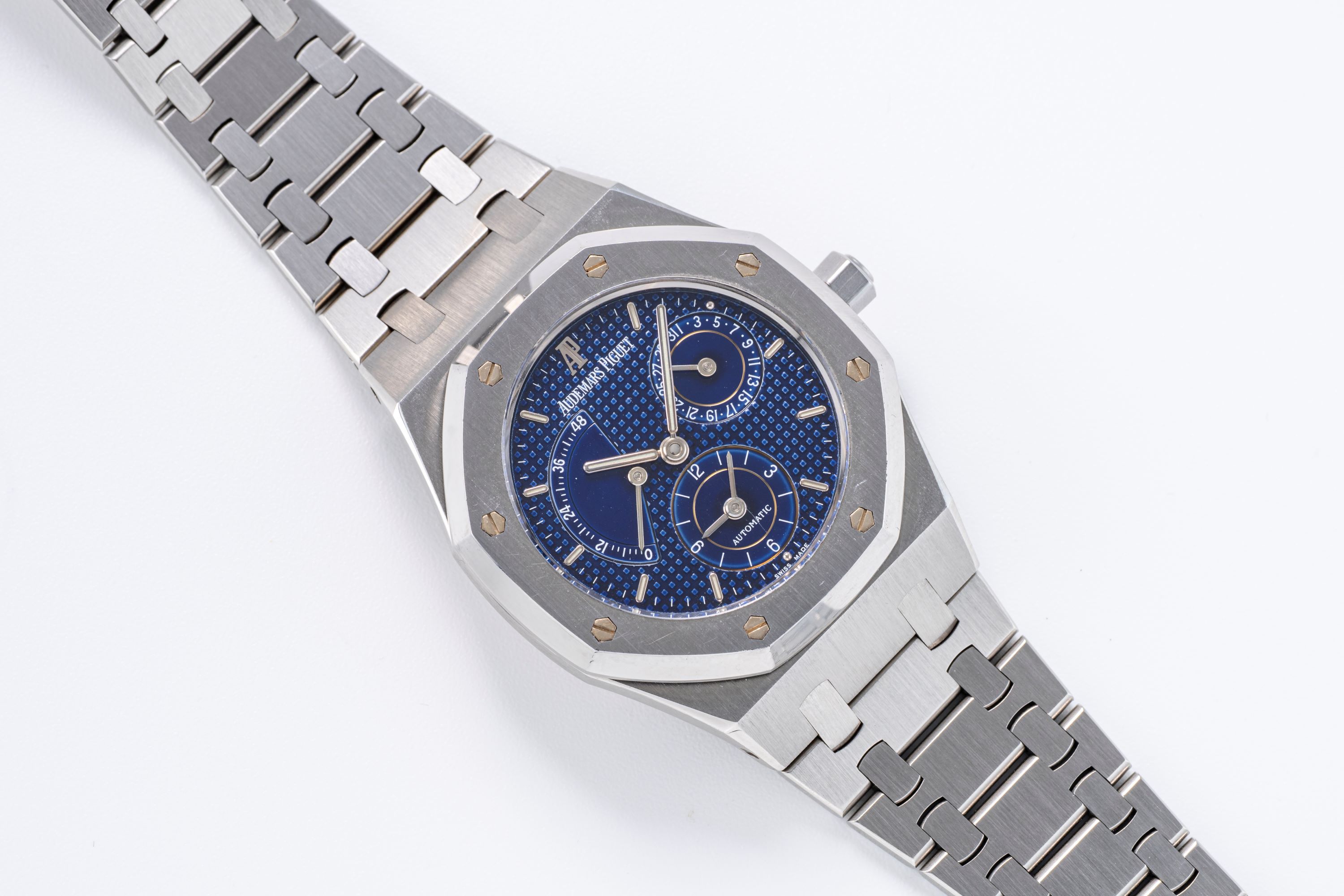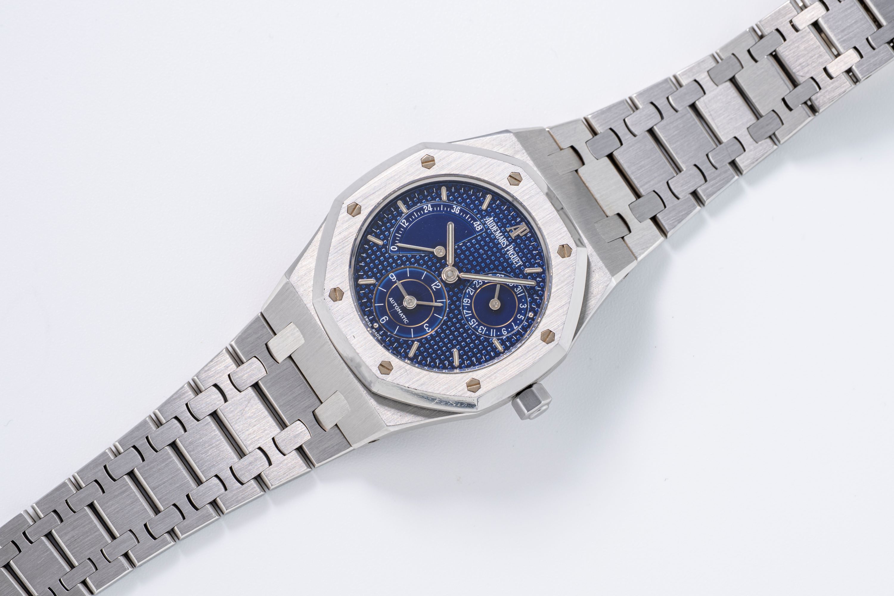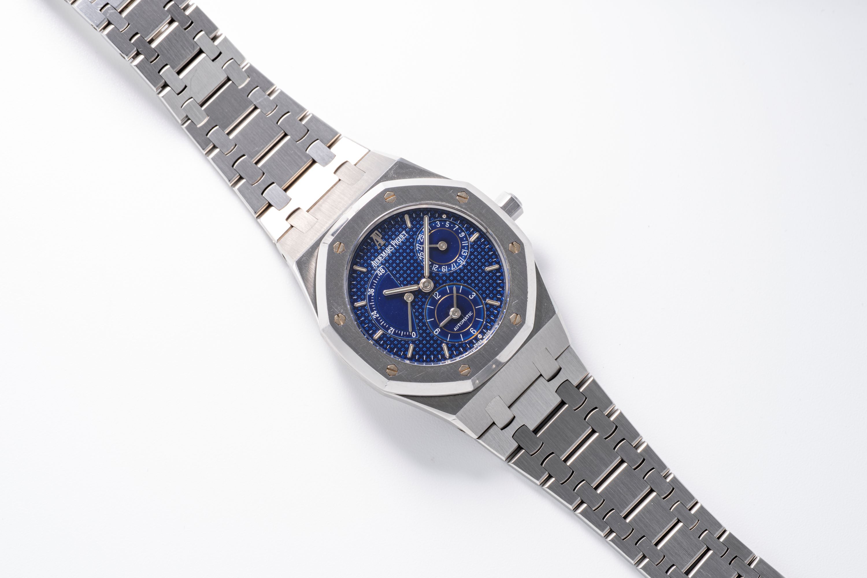 Dial'Yves Klein Blue' tapisserie dial with applied luminous indices, luminous hands, power reserve between 8 and 11 o'clock, second time zone at 6 o'clock, date at 2 o'clock, signed 'Audemars Piguet' at 12 o'clock