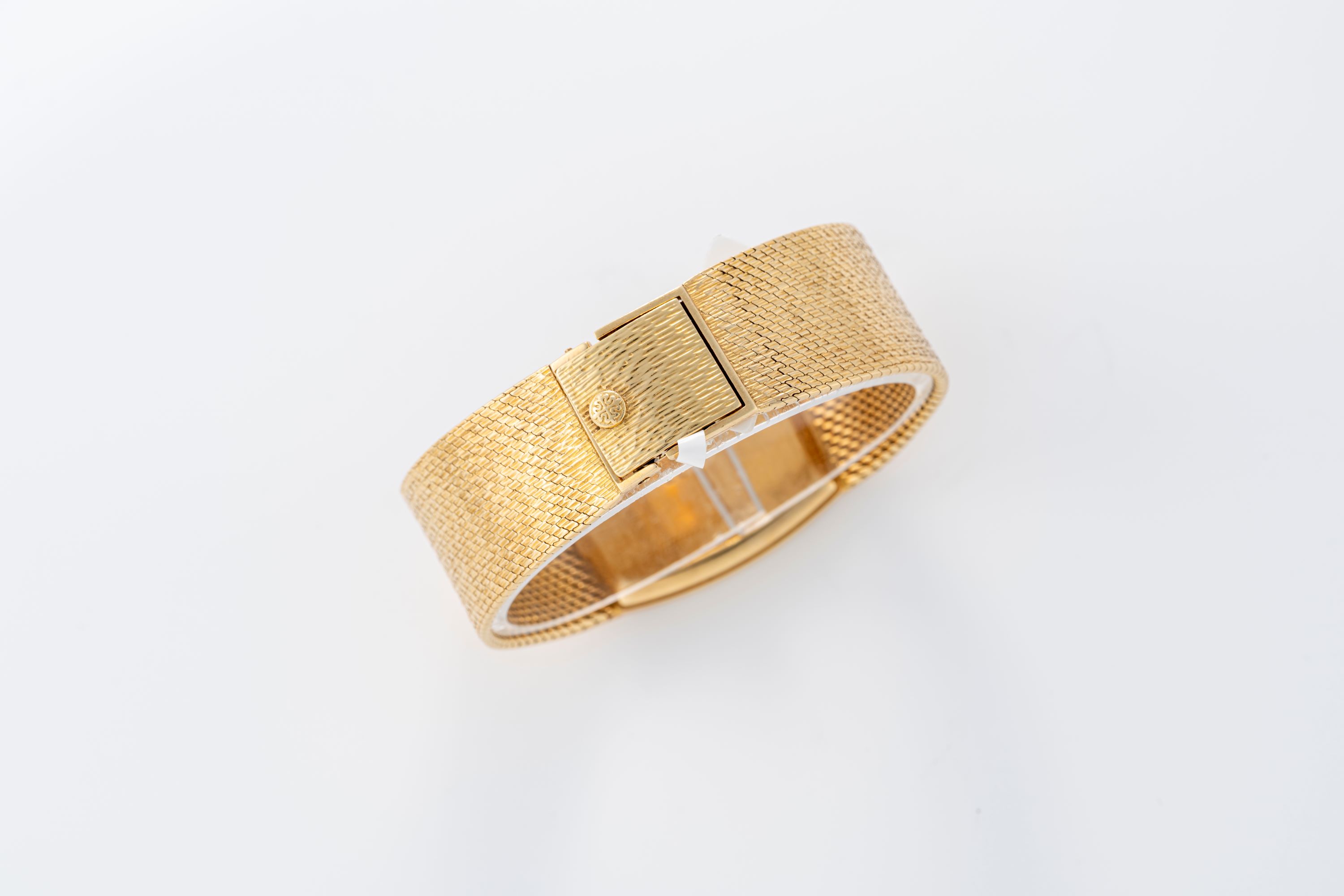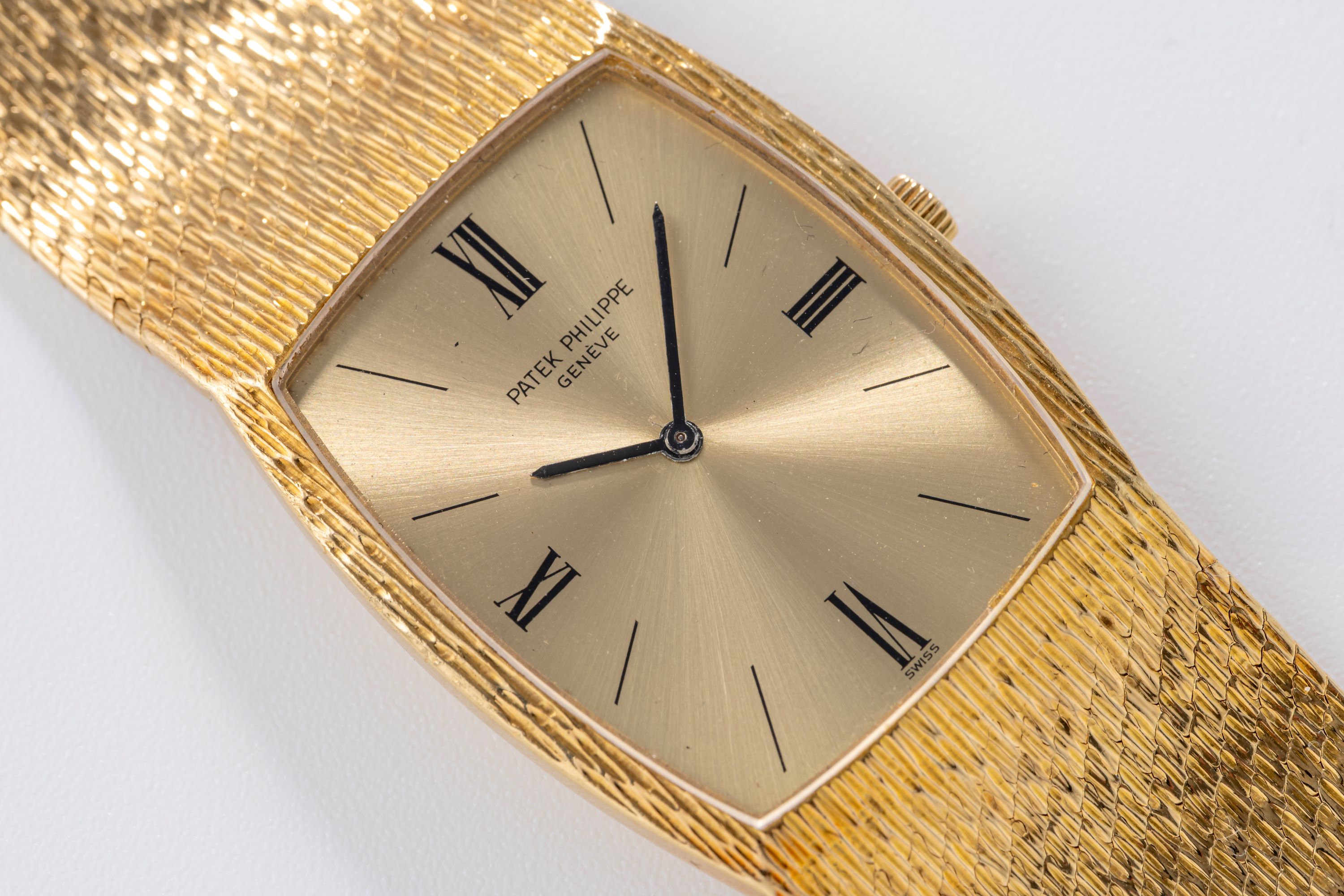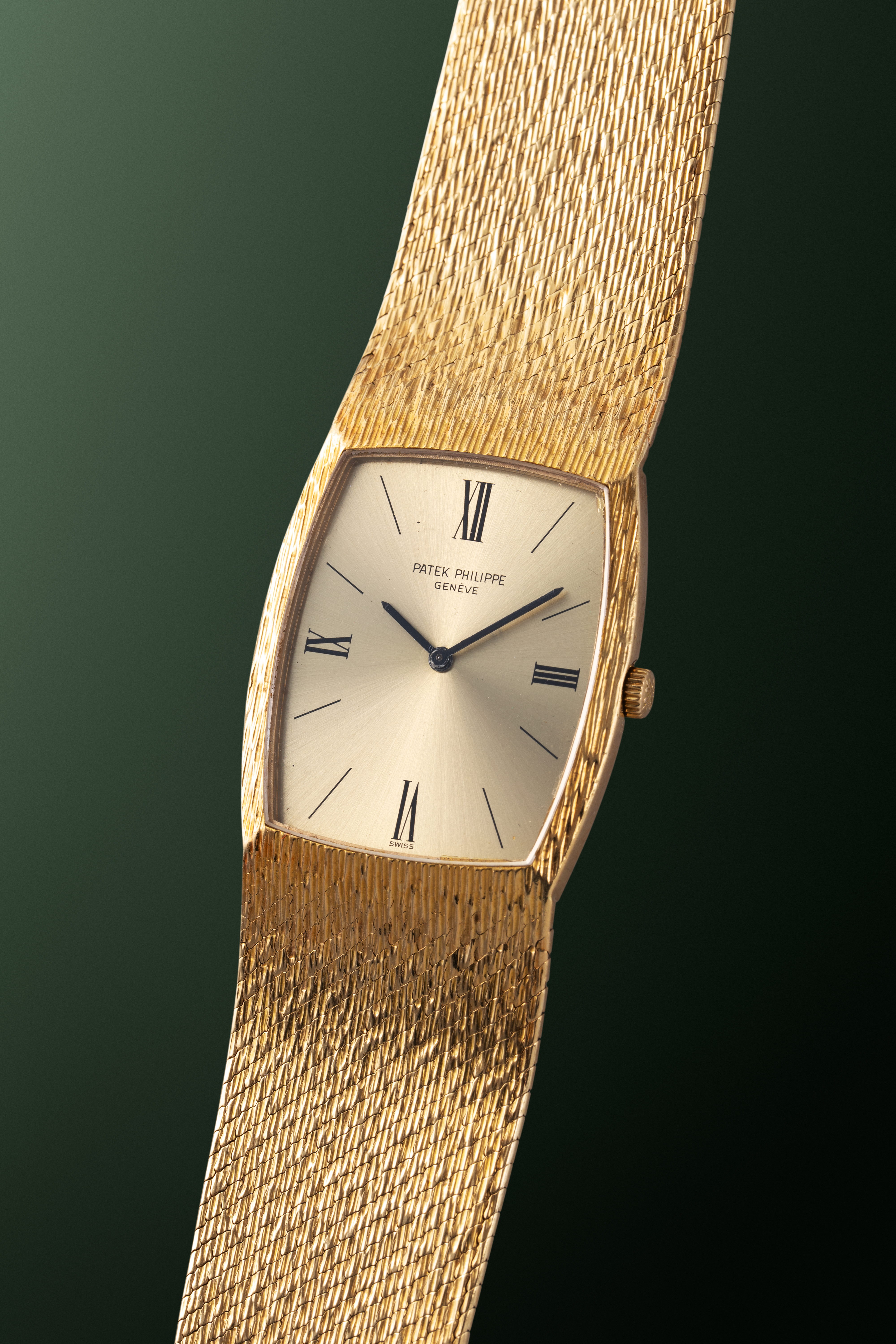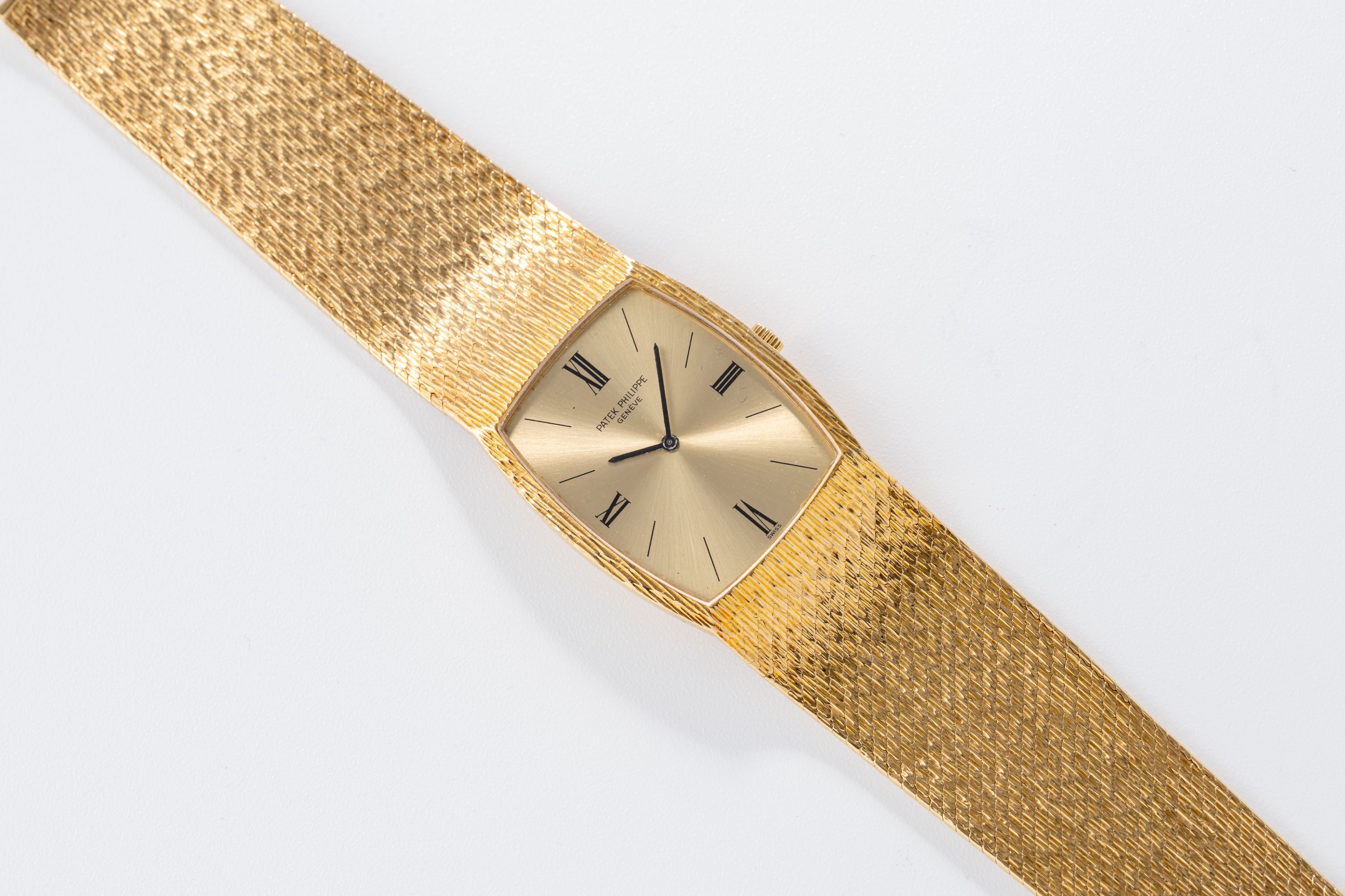 This Patek Philippe Gondolo Ref. 3528J in 18k yellow gold is an intriguing chance for anyone who appreciates elegant vintage design, high-quality finishing, and the charm of integrated gold-bracelet watches. The watch stands out for its slim, rectangular case and its beautifully textured solid-gold bracelet, both of which highlight Patek Philippe’s mastery of dress-watch design in the 1970s. The clean champagne dial with Roman numerals keeps the look understated, while the hand-wound movement inside matches the brand’s traditional watchmaking standards. Its distinctive shape, full-gold construction, and refined proportions make the 3528J an attractive piece for collectors seeking a classic Gondolo with strong visual identity and comfortable wear.