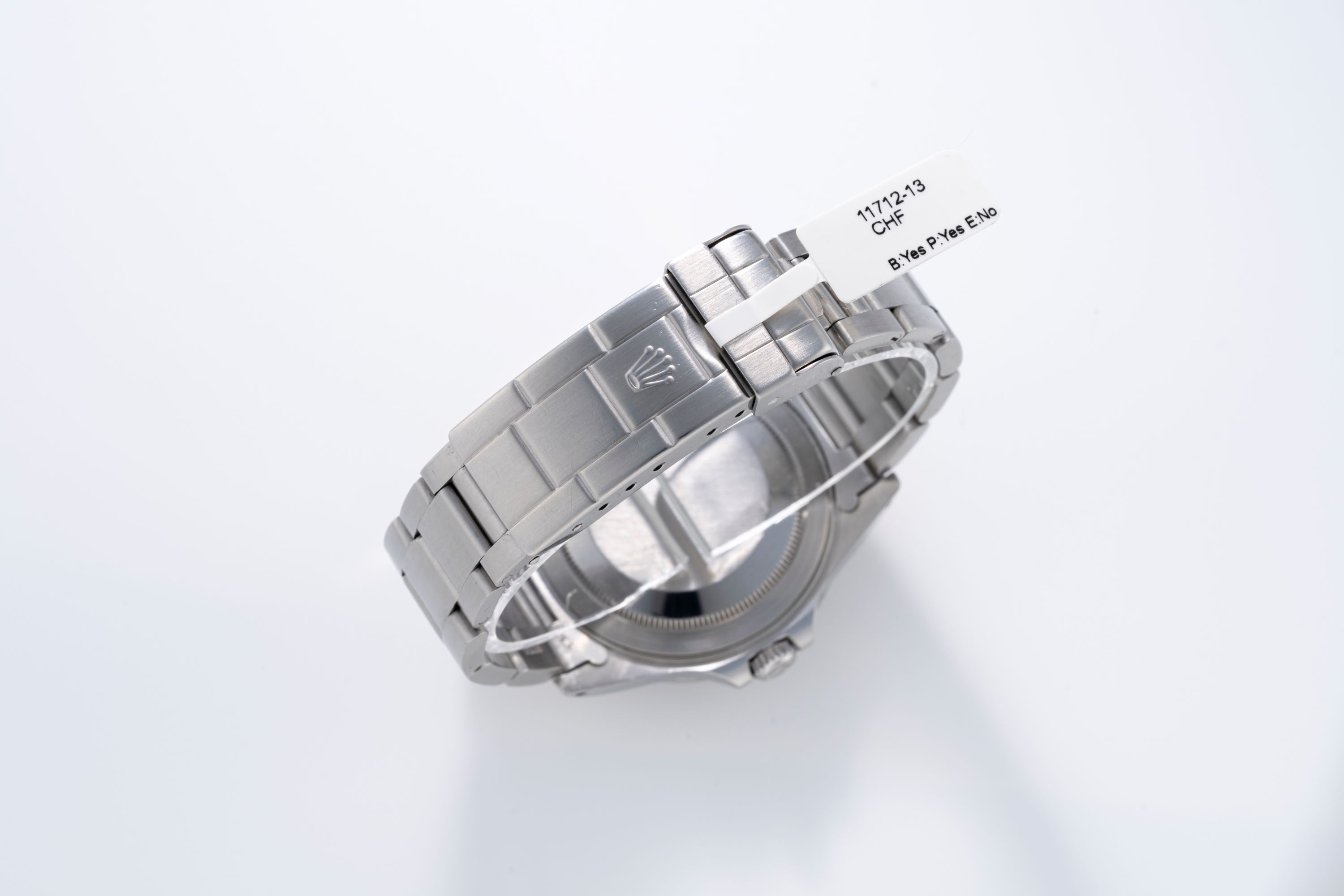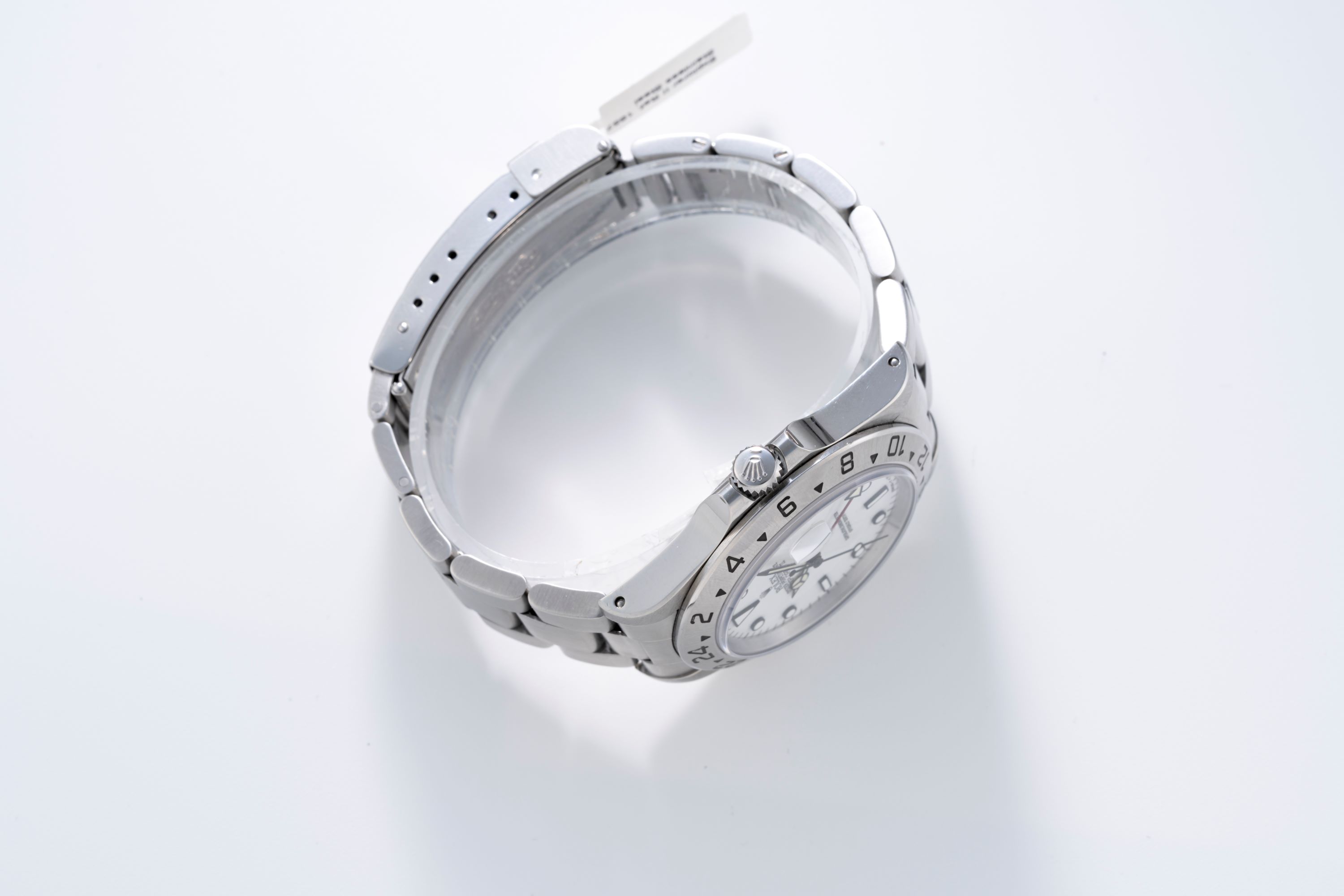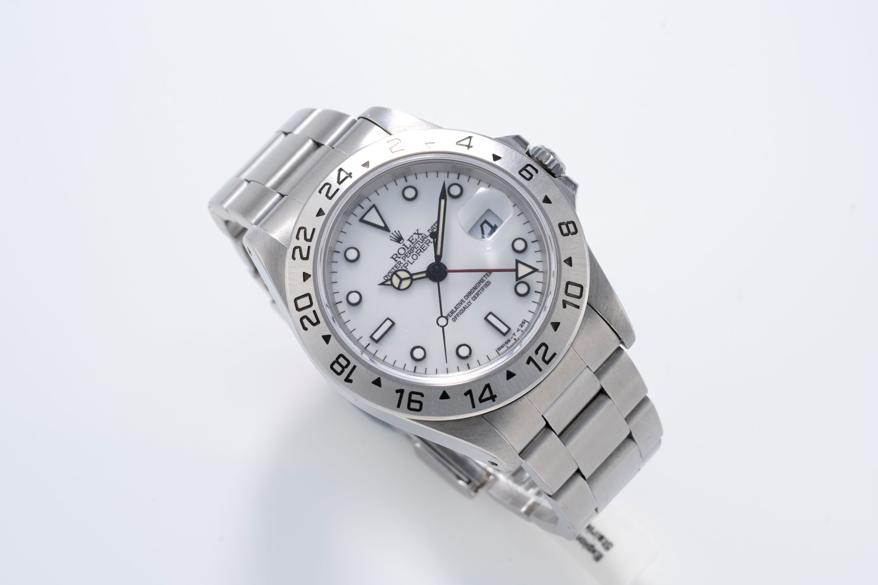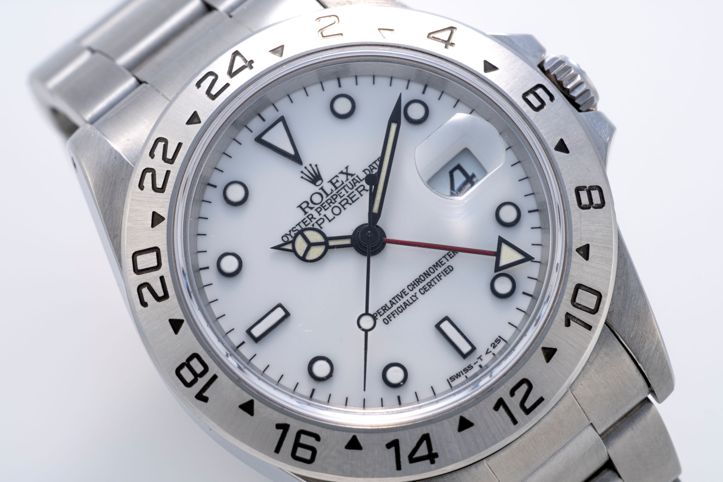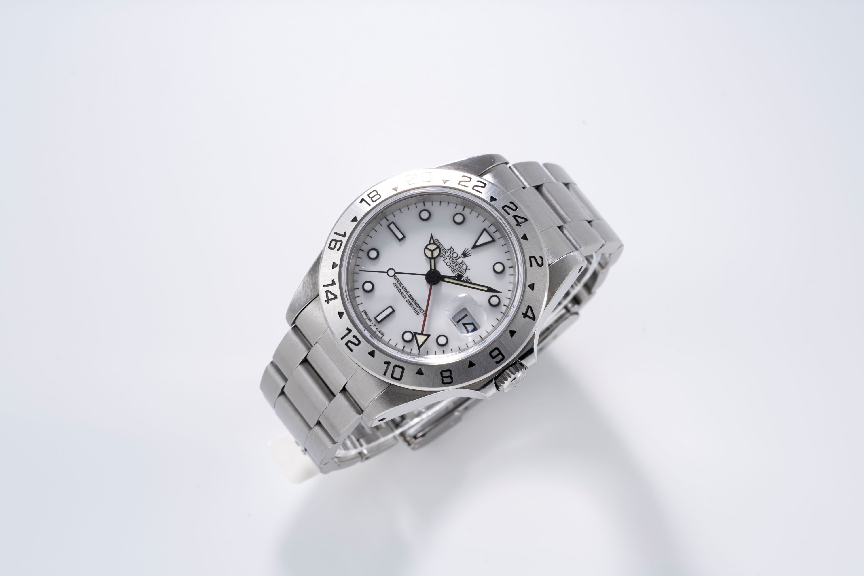 DialWhite lacquer dial with applied black luminous indices, black luminous hands, date at 3 o'clock, red 24-hour hand, signed 'Rolex' at 12 o'clock