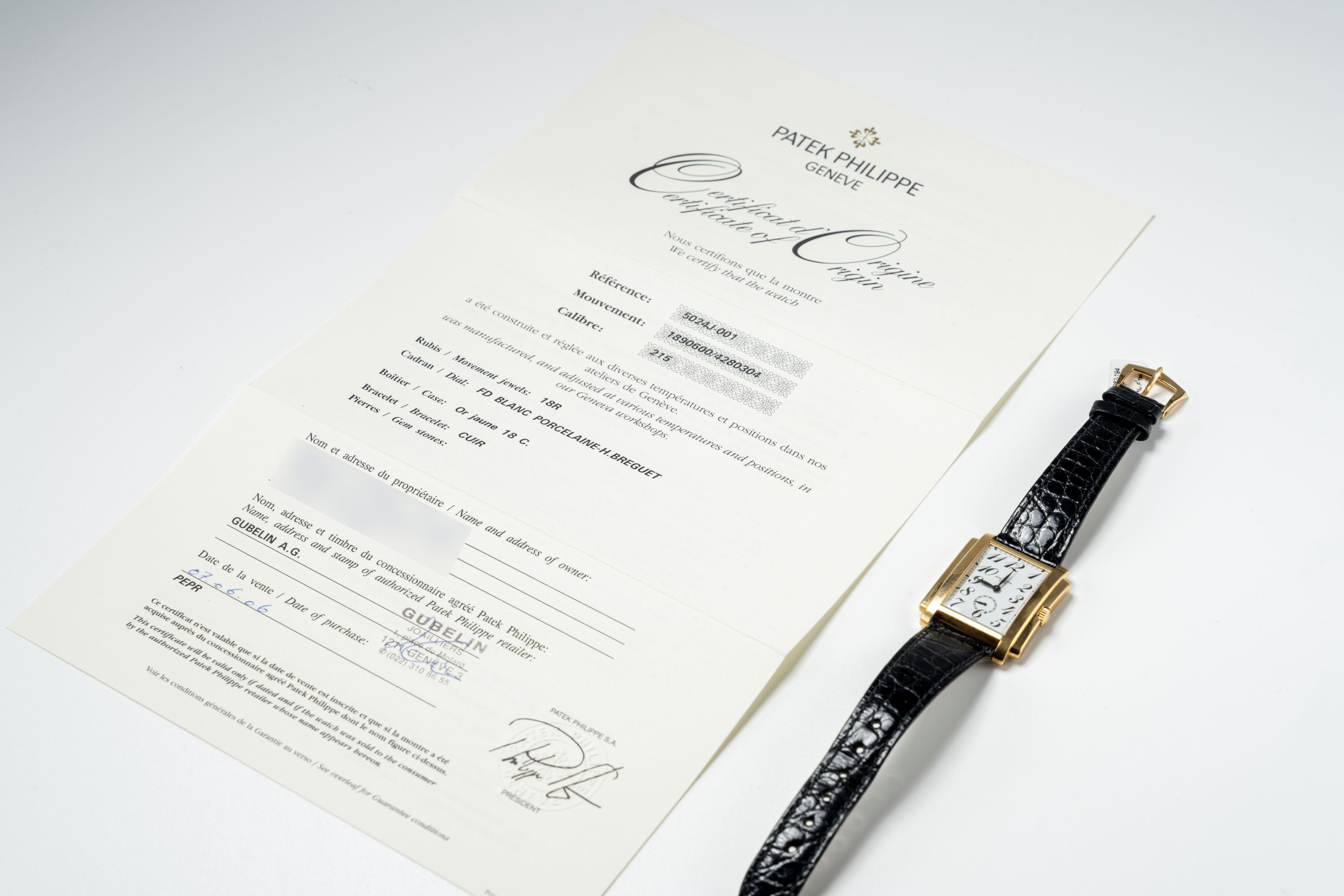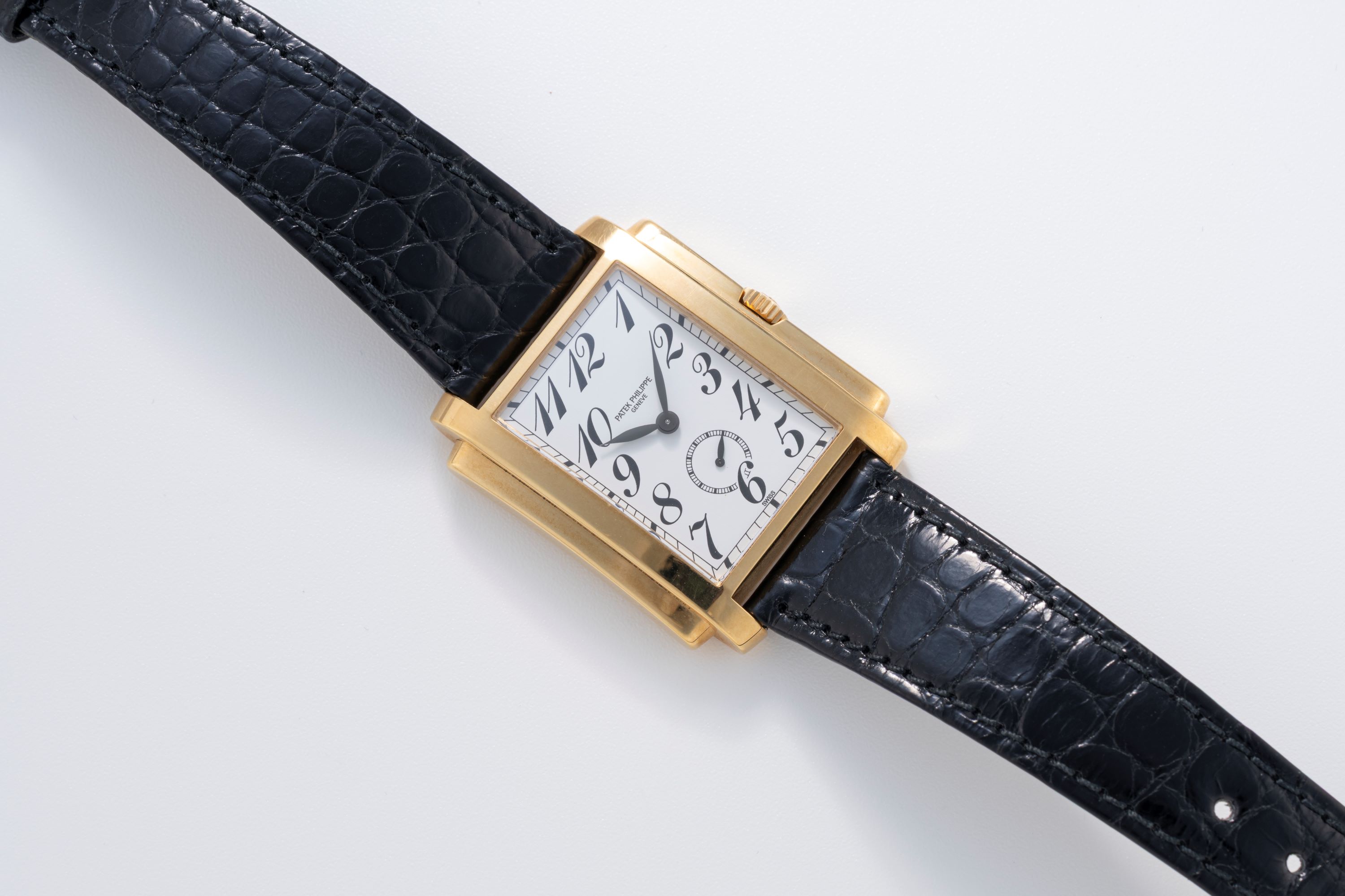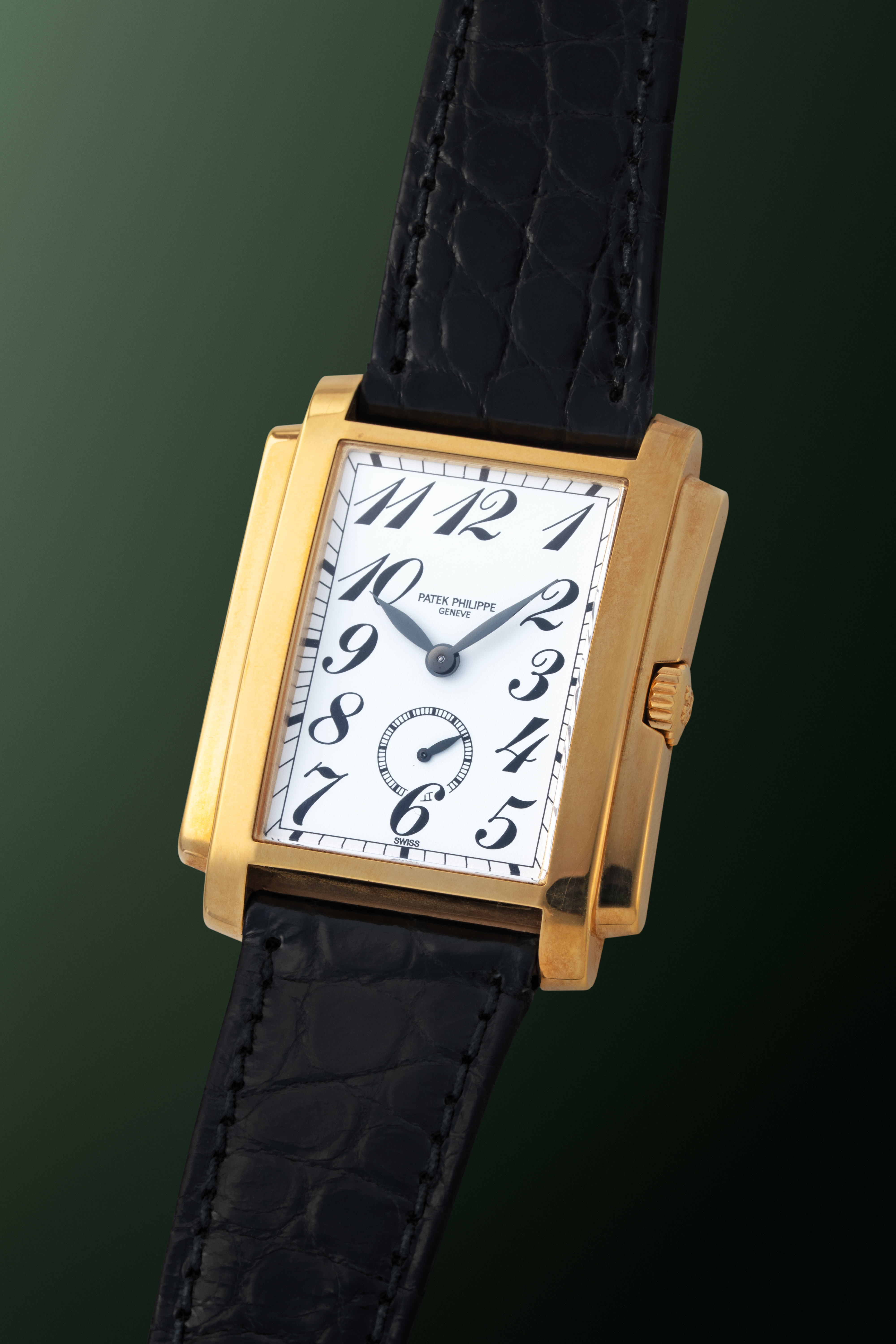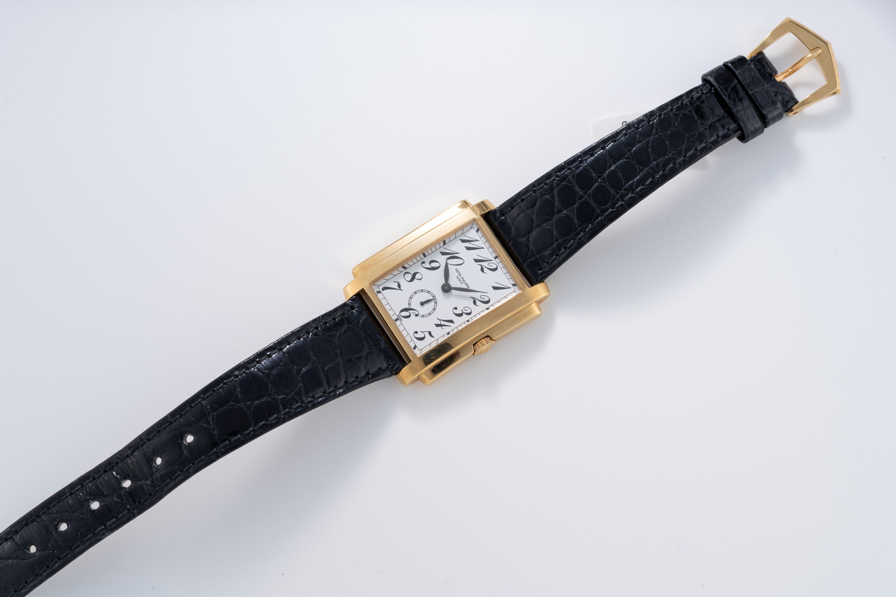 The reference pays tribute to Patek Philippe’s historic Gondolo & Labouriau era, an important period in which the brand dared to design more avantgarde-shaped watches with strong architectural lines and styling. Cased in 18k yellow gold, the 5024J possesses a balance of proportion and elegance. Its gently curved rectangular case, complemented by sleek stepped sides, wears comfortably on the wrist while making a subtle yet distinctive statement. The dial is executed in a clean white with printed black Breguet numerals, a railway-track minute scale, and leaf-style hands that lend an unmistakable nod to early 20th-century dress watch aesthetics. A discreet subsidiary seconds dial at 6 o’clock enhances visual symmetry and reinforces its classical demeanor. Powered by the hand-wound Caliber 215, slim in profile and meticulously finished, it offers traditional watchmaking class: Geneva-striped bridges, anglage and a smooth manual-winding tactility.