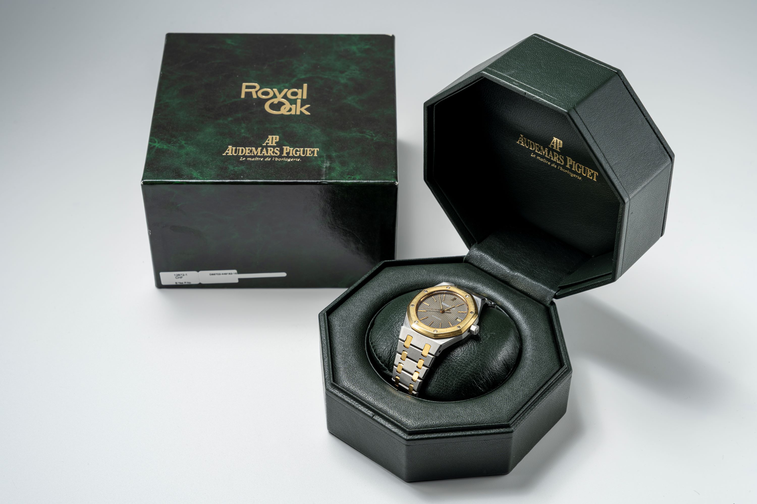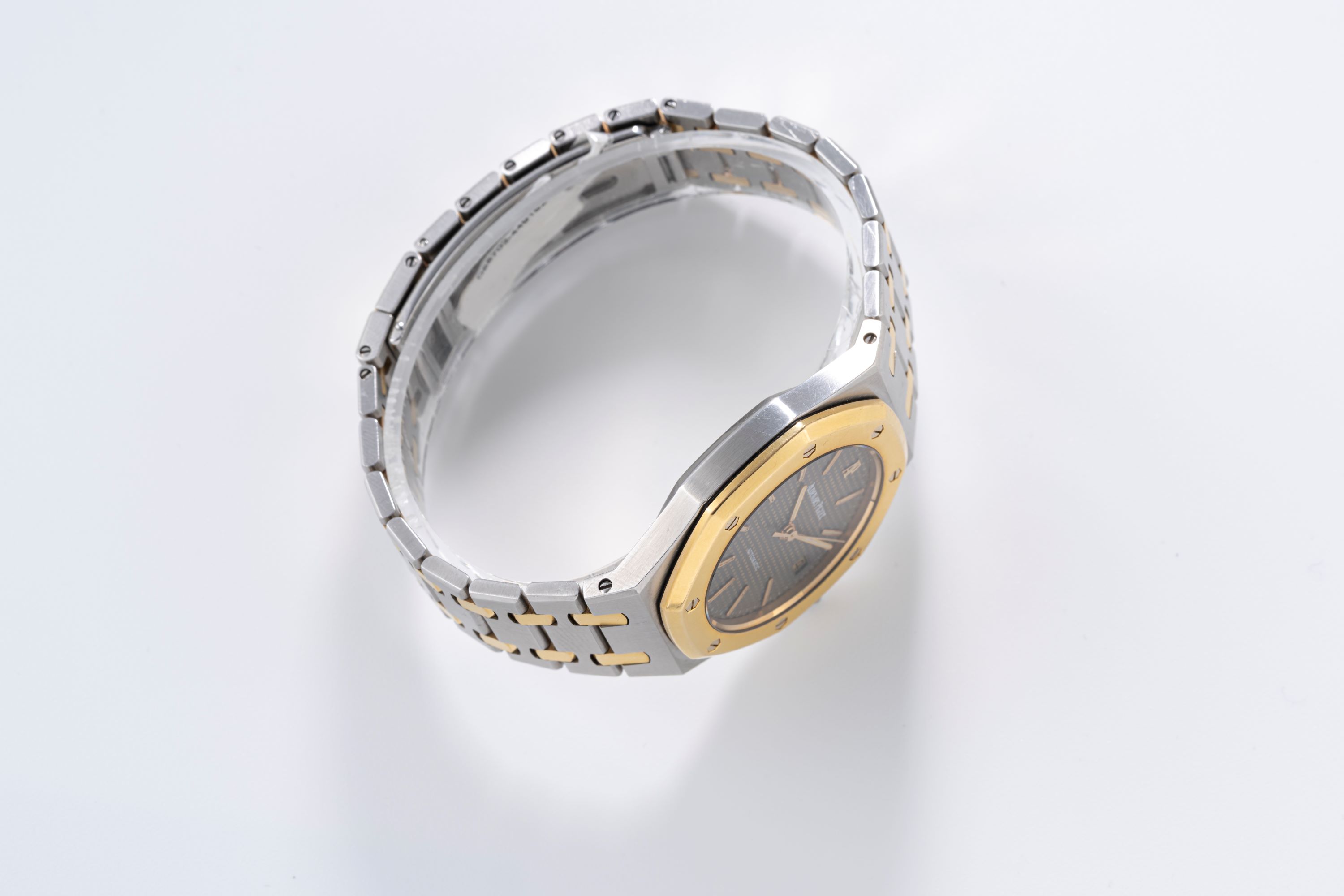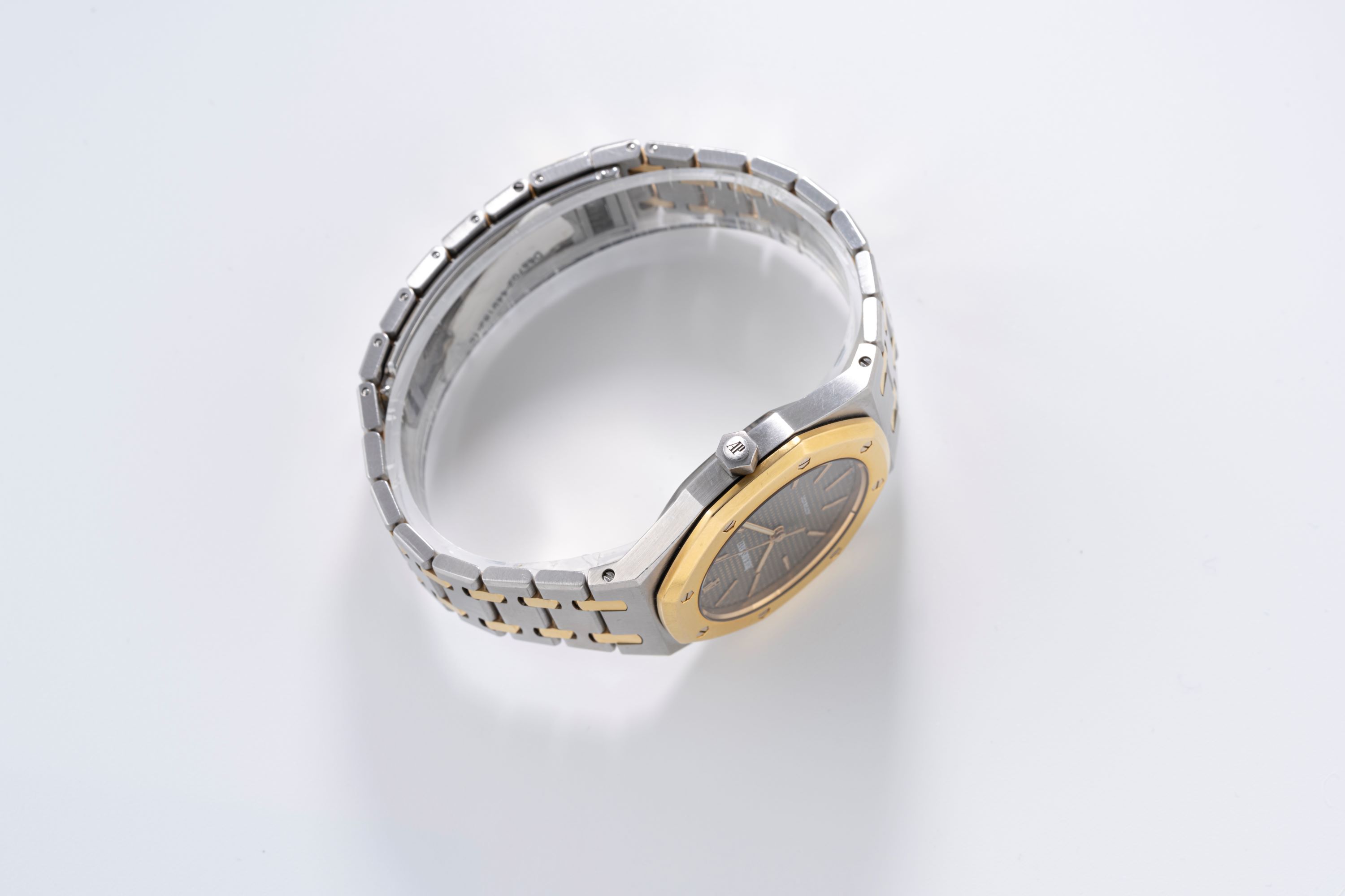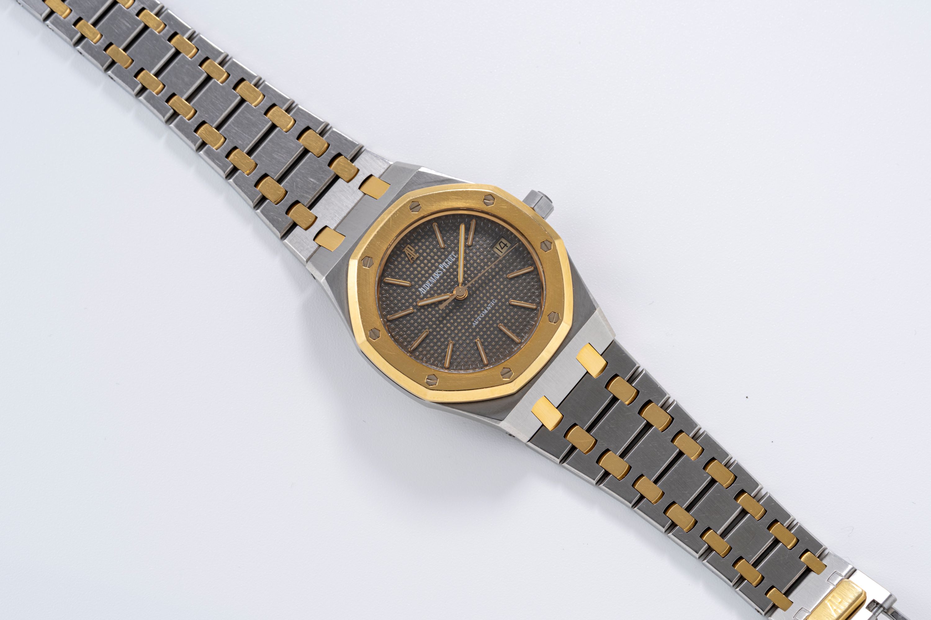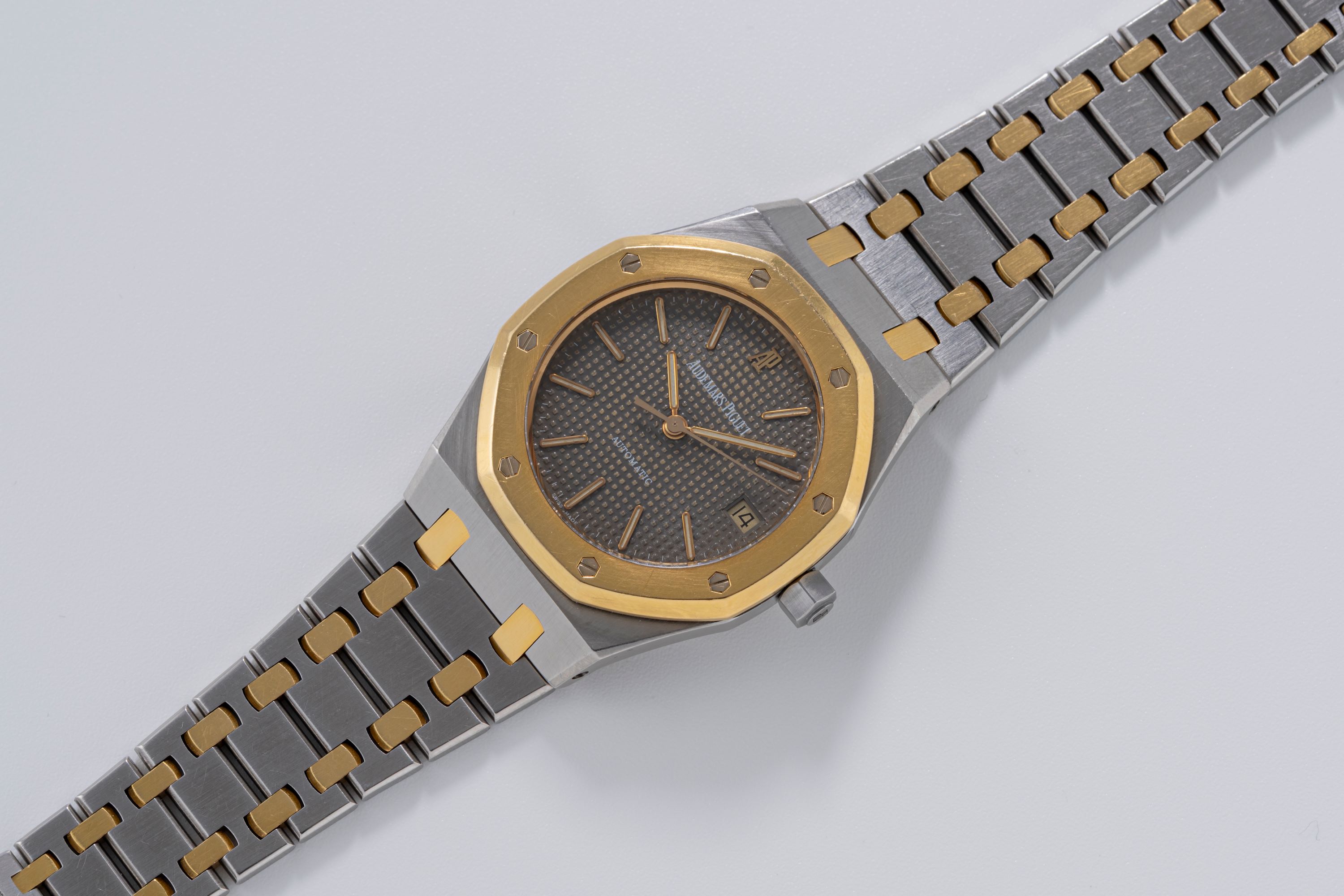 DialGrey tapisserie dial with applied gold luminous indices, gold luminous hands, date window at 3 o'clock, signed 'Audemars Piguet' with applied AP logo at 12 o'clock