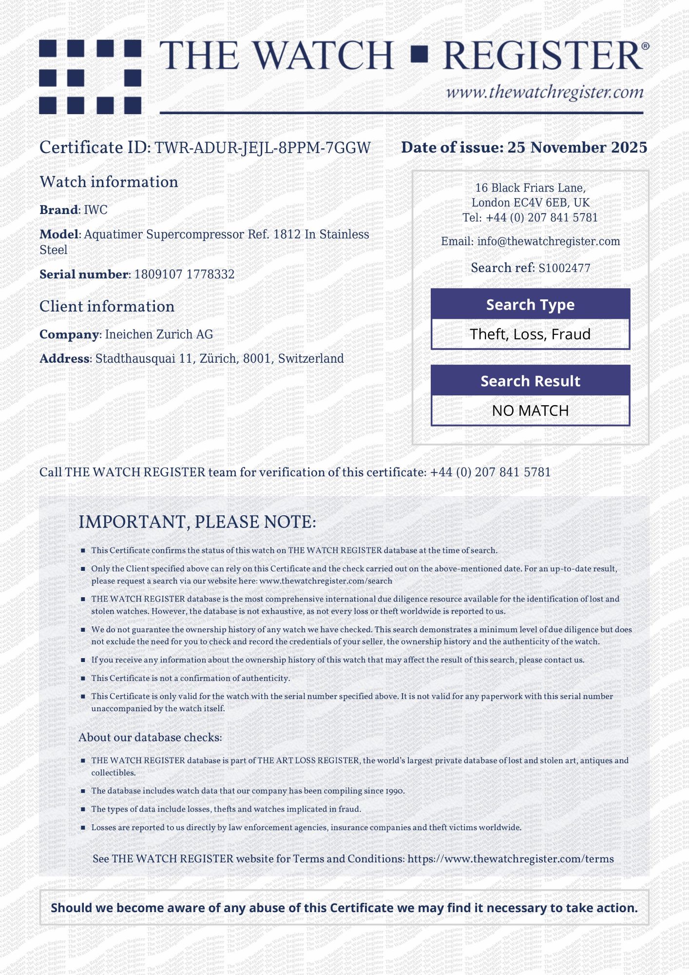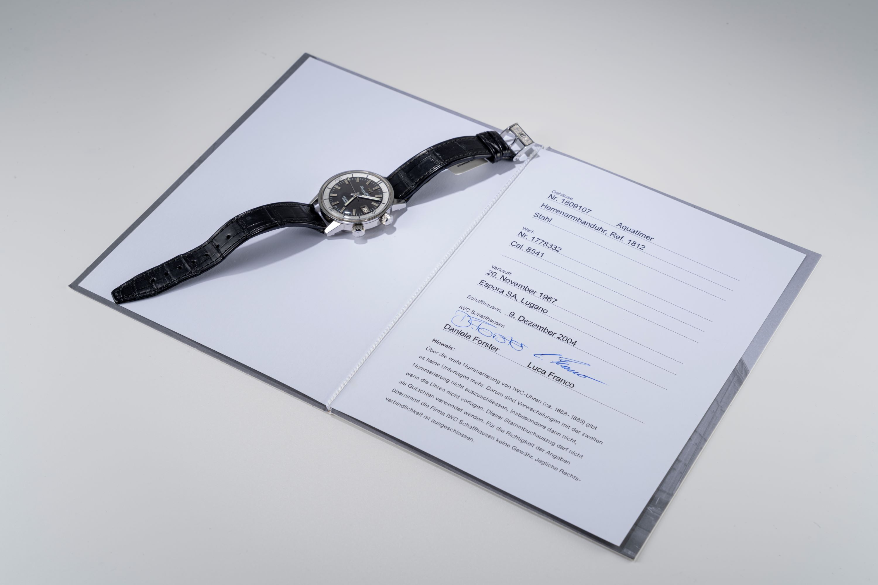 This IWC Aquatimer Supercompressor Ref. 1812 offers collectors a chance to own one of the most iconic dive-watch designs from the 1960s and 1970s. The model features the famous EPSA Supercompressor case with twin crowns and an internal rotating bezel, a construction known for its technical reliability and importance in dive-watch history. The 37 mm stainless-steel case, clean black-and-silver dial, and bold luminous markers reflect IWC’s functional approach to underwater tool watches. Powered by a robust automatic Caliber 8541, the watch delivers dependable performance while preserving all the charm of a true vintage diver. Well-preserved examples of the Ref. 1812 have become increasingly difficult to find, making this piece a rare opportunity for collectors seeking a historically important and highly wearable vintage Aquatimer.