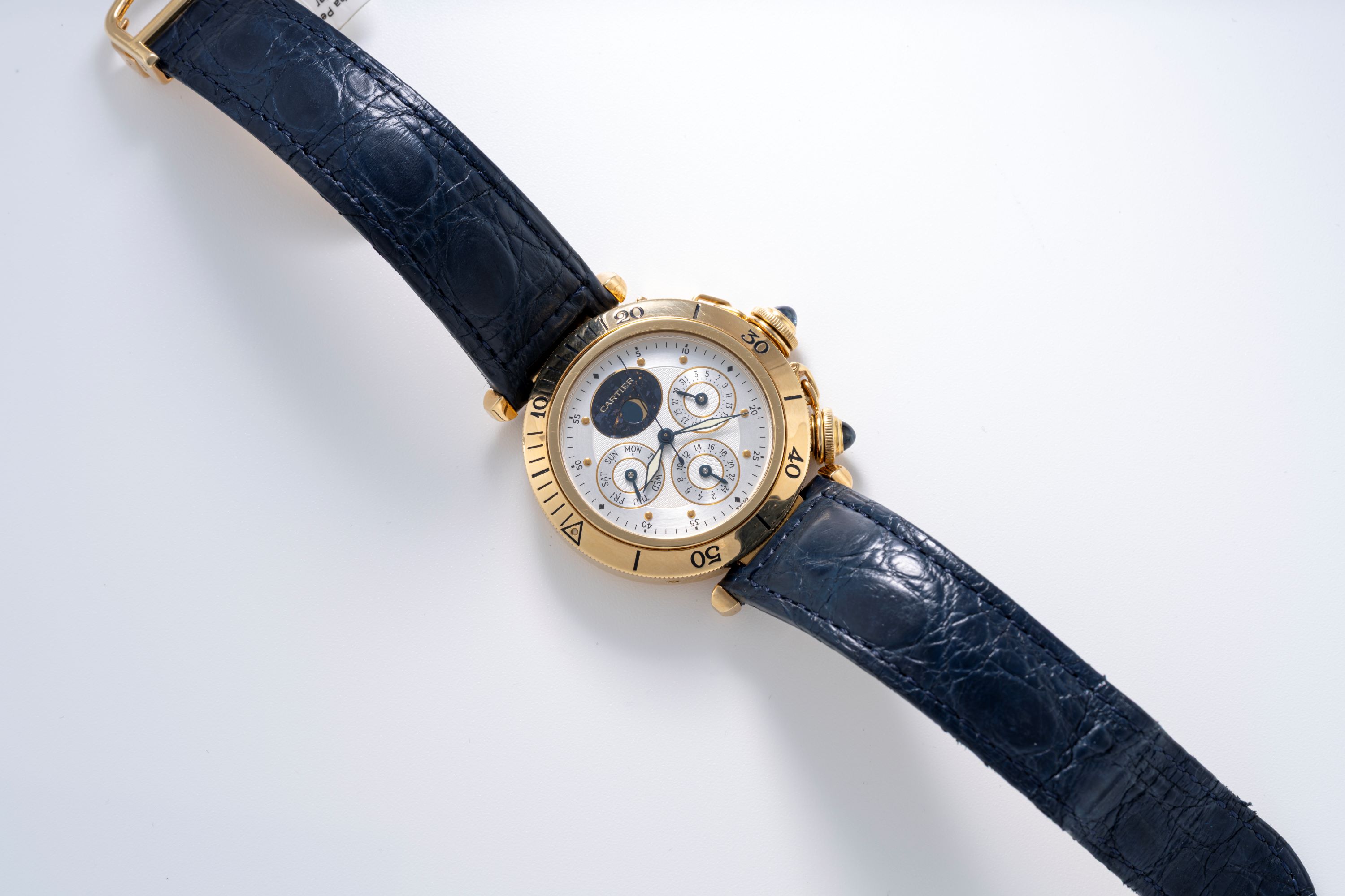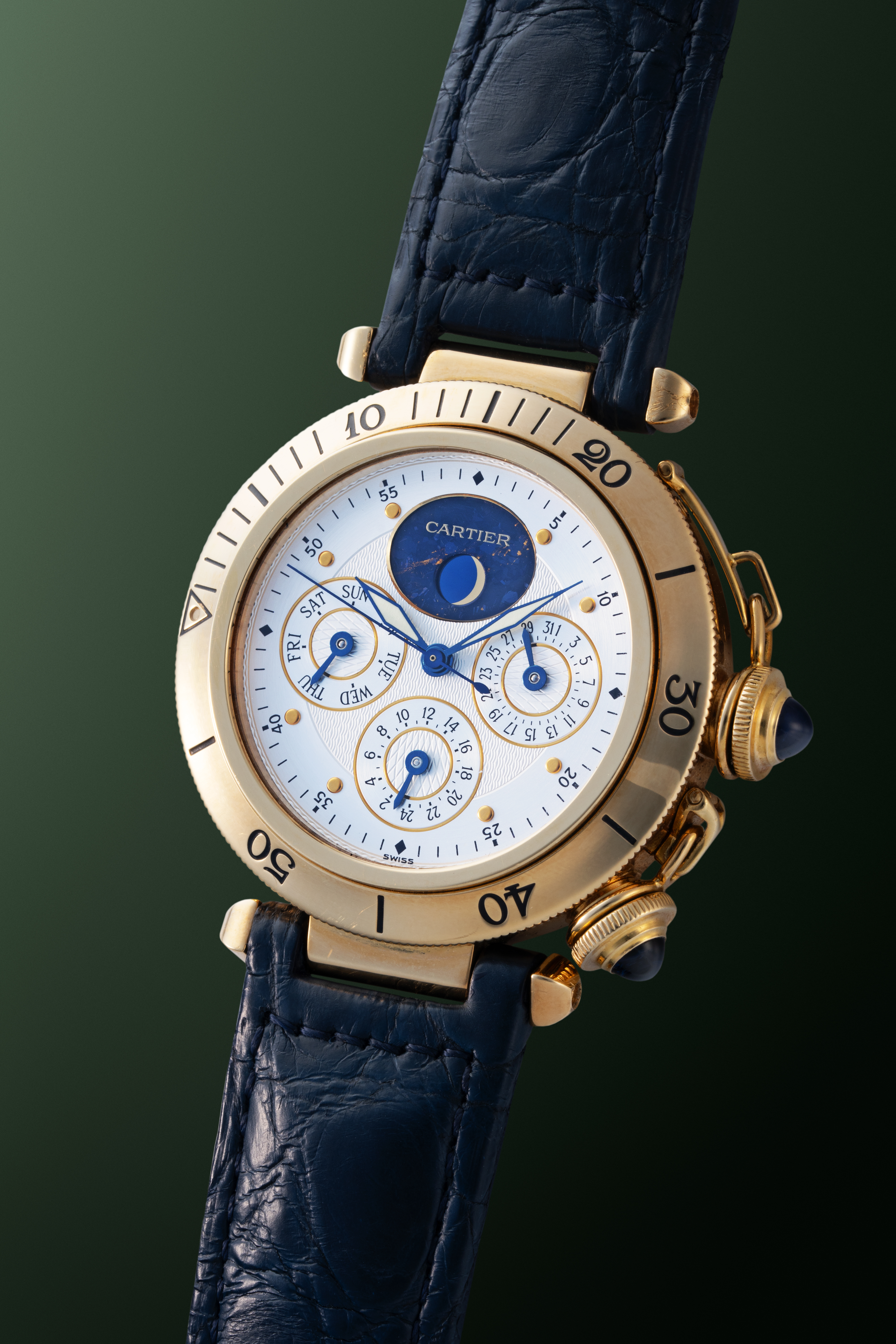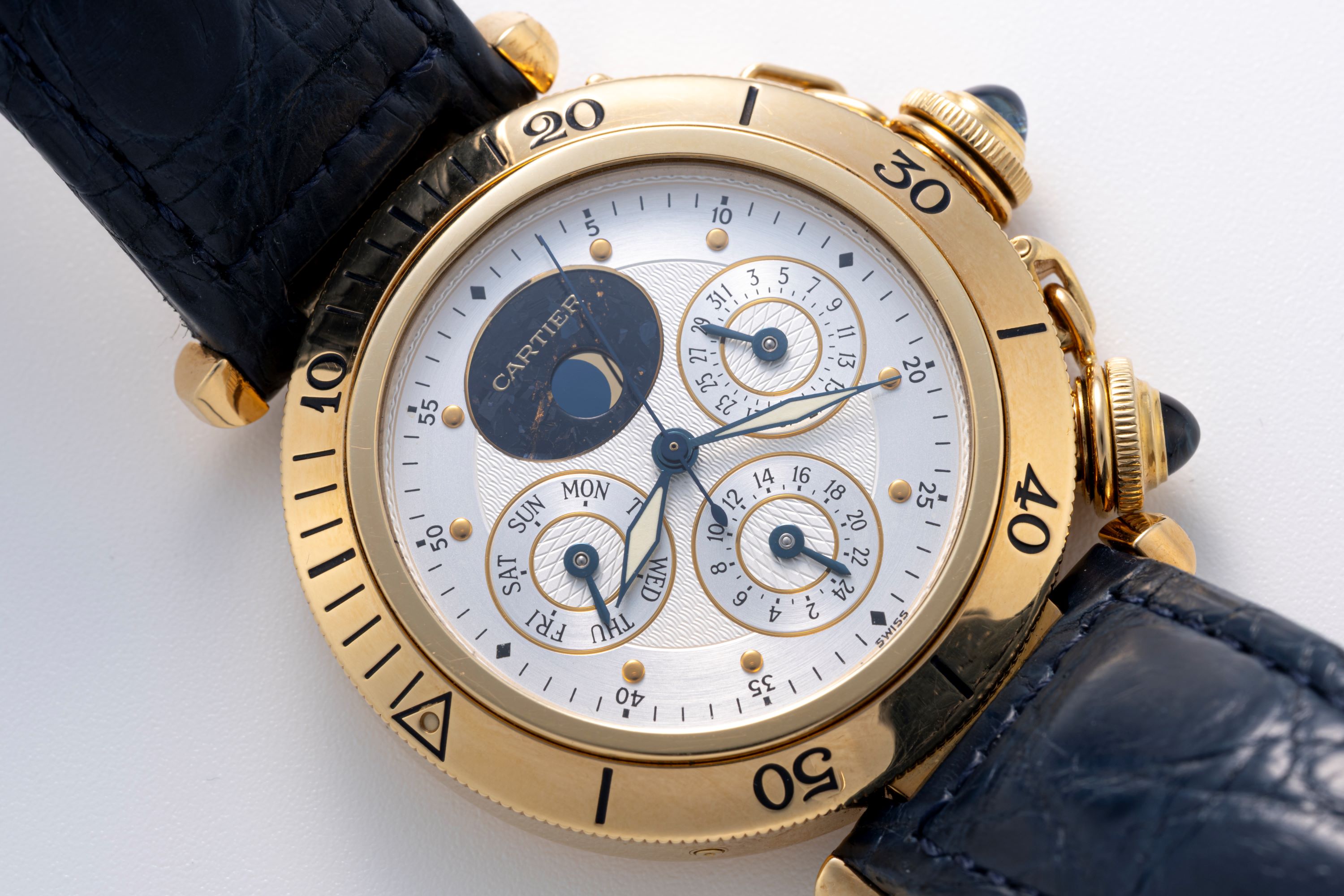 DialSilver fine engine turned dial with heat-blued hands, meteorite-backed moonphase at 12 o'clock, day at 9 o'clock, date at 3 o'clock, 24 hour indicator at 6 o'clock, signed 'Cartier' at 12 o'clock