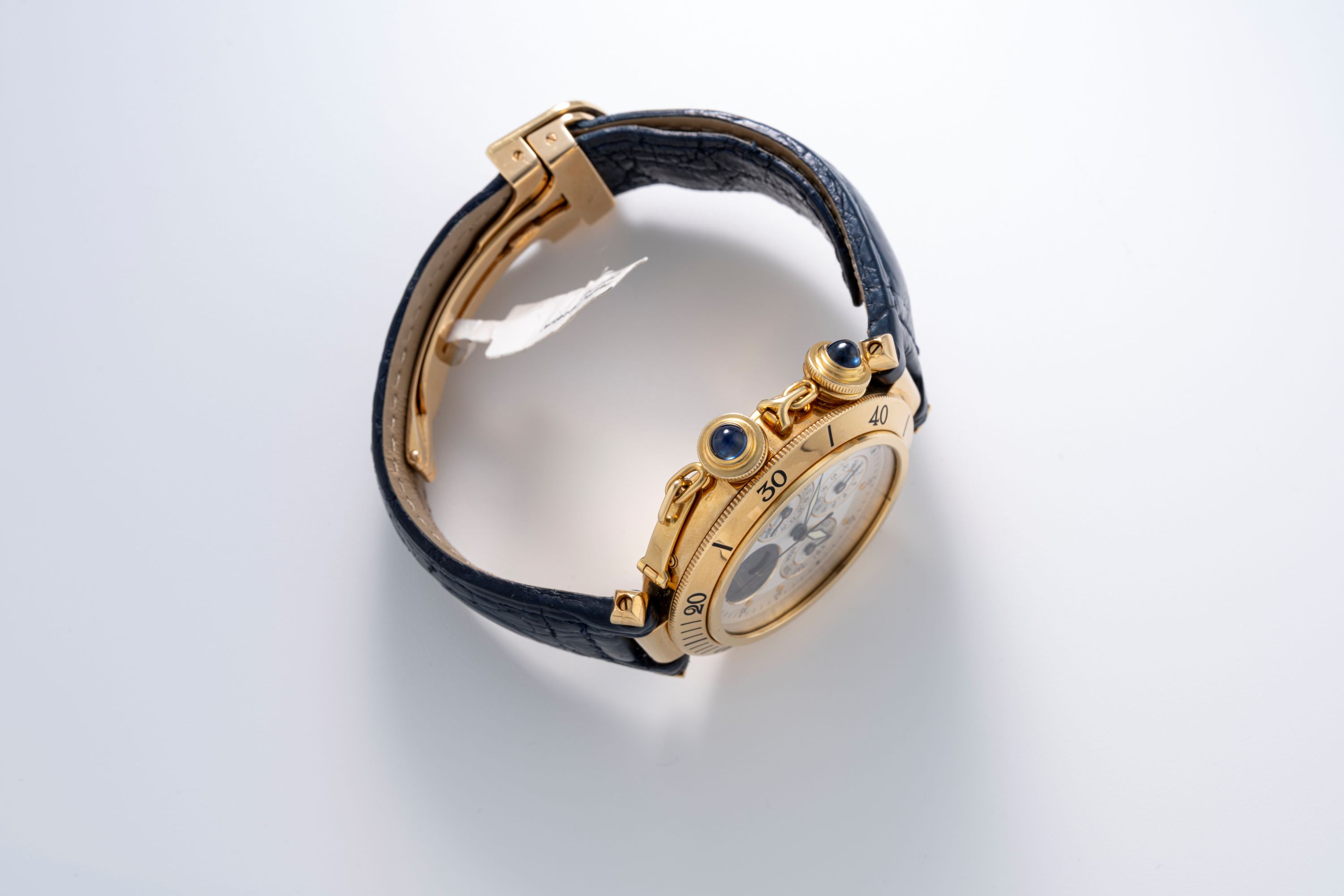 CaseRound case in 18k yellow gold with Pasha crown system at 3 o'clock, rotating bezel in 18k yellow gold, display caseback