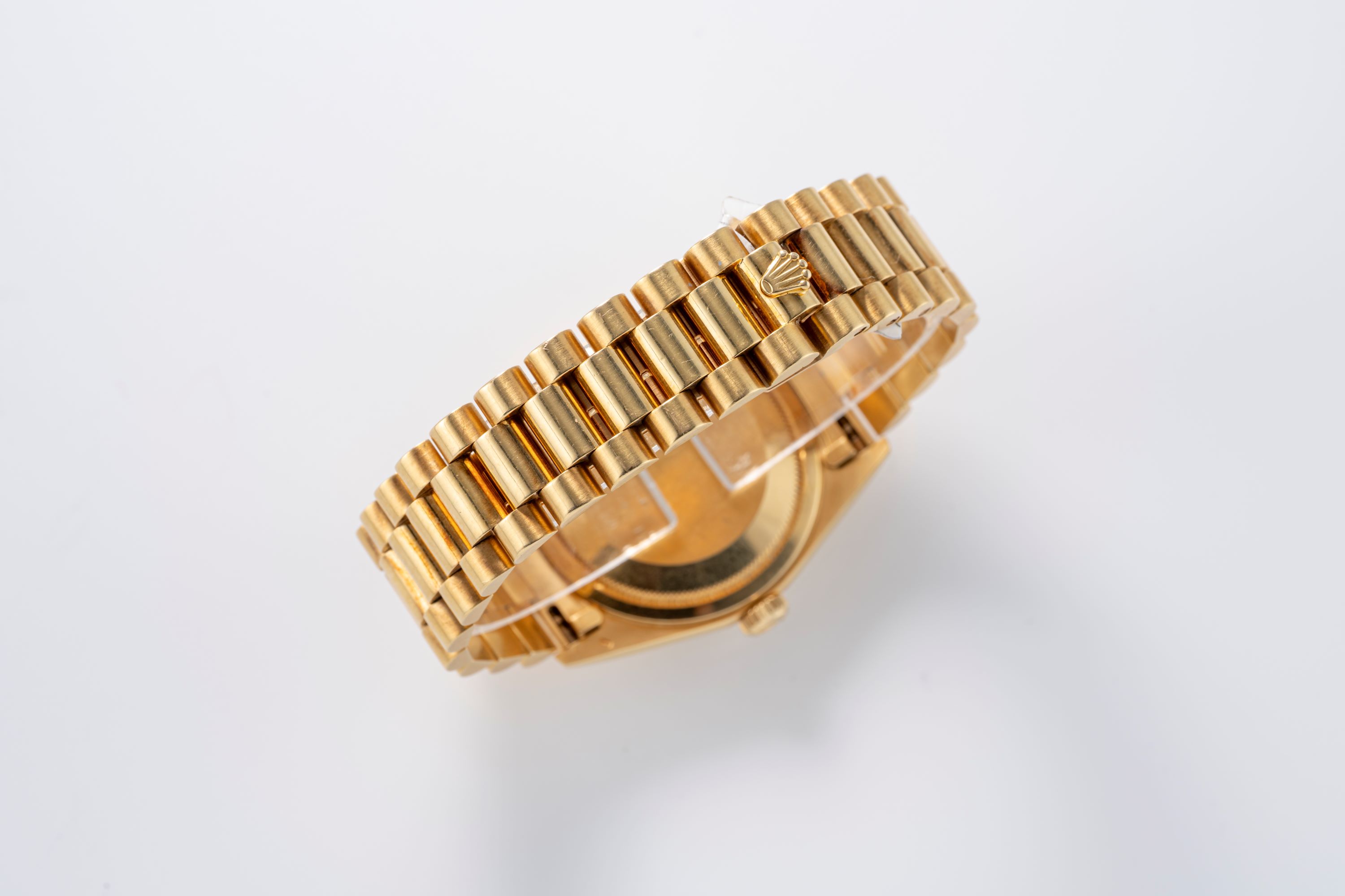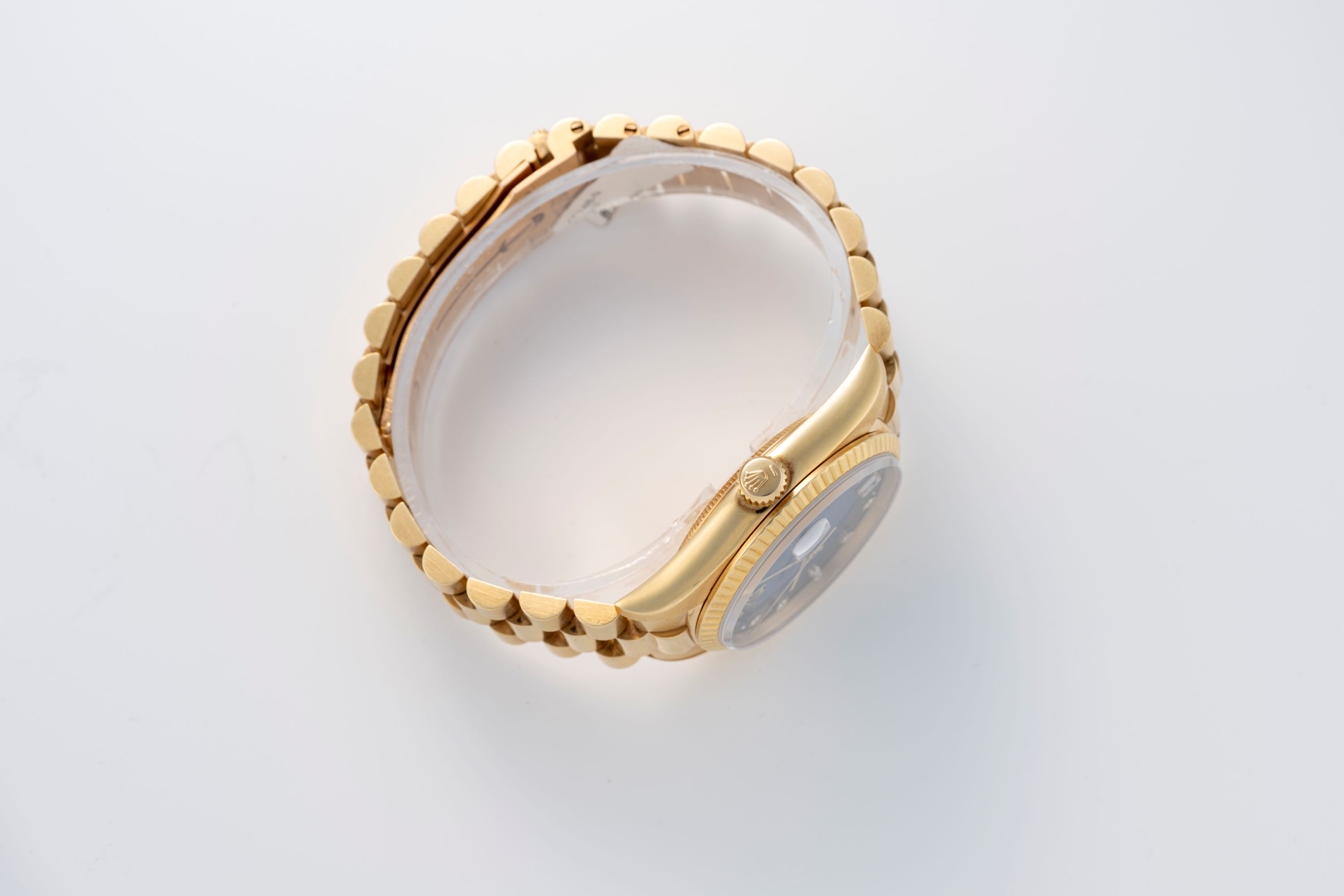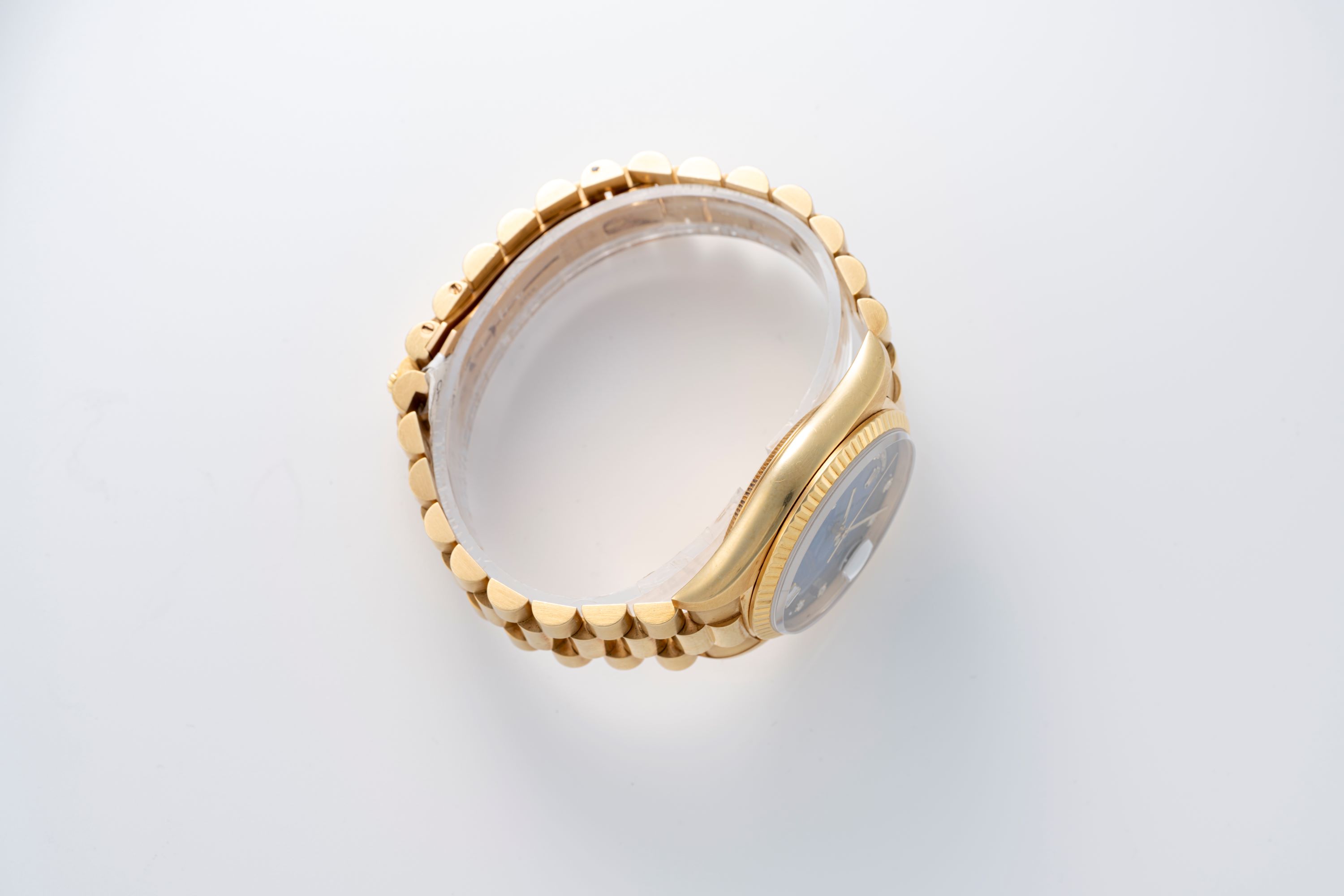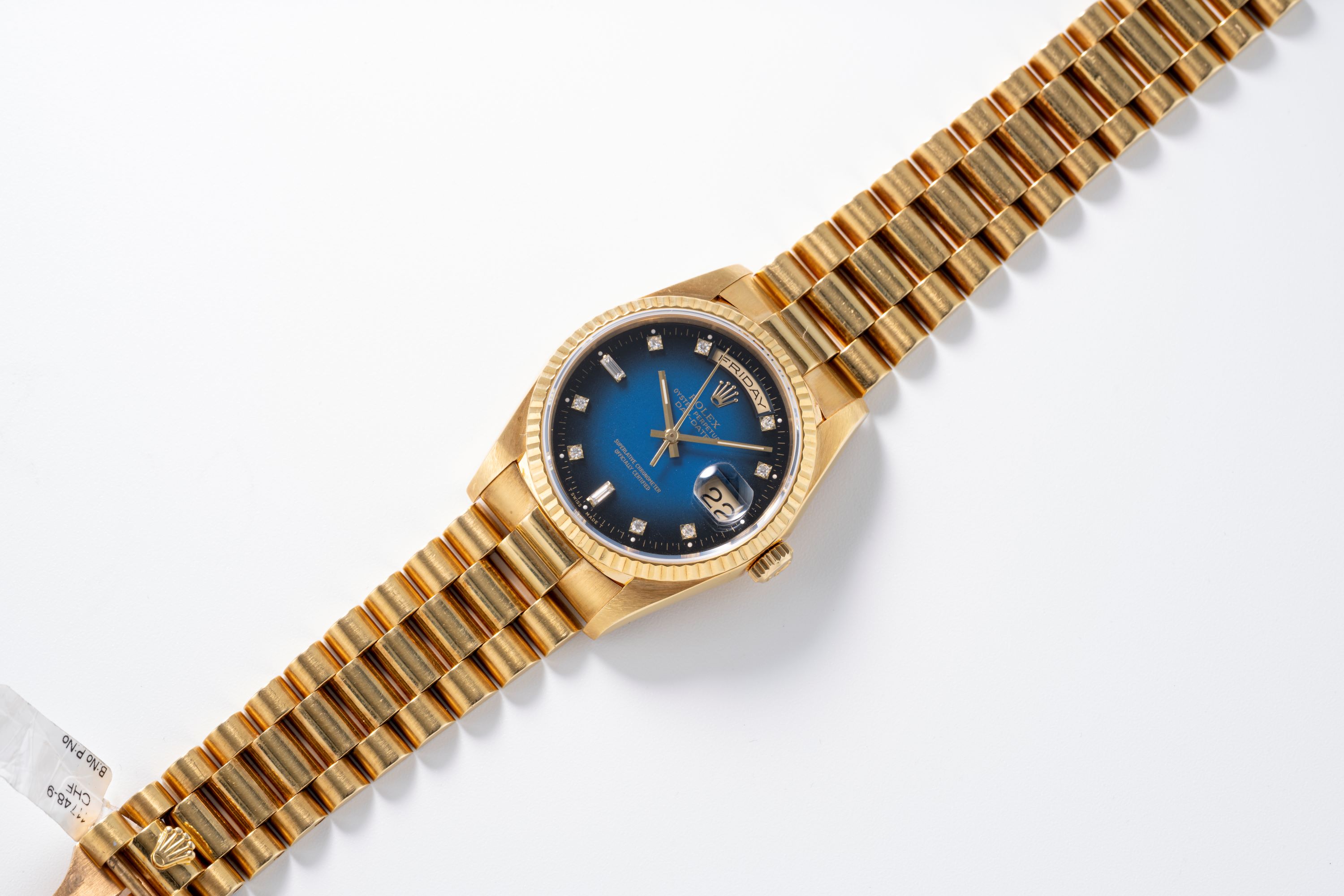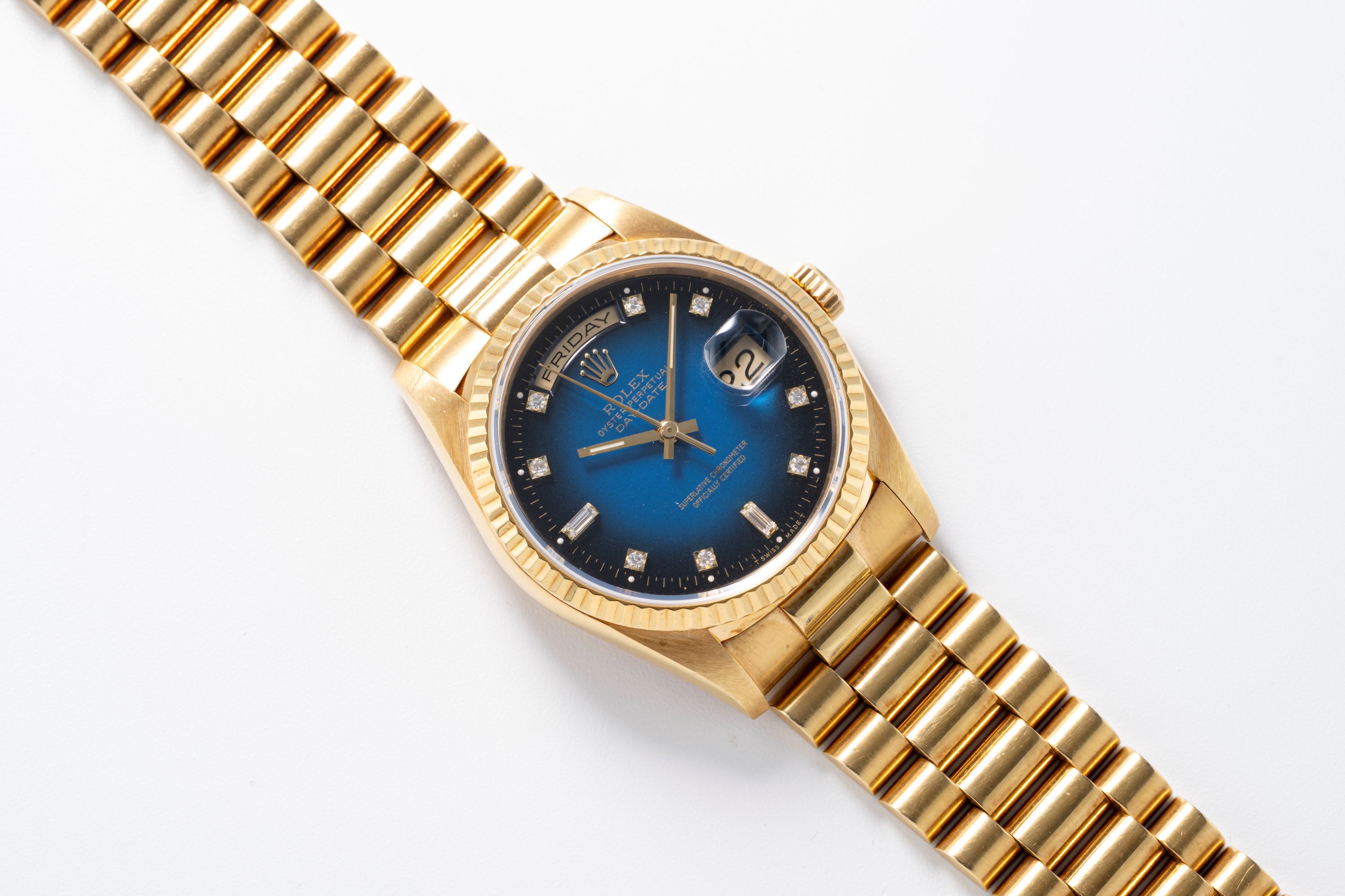 The Rolex Day-Date Ref. 18238 in 18k yellow gold is a key reference within the Day-Date line, recognized for its solid gold construction and practical movement updates introduced in this generation. This example is distinguished by its blue vignette dial, which fades from a strong blue center tone to a darker periphery, creating strong visual depth. The dial is paired with applied diamond markers and the traditional day display at 12 o’clock and date display at 3 o’clock under the Cyclops lens, maintaining the clear layout that defines the model. The 36 mm case and fluted bezel are crafted entirely from 18k yellow gold and matched with the ‘President’ bracelet, reinforcing the watch’s position as a symbol of status and formal elegance. Inside, the watch is powered by the automatic Caliber 3155, a COSC-certified movement featuring the double quickset function, allowing independent adjustment of both the day and date. Known for stable performance and ease of use, the movement represents a practical improvement over earlier generations. Together, the blue vignette dial and yellow gold case make this 18238 a notable and desirable variant in the Day-Date range.