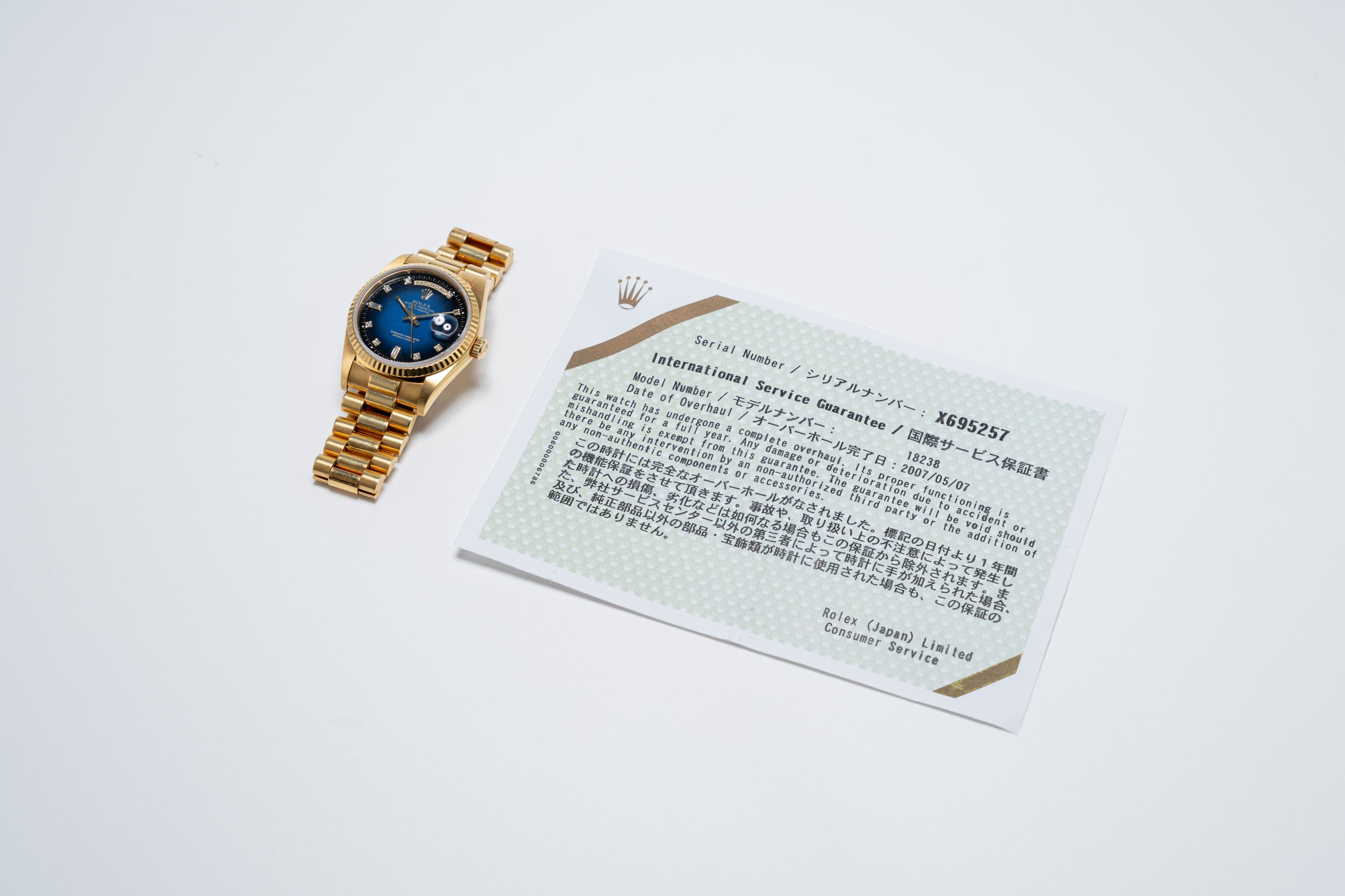 DialBlue fumé dial with diamond indices, yellow gold hands, day window at 12 o'clock, date window at 3 o'clock, signed 'Rolex' at 12 o'clock