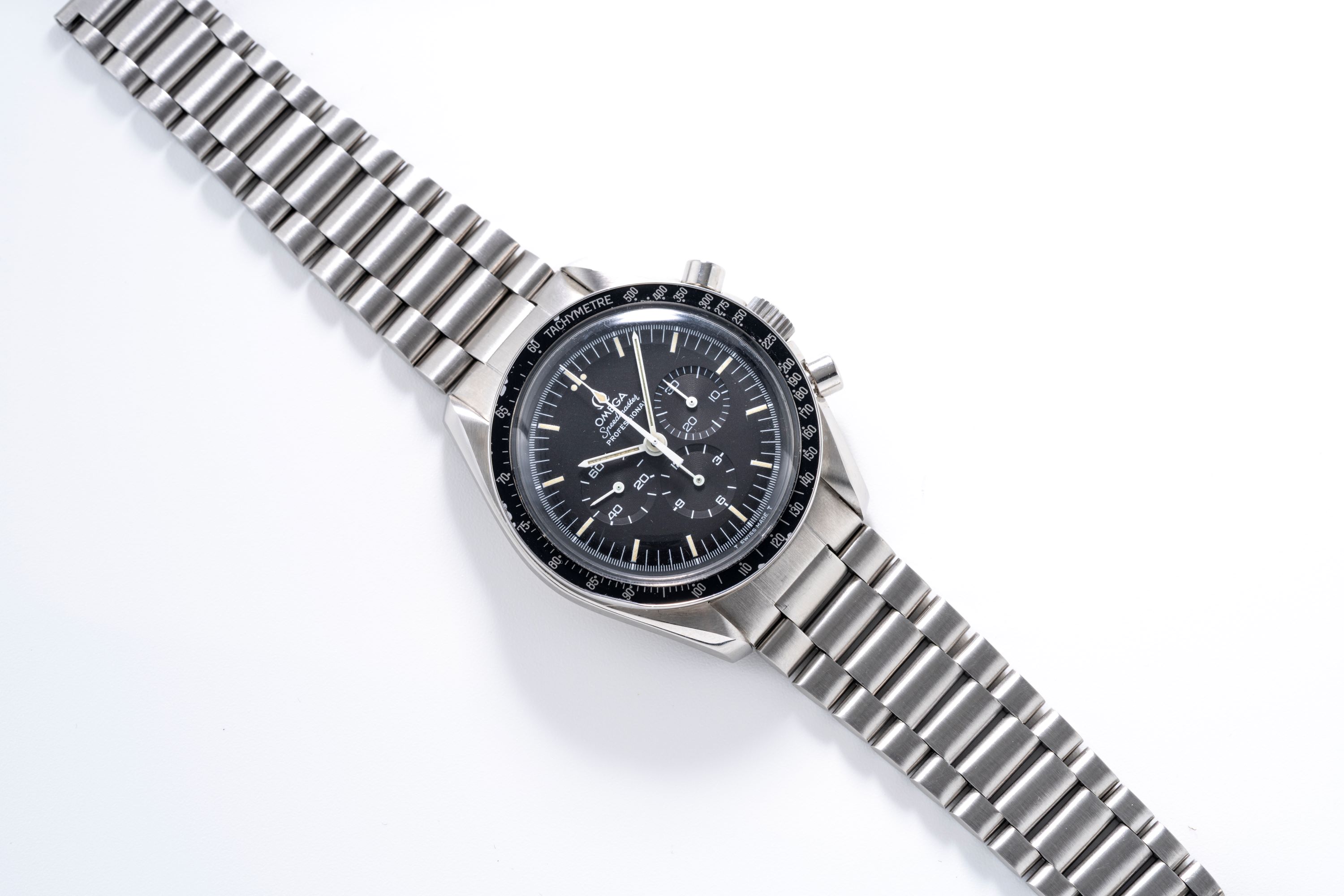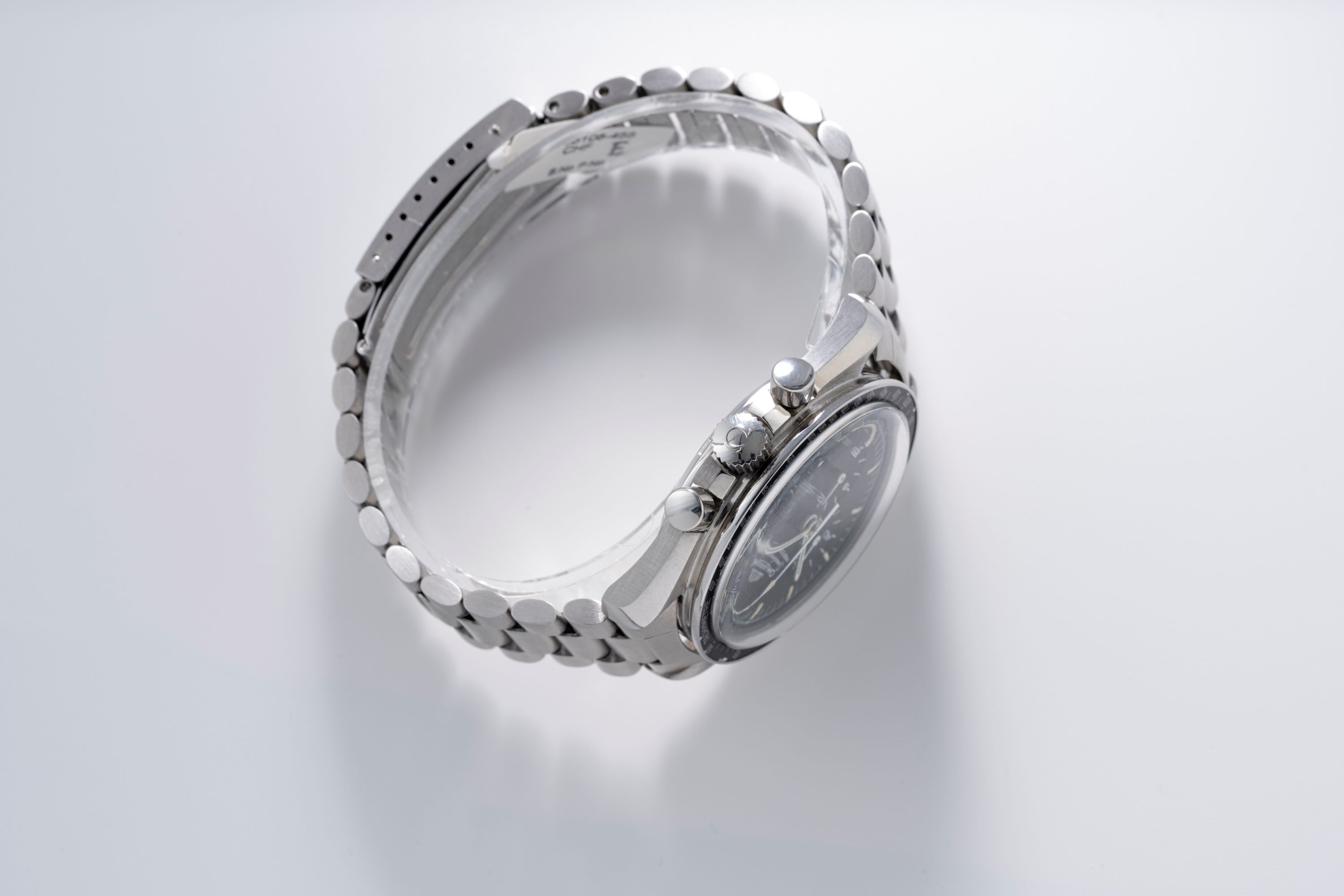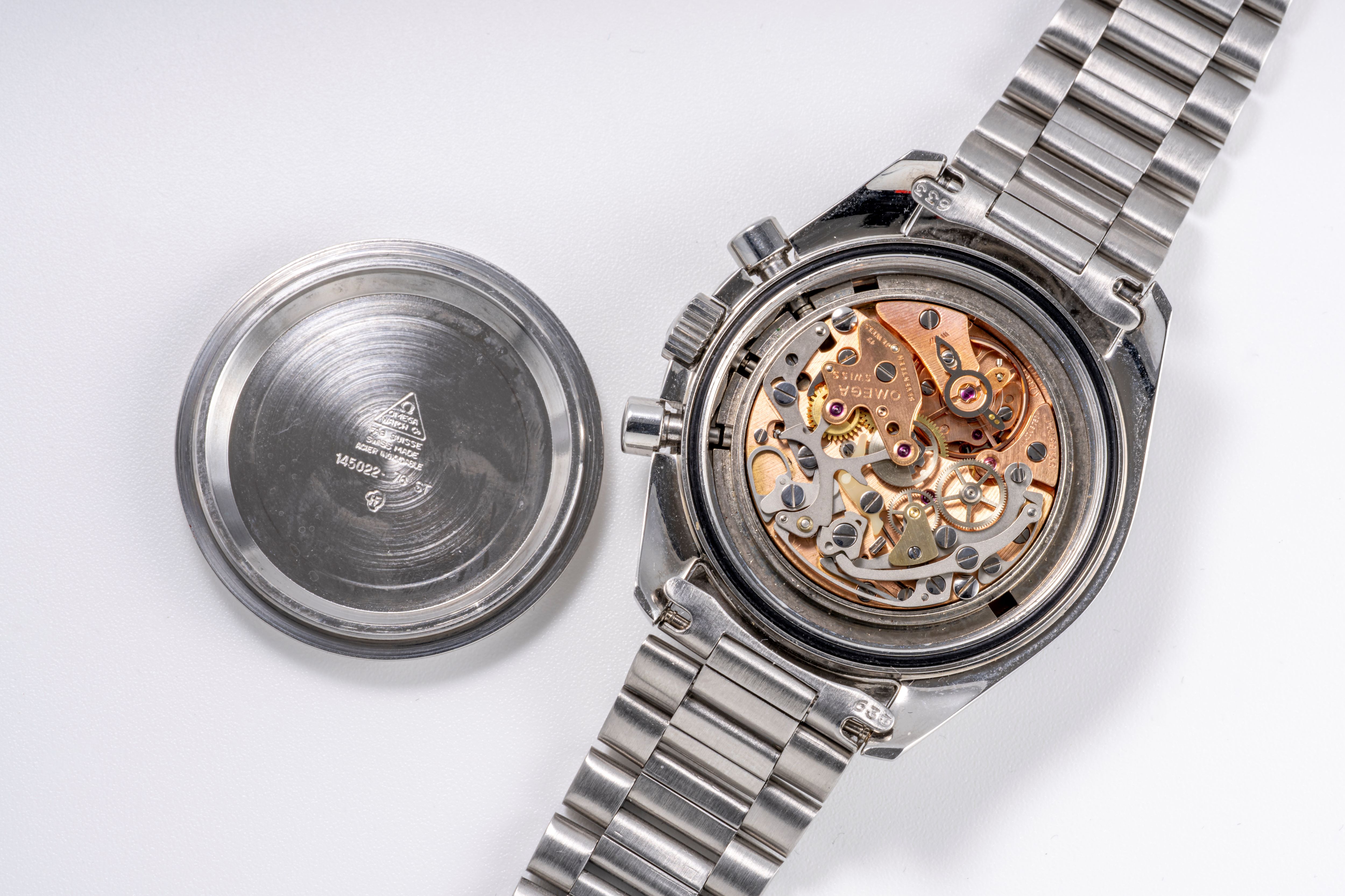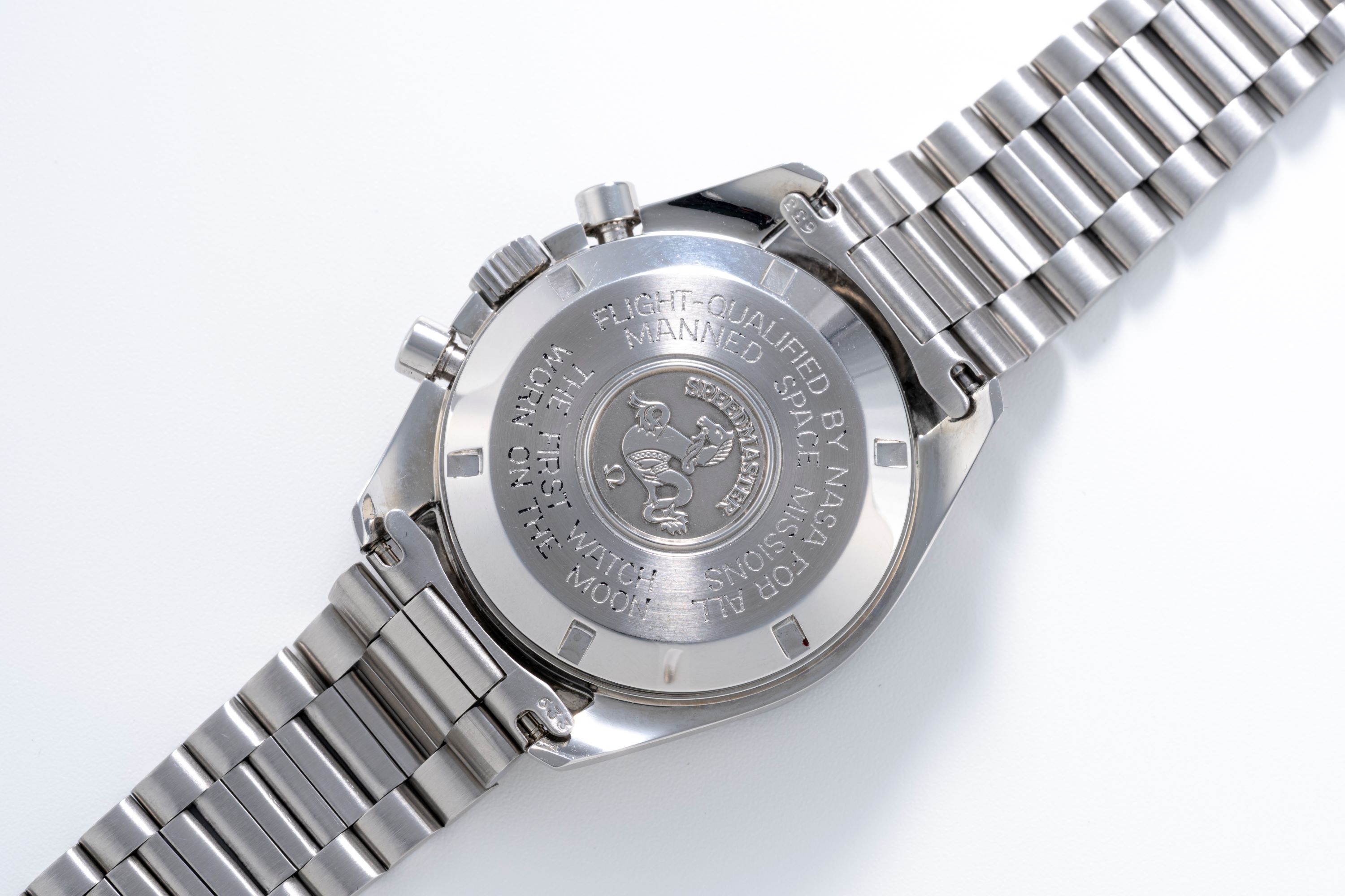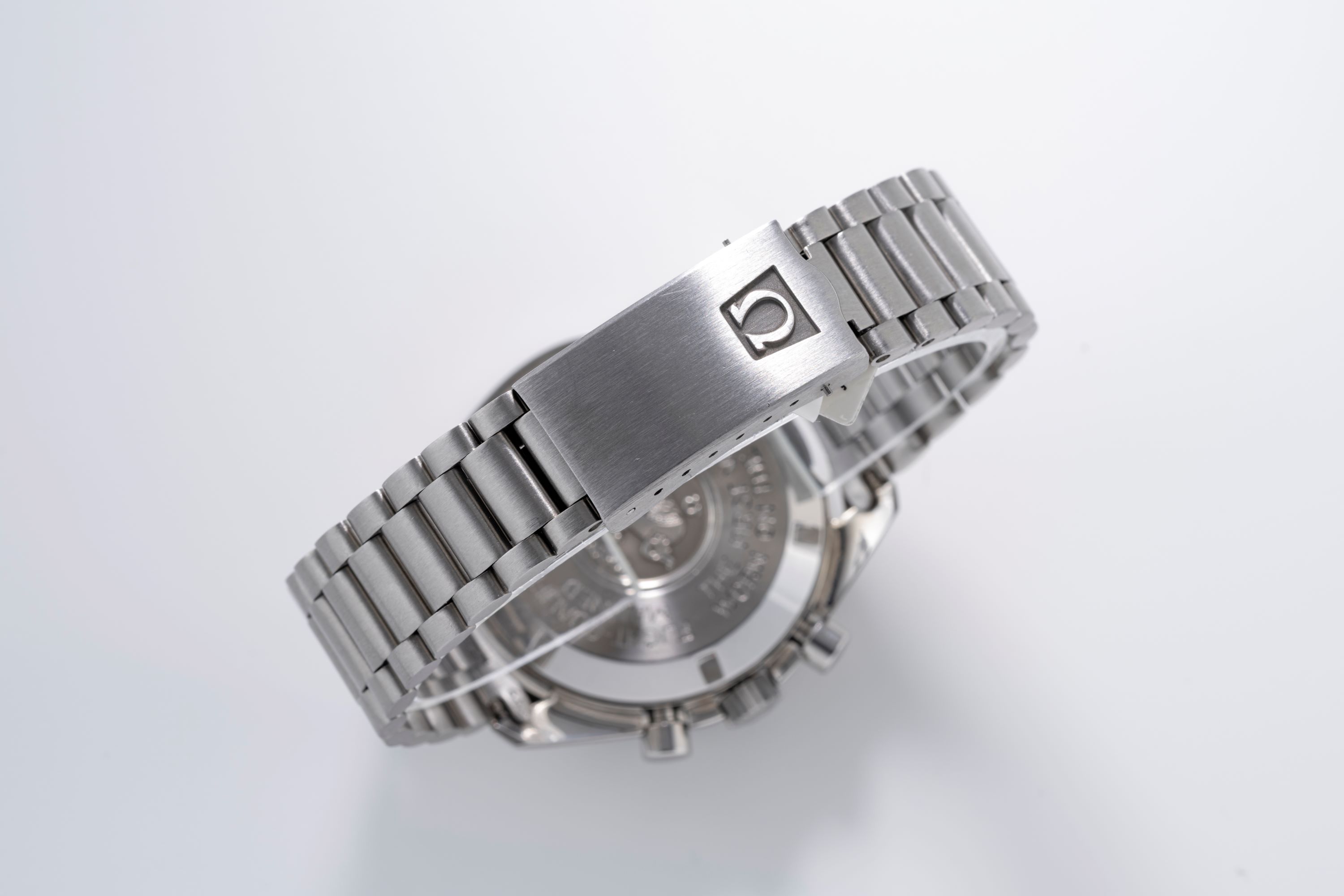 CaseSpeedmaster case in stainless steel with chronograph pushers at 2 and 4 o'clock, winding crown at 3 o'clock, solid caseback with engraving