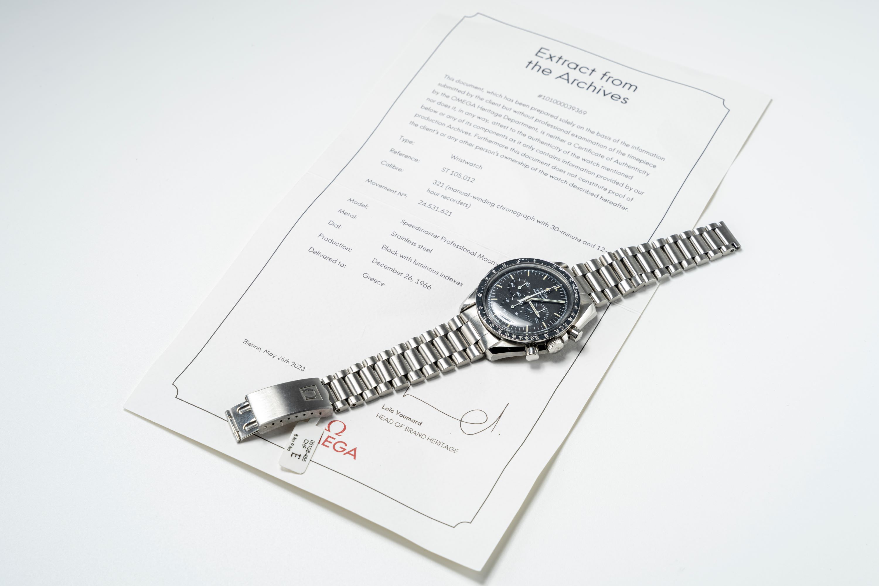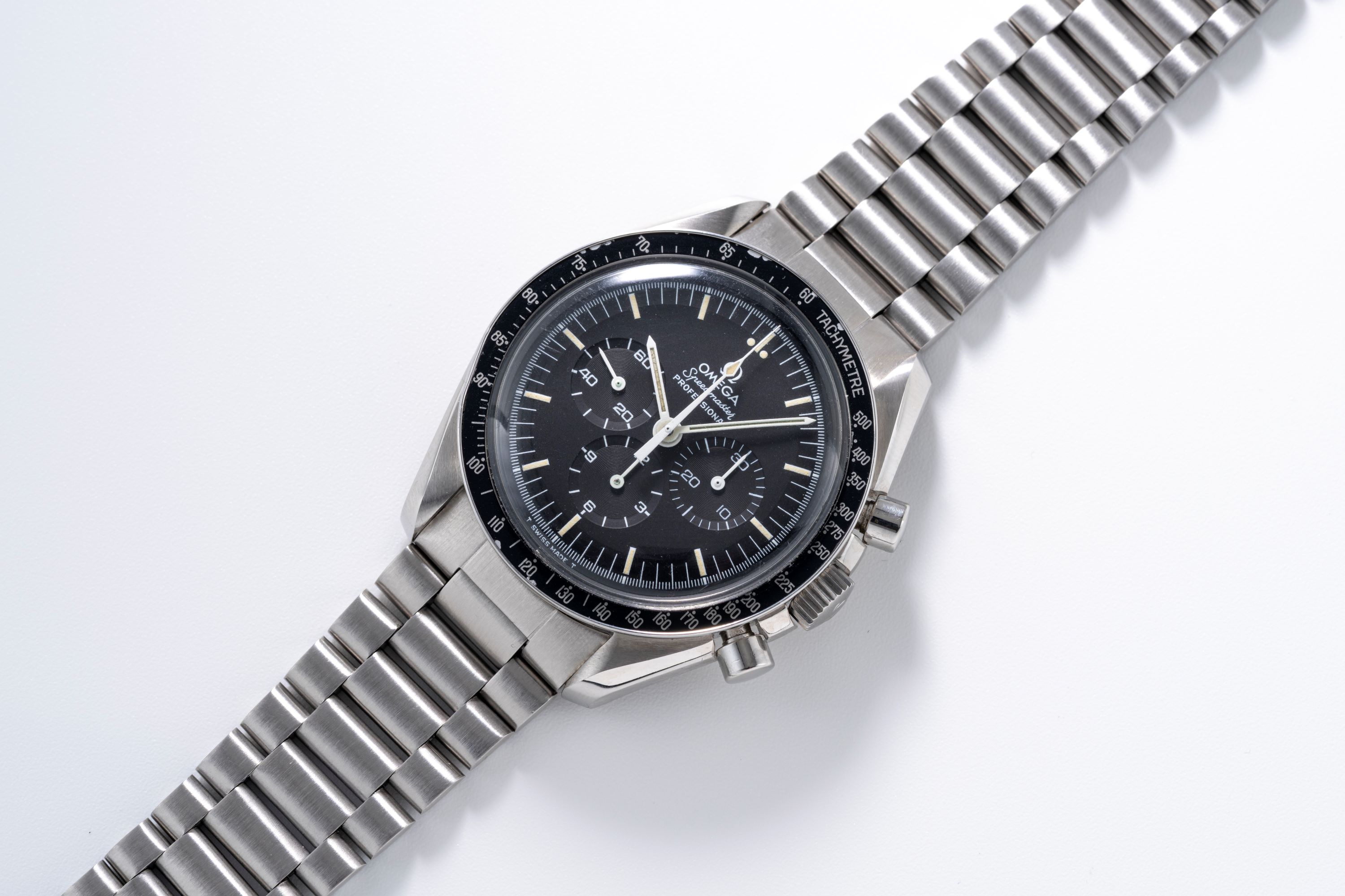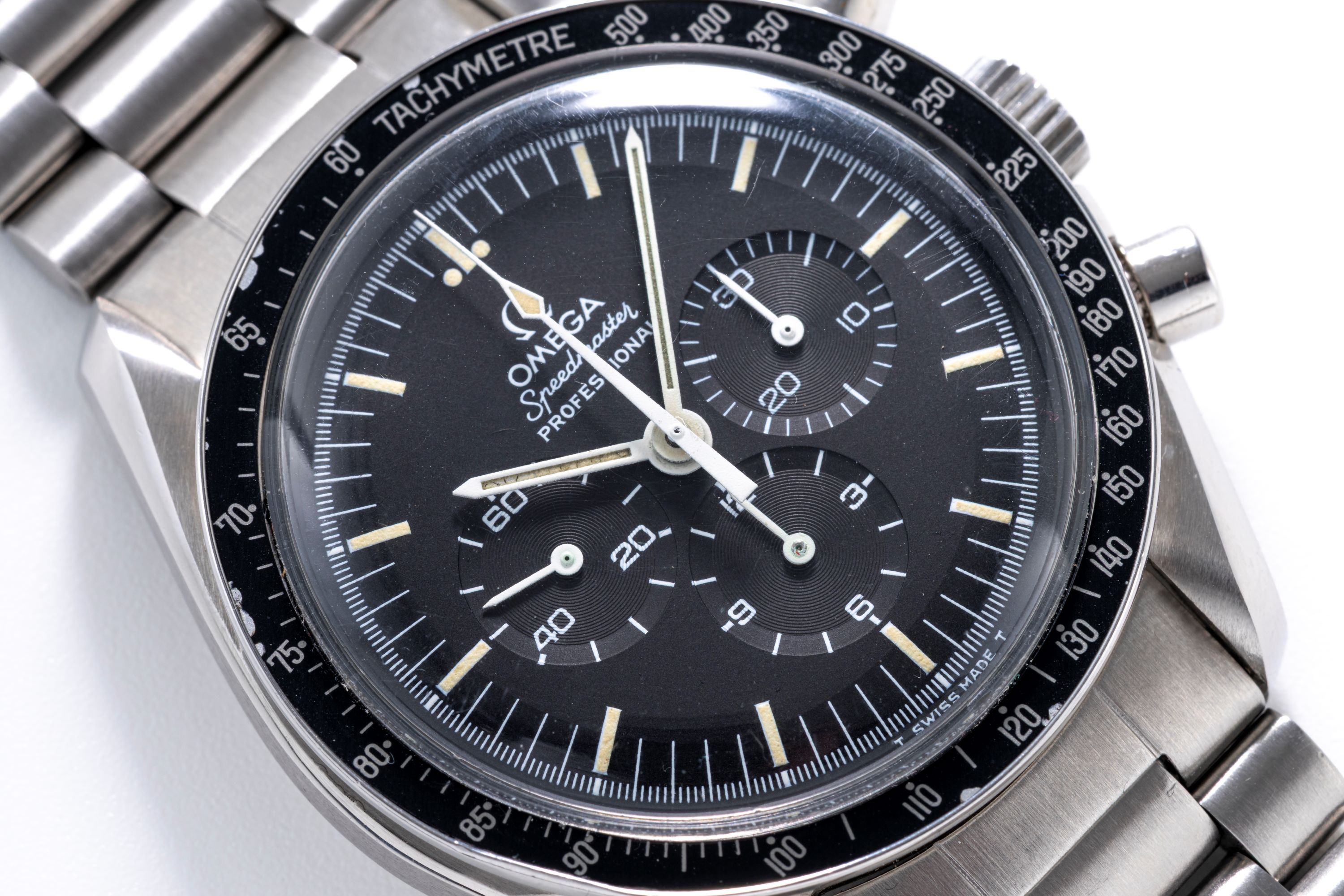 DialMatte black dial dial with tritium luminous indices, tritium luminous hands, small seconds at 9 o'clock, 12 hour chronograph counter at 6 o'clock, 30 minute chronograph counter at 3 o'clock, signed 'Omega' at 12 o'clock