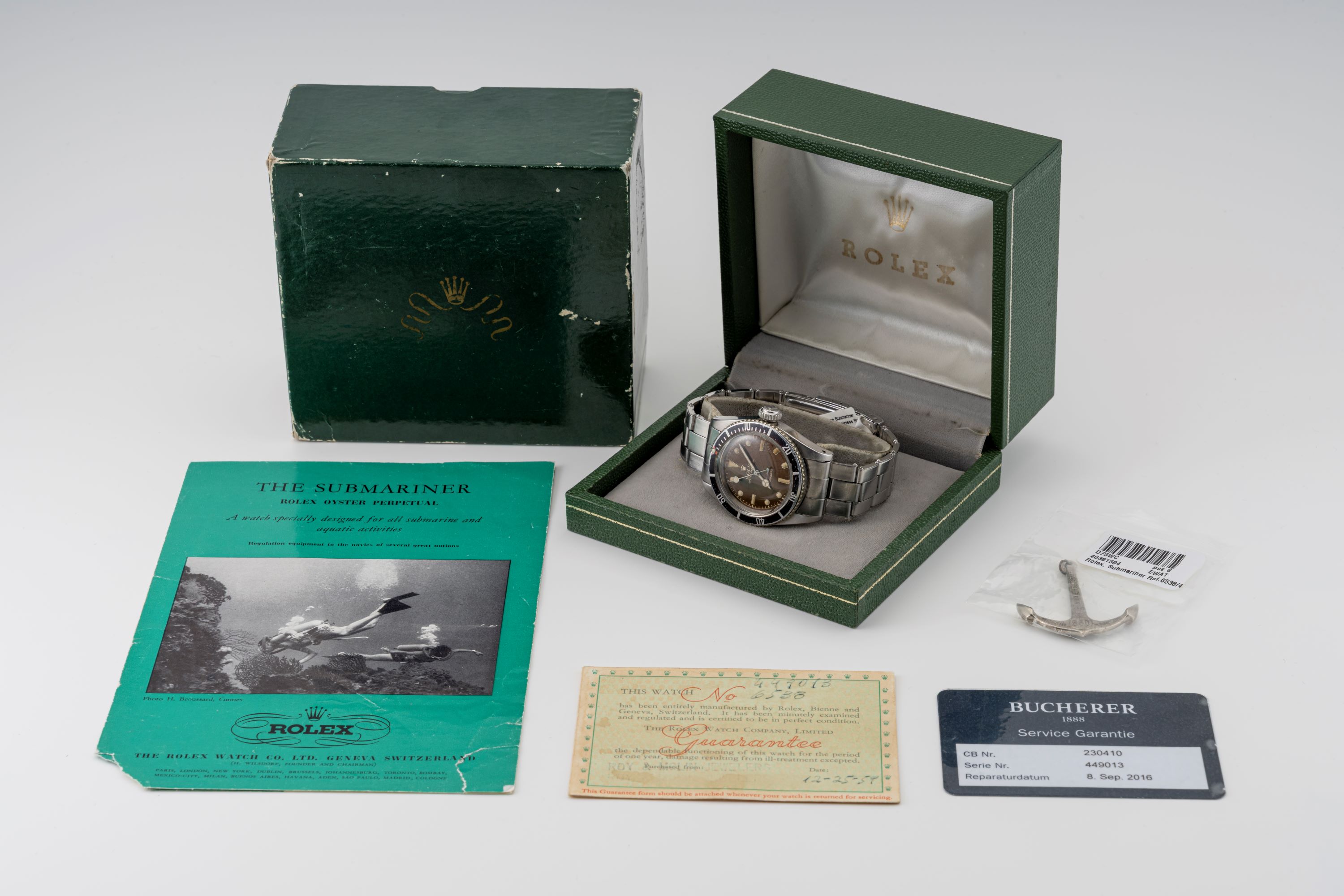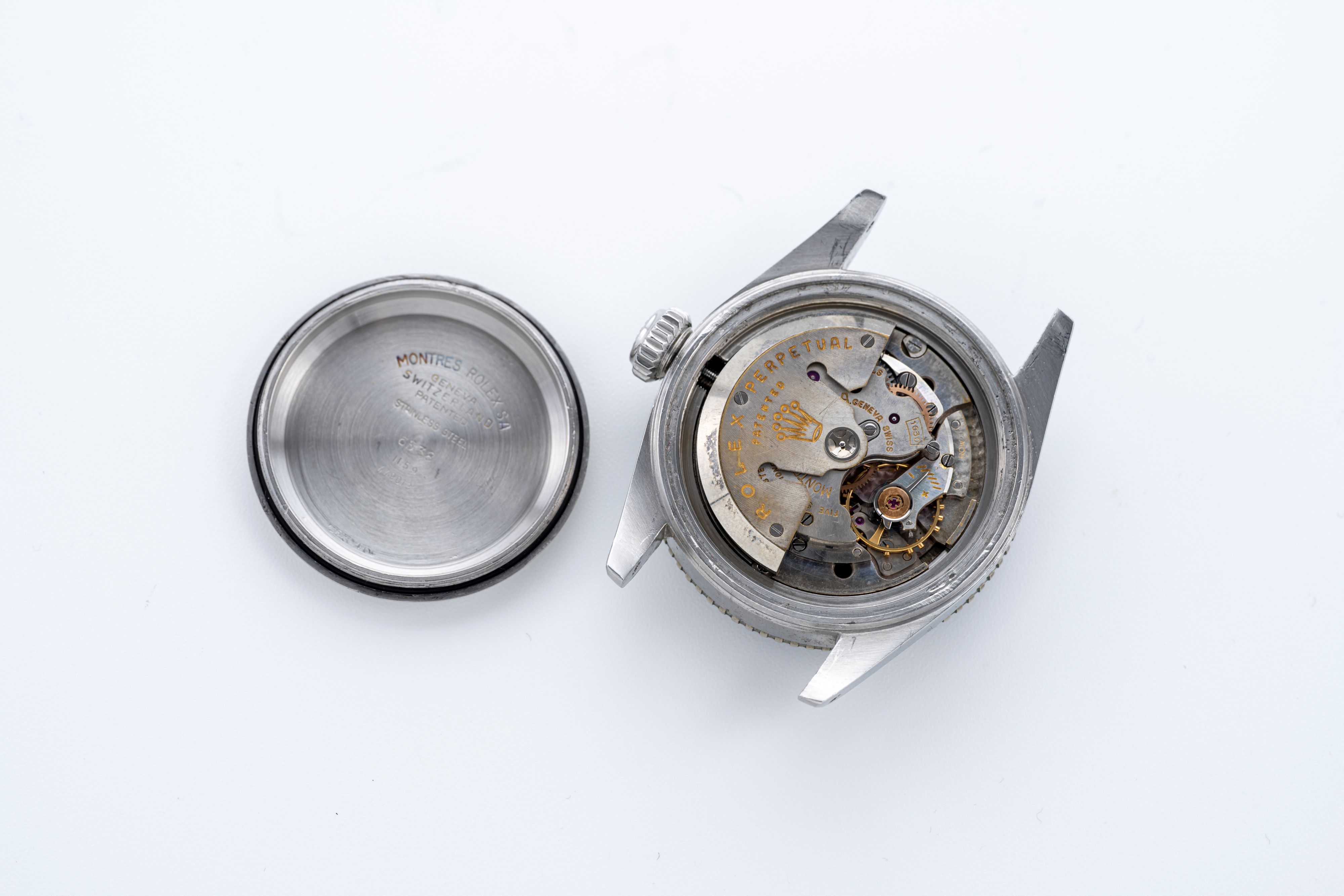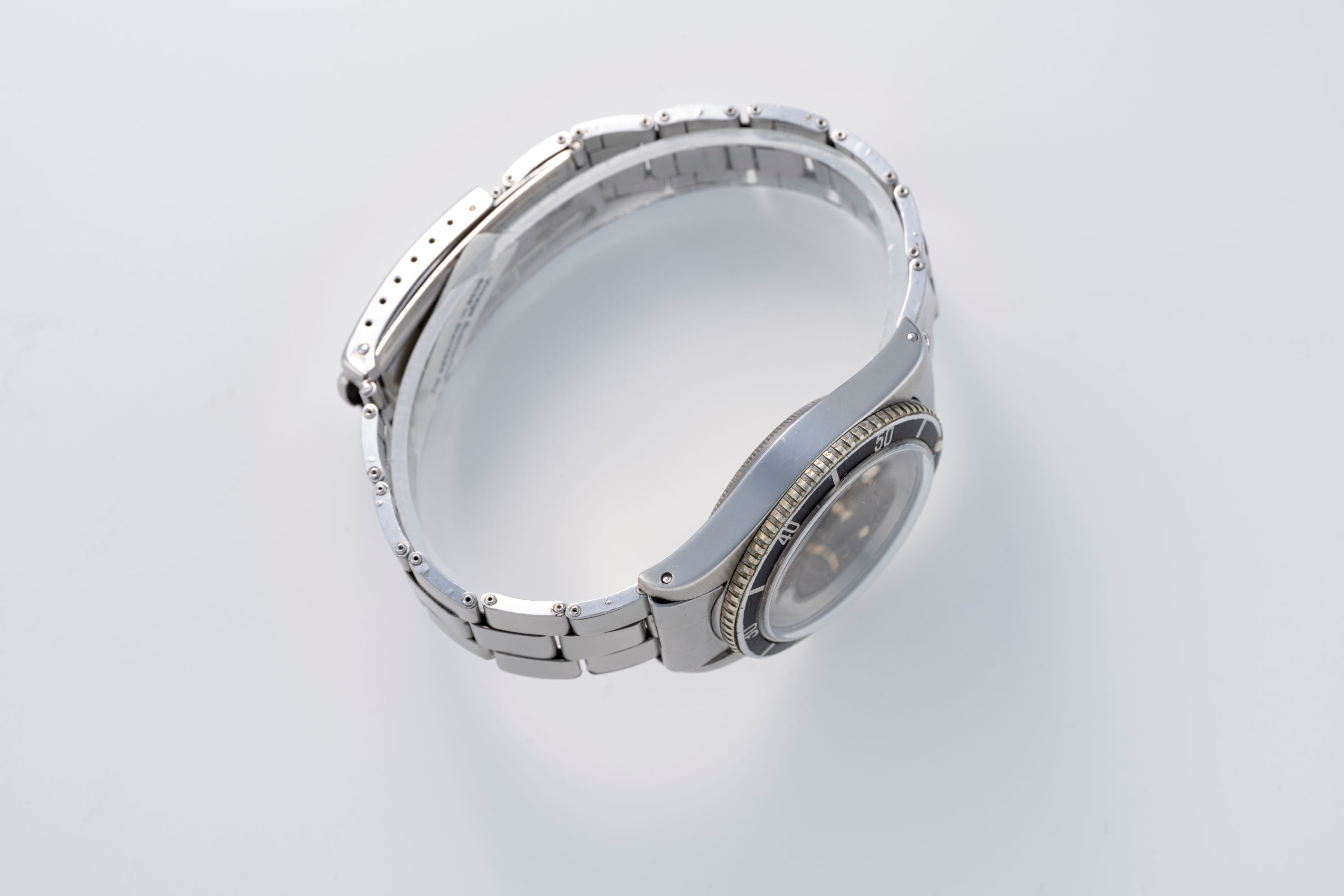 This Ref. 6538 Submariner dates to approximately 1958 and represents the well-known ‘Big Crown’ era in early Rolex diving watches. The dial has aged to a warm tropical tone with even ‘spider’ cracks in the lacquer, creating a distinctive appearance that is individual to this watch and valued by collectors who look for natural aging rather than restored surfaces. The bezel insert and case show consistent wear that reflects long-term use without major alteration, supporting this one as a very original example. The watch is offered with its original Original Box and Papers from 1959, along with later service records by Bucherer. This level of documentation is uncommon for watches of this period and provides clear continuity of ownership and care. The presence of the original accessories adds historical context and long-term confidence for the next collector. As an early Submariner with a tropical dial and complete accompanying material, this example offers strong collectible value and a direct link to the development of early Rolex tool watches in the late 1950s.