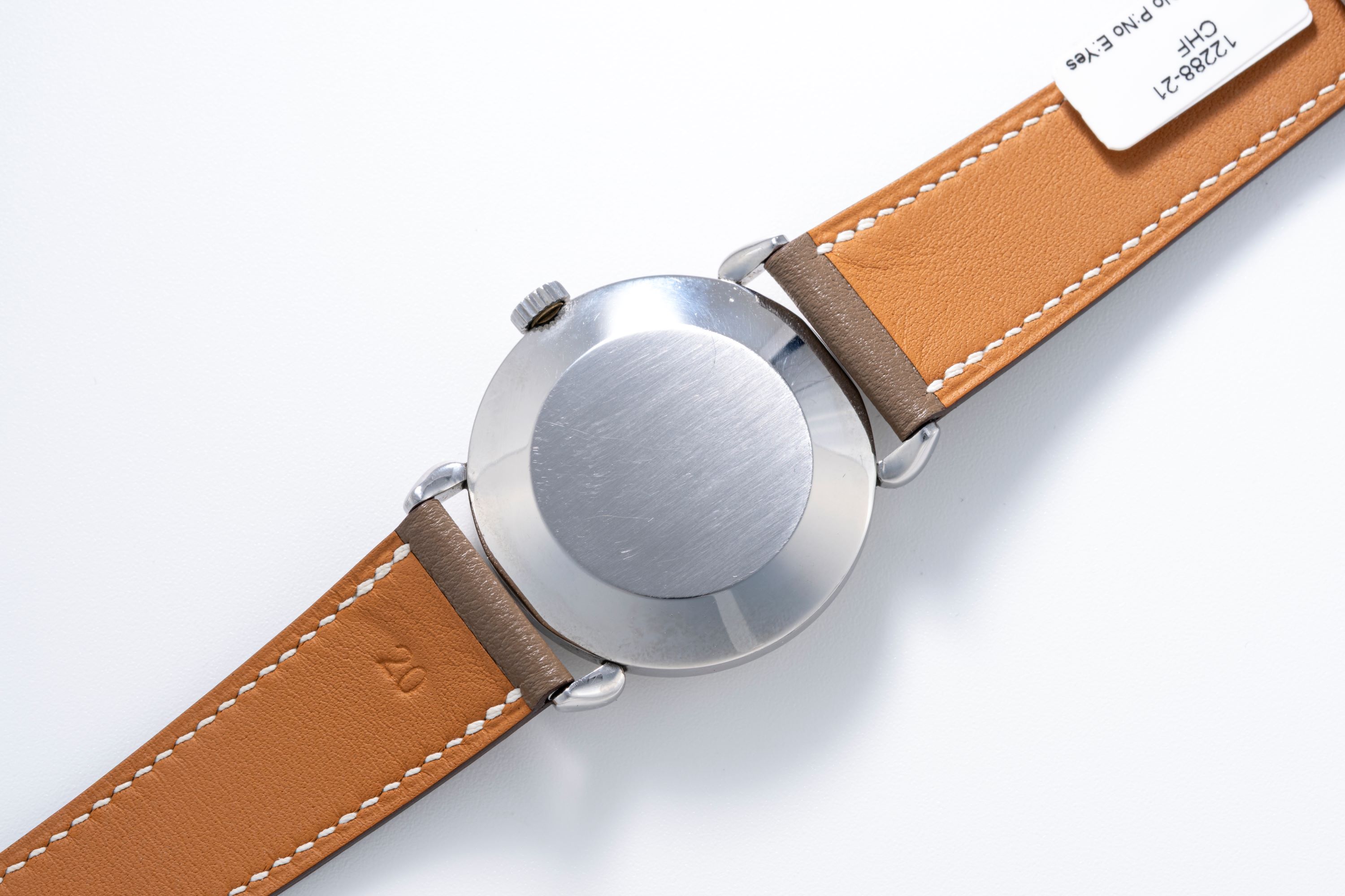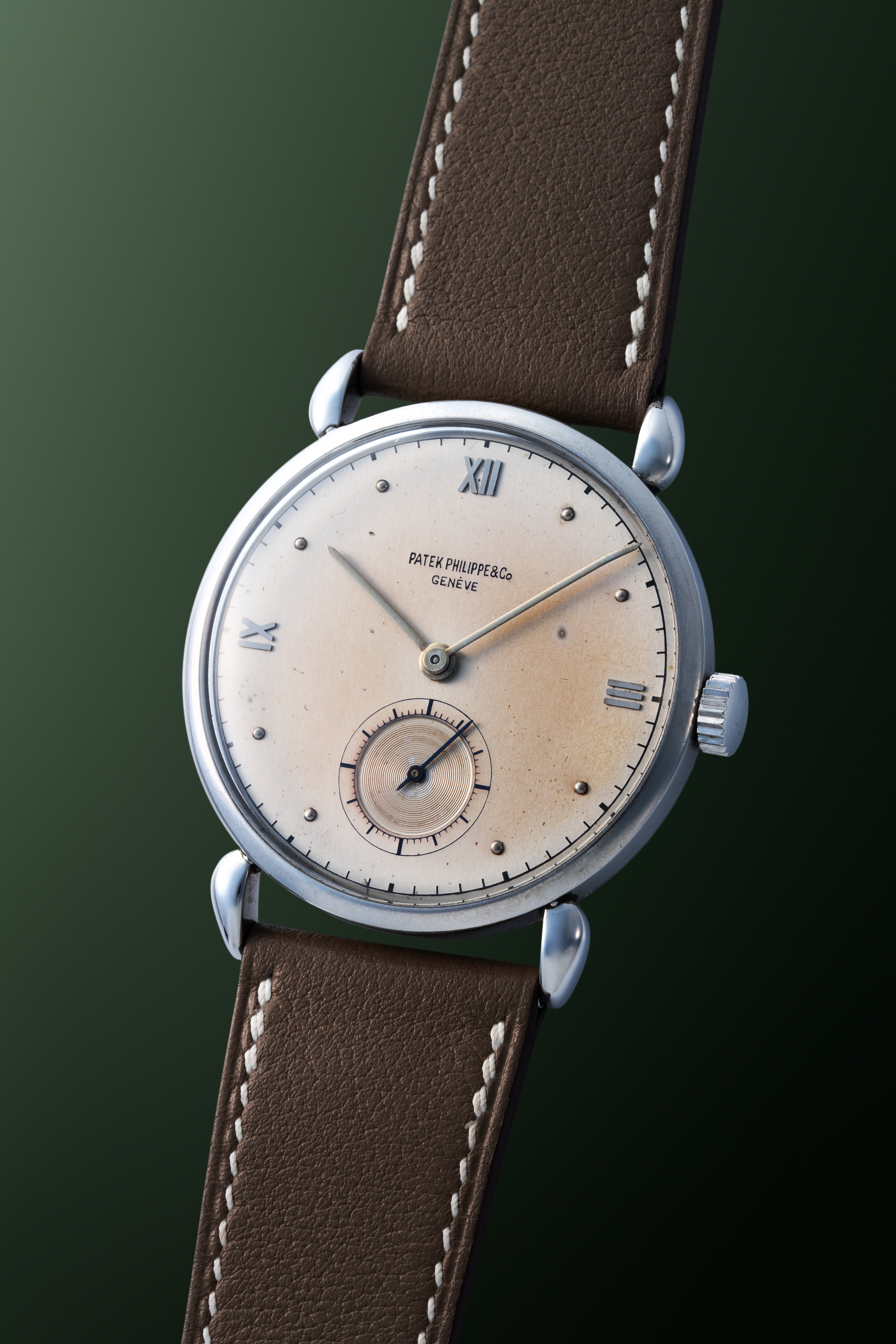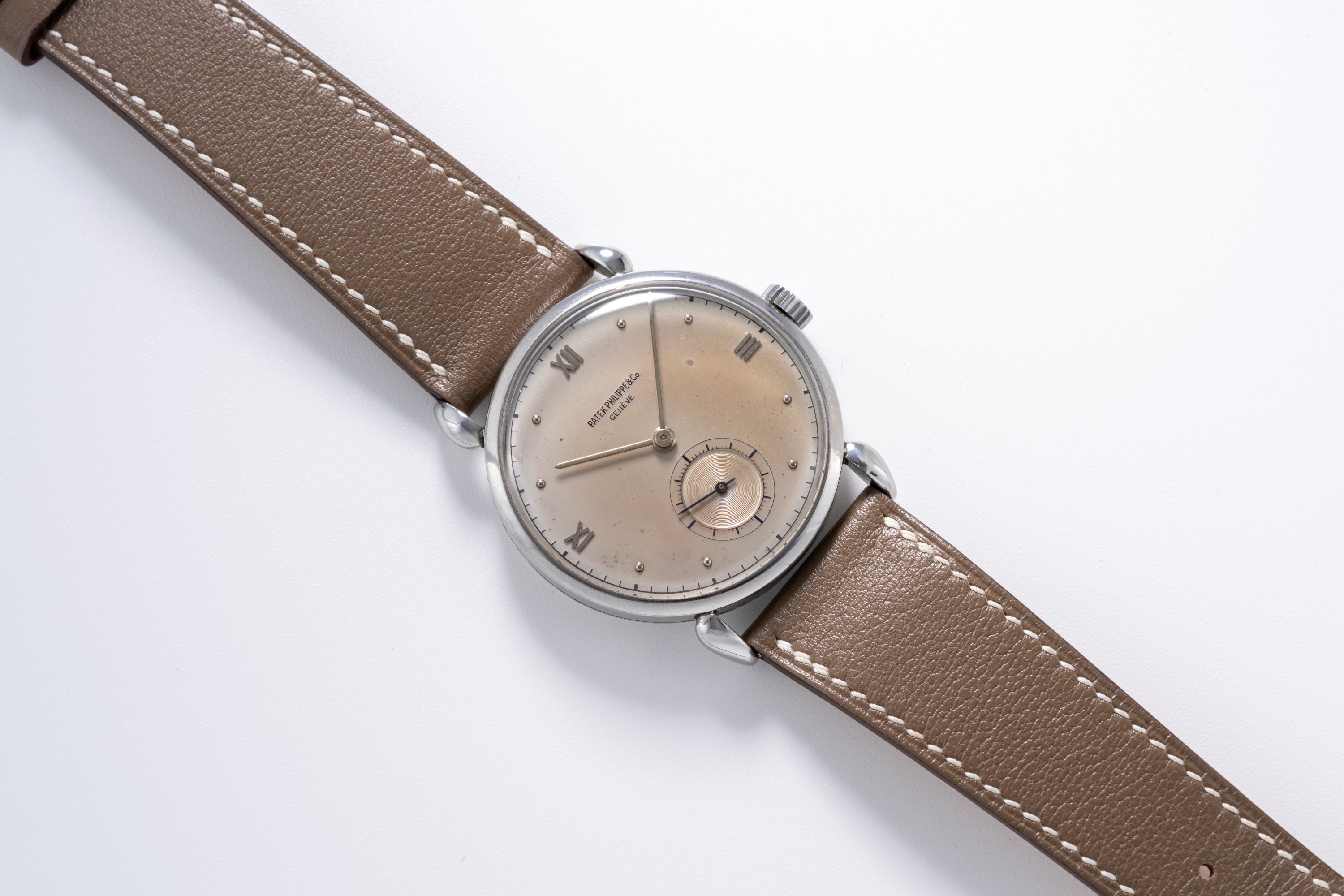 This Patek Philippe Calatrava Ref. 1509 in stainless steel is a rare opportunity to acquire a highly desirable vintage model from one of the most respected houses in watchmaking. Produced in very small numbers, the reference is already uncommon, but in stainless steel it becomes especially scarce, as Patek Philippe made only a limited number of steel dress watches during this era. The watch features the elegant design language that defines the early Calatrava line, including a slim round case, beautiful teardrop lugs, and a clean dial layout. The aged dial has developed a natural patina that adds character and authenticity, offering the charm collectors value in untouched vintage examples. The small seconds display at 6 o’clock and applied Roman numerals at 12, 3, and 9 o’clock give the watch a refined, balanced look. Inside the case beats a manually-wound Patek Philippe Caliber 12-120 known for reliability, precision, and traditional hand-finishing. The combination of steel construction, classic 1940s styling, and a well-preserved original dial makes this Ref. 1509 a highly collectible piece of Patek Philippe history. For collectors of rare vintage Patek, or for anyone seeking a timeless and understated dress watch with exceptional provenance, this steel Ref. 1509 stands out as a special and worthwhile acquisition.