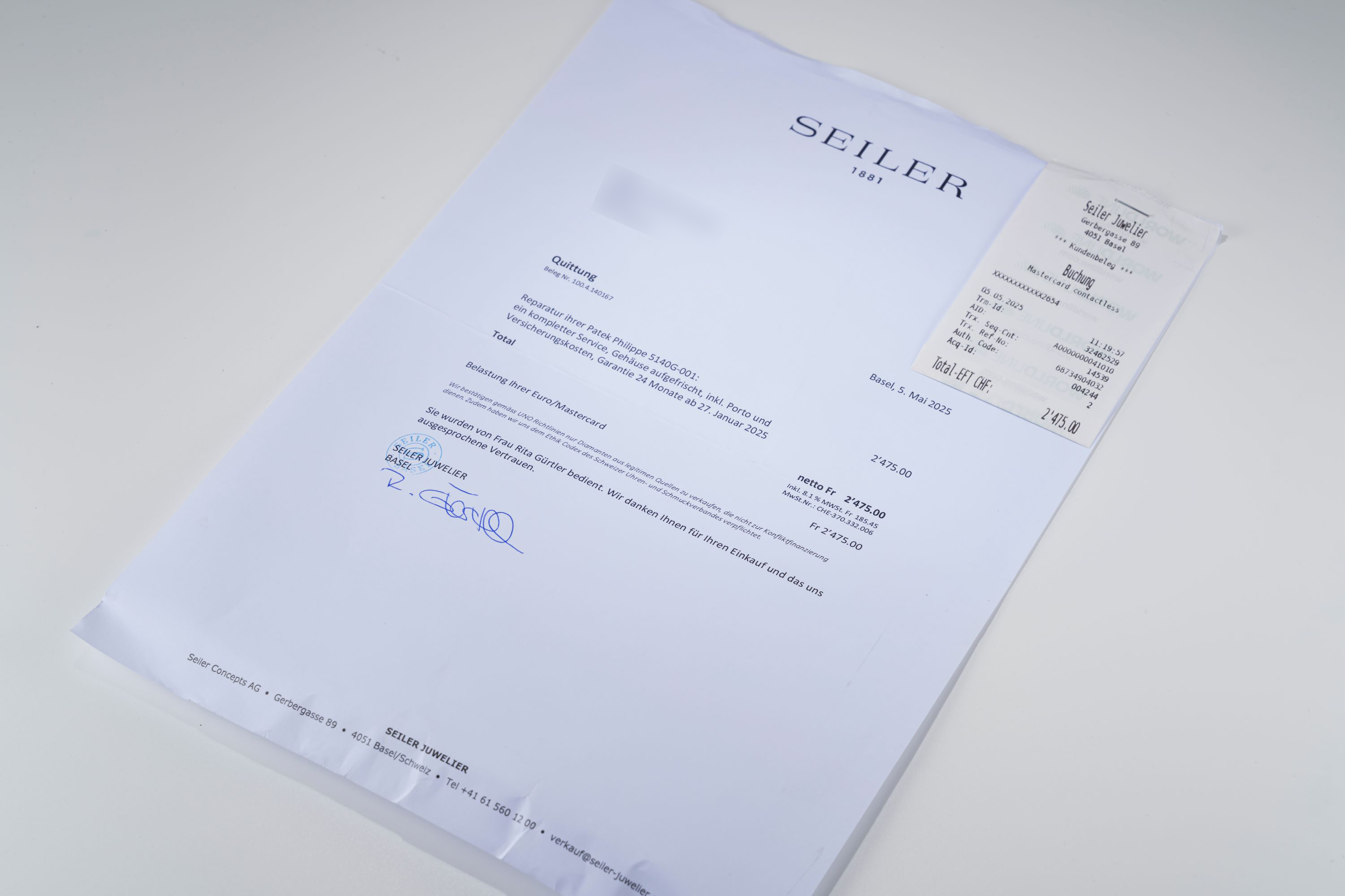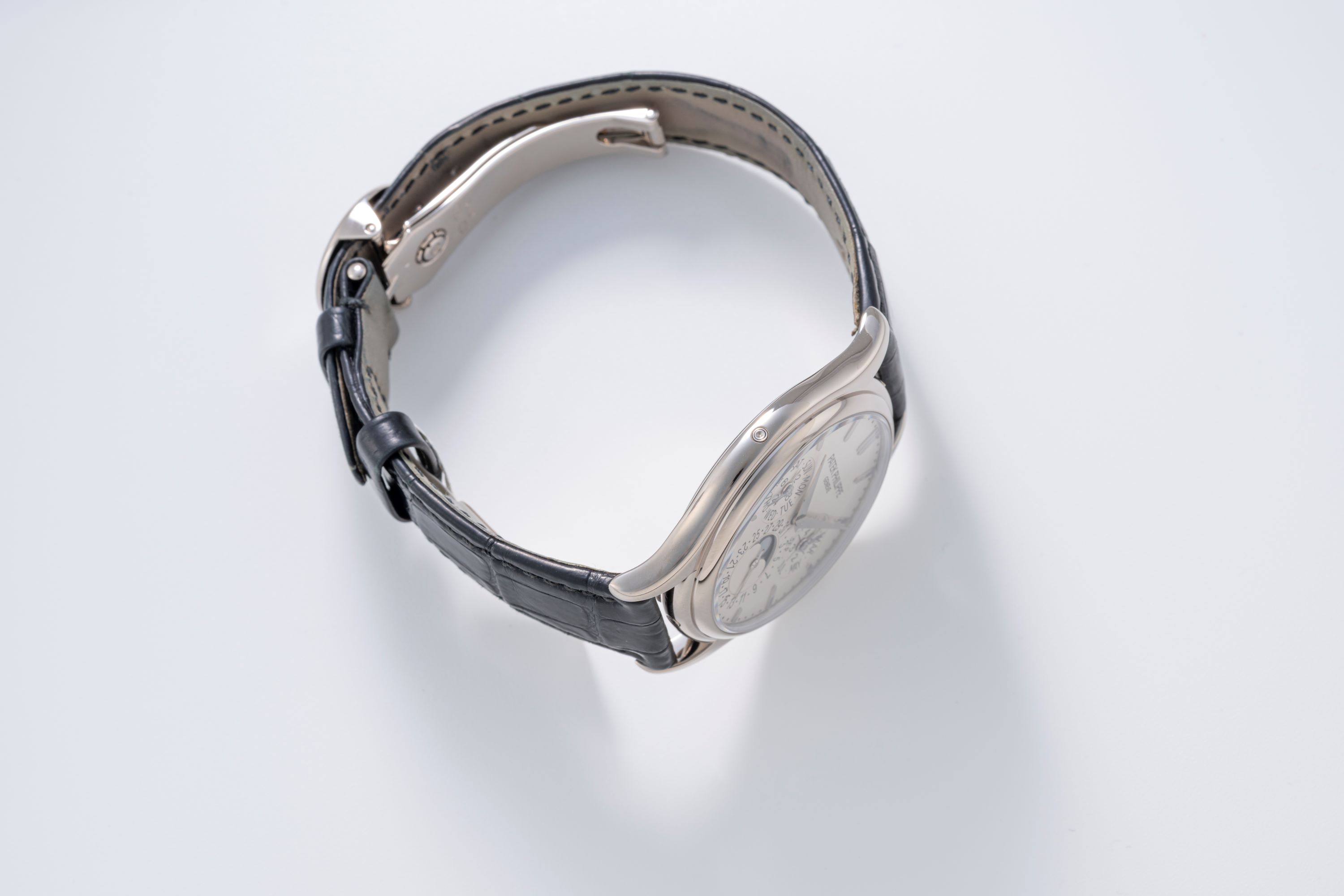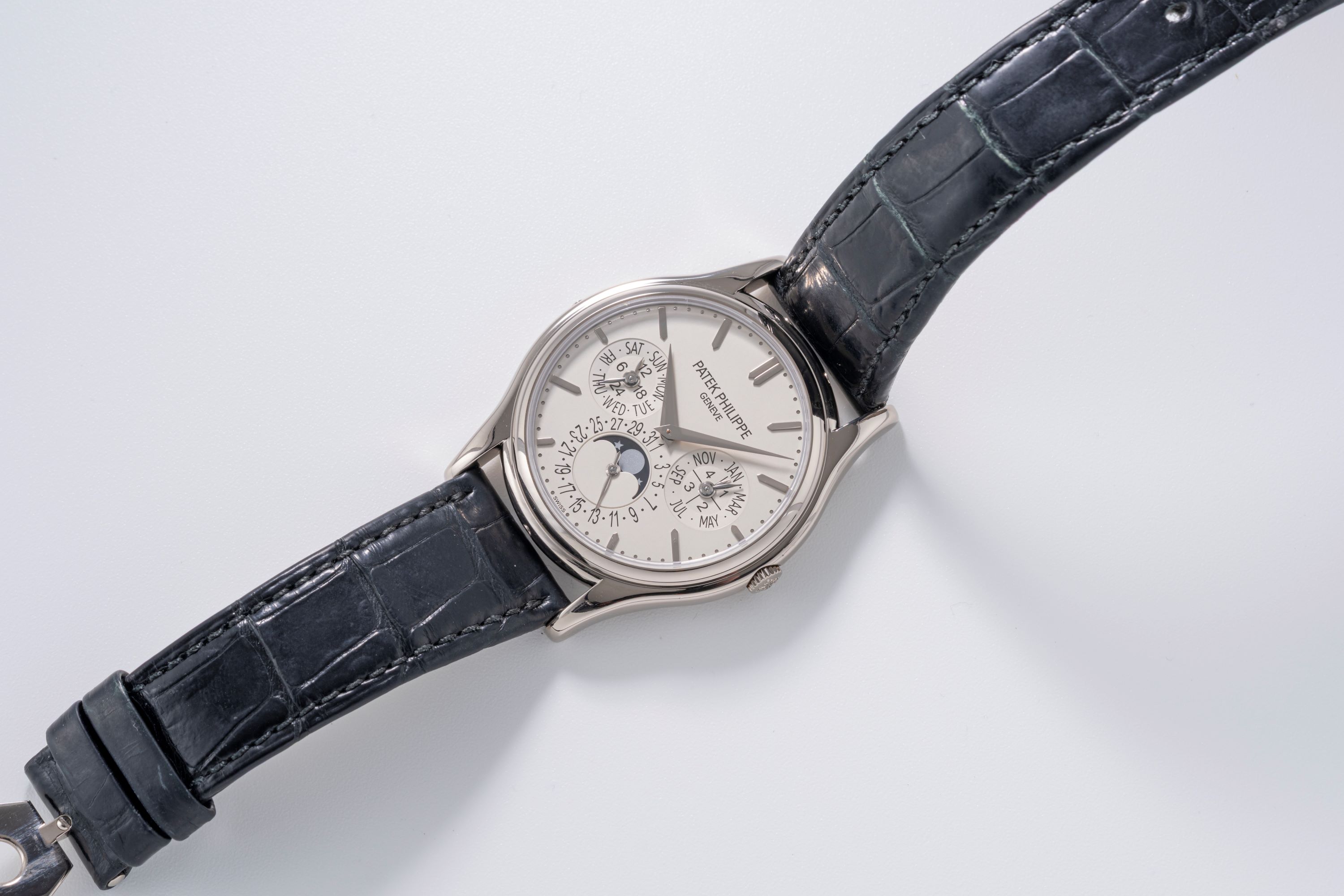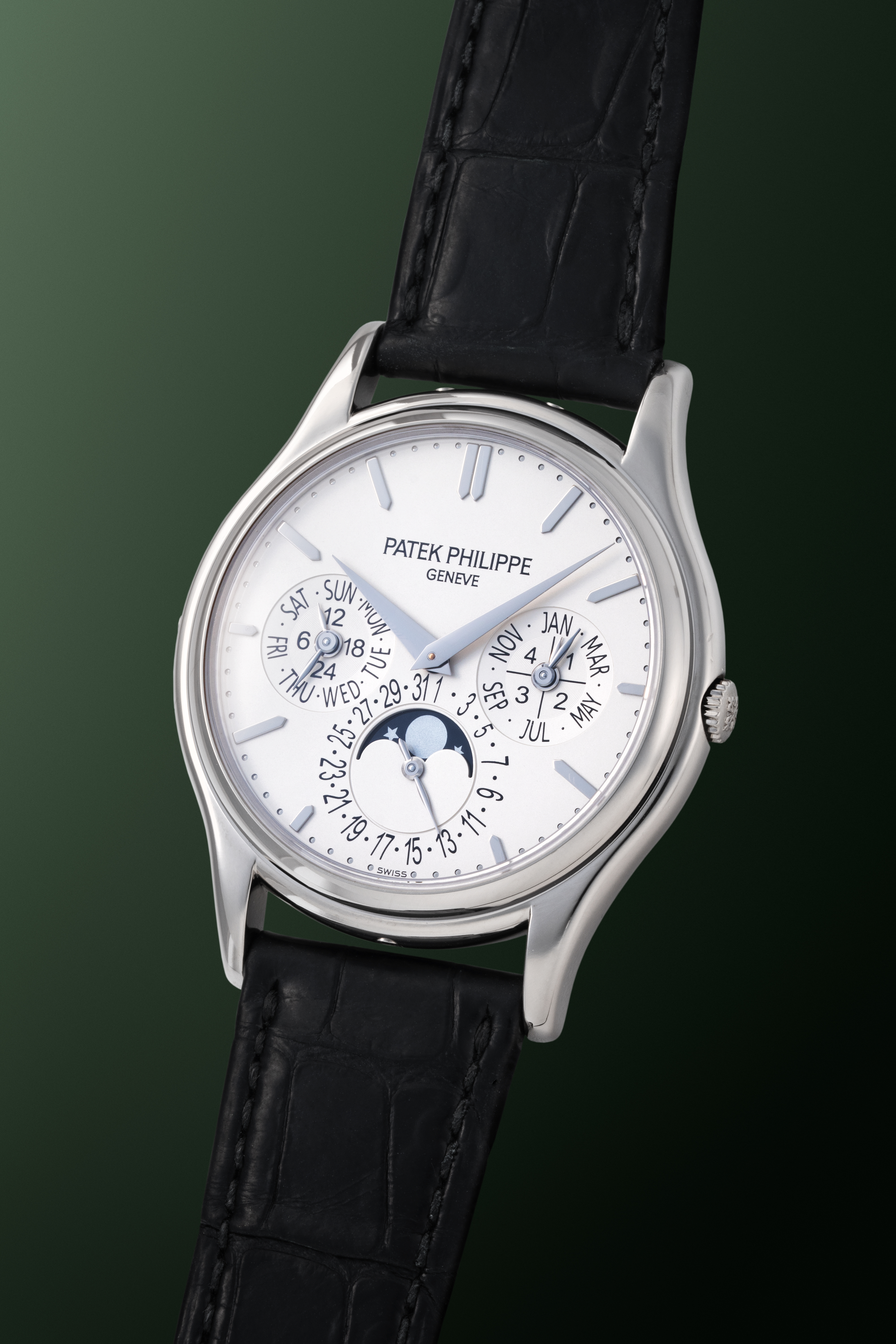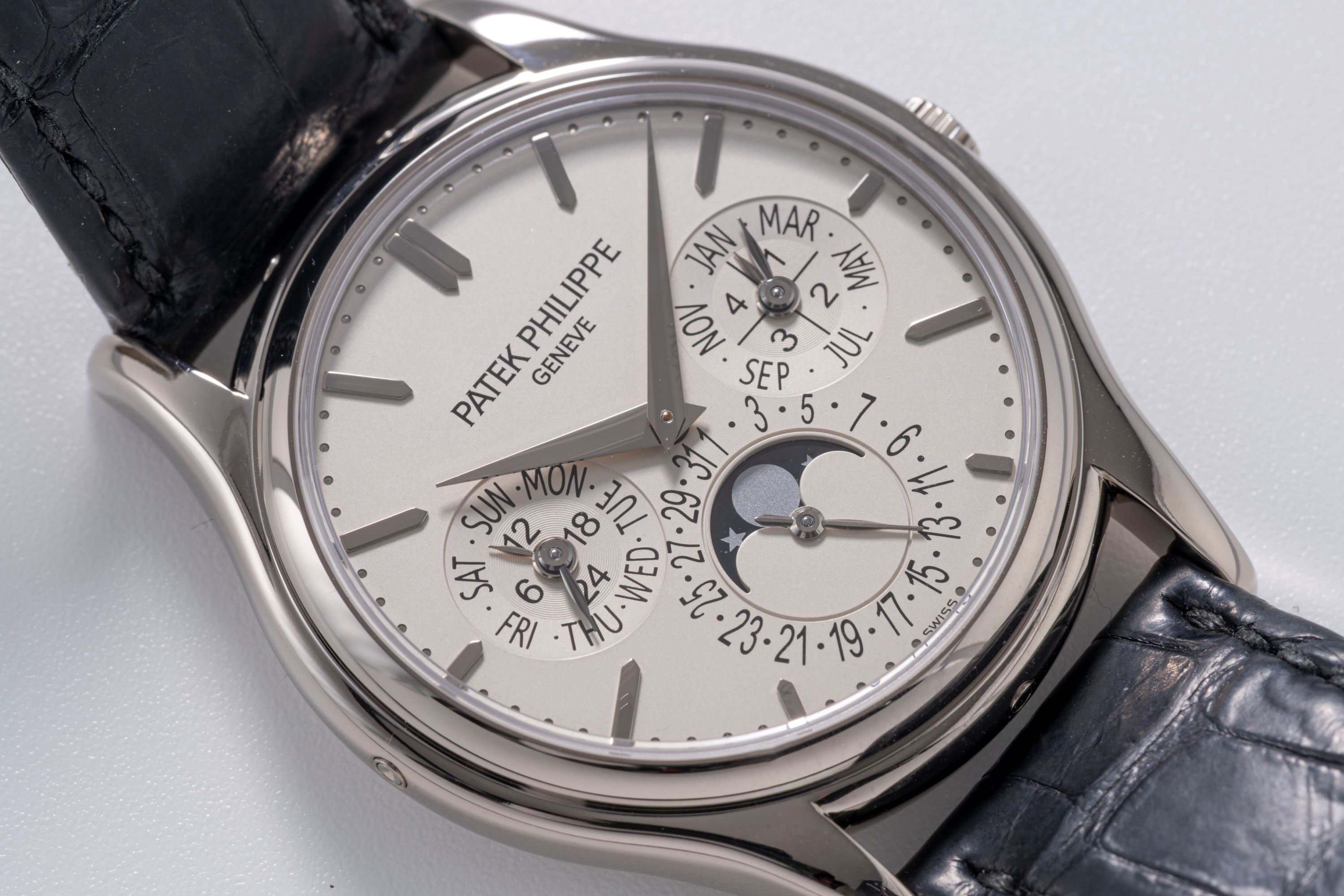 DialSilver-white dial white gold applied indices, white gold dauphine hands, day and 24 hour indicator at 9 o'clock, month and leap year indicator at 3 o'clock, moonphase and date at 6 o'clock, signed 'Patek Philippe' at 12 o'clock