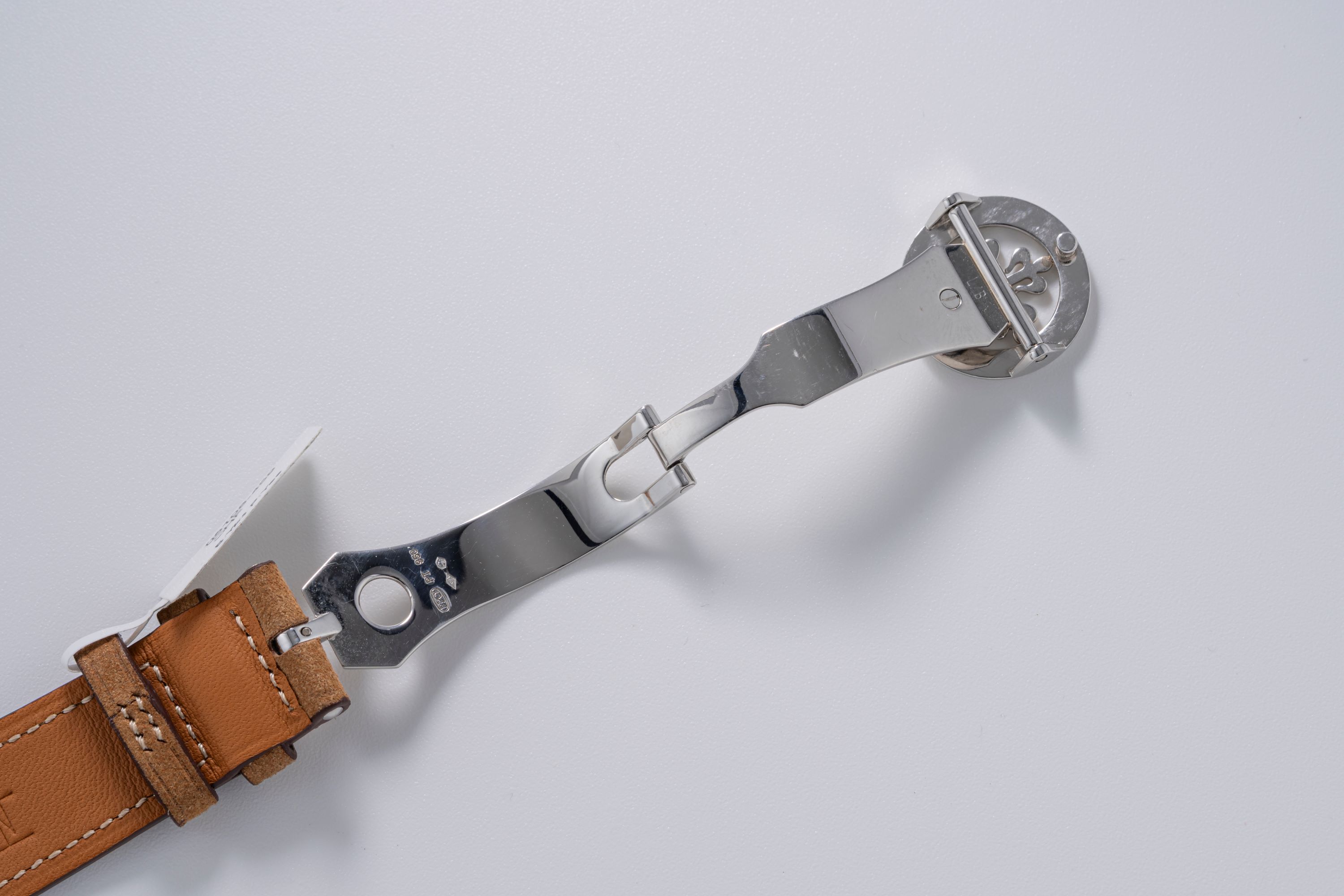 CaseRound case in platinum with crown at 3 o'clock, calendar pushers around the case flanks, display caseback with magnifying glass over the escapement