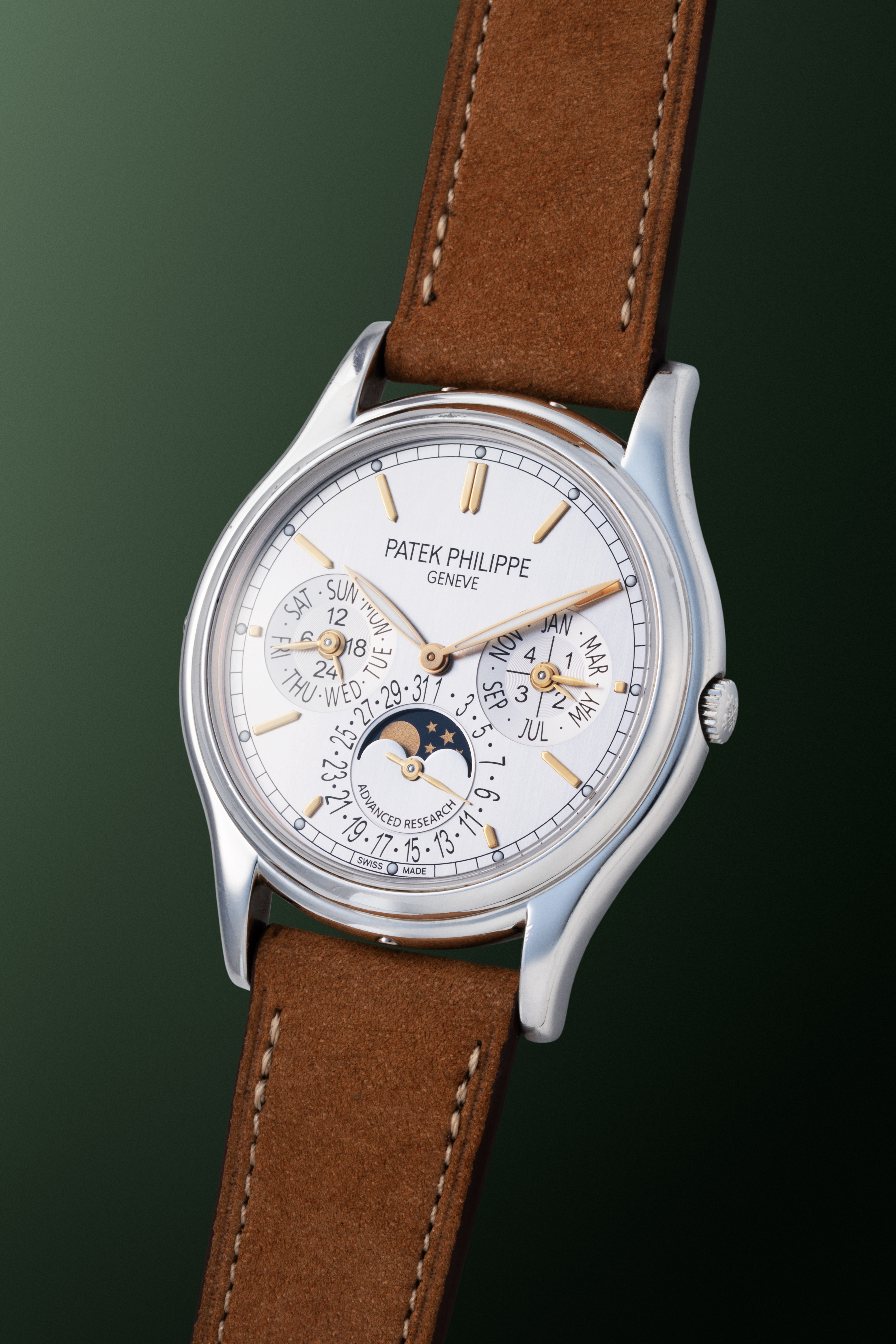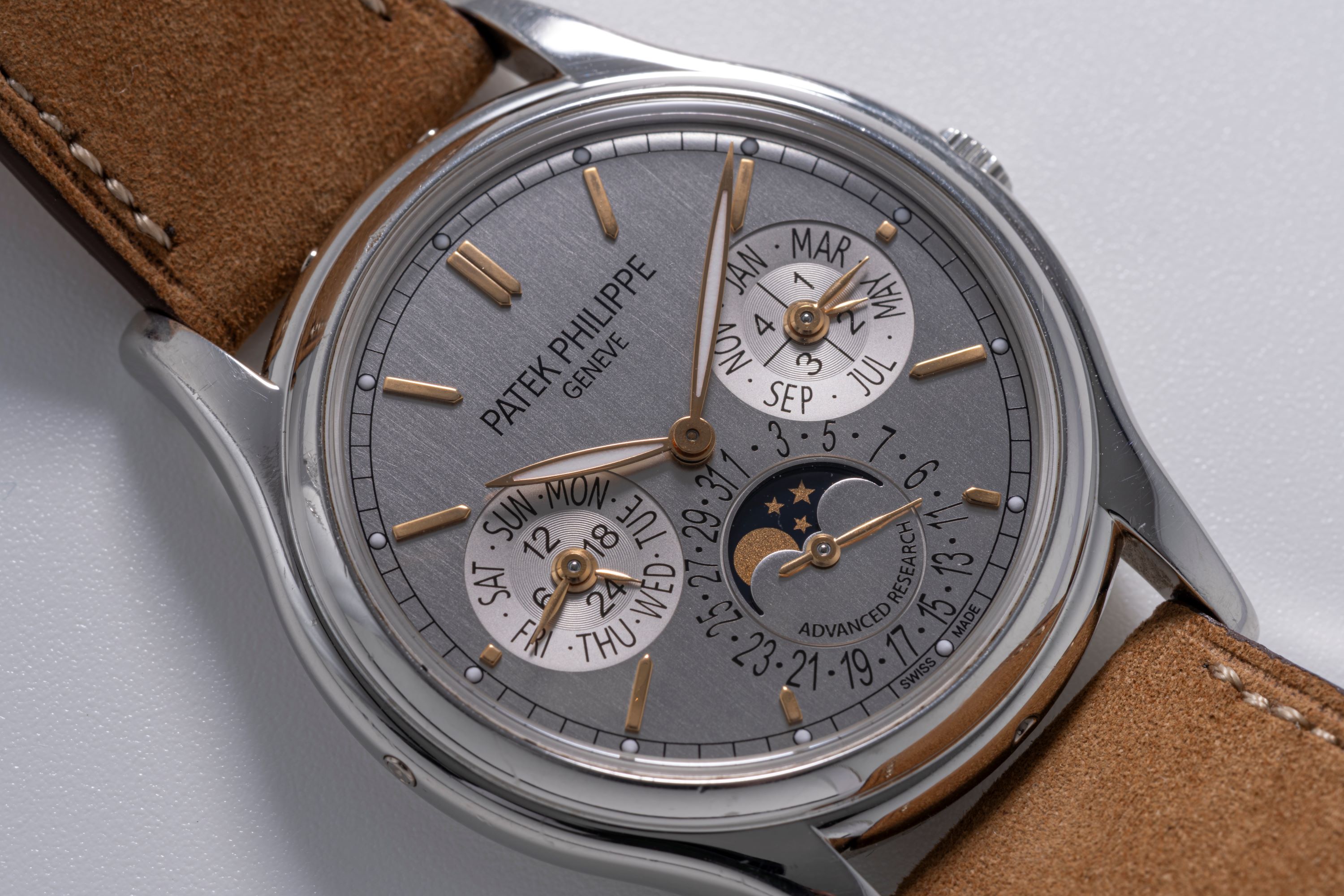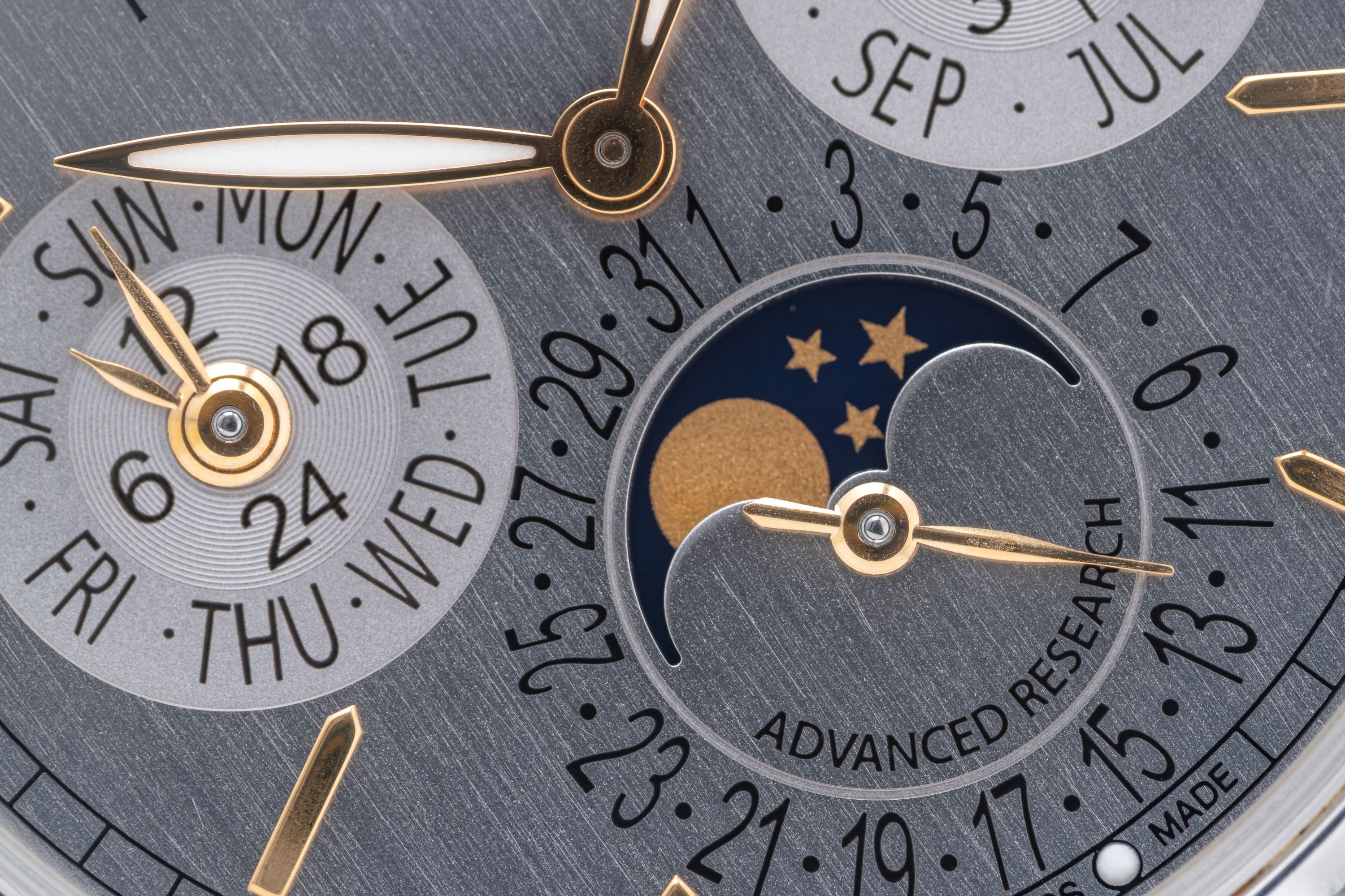 DialSilver vertically-brushed dial with applied gold indices, luminous gold leaf hands, month and leap year at 3 o'clock, moonphase and date at 6 o'clock, day and 24 hour indicator at 9 o'clock, signed 'Patek Philippe' at 12 o'clock and 'Advanced Research' at 6 o'clock