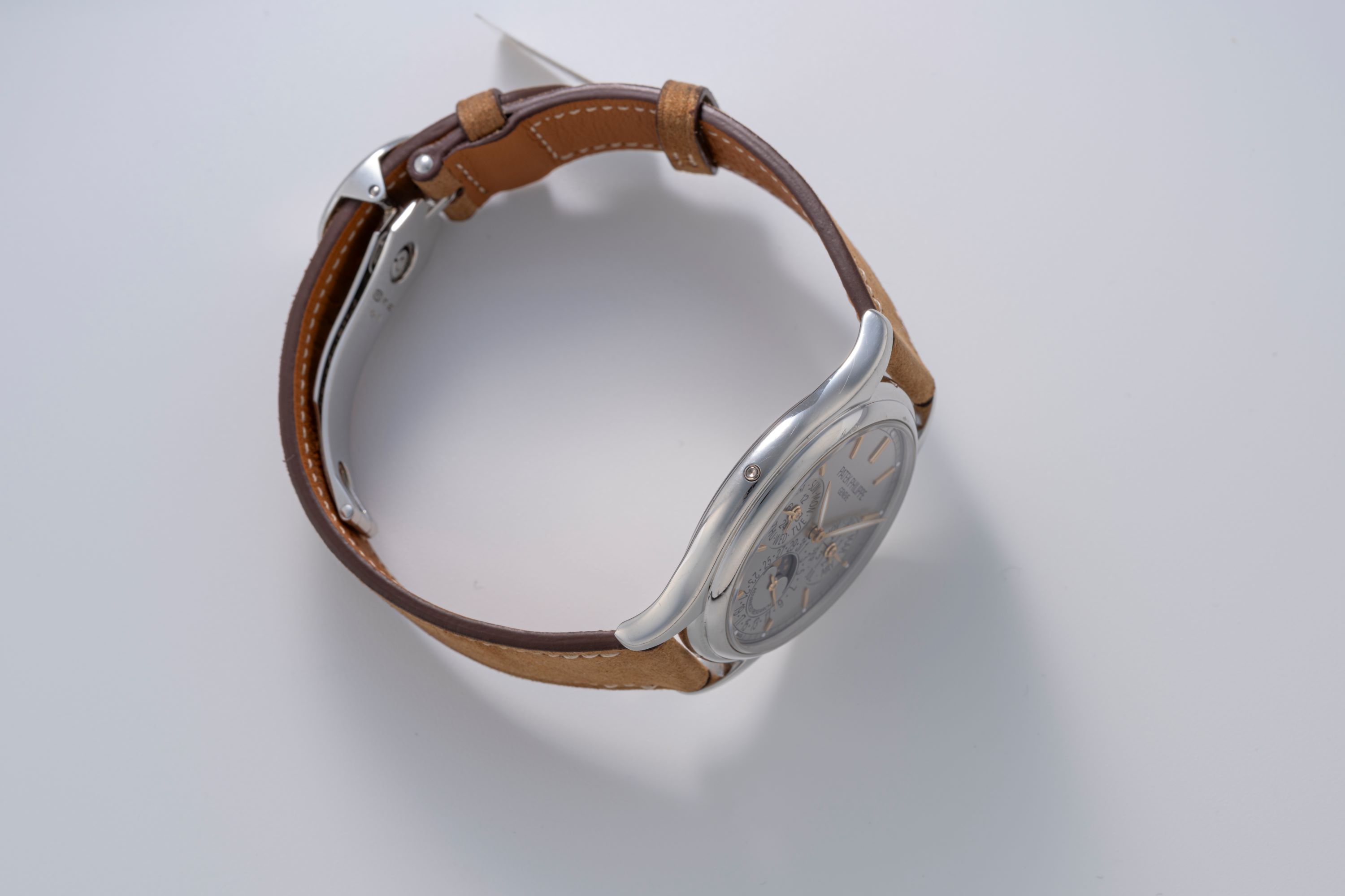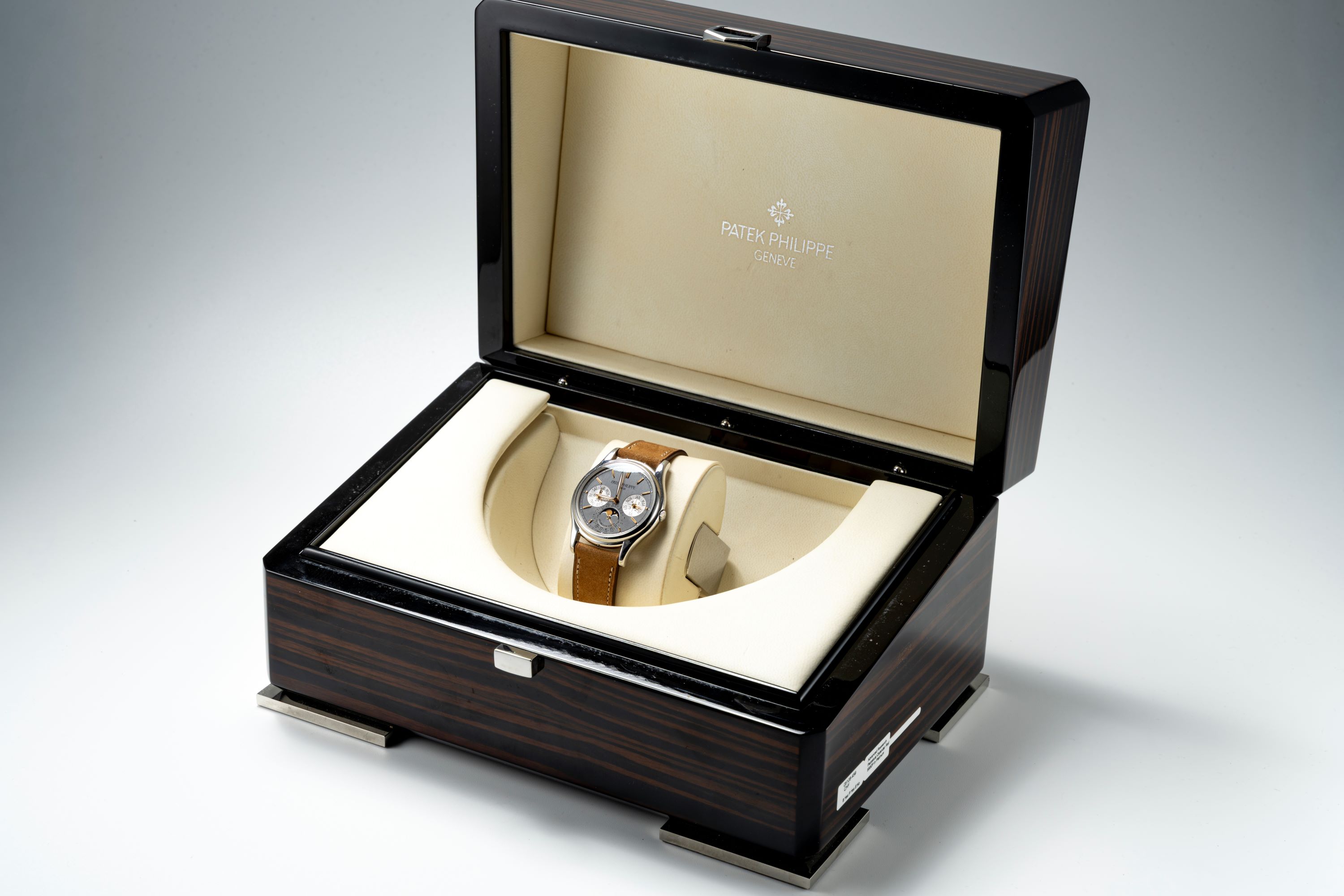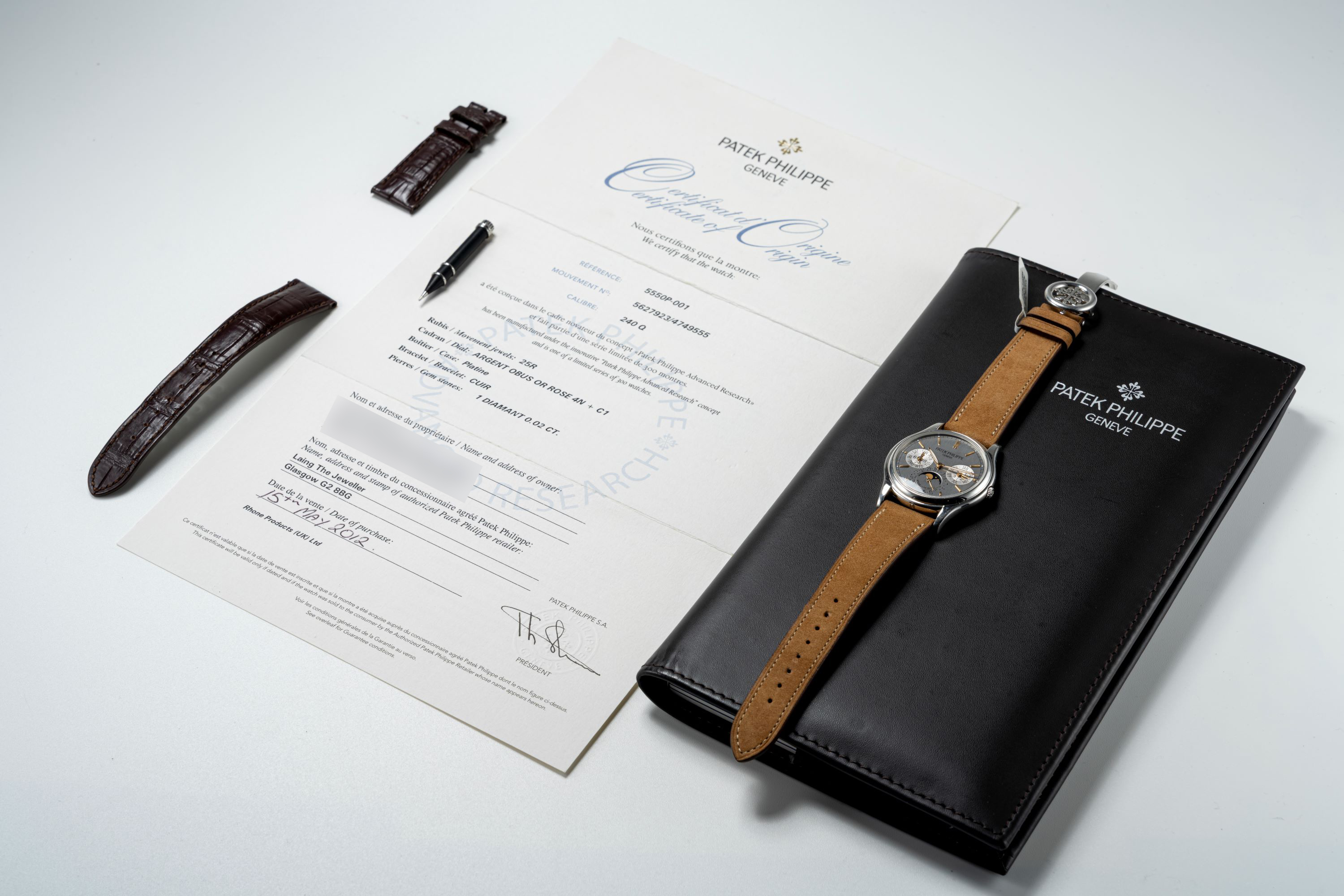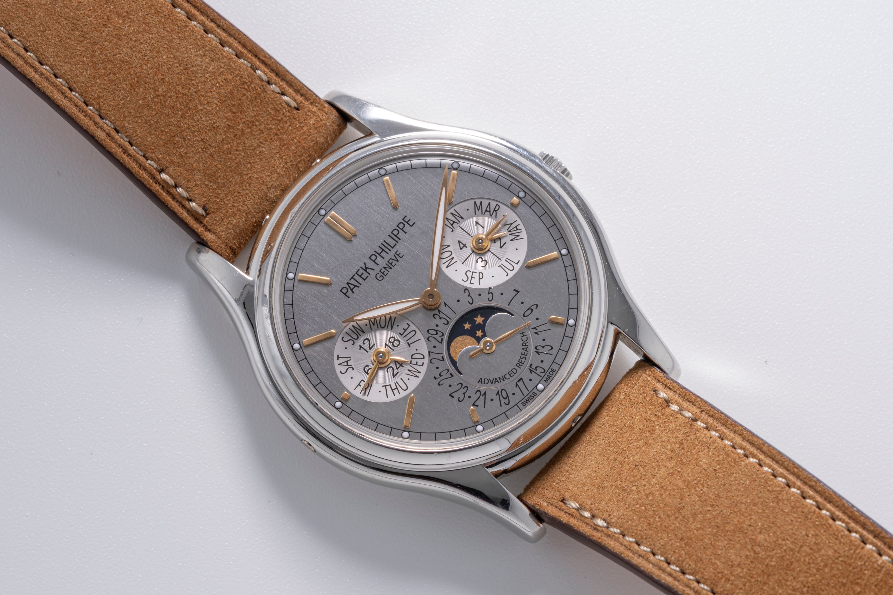 DialSilver vertically-brushed dial with applied gold indices, luminous gold leaf hands, month and leap year at 3 o'clock, moonphase and date at 6 o'clock, day and 24 hour indicator at 9 o'clock, signed 'Patek Philippe' at 12 o'clock and 'Advanced Research' at 6 o'clock