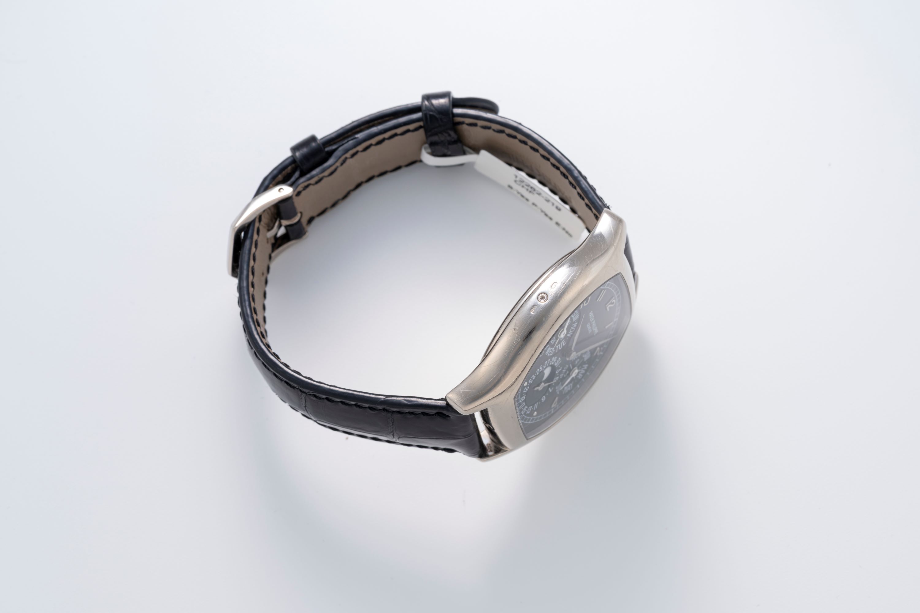 CaseTortue-style case in 18k white gold with crown at 3 o'clock, calendar pushers around the case flanks, display caseback