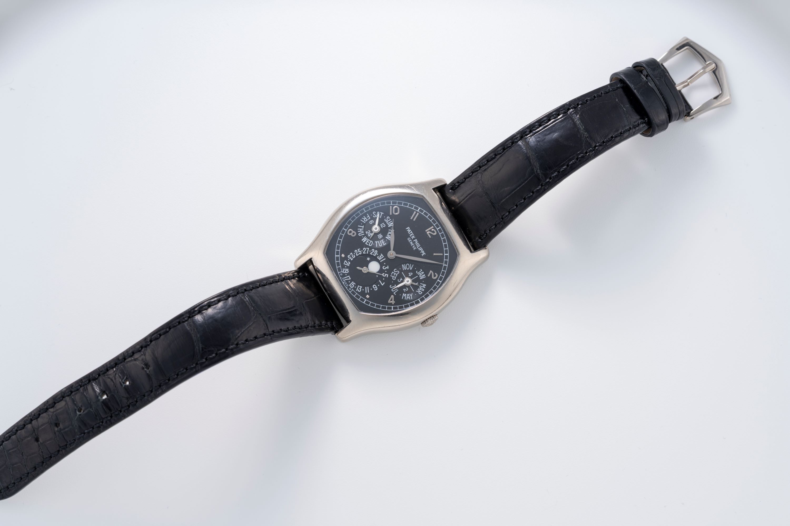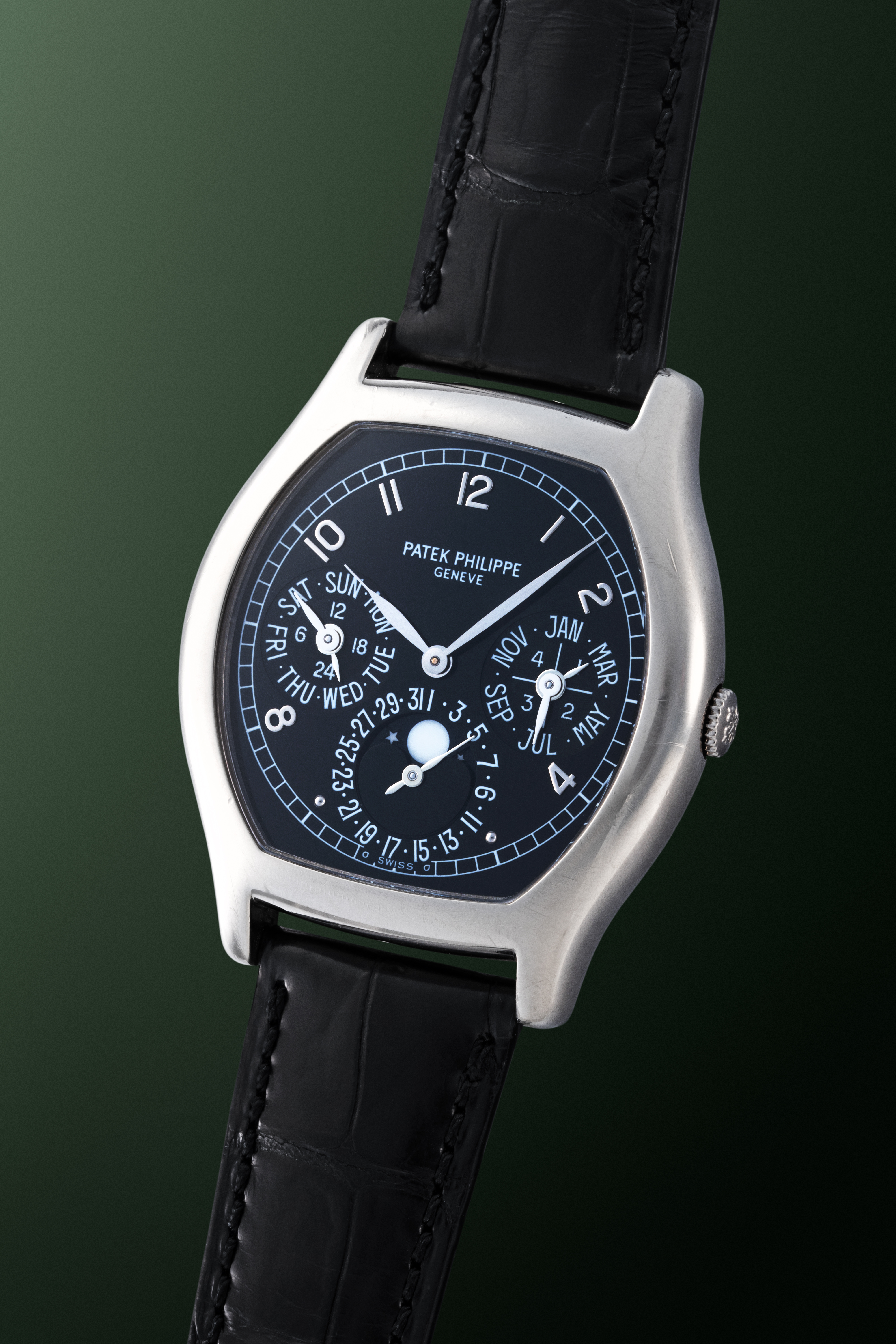 DialBlack dial with applied white gold numerals, white gold leaf hands, day and 24 hour indicator at 9 o'clock, month and leap year at 3 o'clock, moonphase and date at 6 o'clock, signed 'Patek Philippe' at 12 o'clock