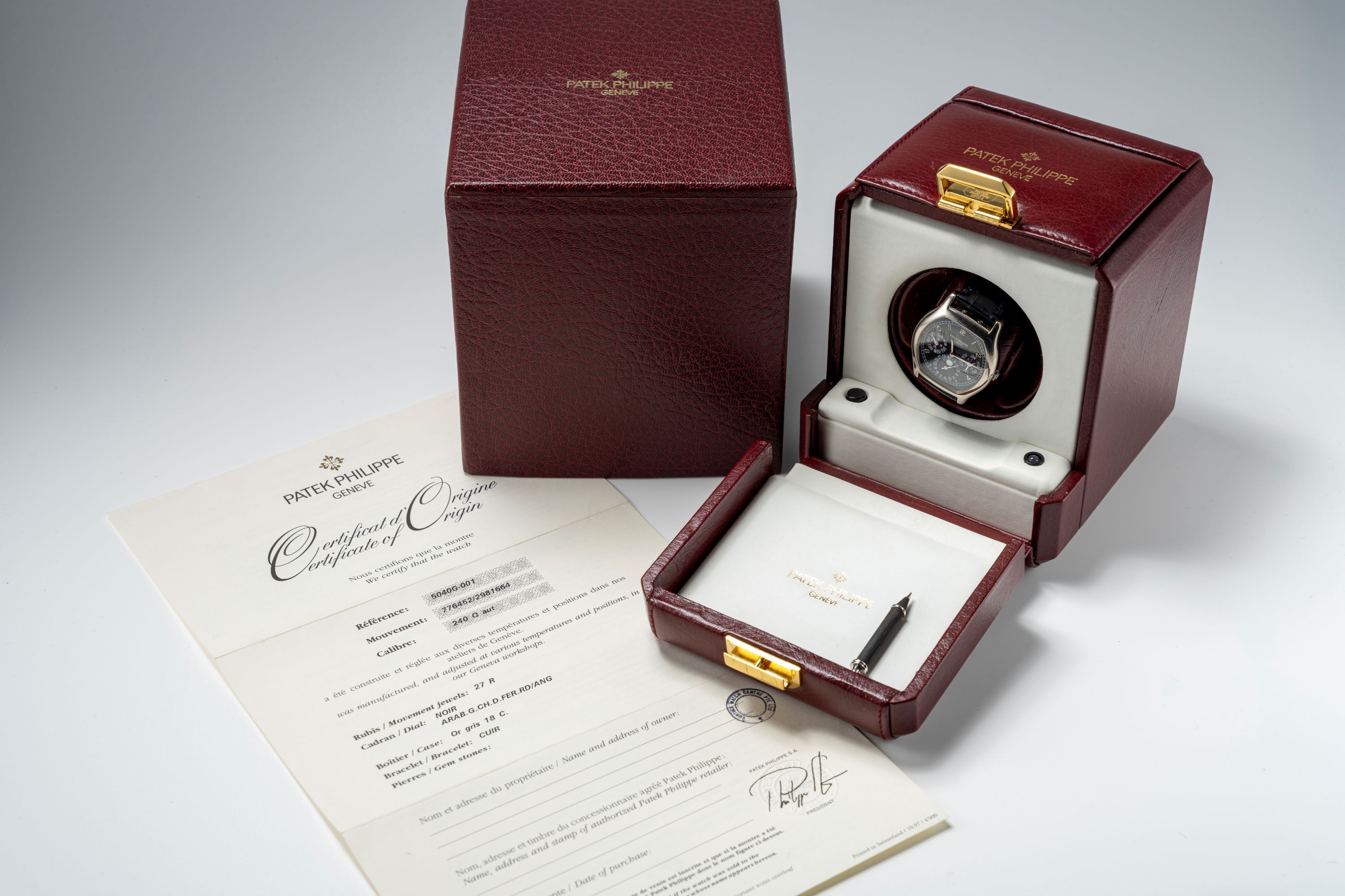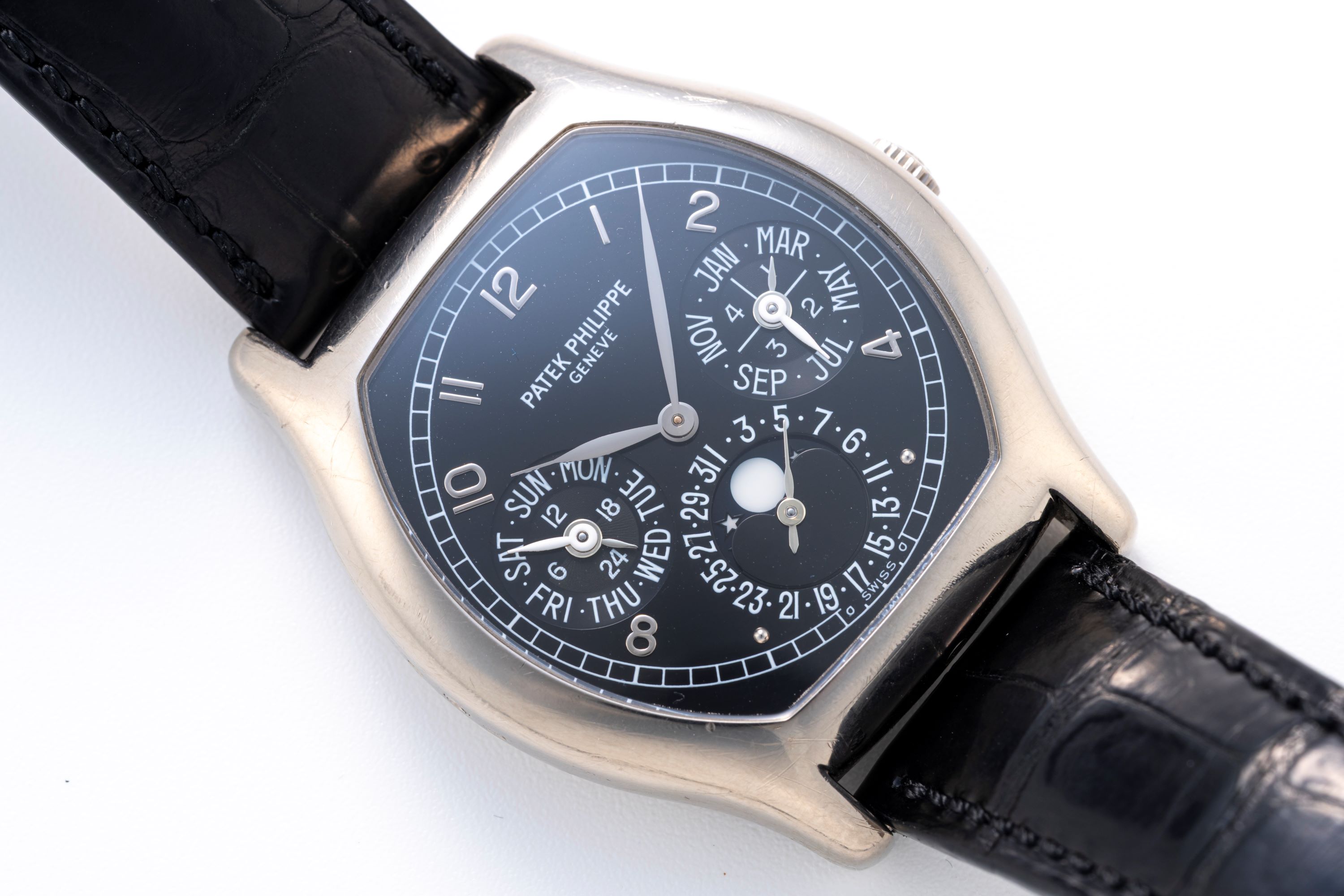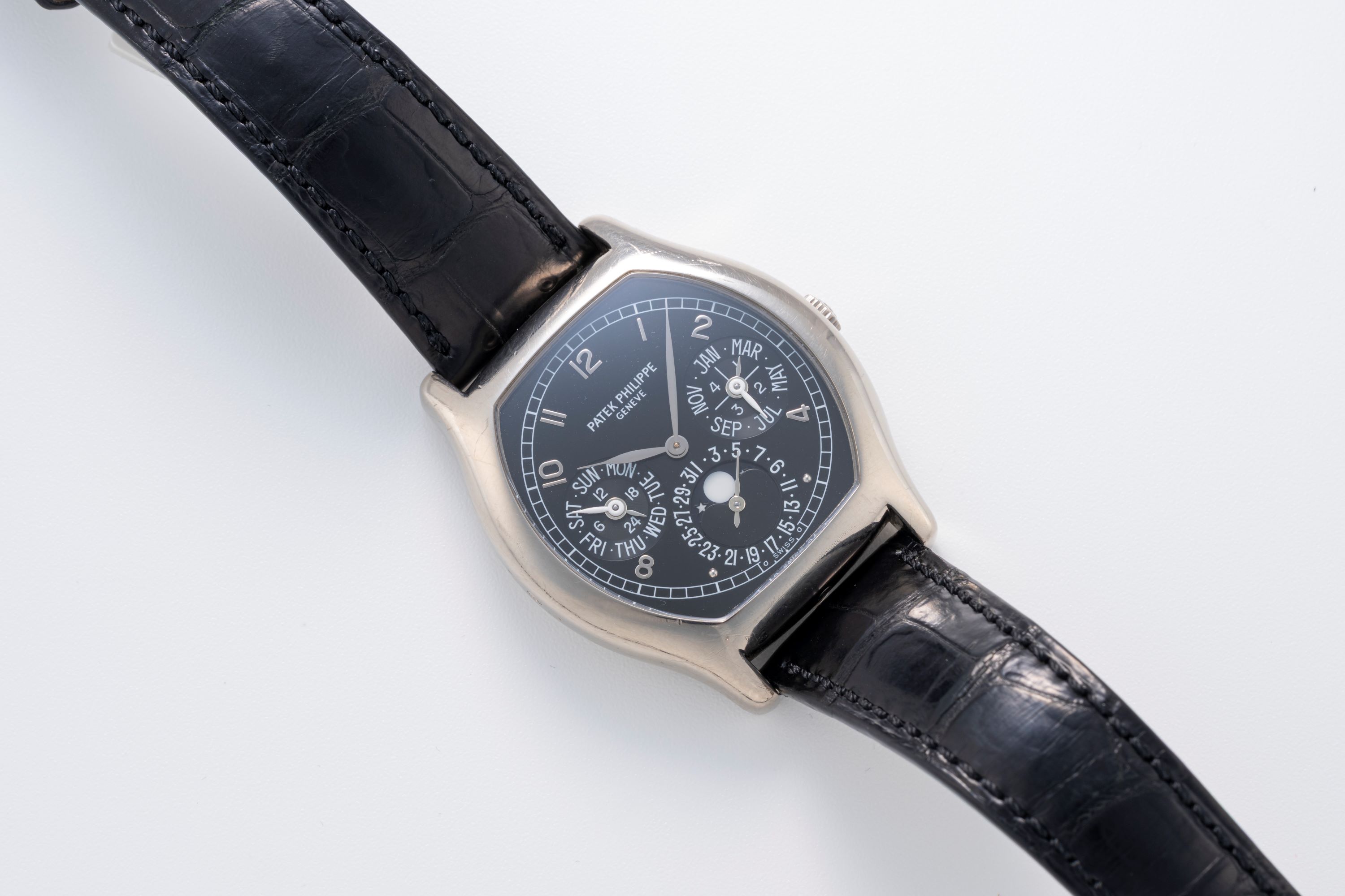 This Patek Philippe Perpetual Calendar Ref. 5040G is a rare and notable example of the brand’s distinctive tonneau-shaped perpetual calendar wristwatch in white gold. The present 5040G is a later example from around 2003, identifiable by its movement and case number. Among its most appealing features are the dark grey dial and the applied white-gold numerals and leaf hands. Equally significant is the presence of the Poinçon de Genève hallmark on the caliber 240 Q, signalling the movement’s high level of finishing. Altogether, this watch presents an excellent opportunity for collectors to acquire an uncommon, and highly characterful Patek Philippe perpetual calendar in a refined tonneau case.