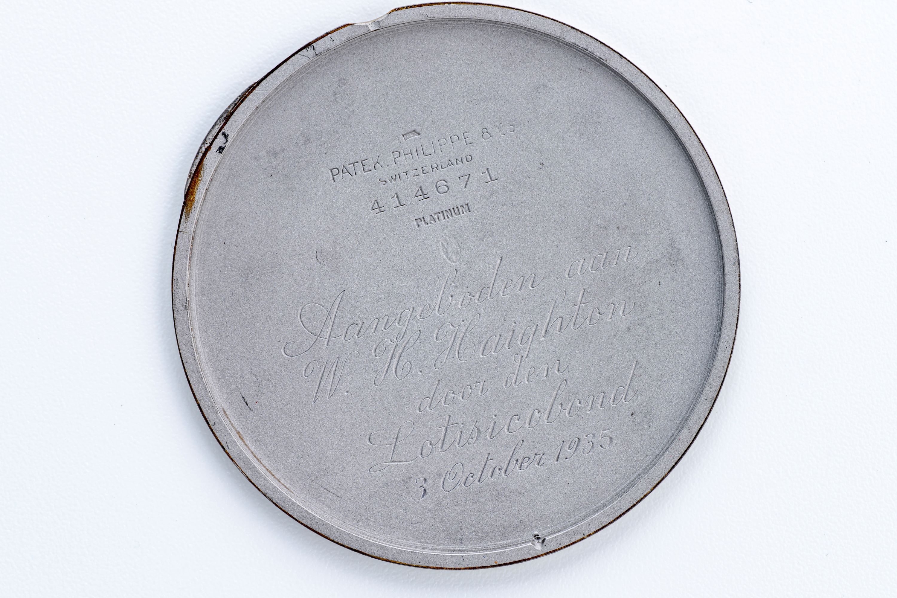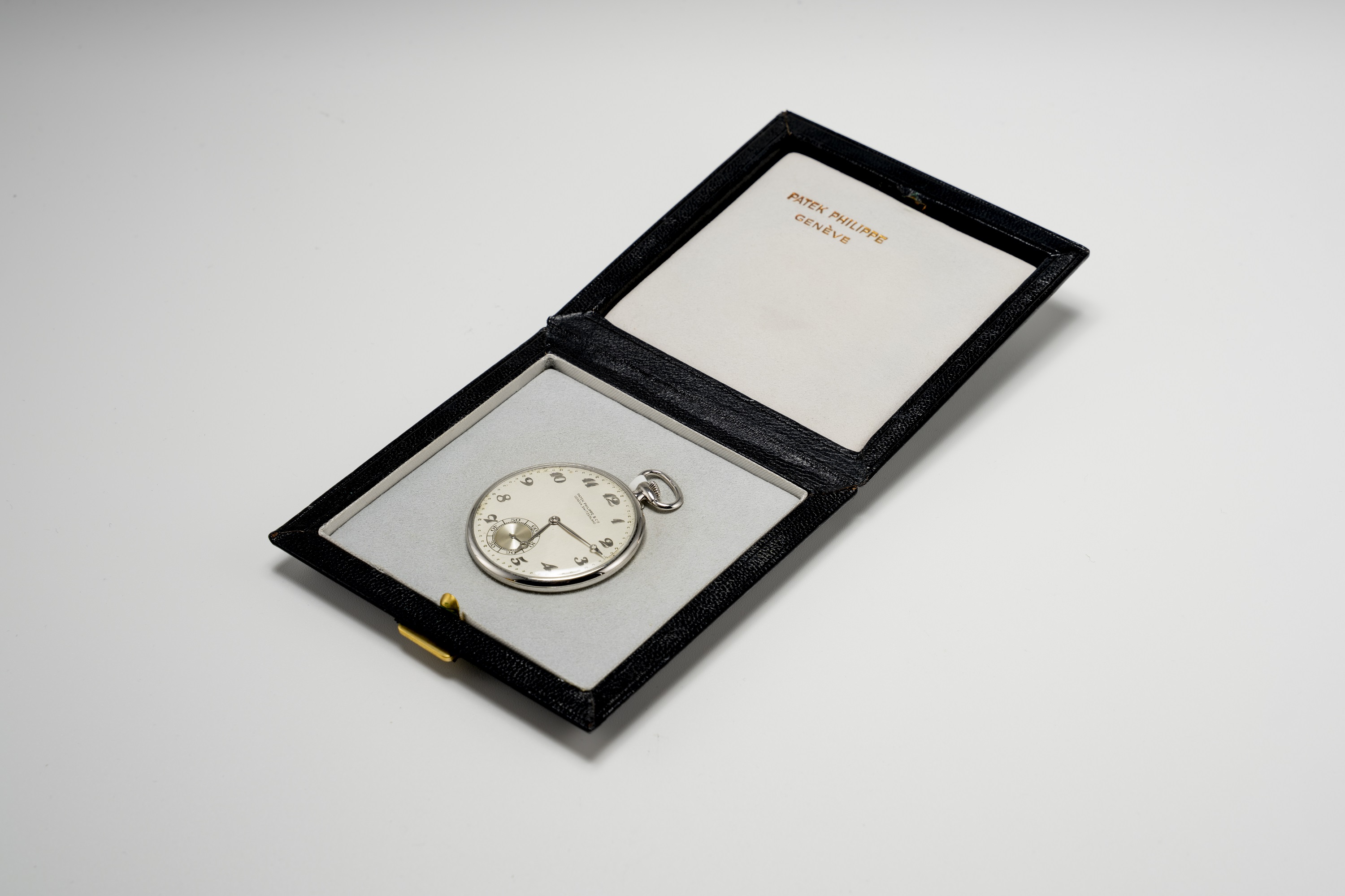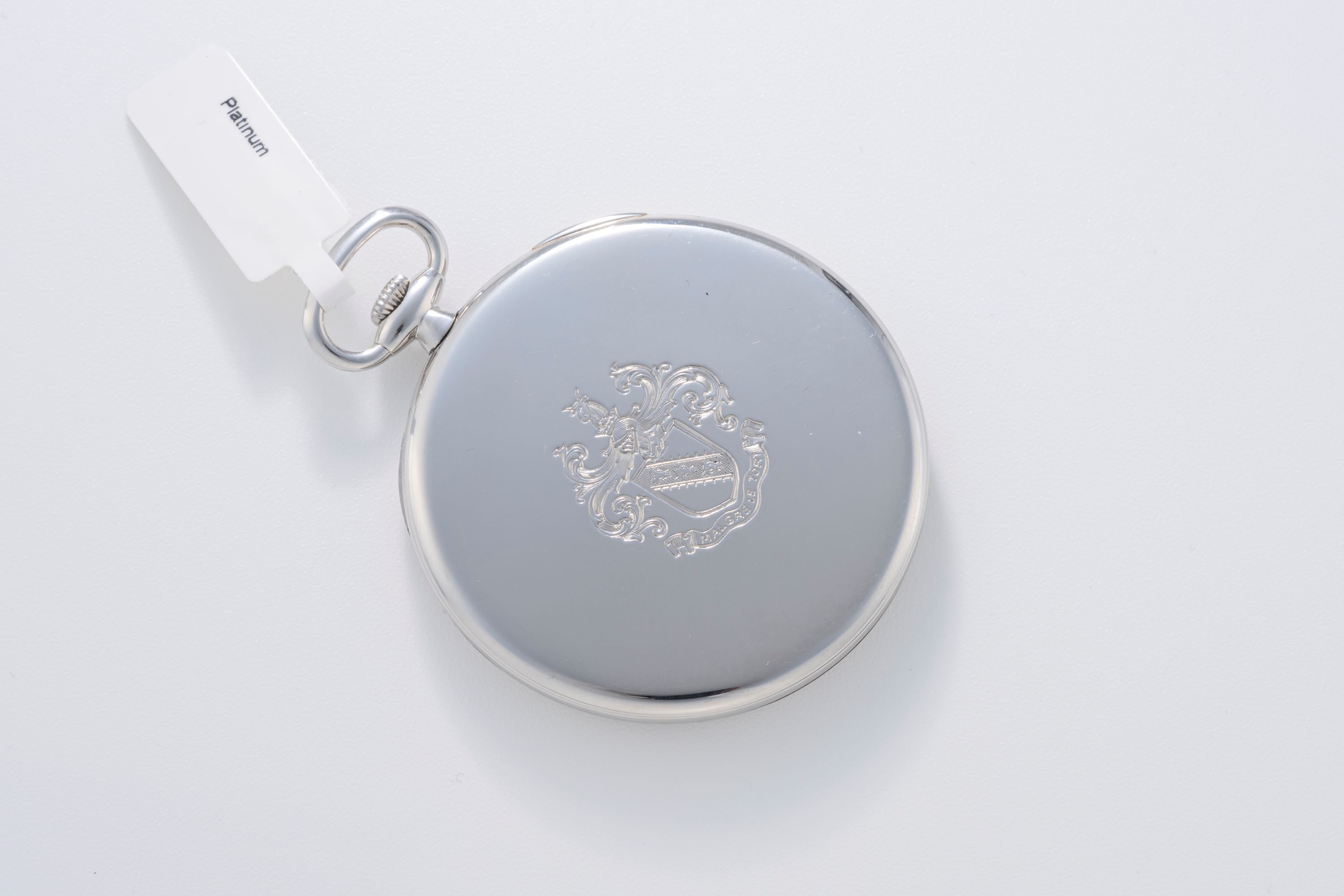 CaseRound case in platinum with chain loop and winding crown at 12 o'clock, snap-on caseback with engraved crest