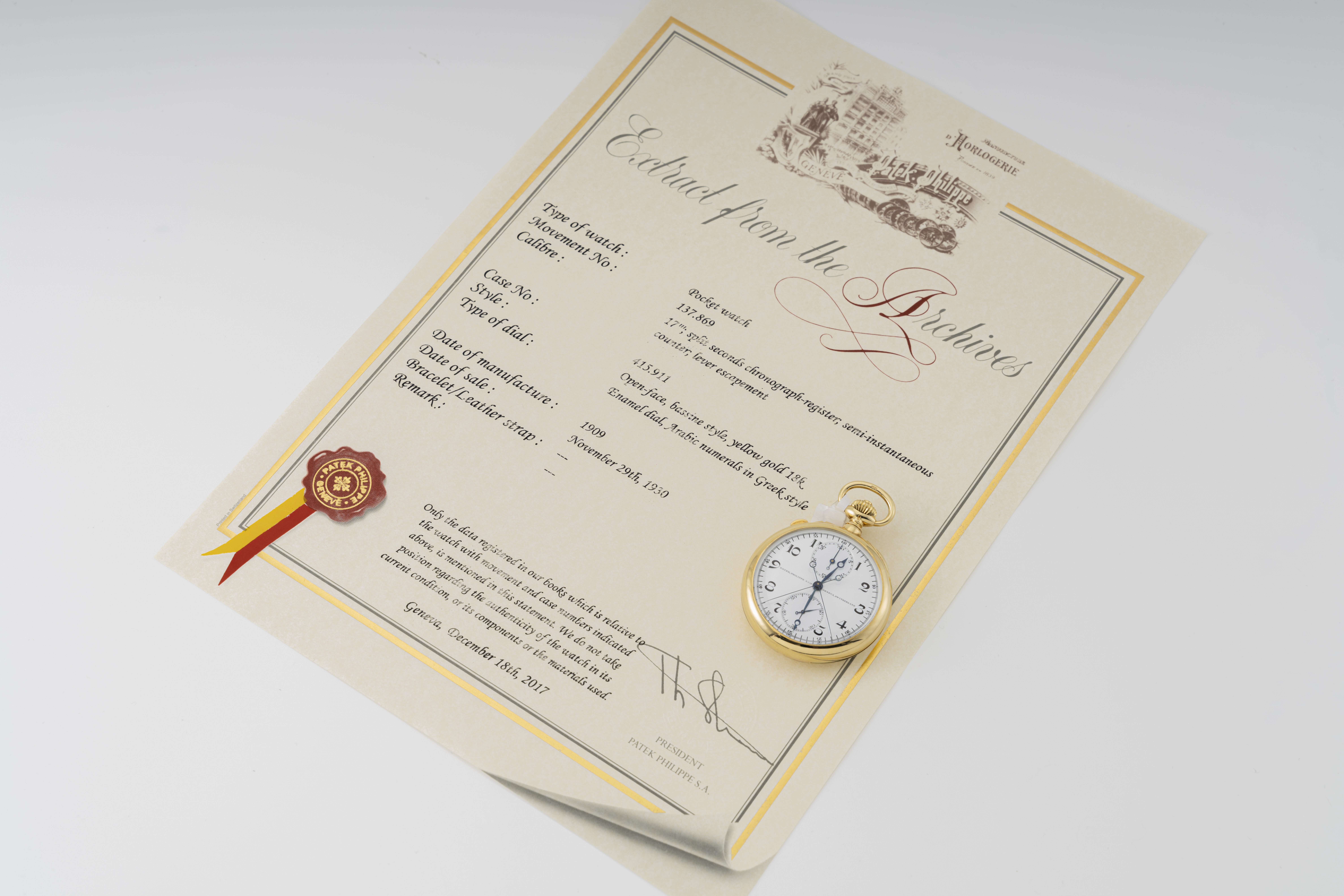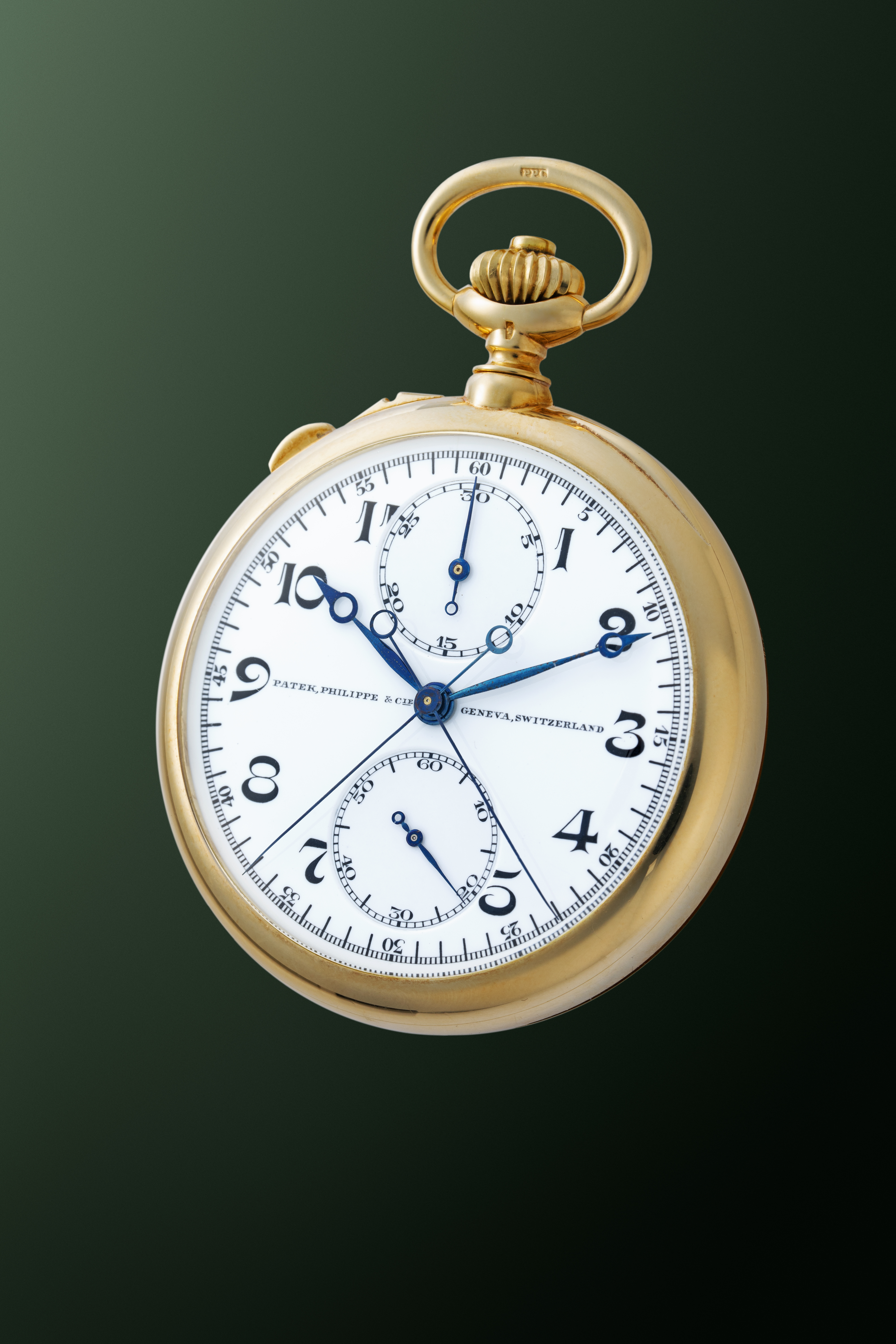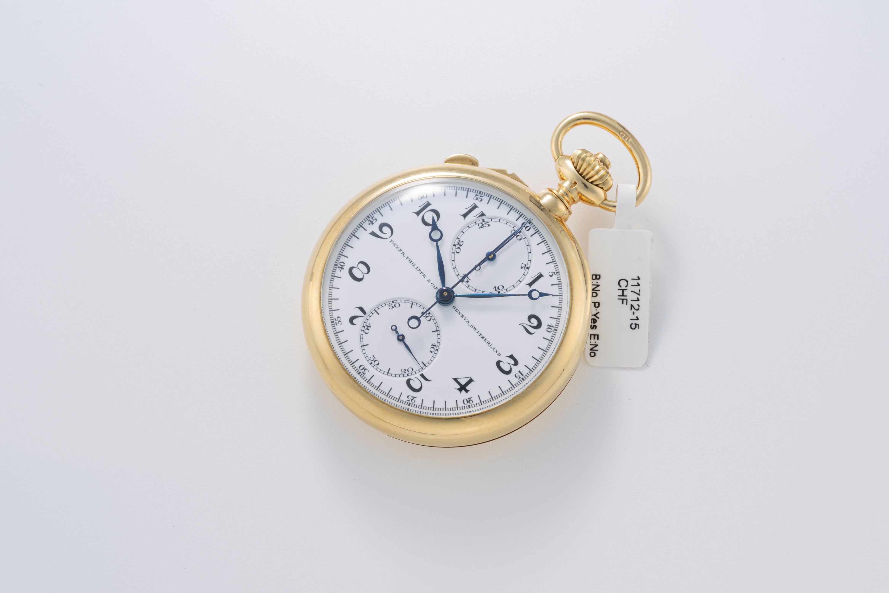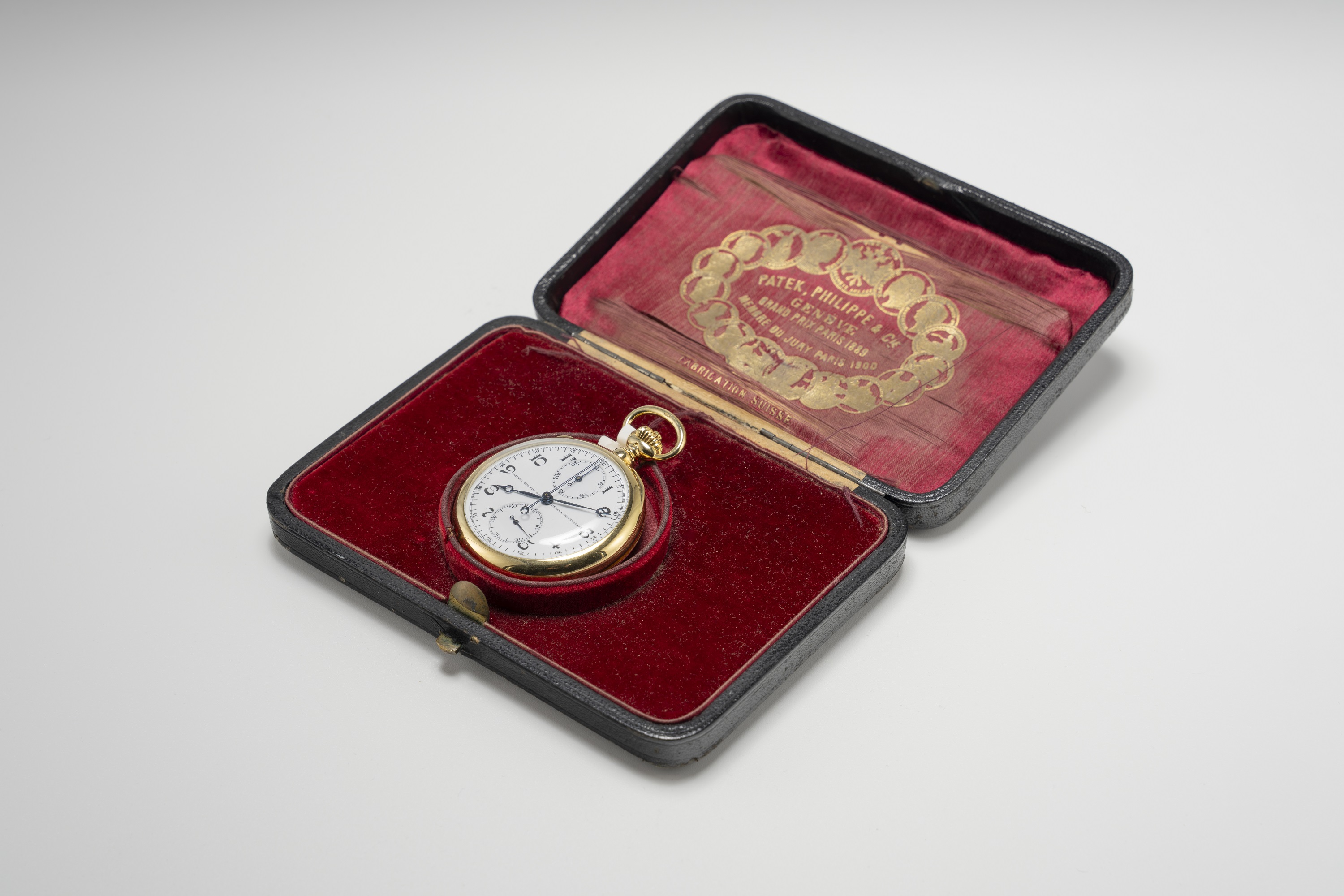 DialWhite enamel dial with black numerals, heat-blued Breguet hands, small seconds at 6 o'clock, 30 minute chronograph counter at 12 o'clock, signed 'Patek, Philippe & Co.' at 9 o'clock, signed 'Geneva, Switzerland' at 3 o'clock