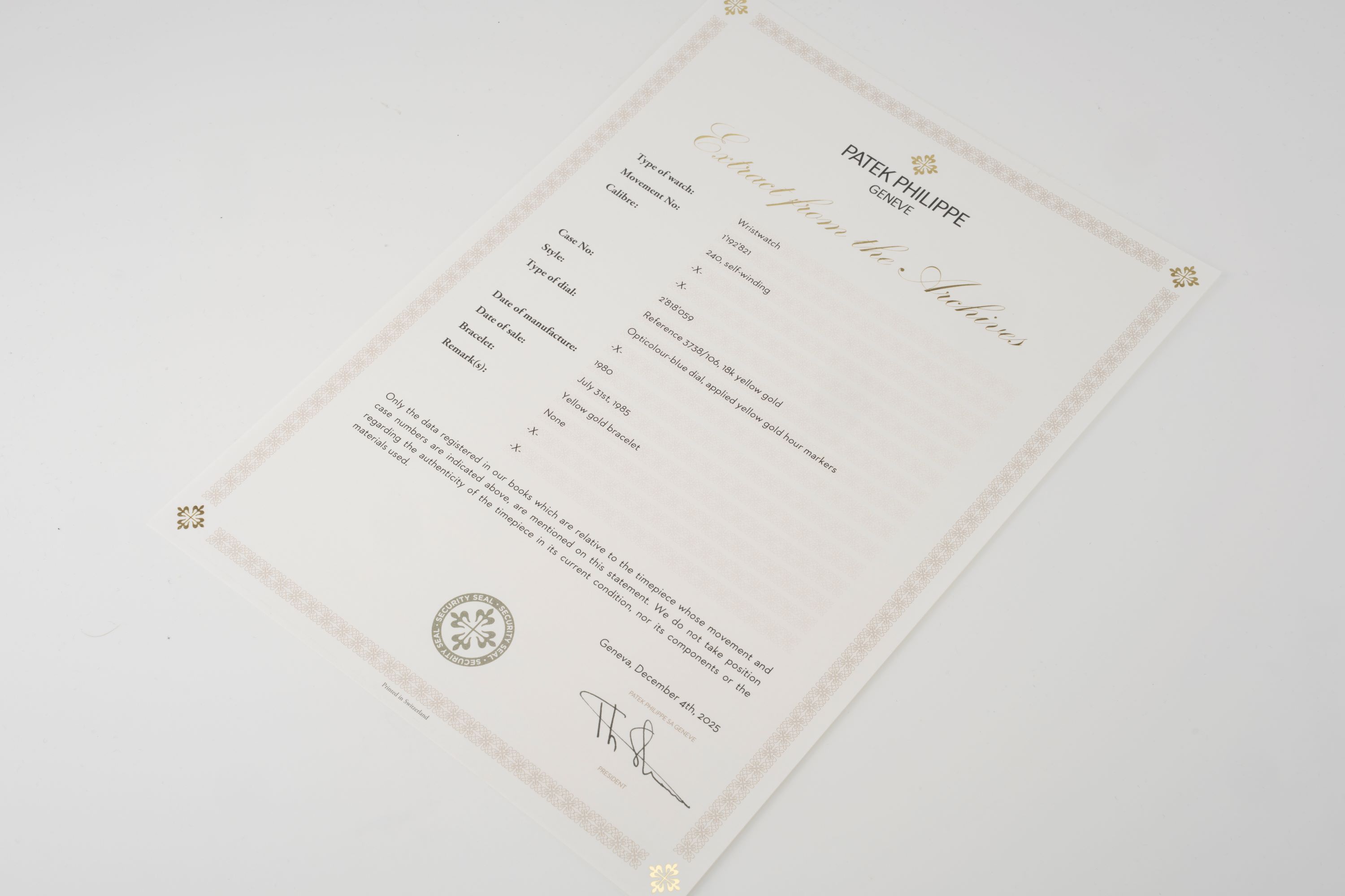 DialBlue sunburst dial with applied gold indices, gold hands, signed 'Patek Philippe' at 12 o'clock, signed 'Beyer' at 6 o'clock