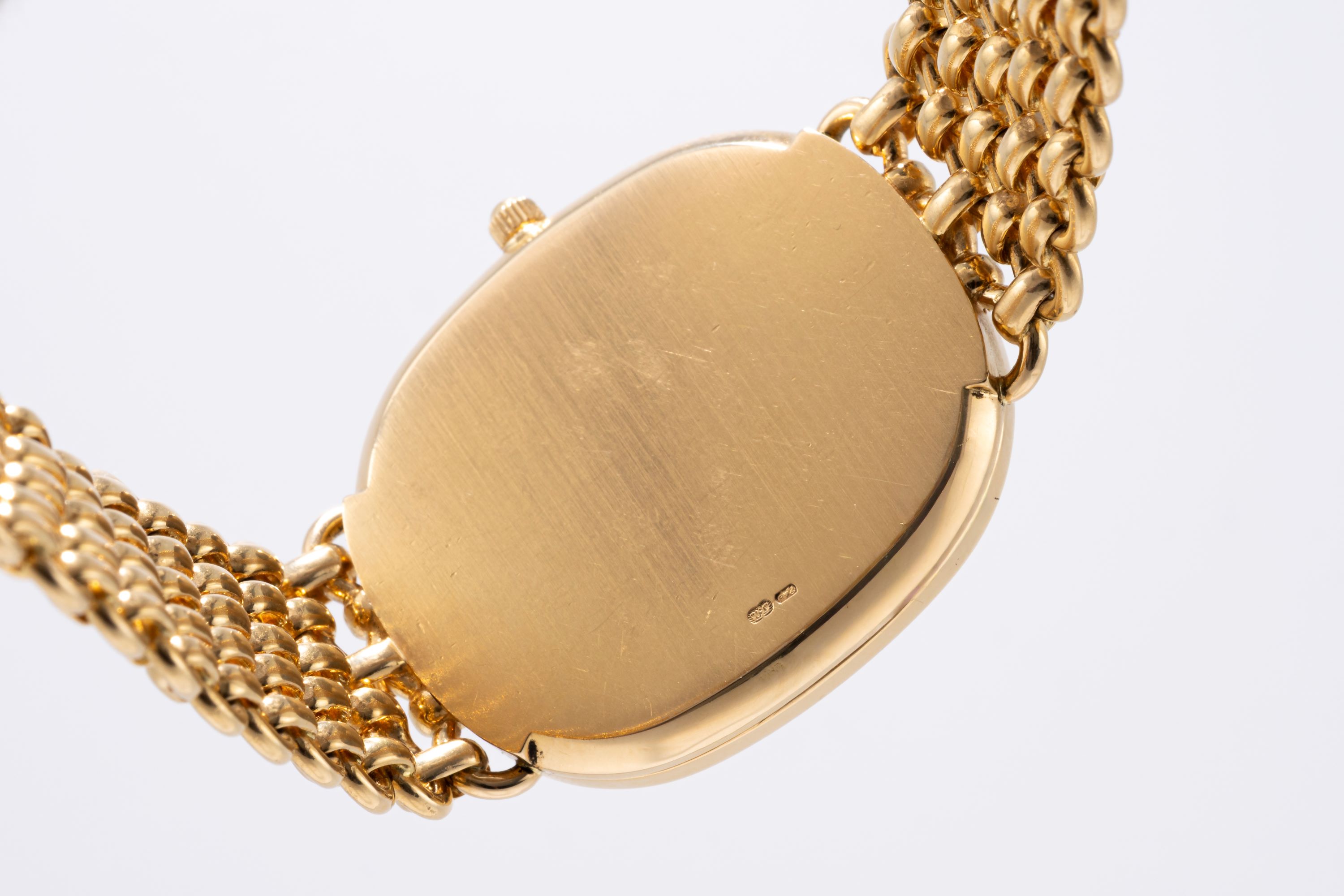 CaseElliptical case in 18k yellow gold with crown at 3 o'clock, solid caseback