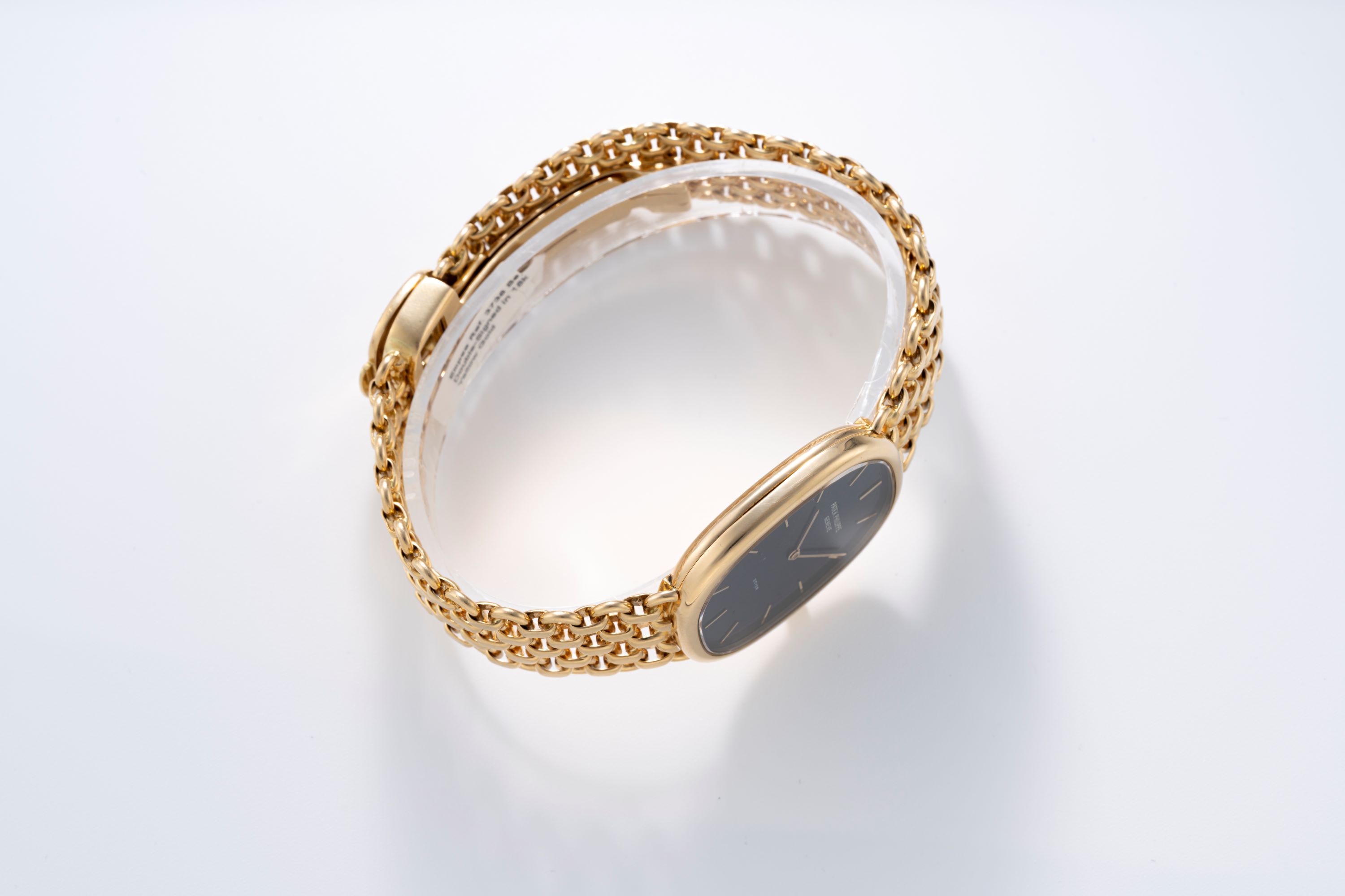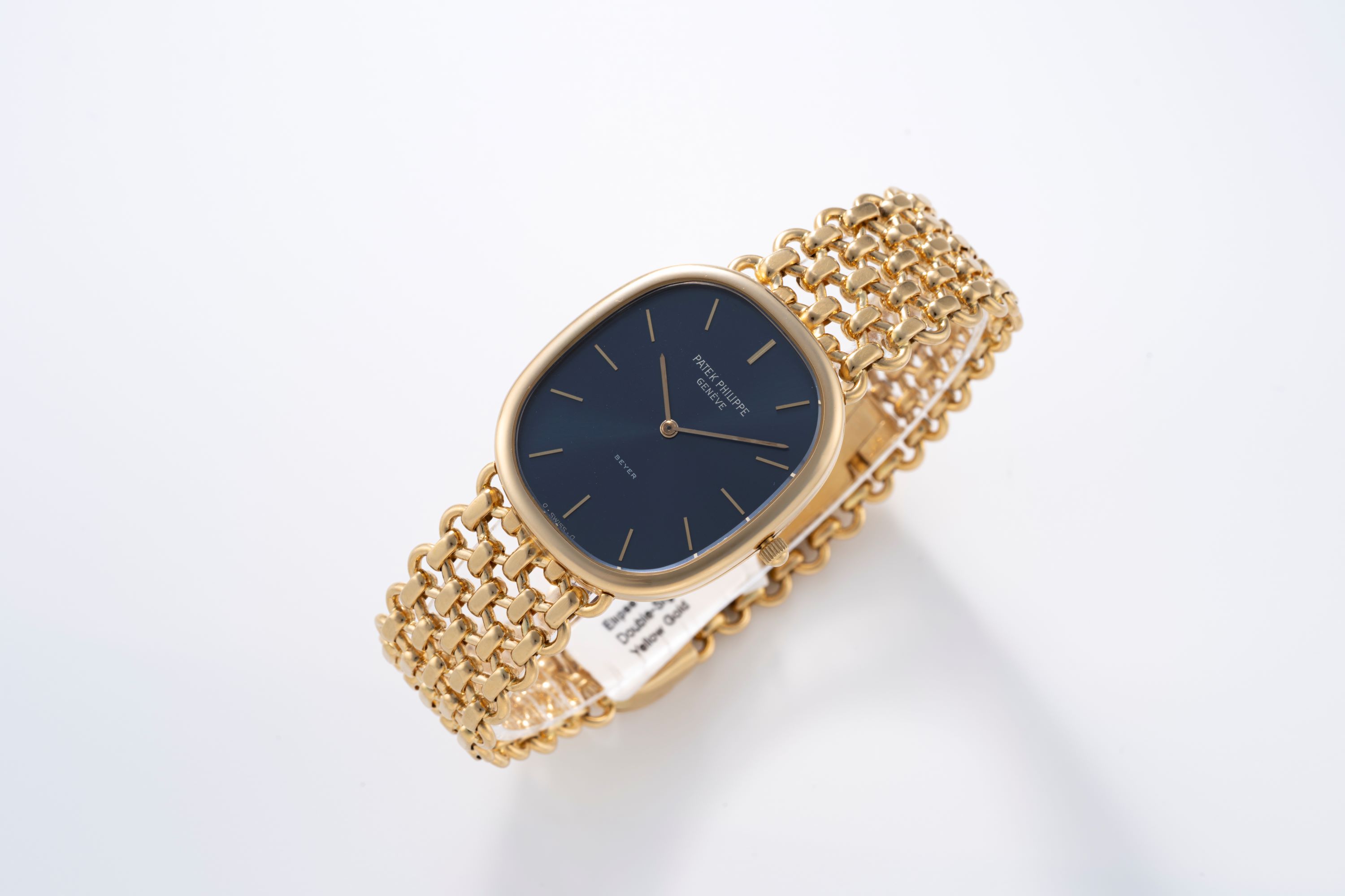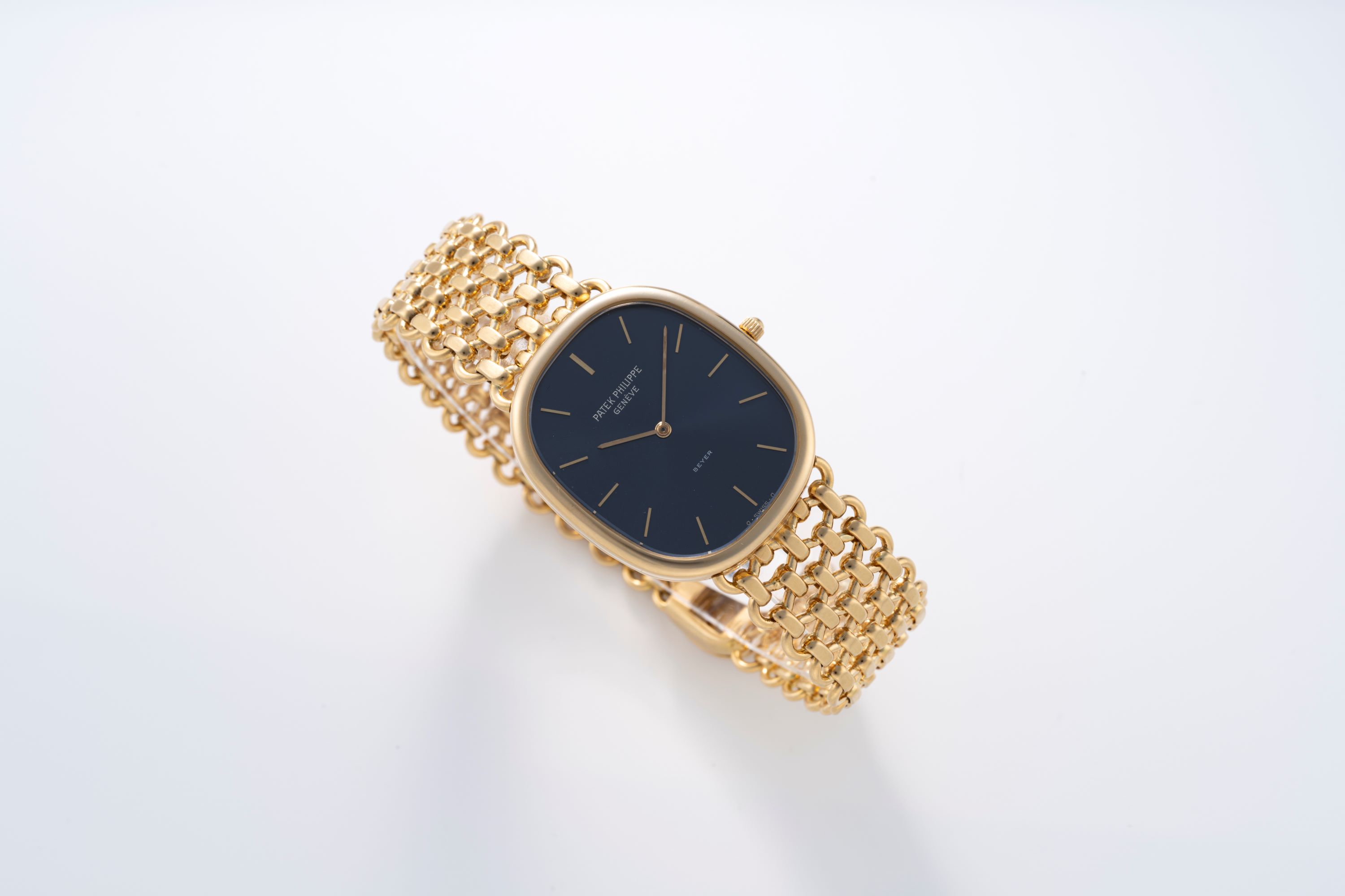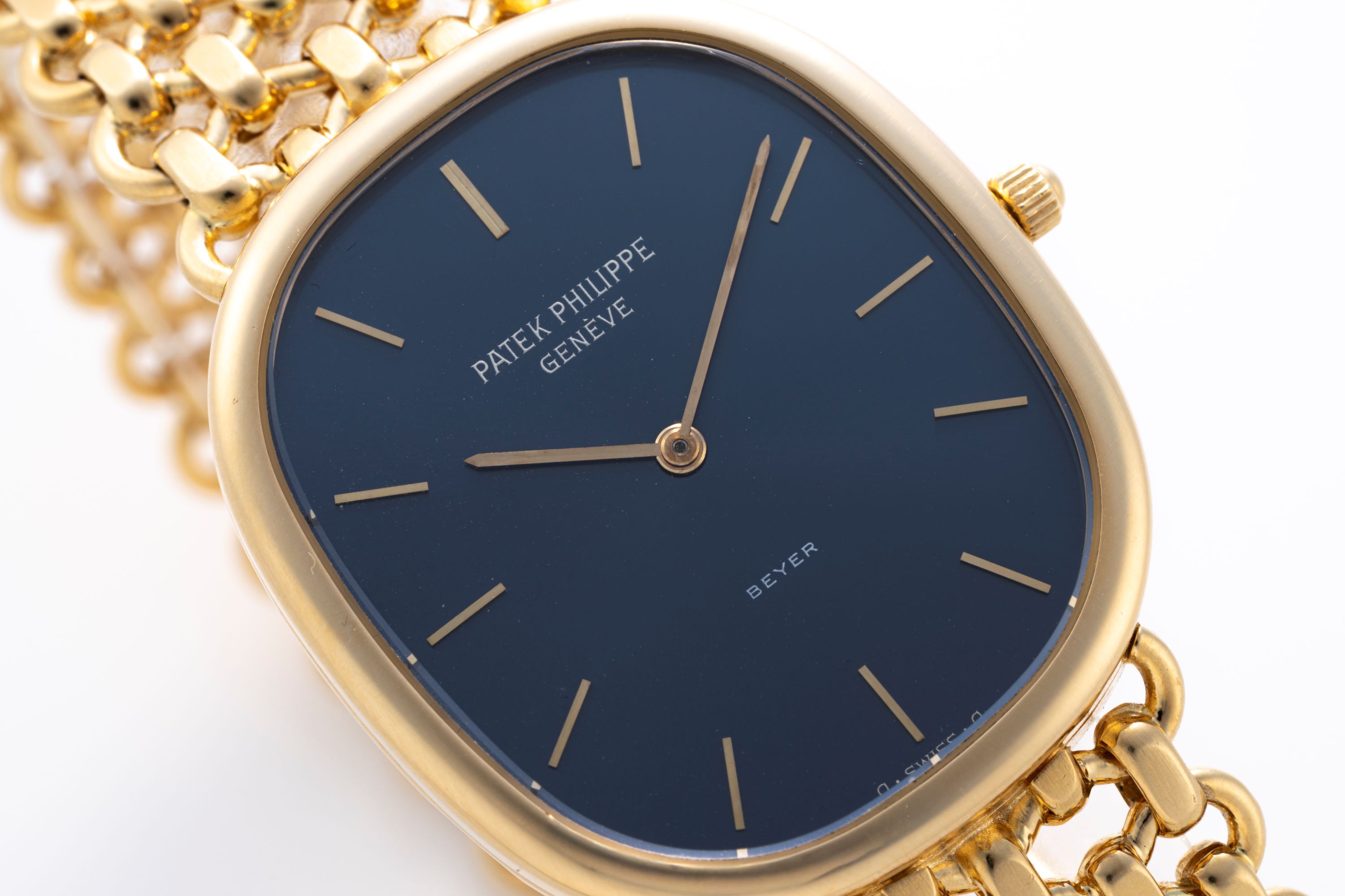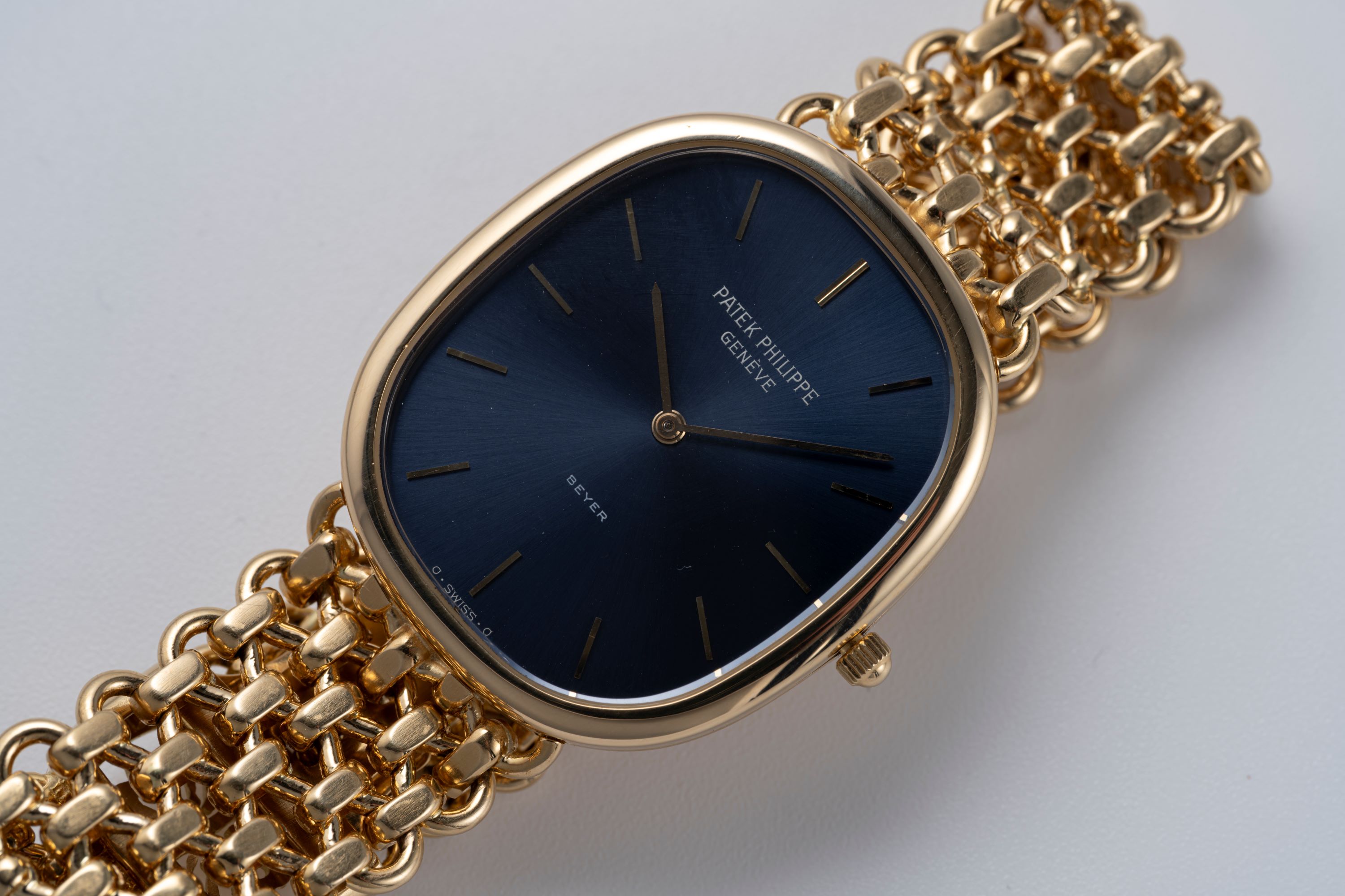 Executed in 18k yellow gold, the Patek Philippe Ellipse d’Or Ref. 3738/106 is defined by its balanced proportions derived from the golden ratio resulting in the distinctive elliptical case that has become an enduring symbol of the model line. The Beyer double-signature on the dial adds an appealing layer of provenance, connecting the watch to one of the world’s most respected retailers of Patek Philippe. In addition to the double-signature, this example comes on an extremely rare bracelet configuration with a Patek Philippe folding clasp instead of the usual jewelry clasps fitted to most Ellipse bracelets. With its elegant simplicity, reliable automatic movement, and exceedingly rare bracelet, this example offers collectors a chance to acquire a classic Patek design with an added note of historical interest.