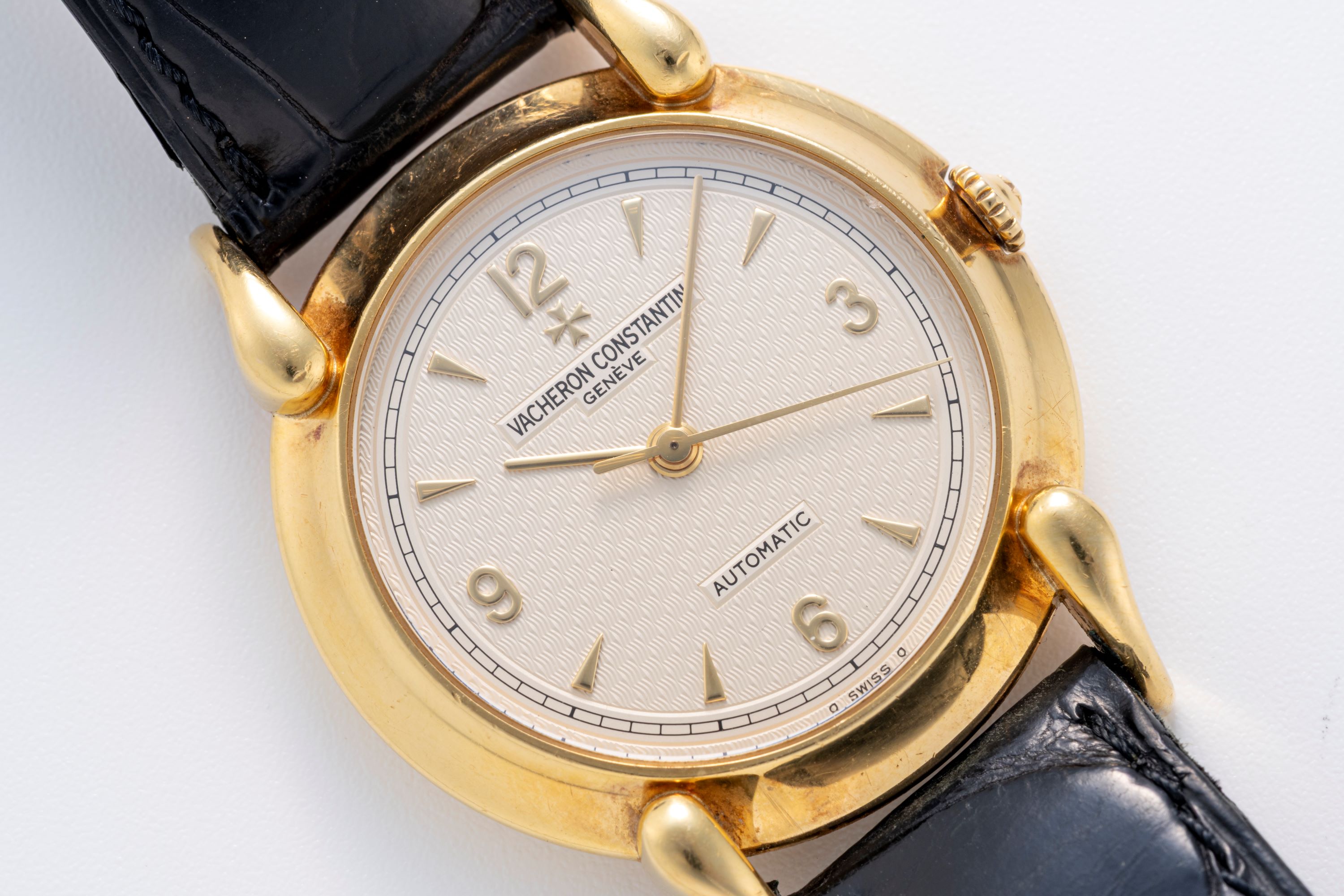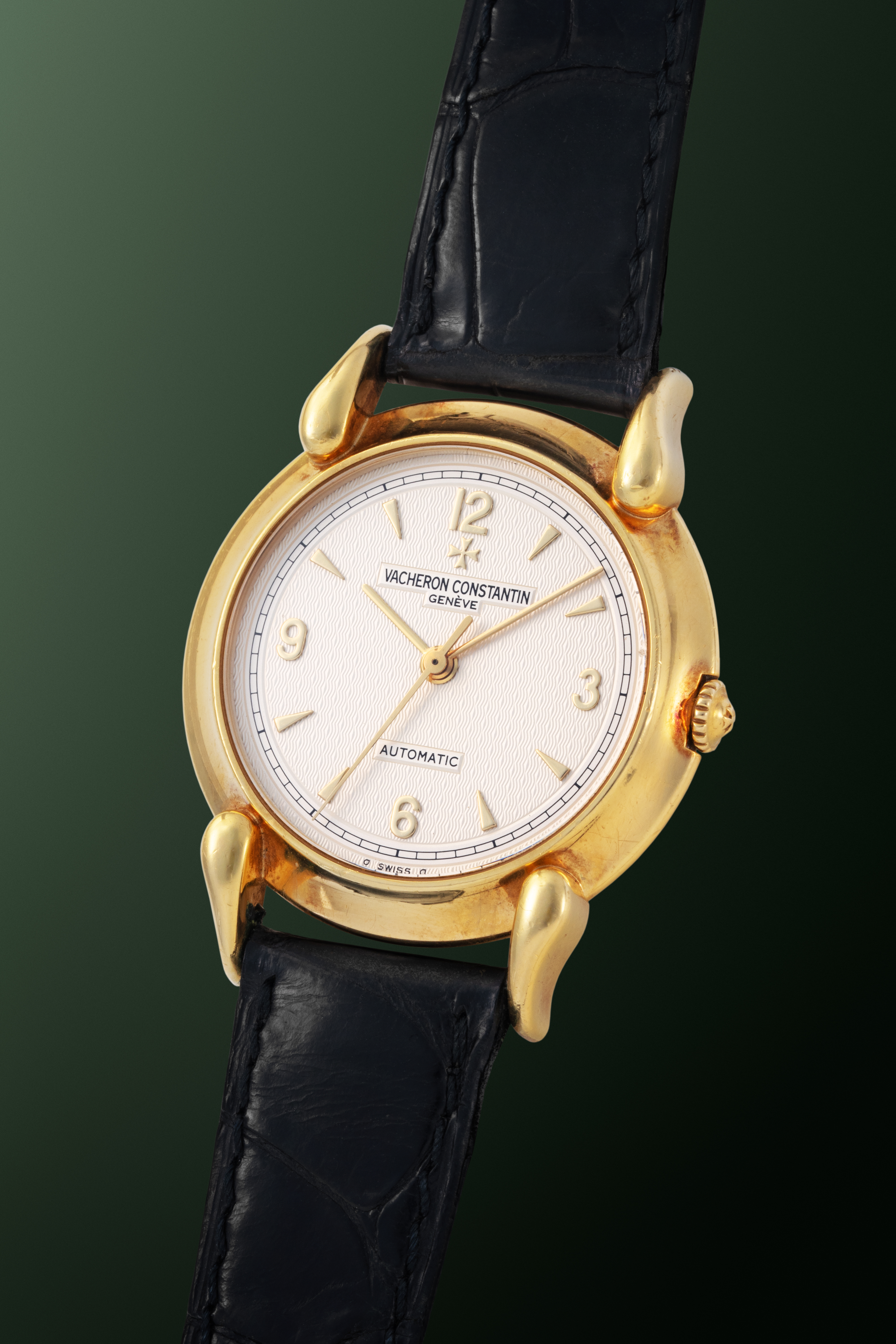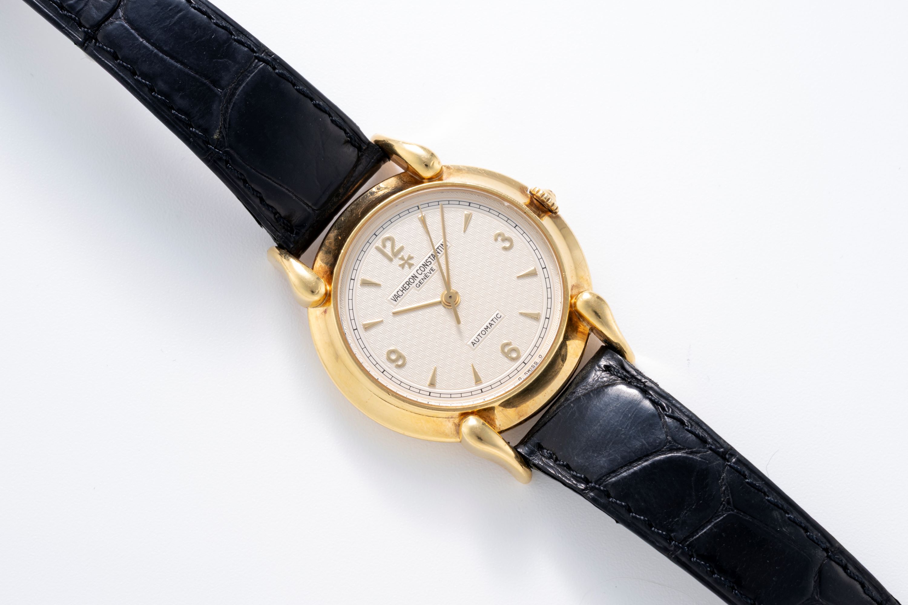 This Vacheron Constantin dress watch presents a distinctive and unconventional take on the classic formal timepiece. Its most striking feature is the set of Cornes de Vache-style lugs, which give the 18k yellow-gold case a sculptural profile. Although the case measures 33 mm, the elongated lugs allow it to wear larger and with greater presence than its diameter suggests. The dial is decorated with a dimensional guilloché pattern that introduces visual depth and subtle refinement, resulting in a neo-vintage dress watch that stands out through thoughtful design and elegant character while staying true to its mid-century inspiration.