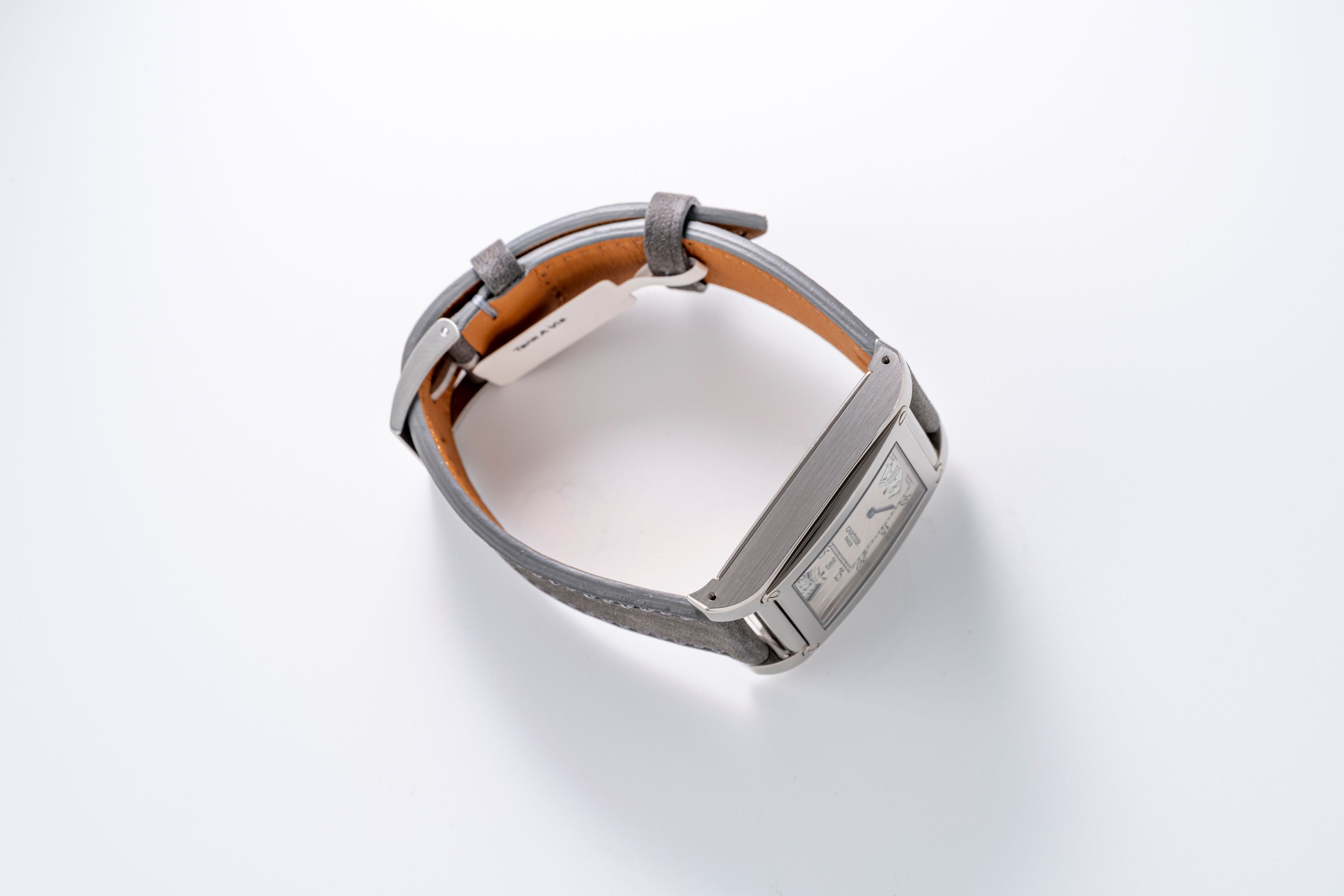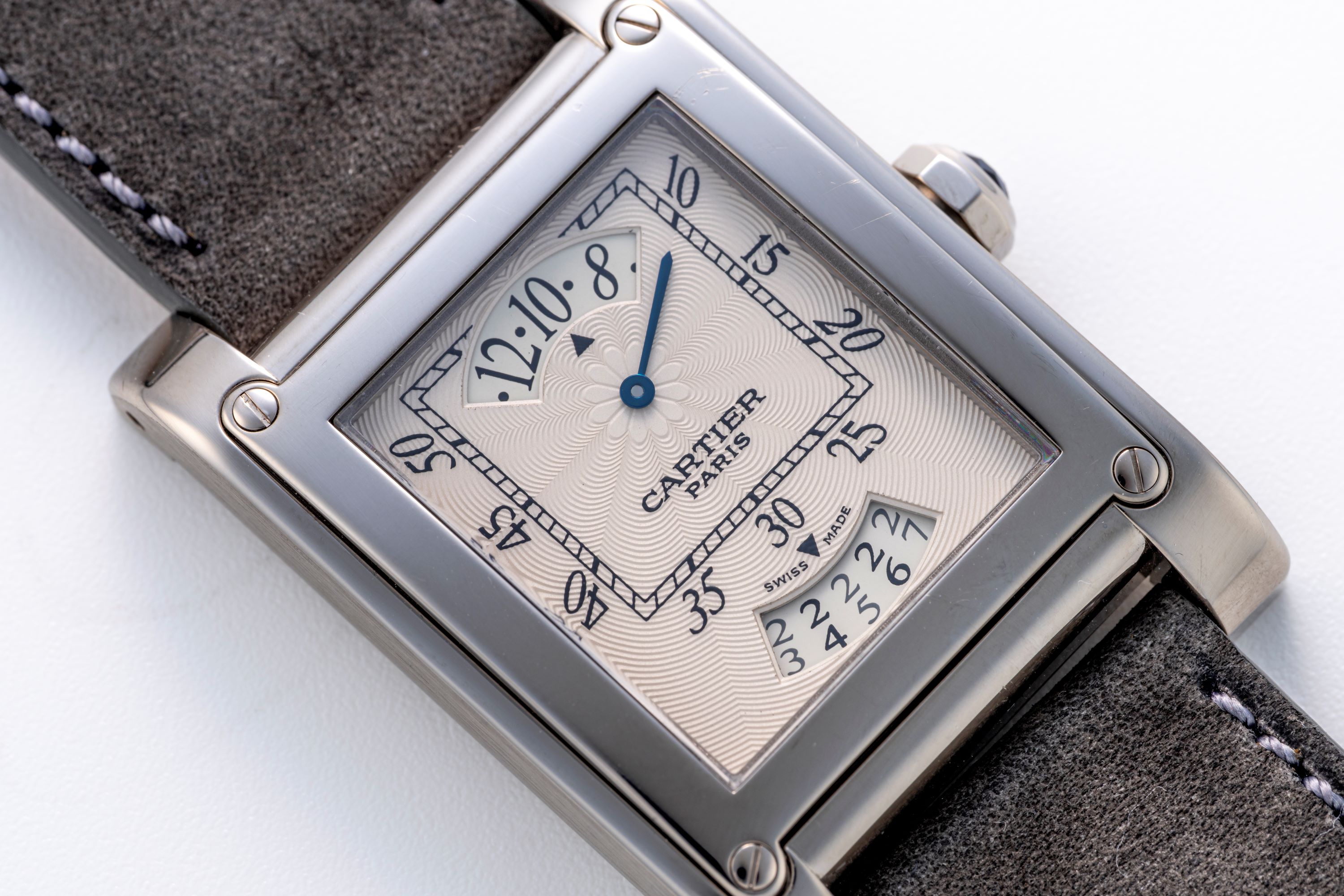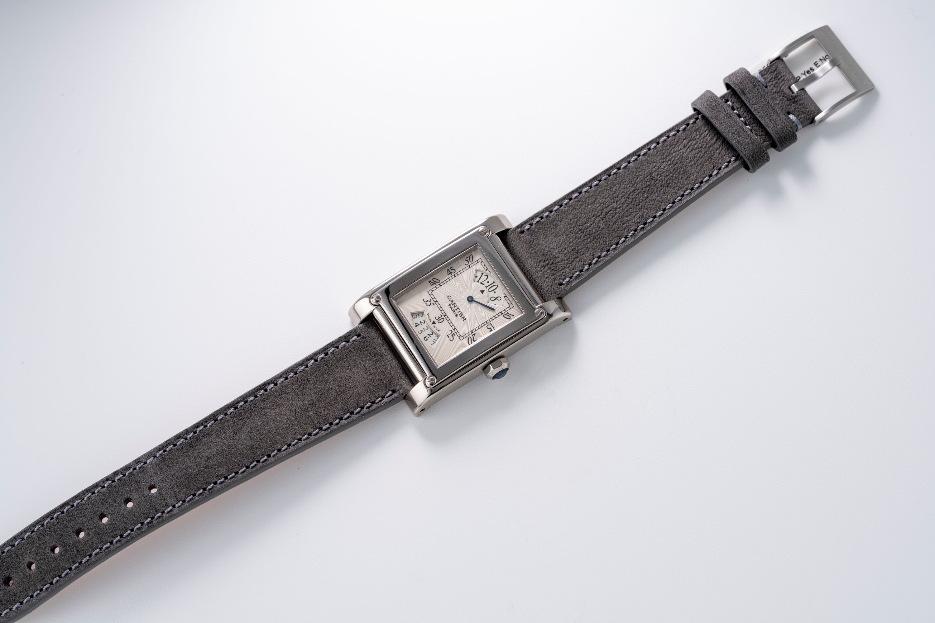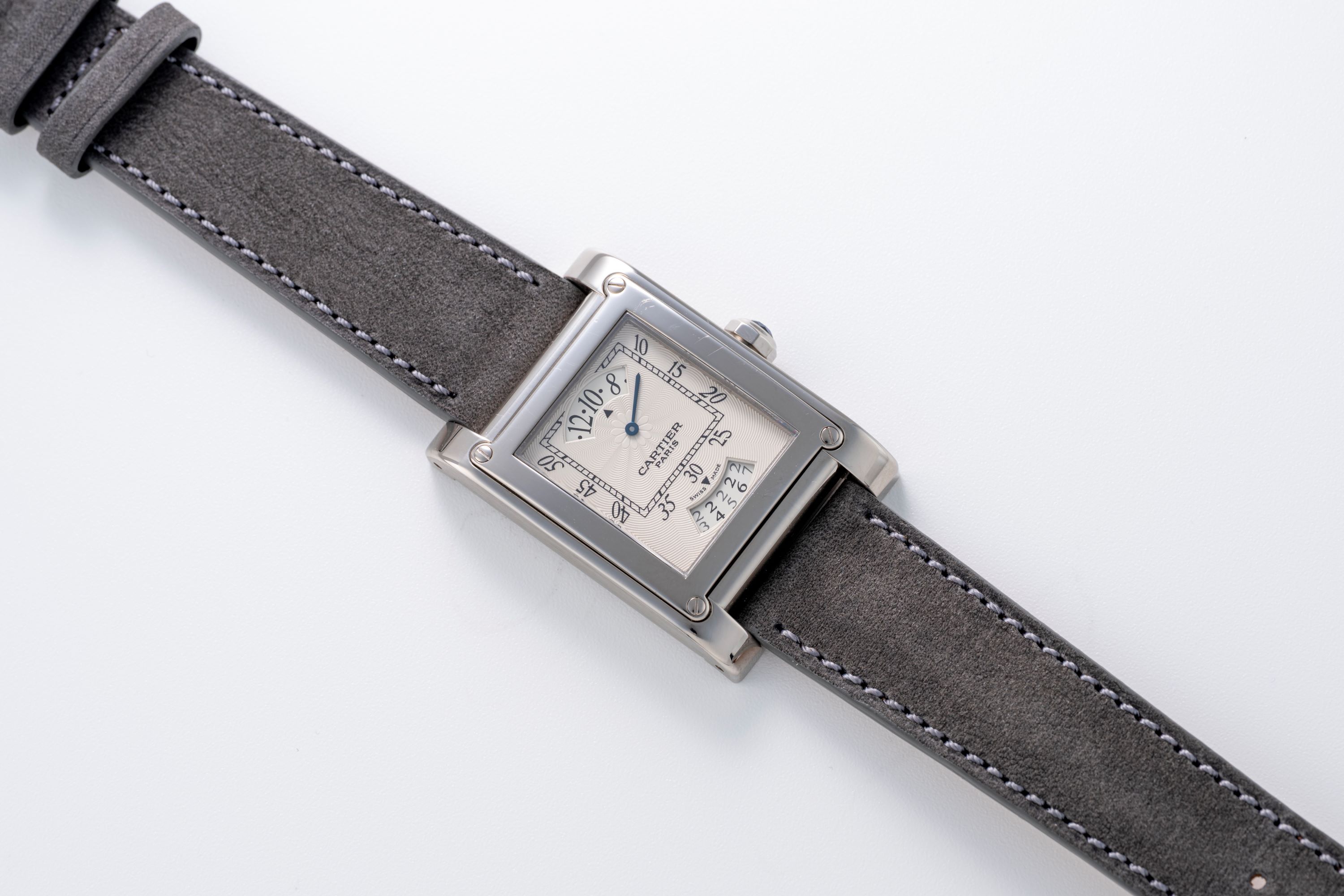 DialIvory guilloche dial with wandering hours at 12 o'clock, square minute track, date at 6 o'clock, signed 'Cartier' at 6 o'clock