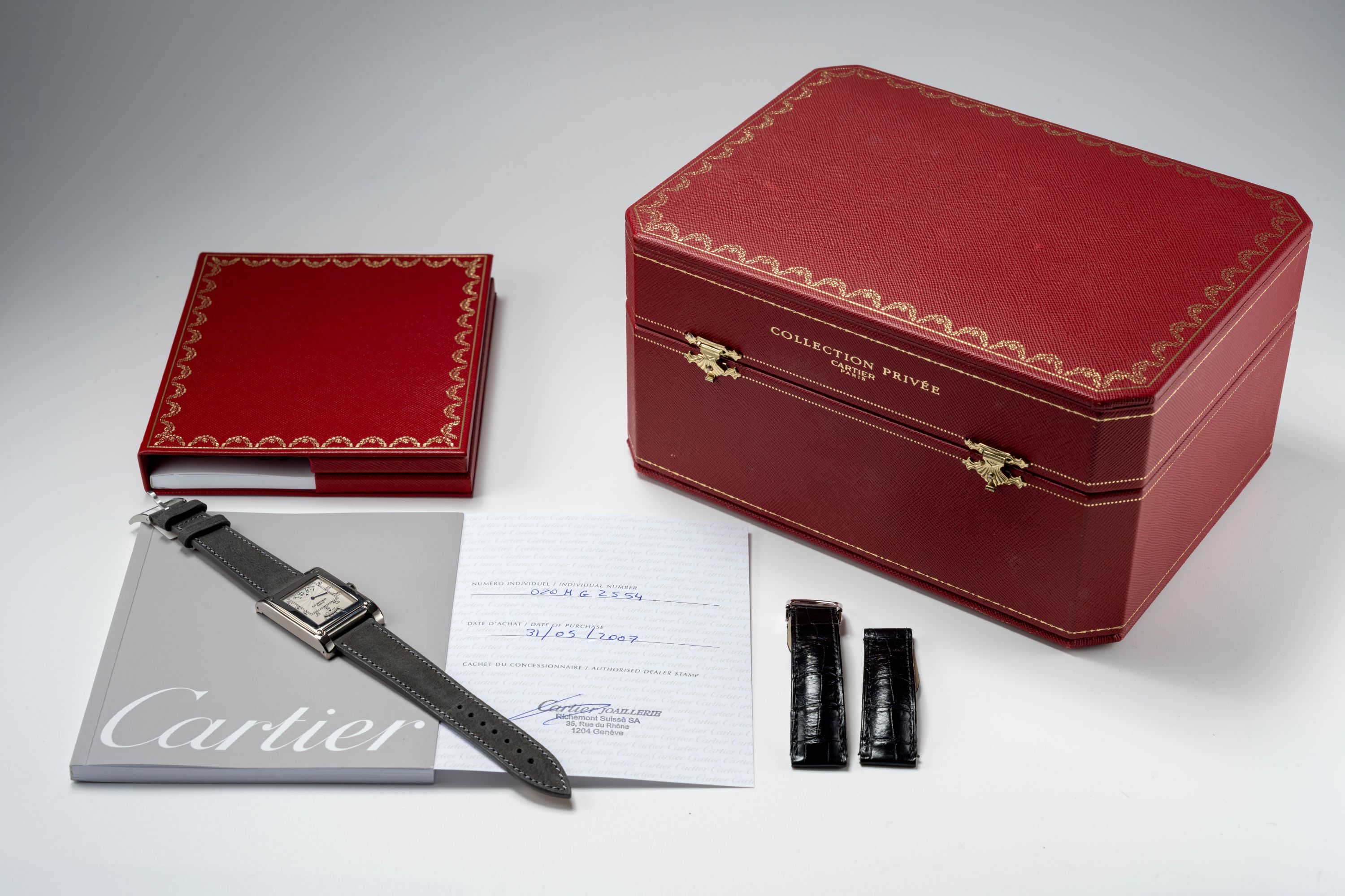 The Cartier Tank à Vis Wandering Hours Ref. 2554 in platinum offers the opportunity to acquire one of Cartier’s most distinctive interpretations of mechanical creativity within the historic Tank family. The model combines the architectural strength of the Tank à Vis case, defined by its exposed screws, stepped brancards, and solid platinum construction, with an uncommon wandering-hours display, a complication rarely seen in Cartier’s catalogue. This mechanism replaces traditional hands with a rotating disc system that indicates the hours through an aperture, giving the watch a poetic and technically engaging mode of timekeeping rooted in early 17th-century horological traditions. The platinum case enhances the watch’s tactile gravitas, while the wandering-hours complication introduces a level of mechanical depth that sets it apart from standard Tank models. Produced in small numbers as part of Cartiers ‘CPCP’-line and long discontinued, the reference carries strong appeal for collectors seeking both rarity and mechanical originality.